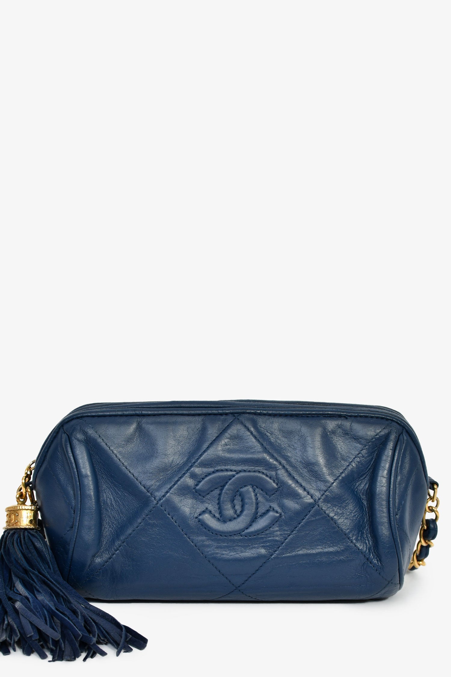 Pre-Loved Chanel™ 1986-88 Navy Lambskin Leather Tassel CC Mini Barrel Bag Mini. Top zip closure. Chain-link strap. Single interior wall zipp pocket. Gold-tone hardware. Tonal stitching.