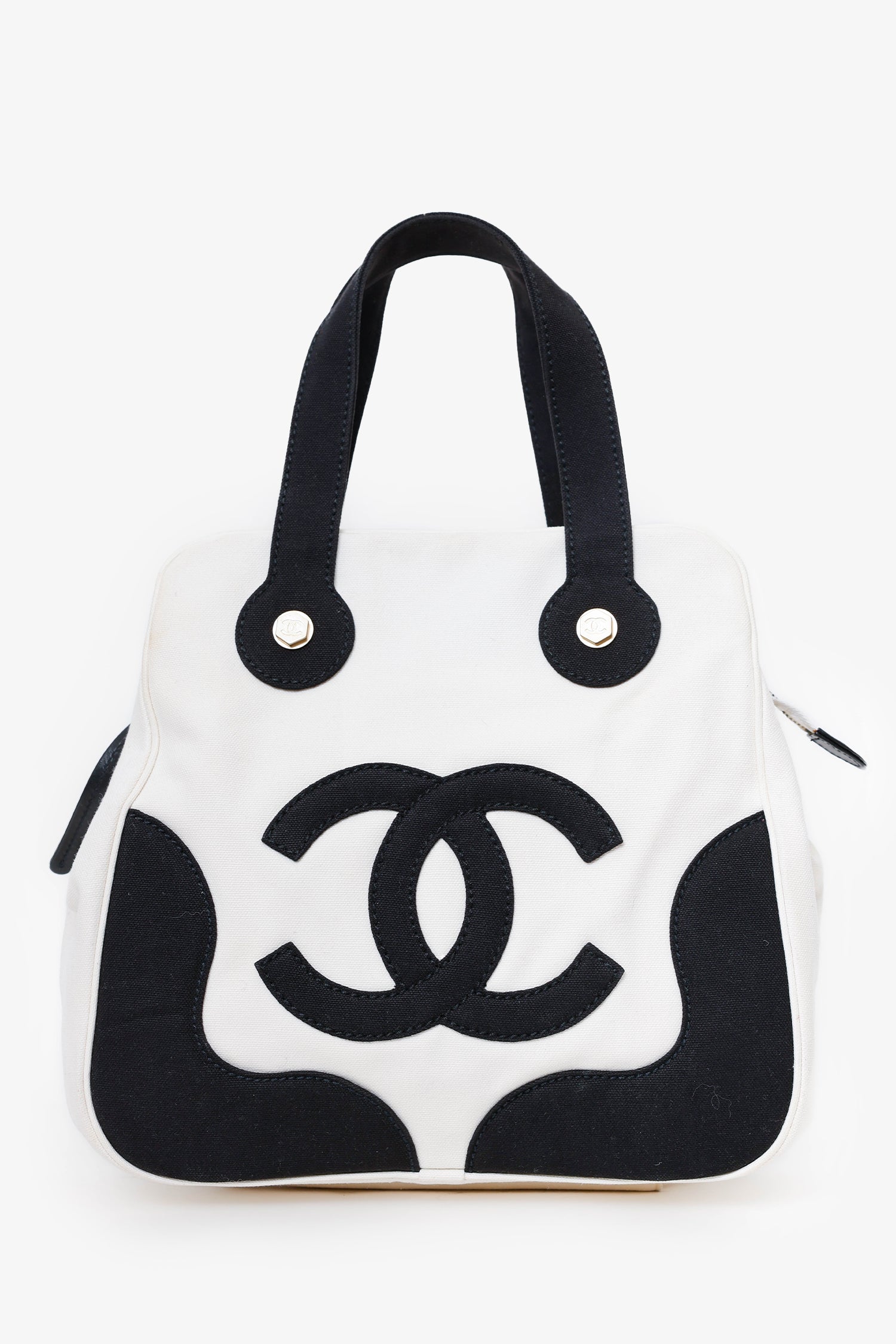 Pre-Loved Chanel™ 2003-04 Black/White Canvas Marshmallow CC Handle Bag. Top zip closure. Twin top handles. Protective base studs. Lined interior with single rear zip-up pocket. Gold-tone hardware. Tonal stitching.