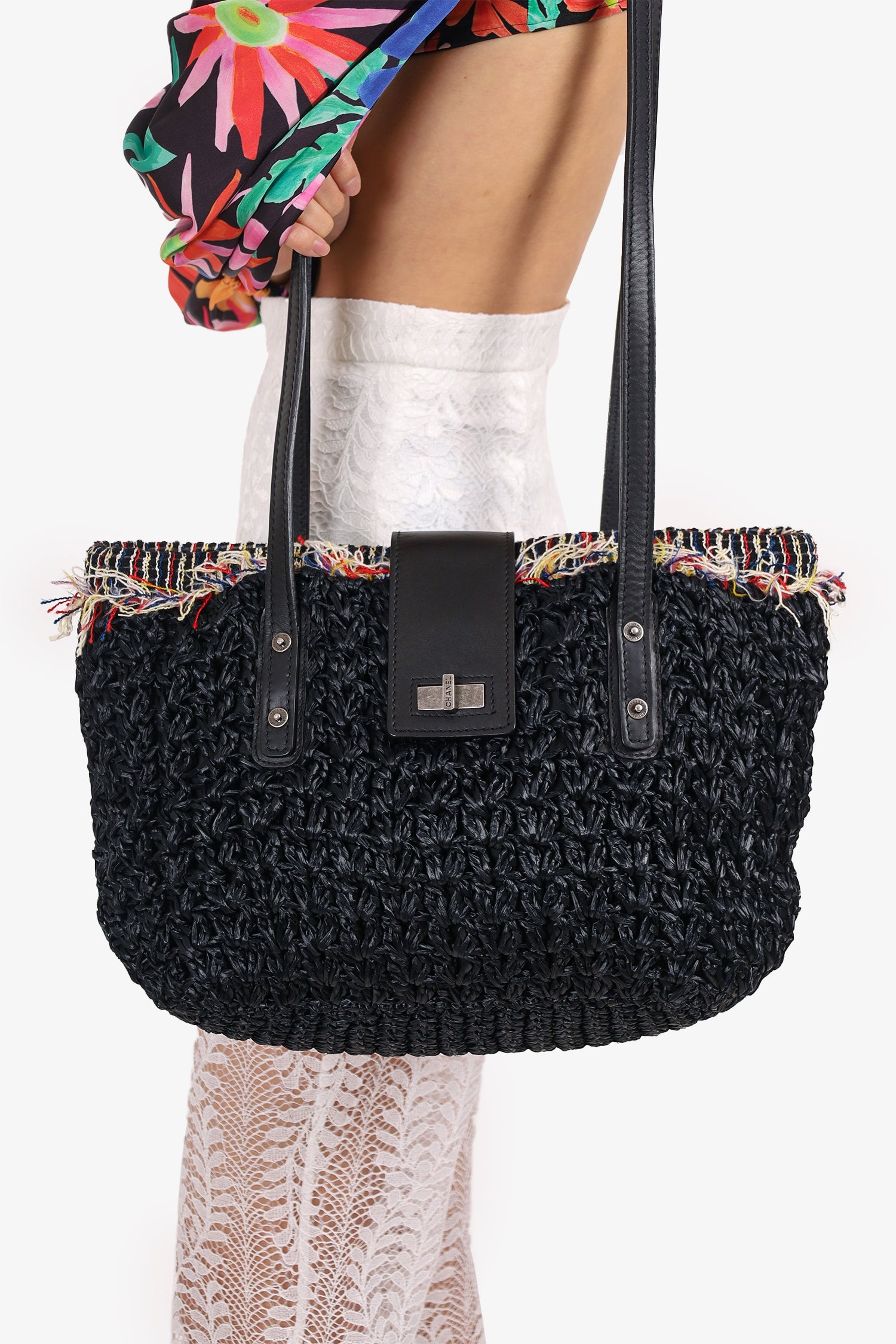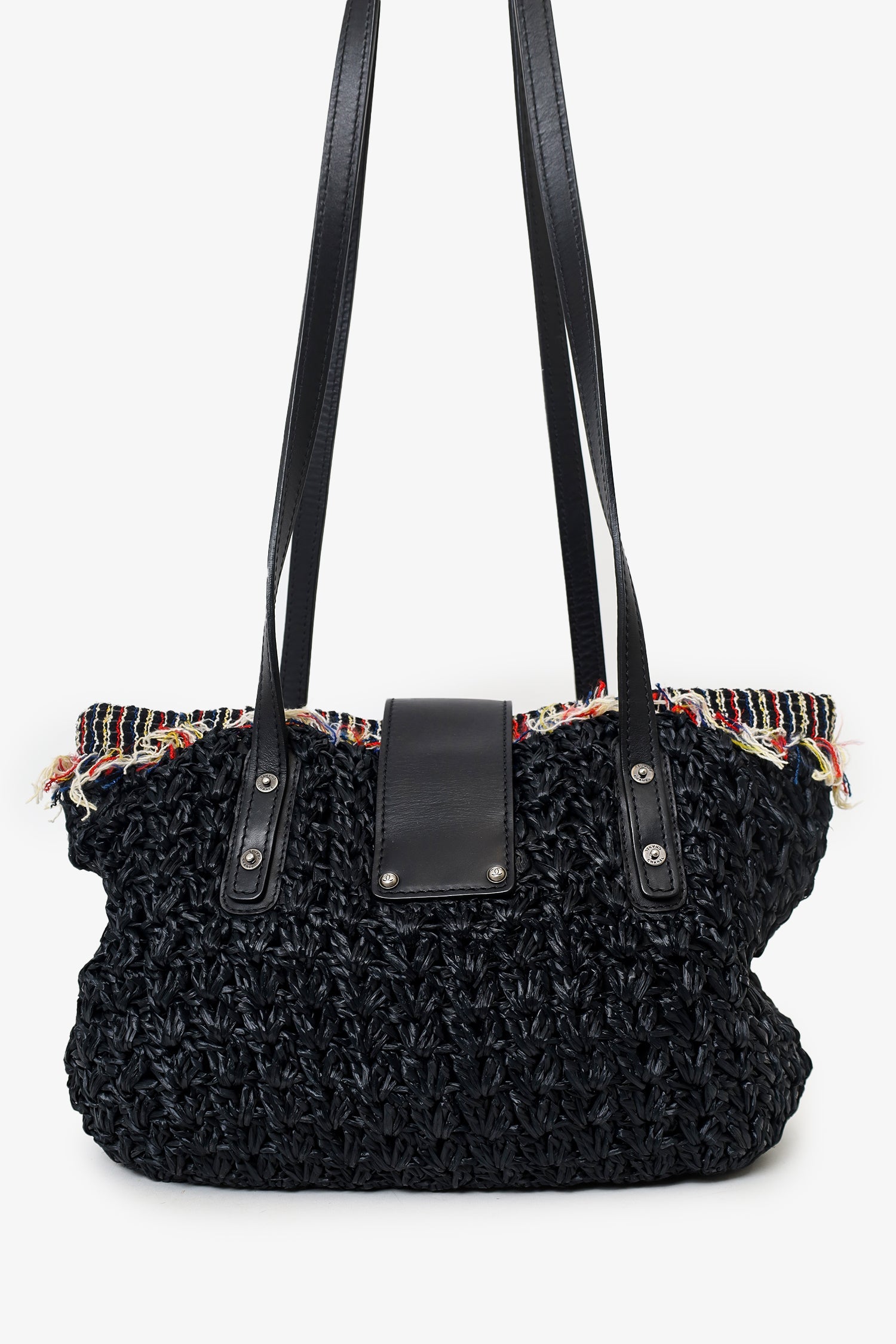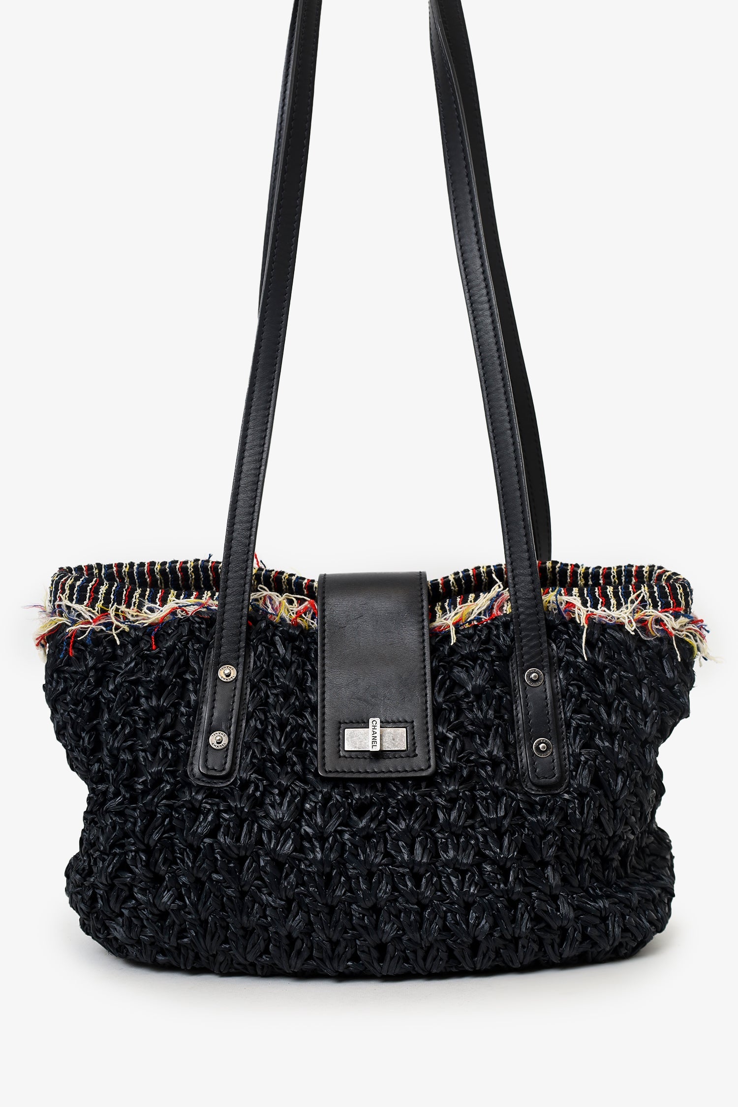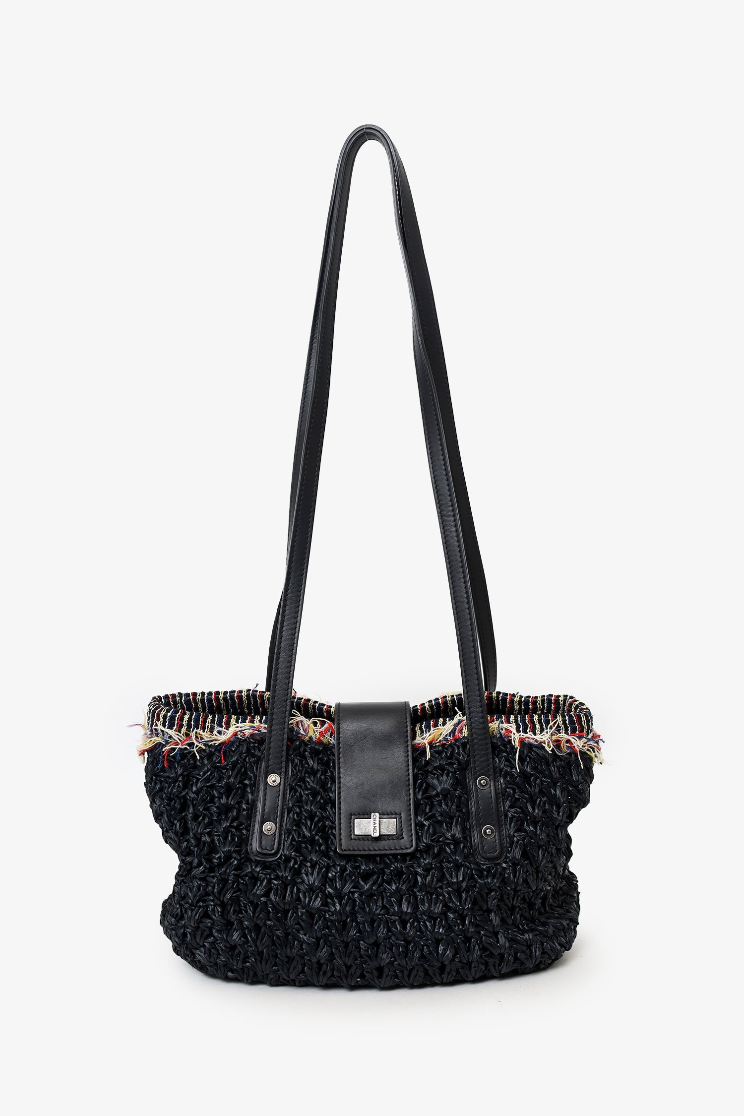 Pre-Loved Chanel™ 2010-11 Black Straw Tweed 255 Tote Bag. Front fold-over leather piece with turn-lock closure. Twin shoulder straps. Unlined. 2 interior pockets; 1 zip and 1 slip. Palladium-tone hardware. Tonal stitching.