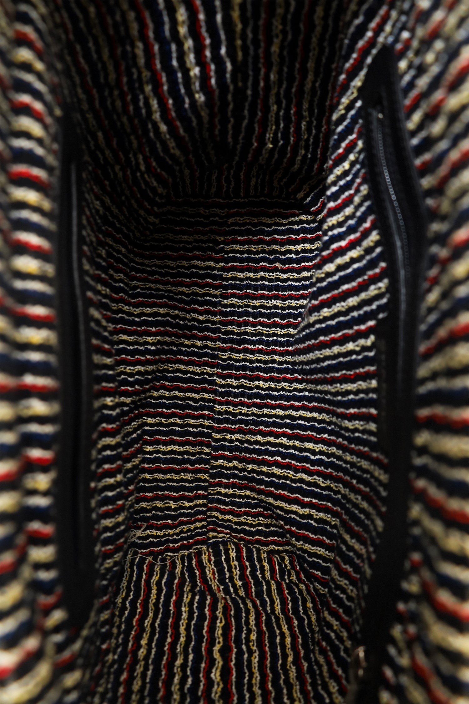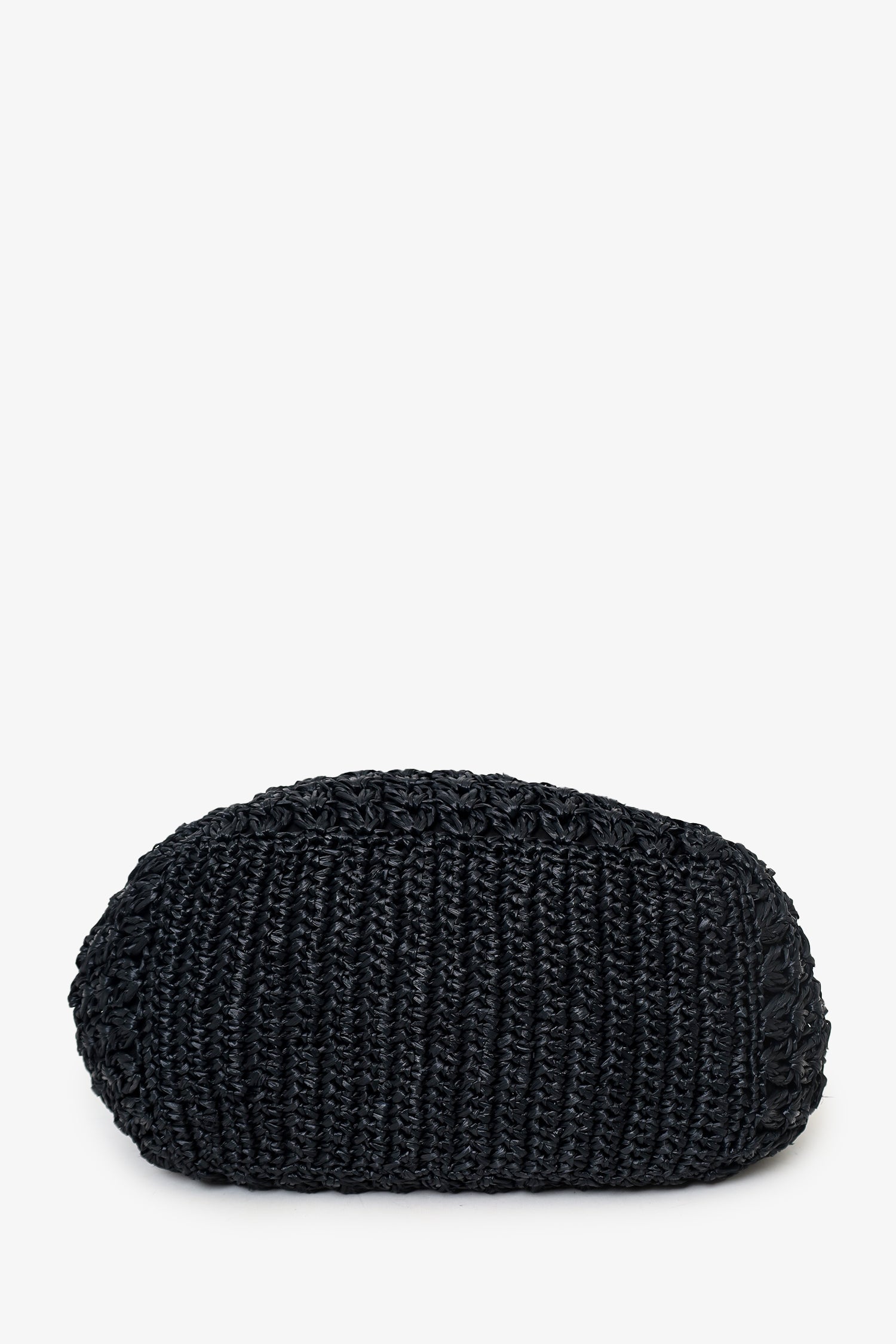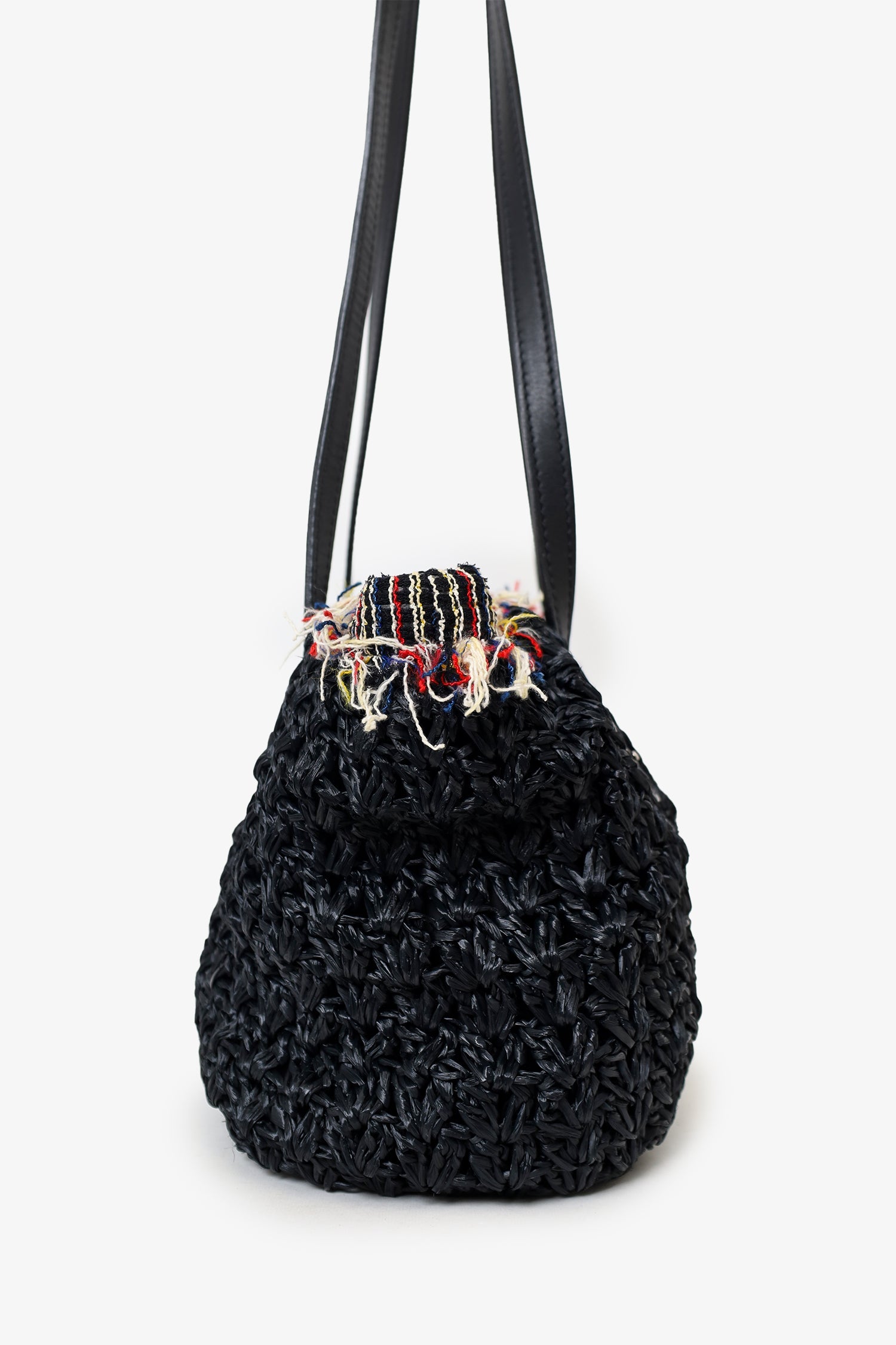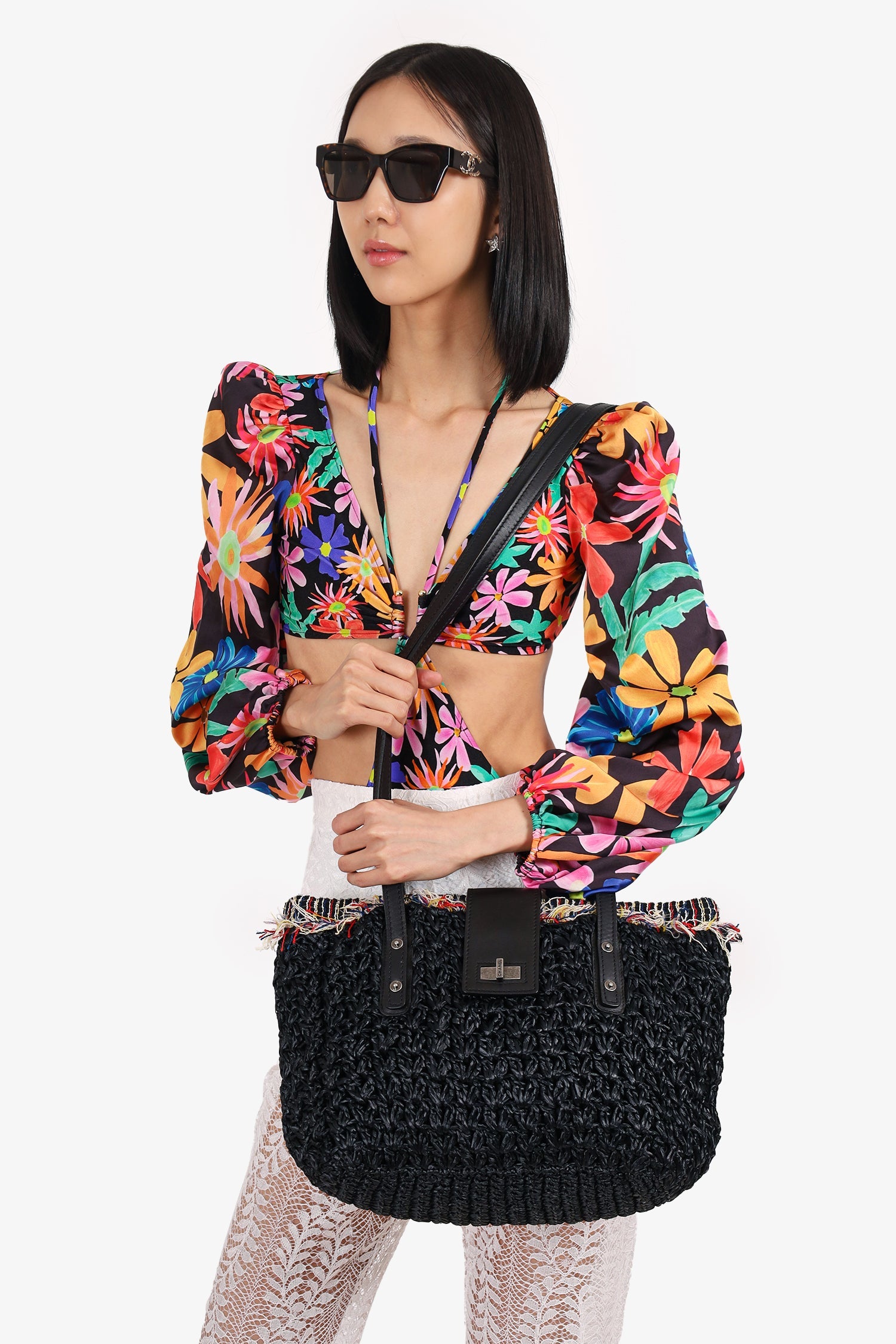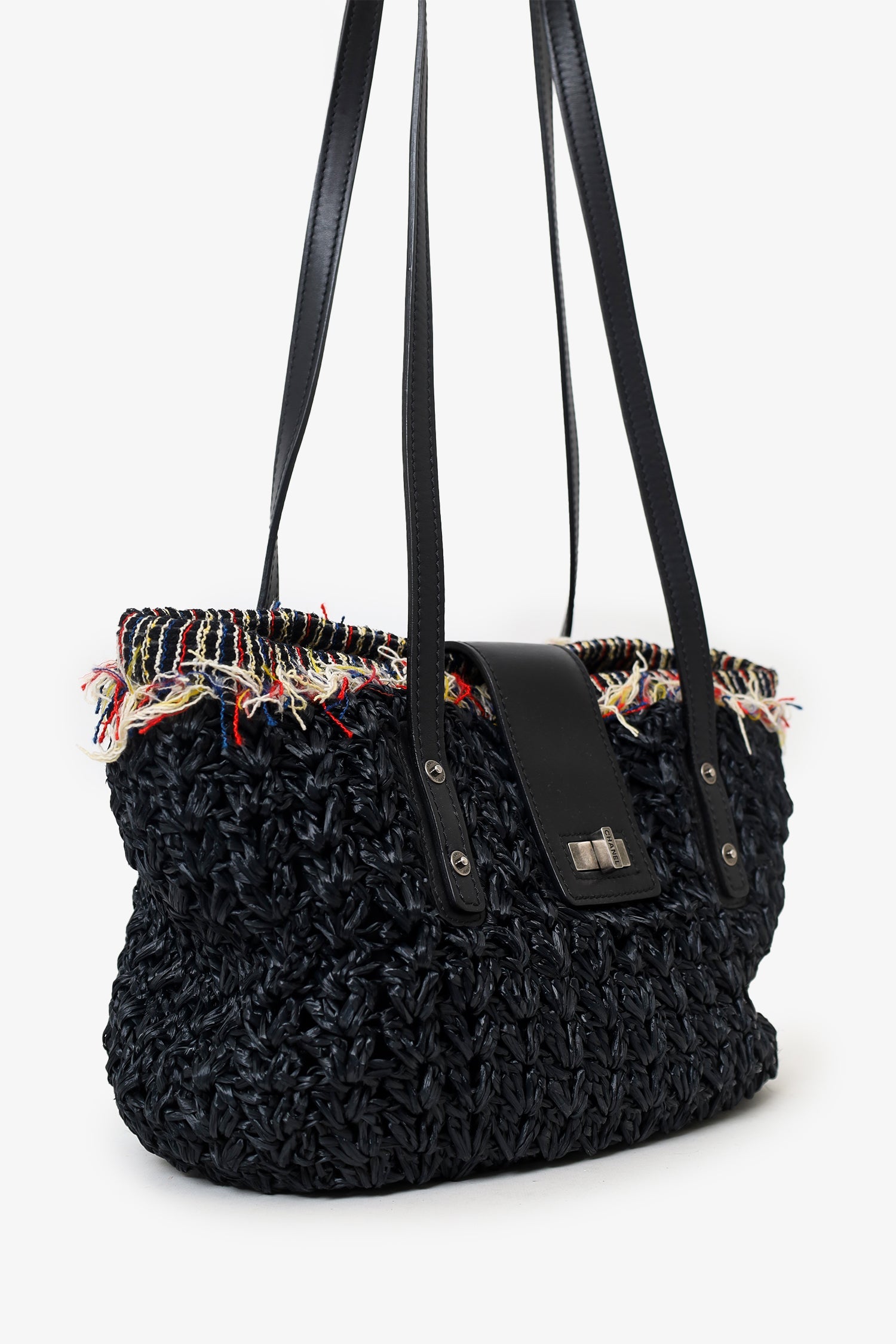 Pre-Loved Chanel™ 2010-11 Black Straw Tweed 255 Tote Bag. Front fold-over leather piece with turn-lock closure. Twin shoulder straps. Unlined. 2 interior pockets; 1 zip and 1 slip. Palladium-tone hardware. Tonal stitching.