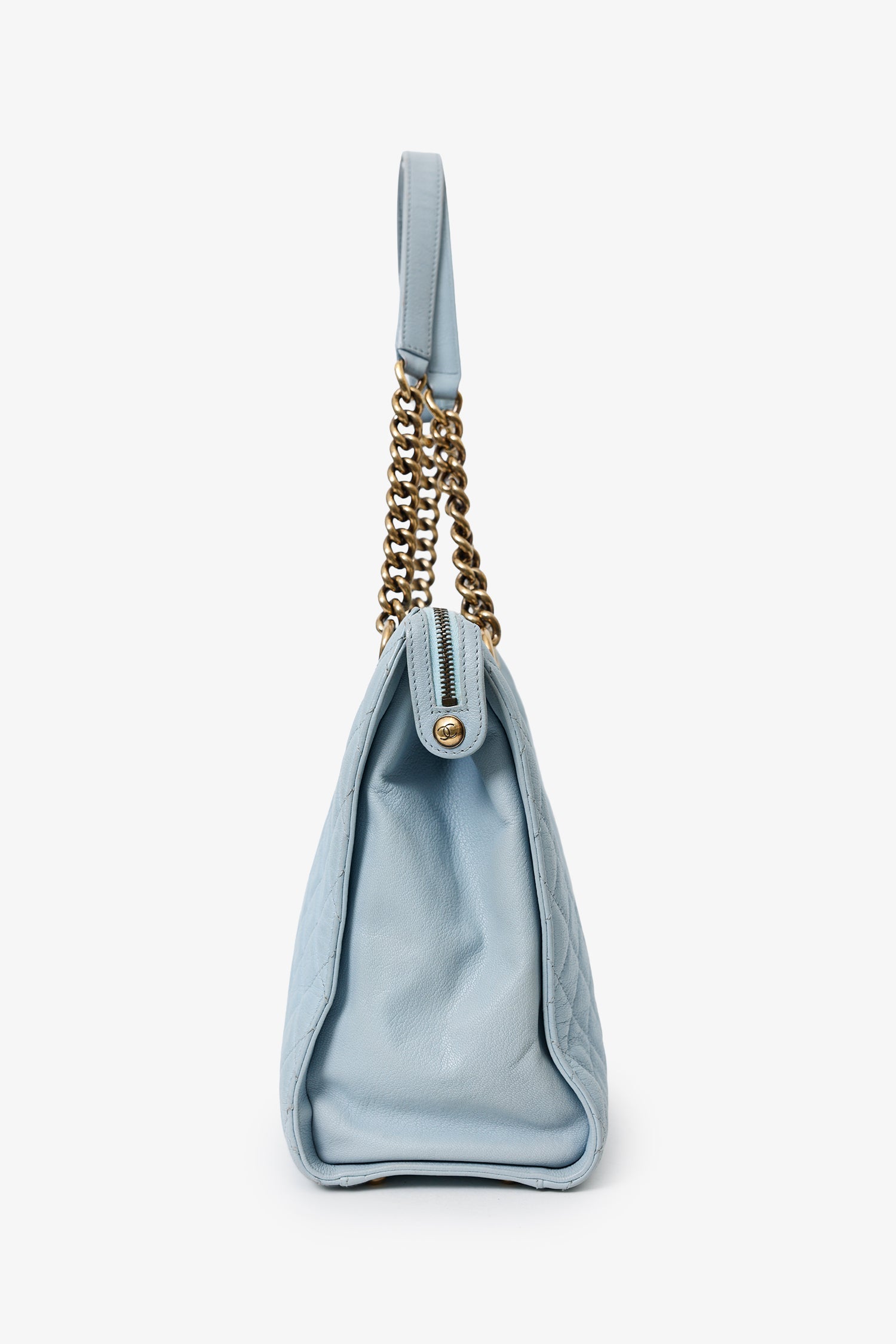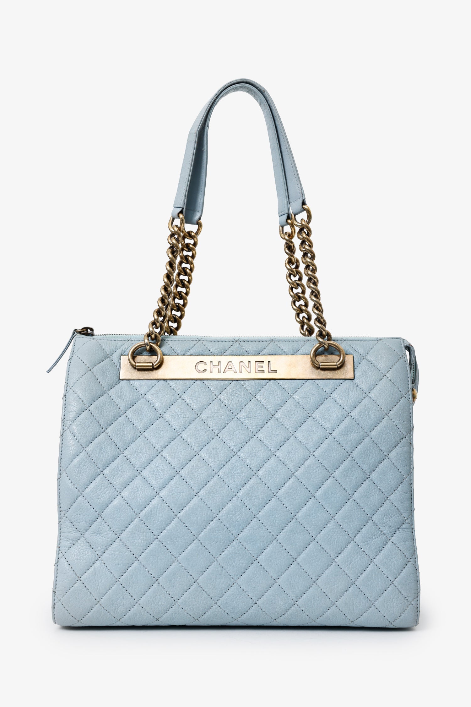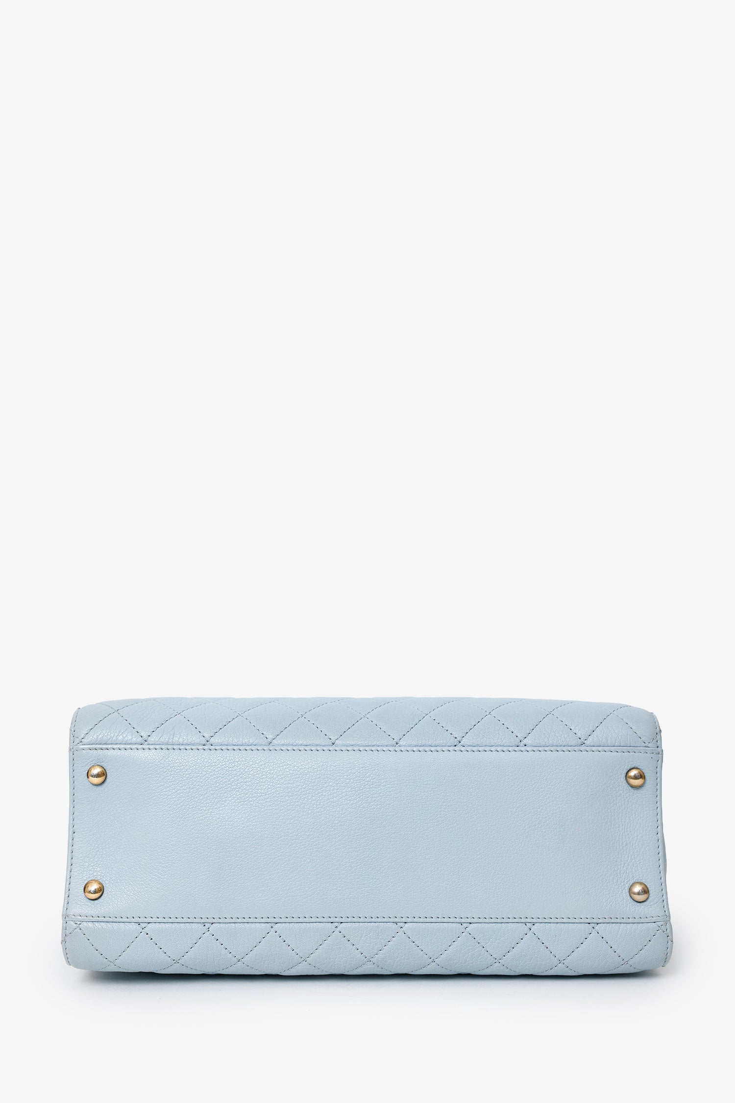 Pre-Loved Chanel™ 2012-13 Blue Quilted Leather Rita Dome Tote. Top zip-up closure. Twin shoulder straps. Protective base studs. Lined interior with 3 pockets; 2 slip, and 1 zip. Interior key ring. Brass-tone hardware. Tonal stitching.