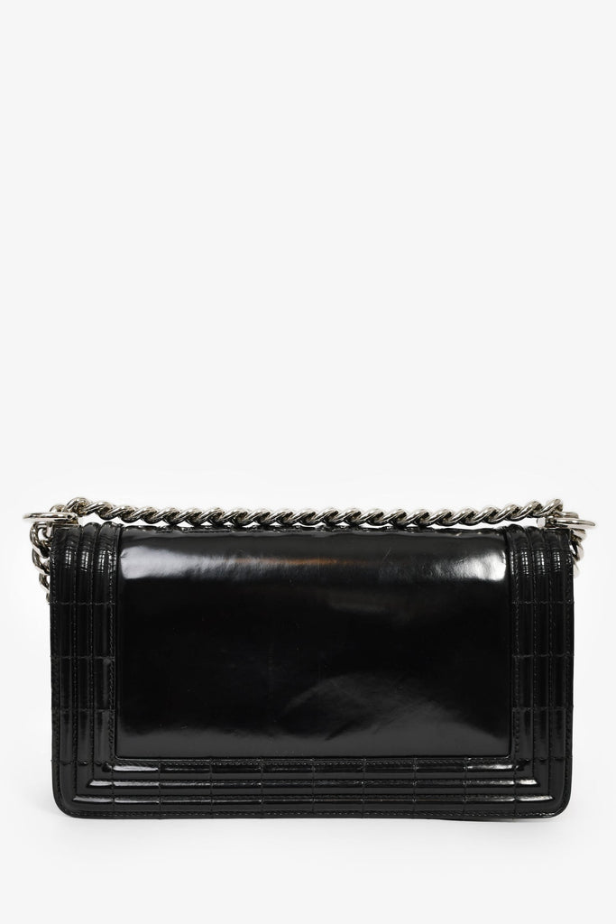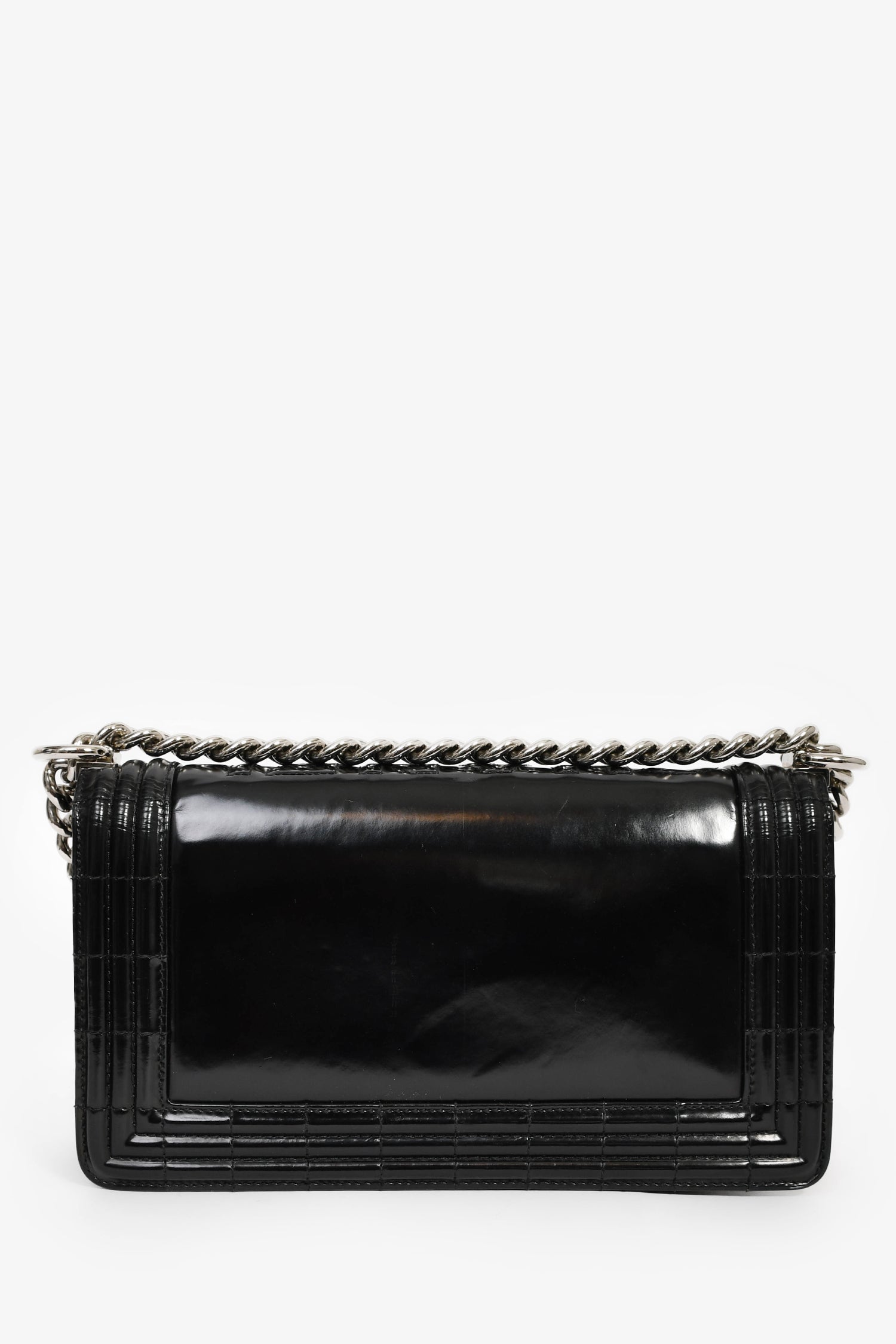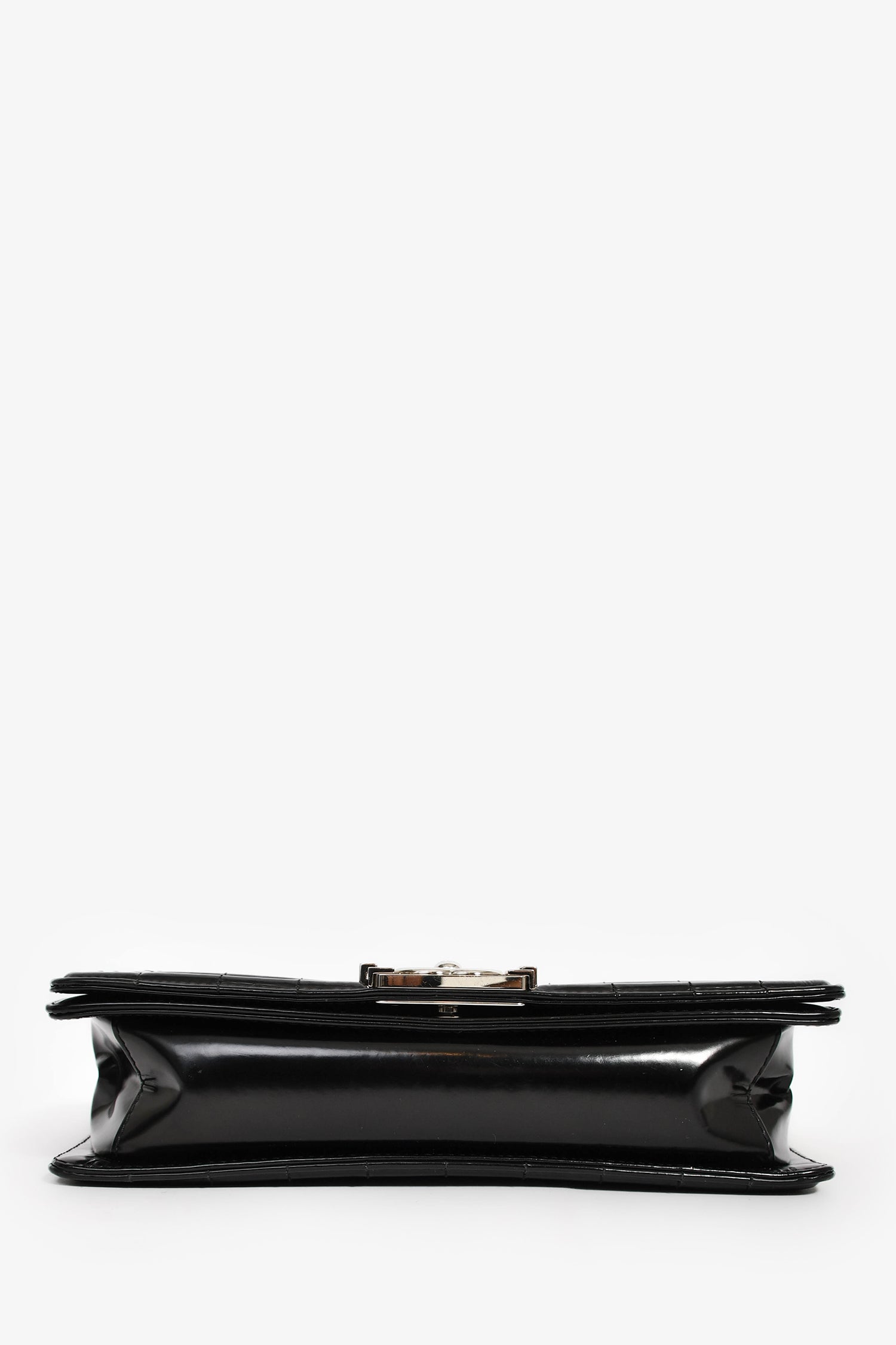 Pre-Loved Chanel™ 2012 Black Patent Leather Medium Reverso Boy Bag. Front fold-over flap with pinch-lock closure. Slide-around chain strap. Grey textile-lined interior. Single interior wall zip pocket. Silver-tone hardware. Tonal stitching.