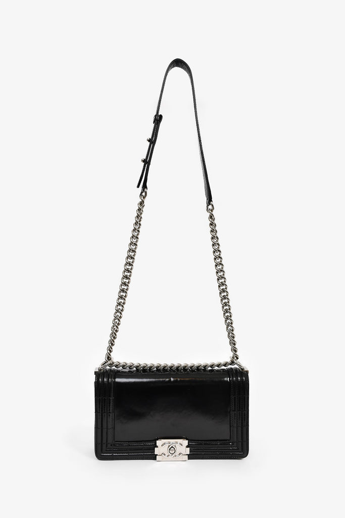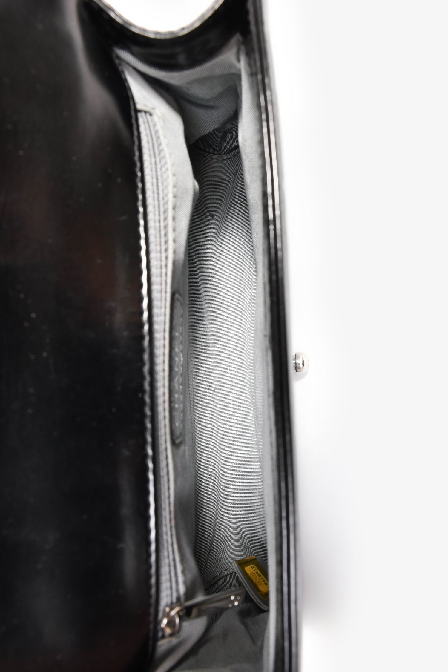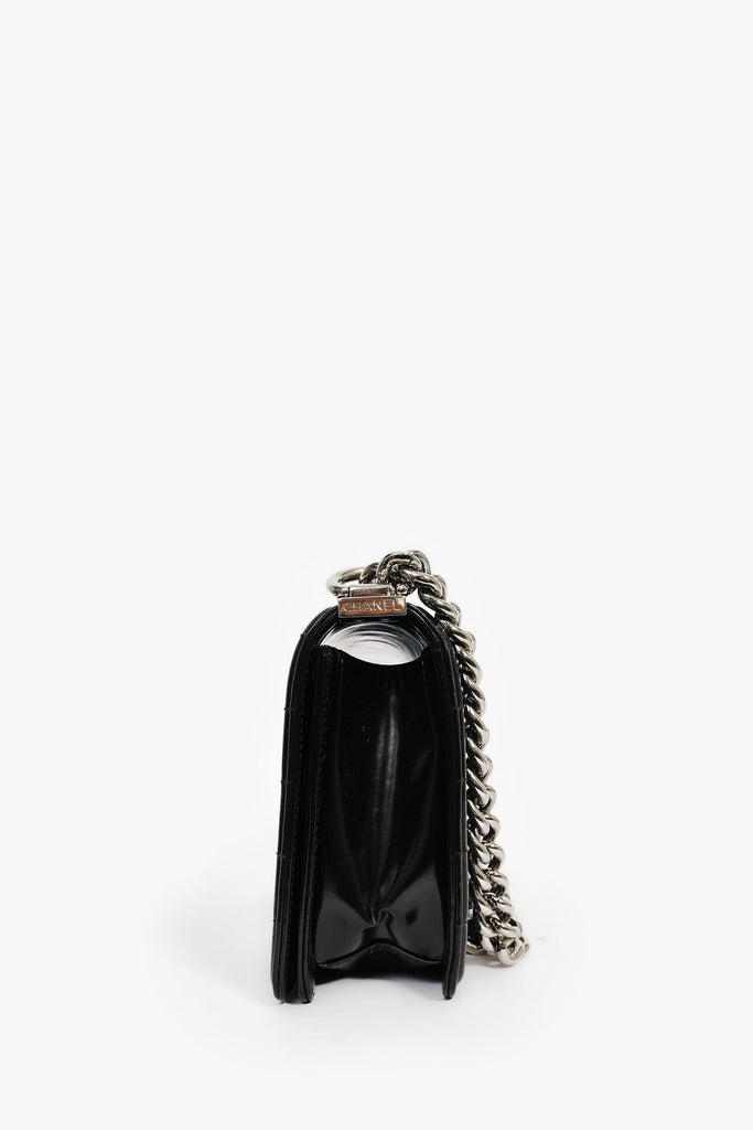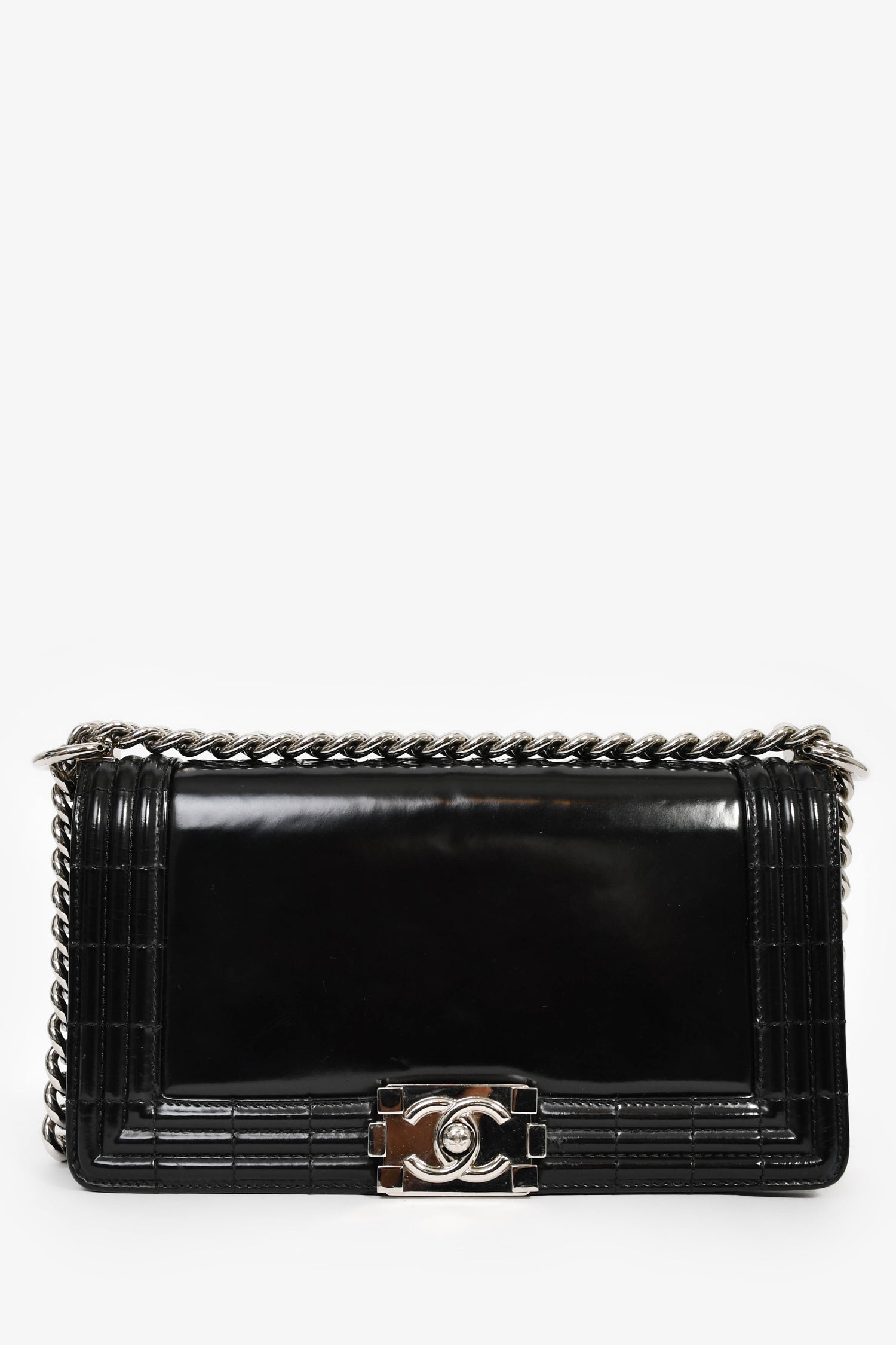 Pre-Loved Chanel™ 2012 Black Patent Leather Medium Reverso Boy Bag. Front fold-over flap with pinch-lock closure. Slide-around chain strap. Grey textile-lined interior. Single interior wall zip pocket. Silver-tone hardware. Tonal stitching.