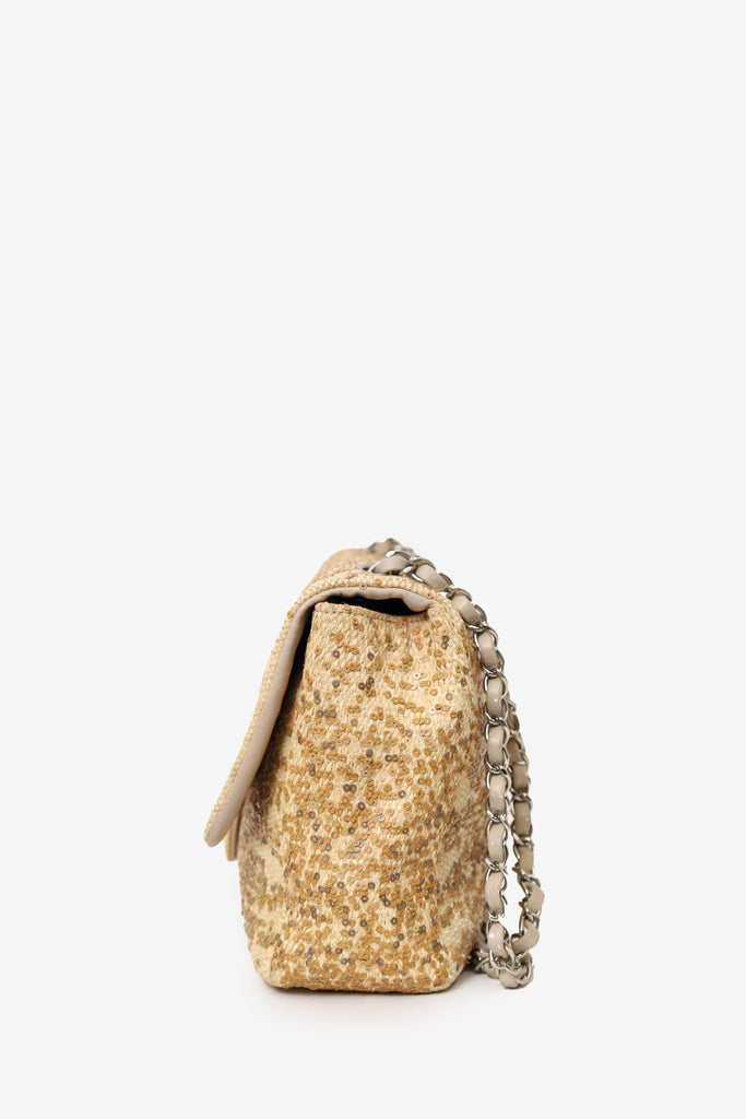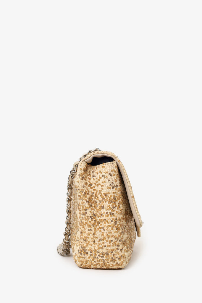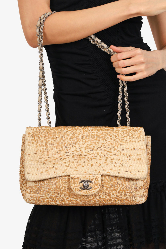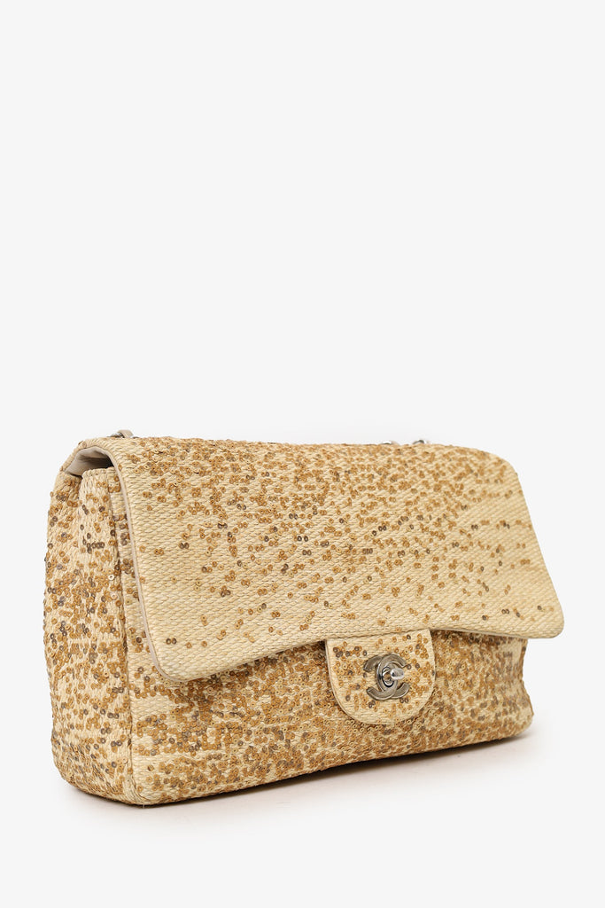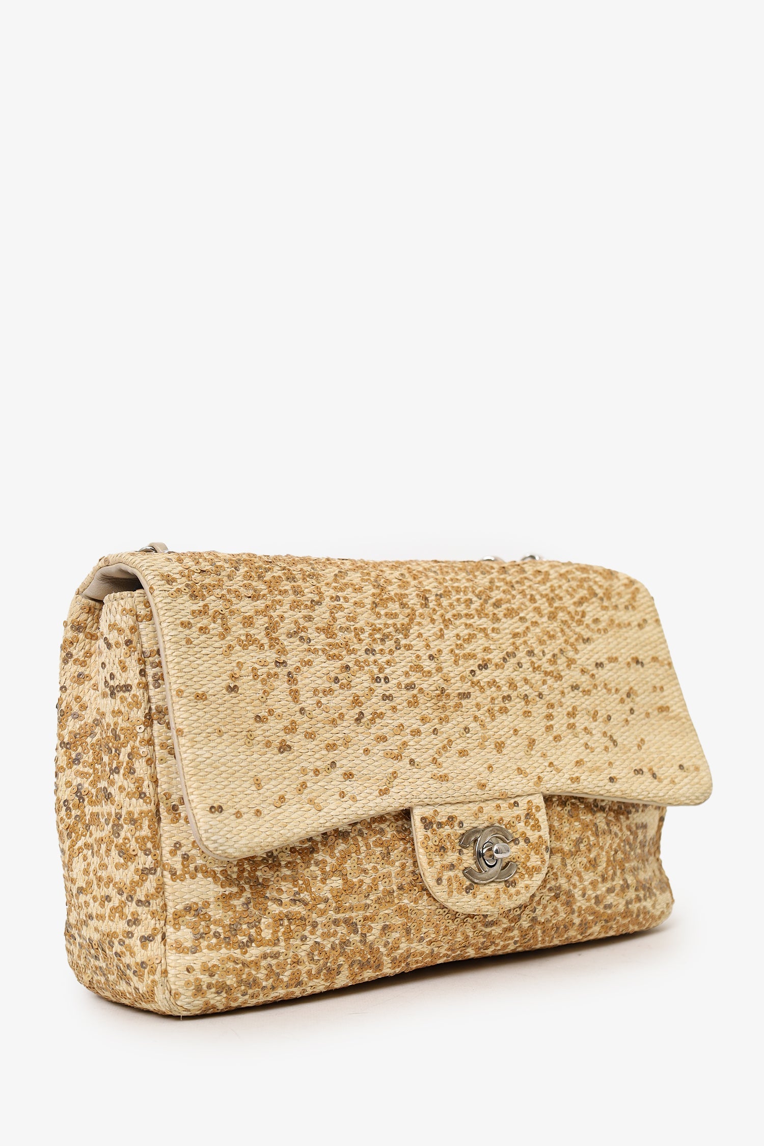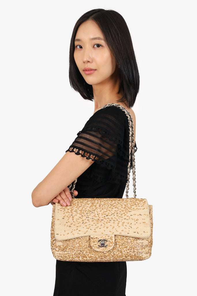 Pre-Loved Chanel™ 2013-14 Beige Raffia Sequin Small Single Flap Bag. Front fold-over flap with turn-lock closure. Twin chainlink strap that can be pulled into one long strap. Leather-lined interior. 2 interior pockets; 1 zip and 1 slip. Silver-tone hardware. Tonal stitching.