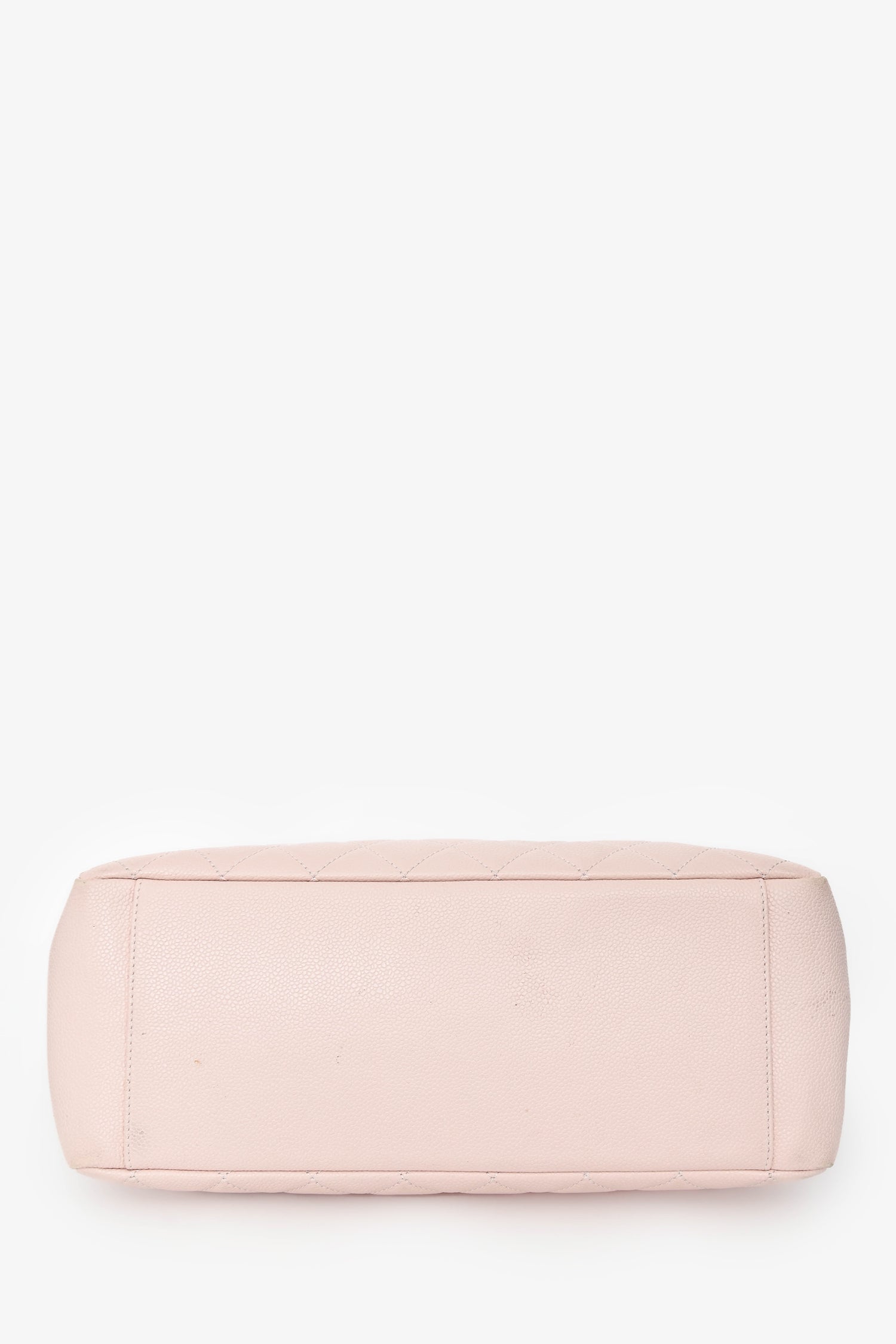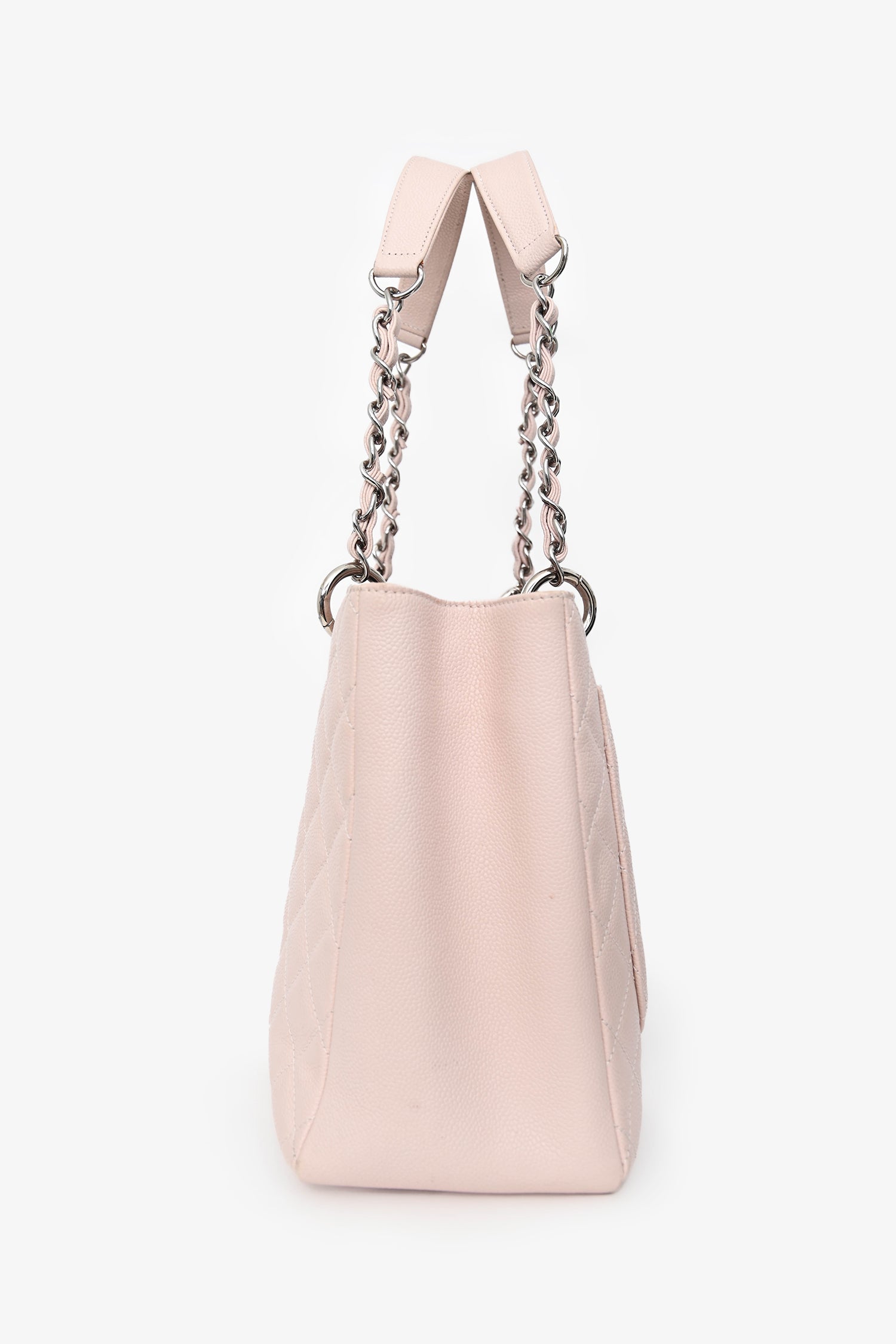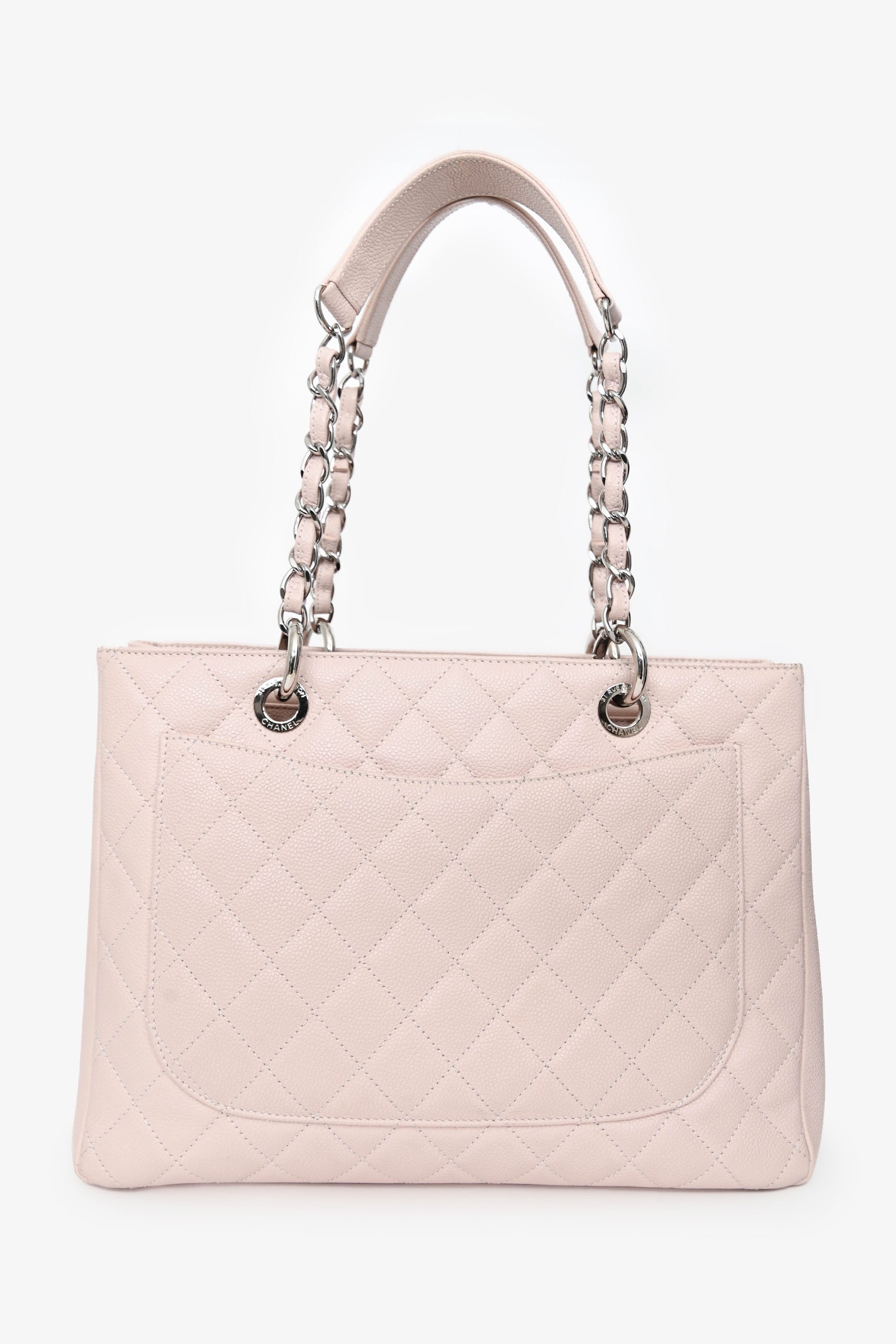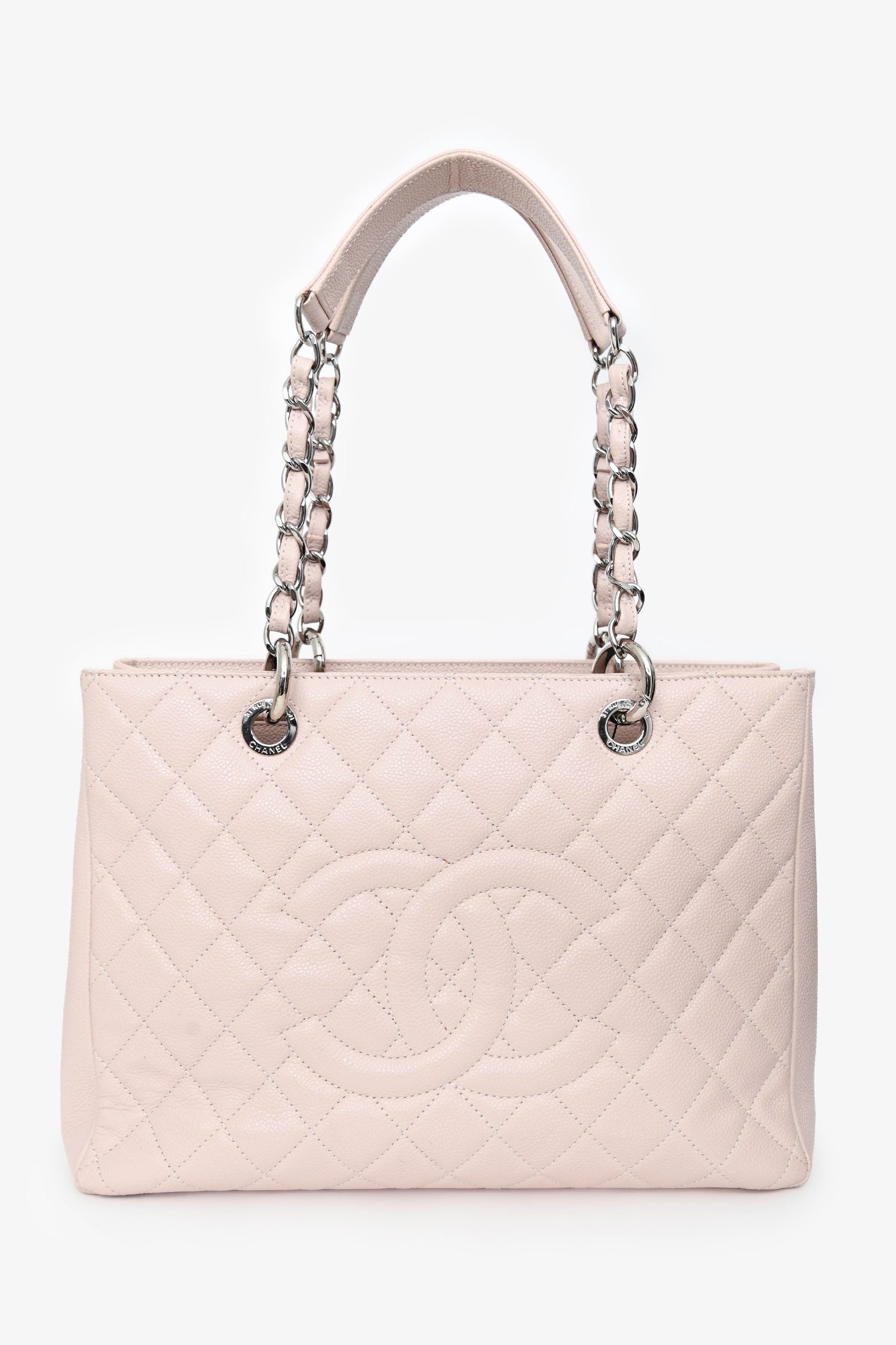 Pre-Loved Chanel™ 2013/2014 Pink Caviar Leather CC Grand Shopping Tote. Open top. Twin chain handles. Rear exterior wall slip pocket. Open compartment with 3 interior pockets; 1 middle zip slot. 1 wall zip pocket, and 1 slip pocket. Textile-lined interior. Silver-tone hardware. Tonal stitching.