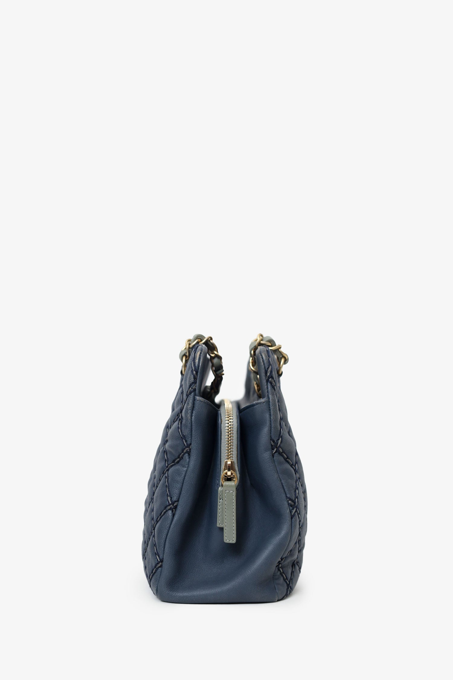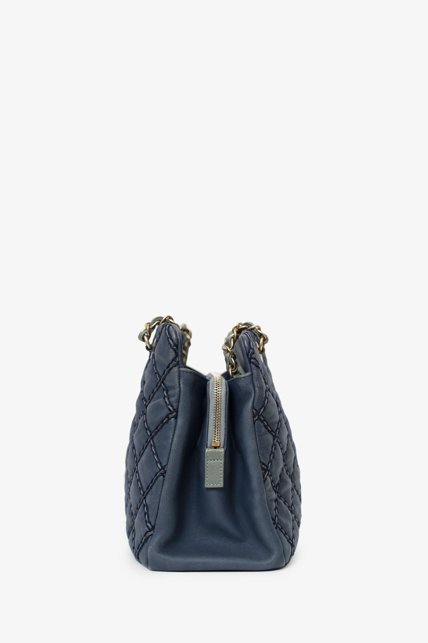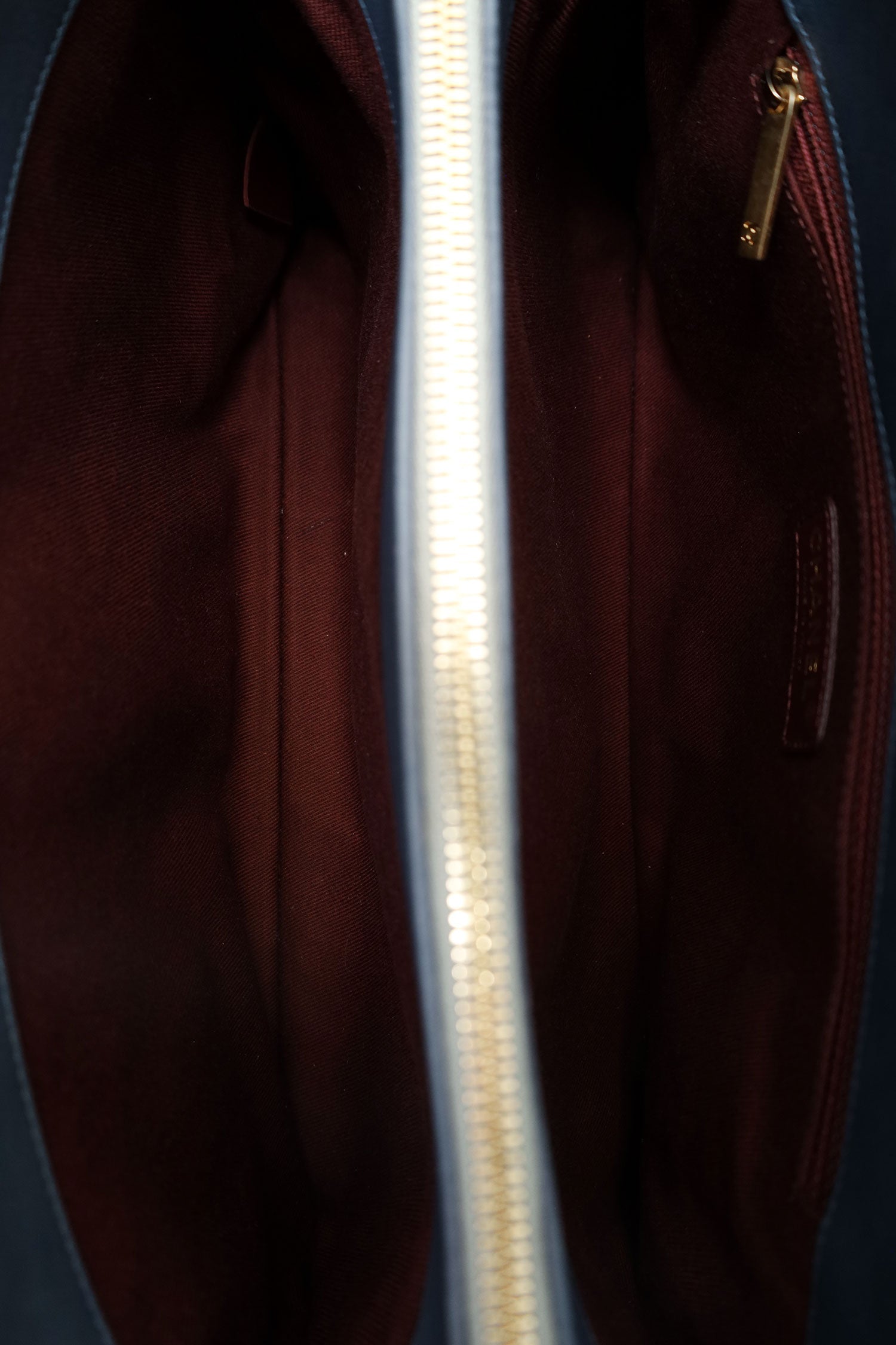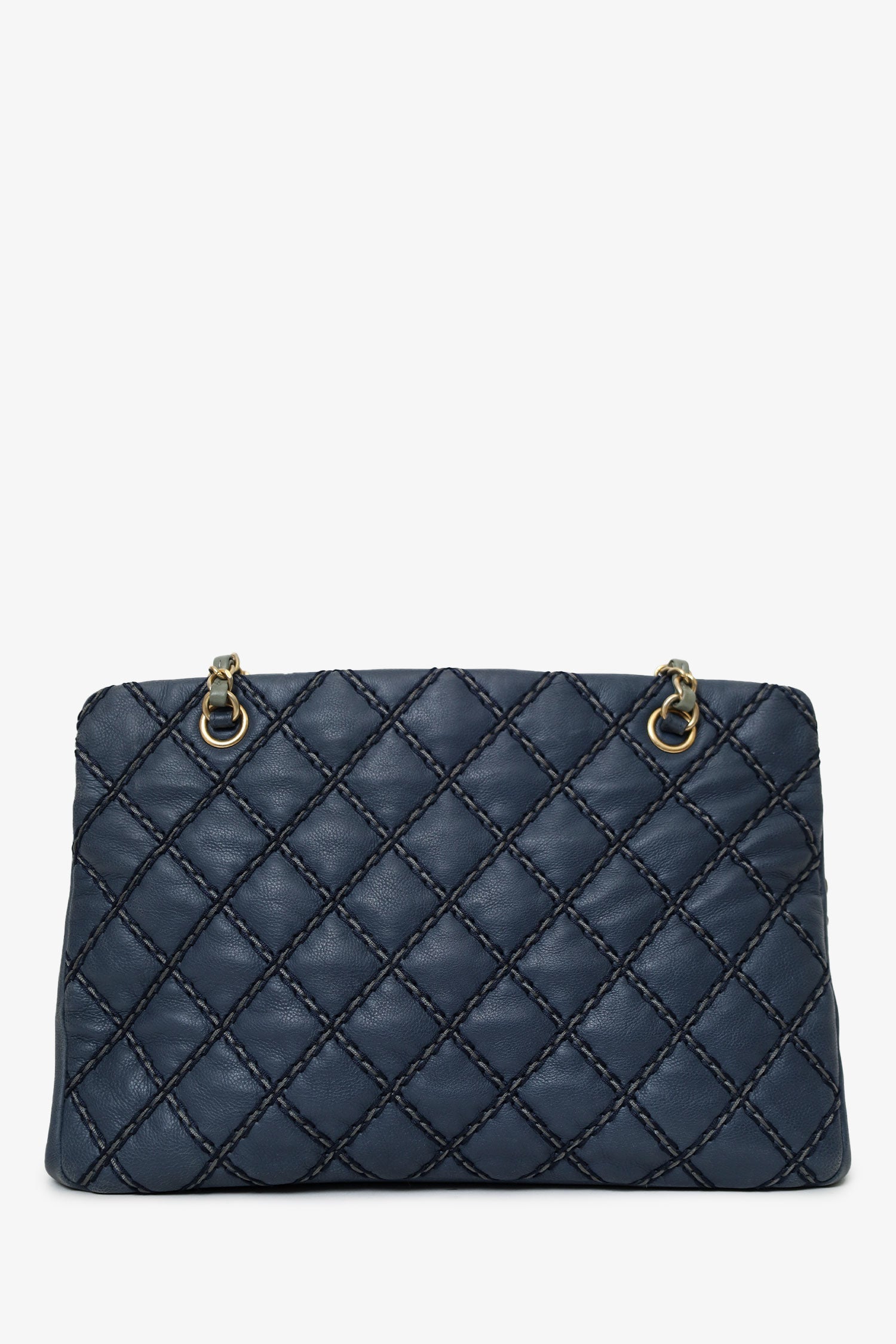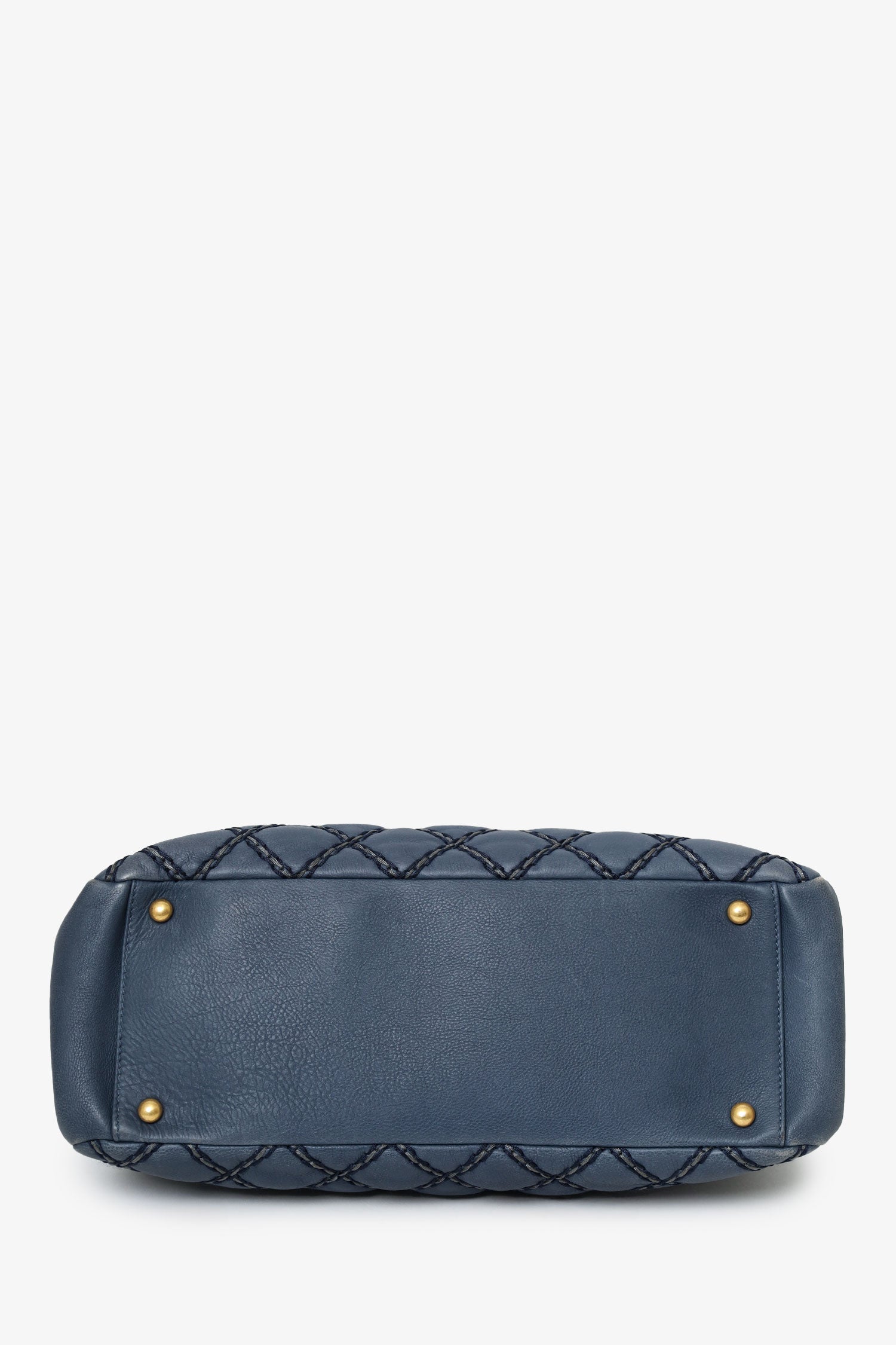Pre-Loved Chanel™ 2014 Blue Leather Paris-Dallas Chic Stitch Bag. Top open. Twin leather straps. Protective base studs. 3 interior compartments; front open, middle zip and rear with single zip pocket. Gold-tone hardware. Tonal stitching.