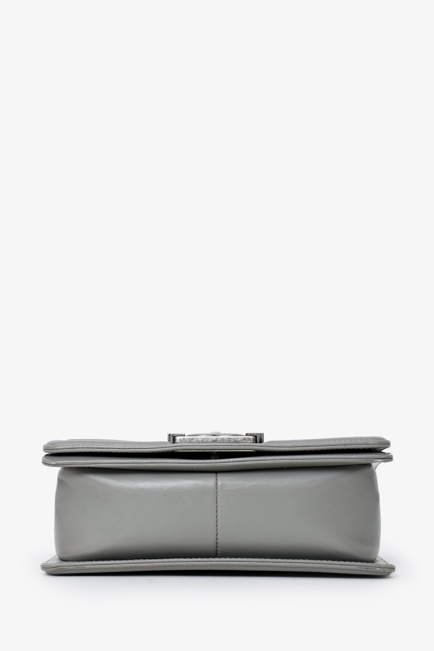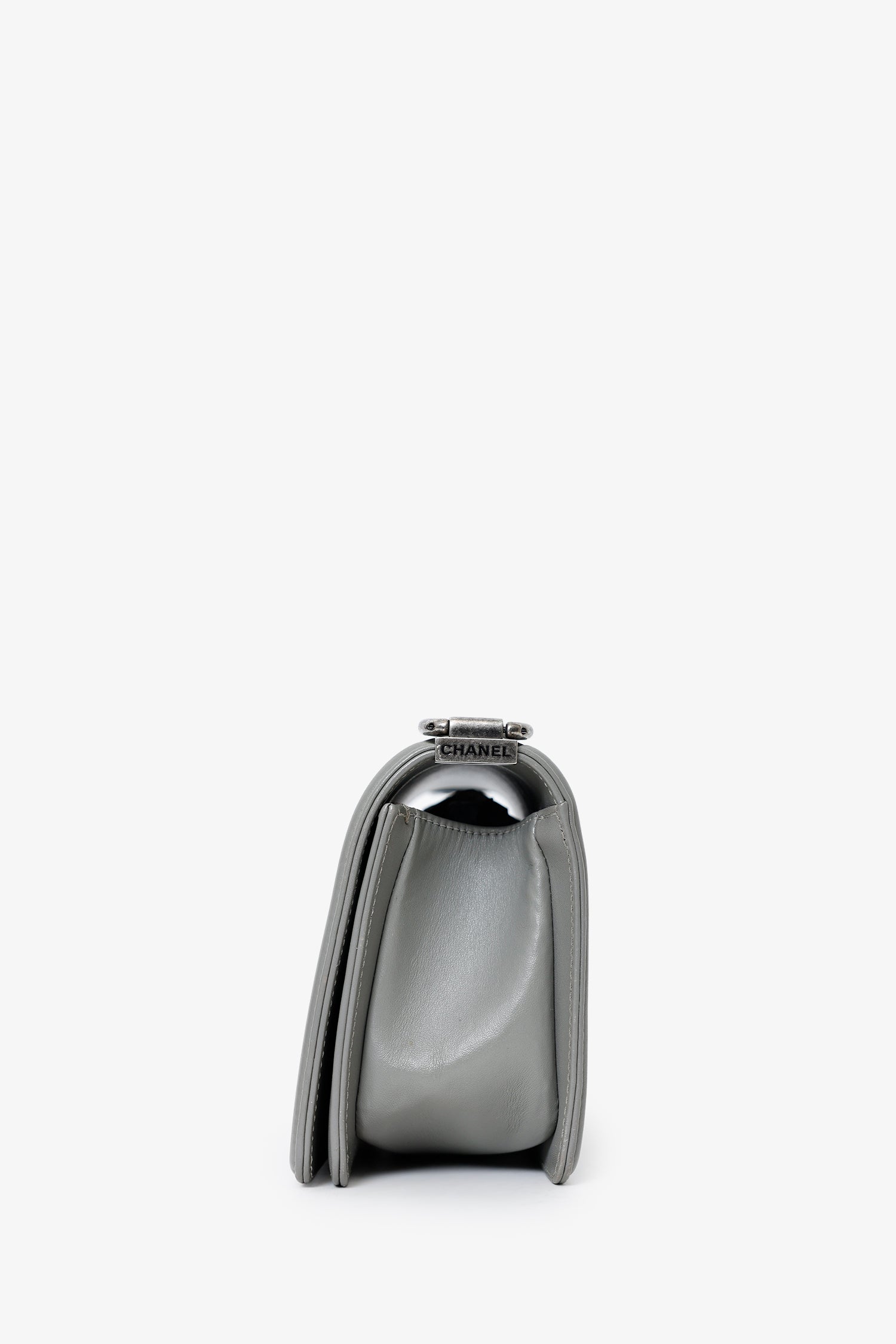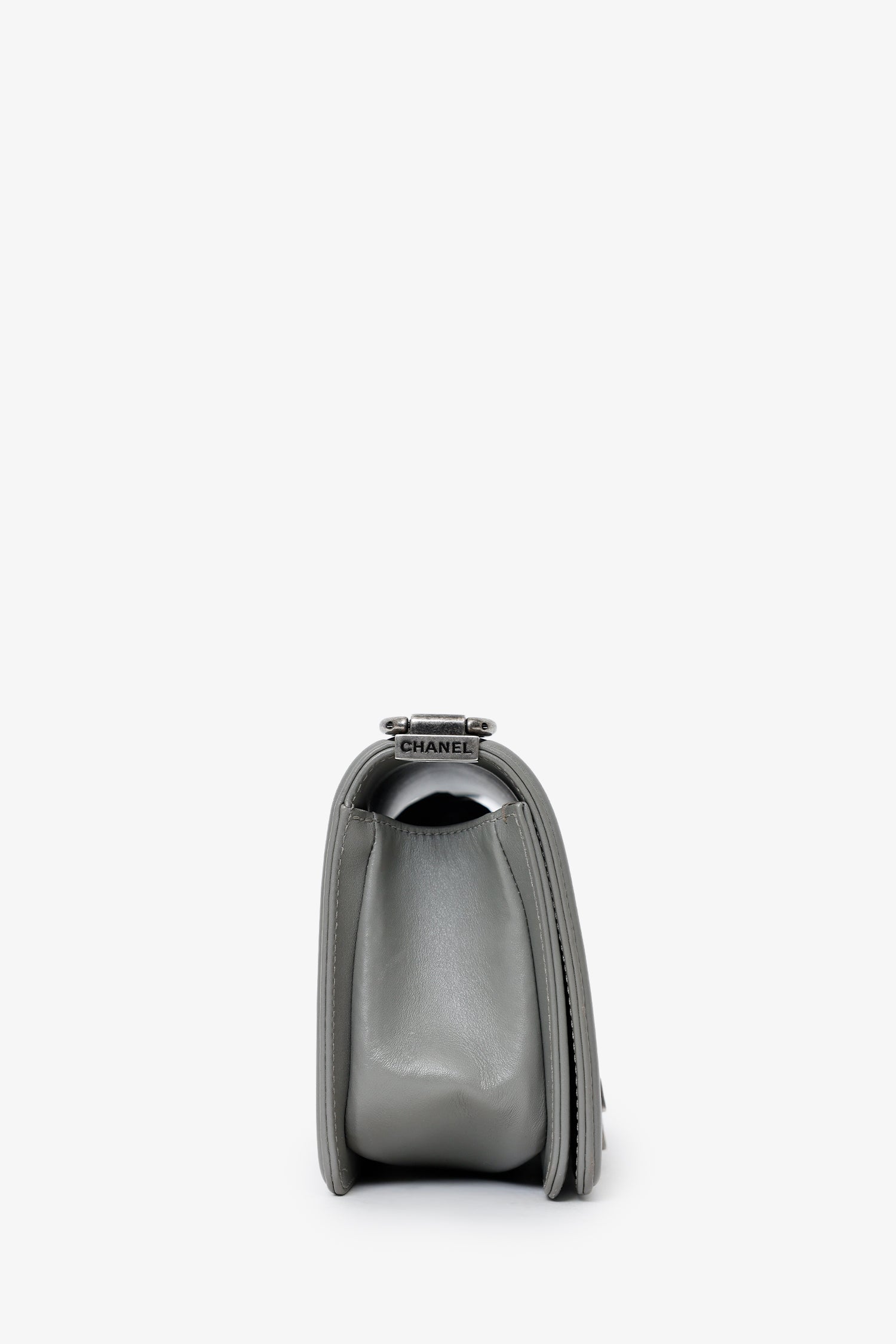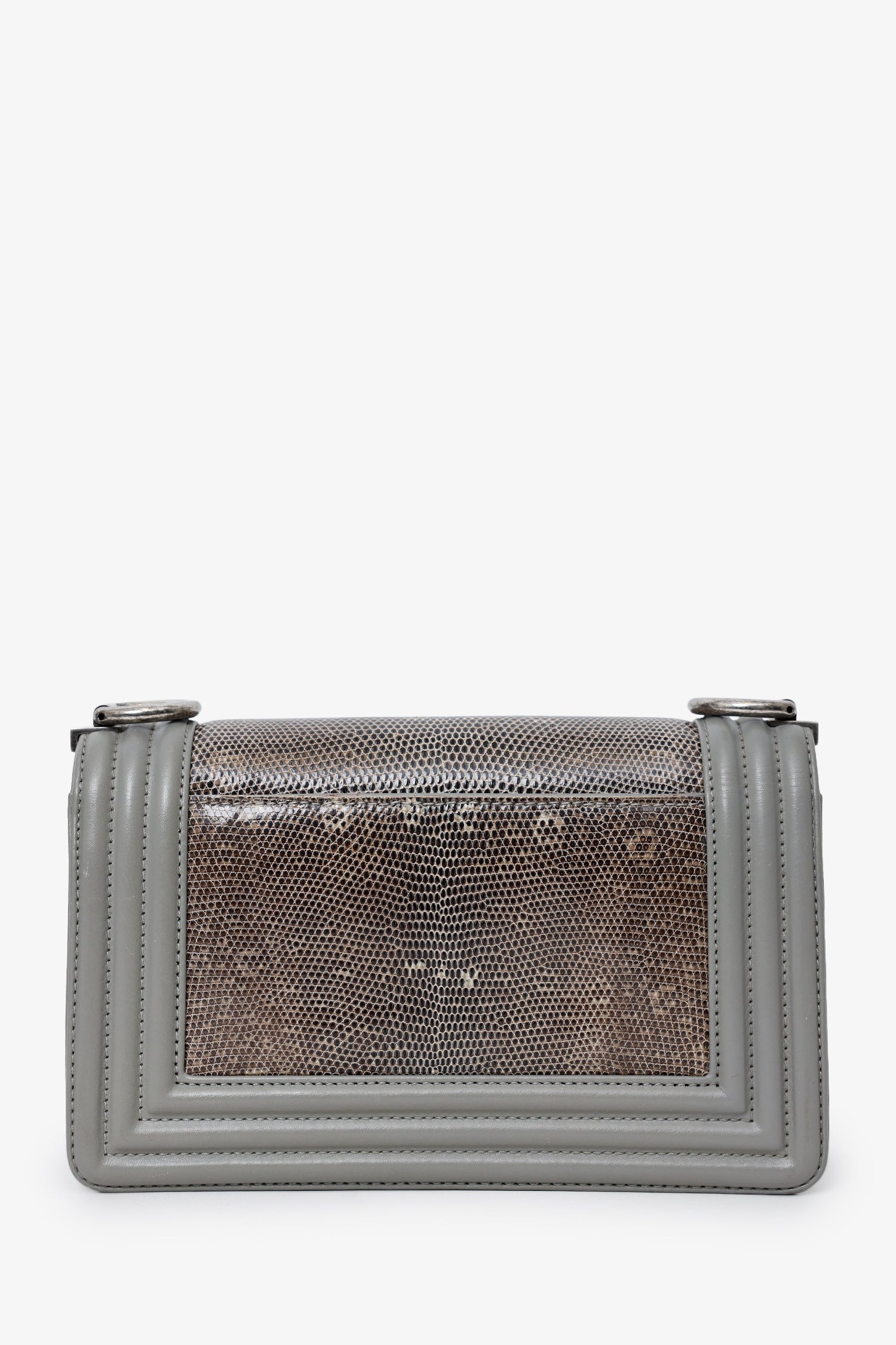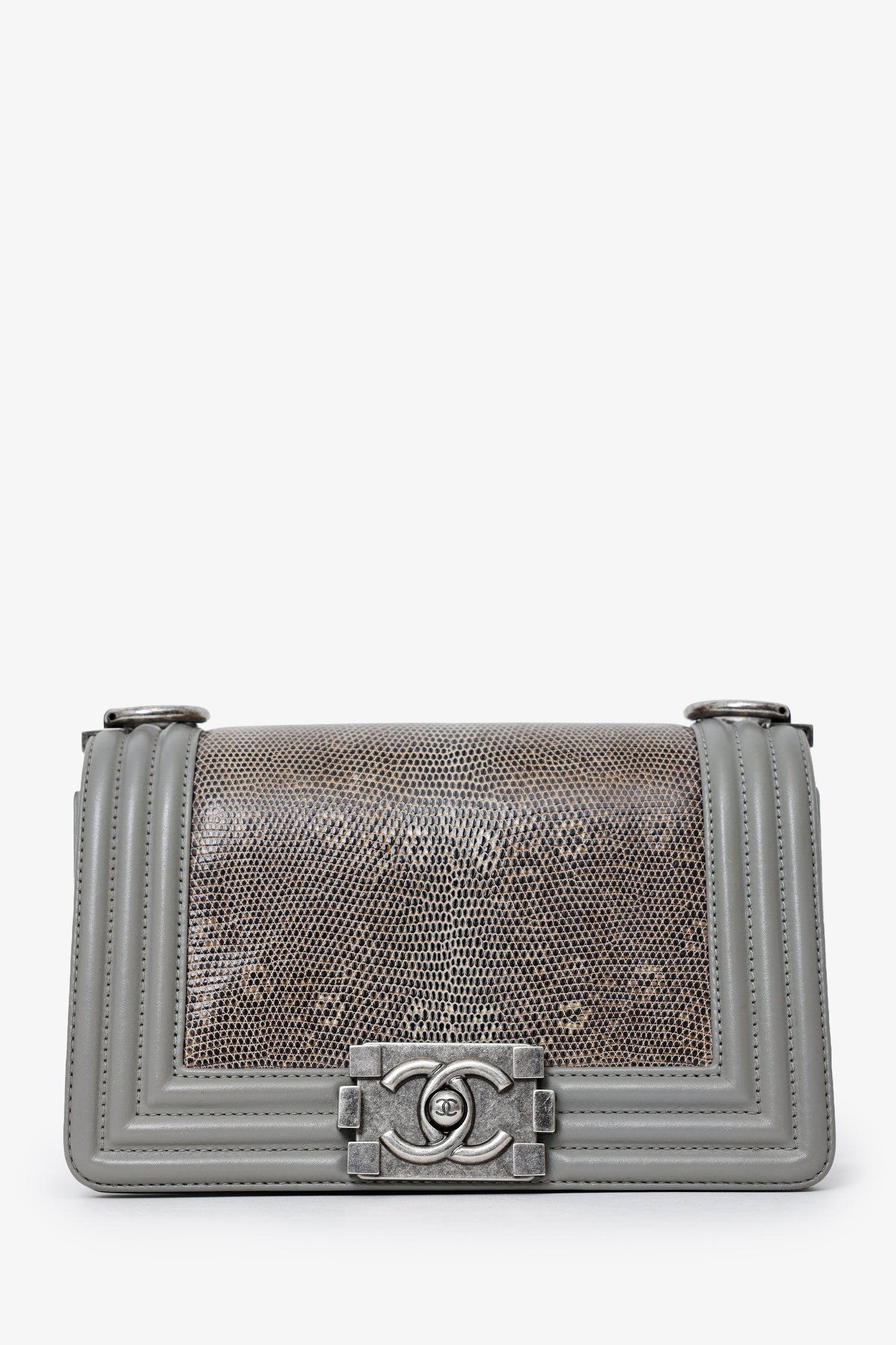 Pre-Loved Chanel™ 2014 Grey Lizard Leather Small Boy Bag. Front-fold-over-flap with push-lock closure. 2-way chain link and leather shoulder strap. Single exterior rear slip pocket. Lined interior with single rear slip pocket. Gunmetal-tone hardware. Tonal stitching.