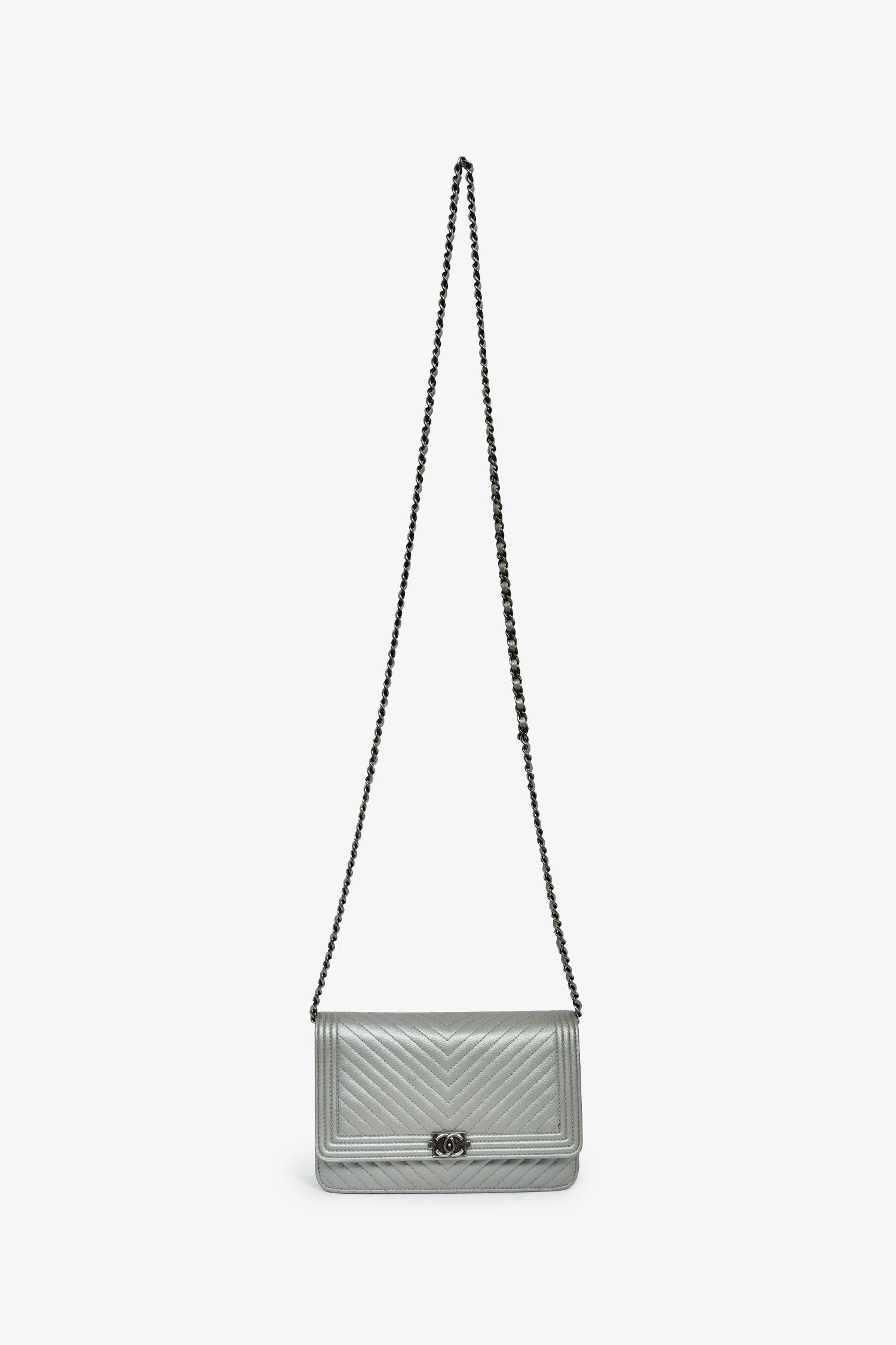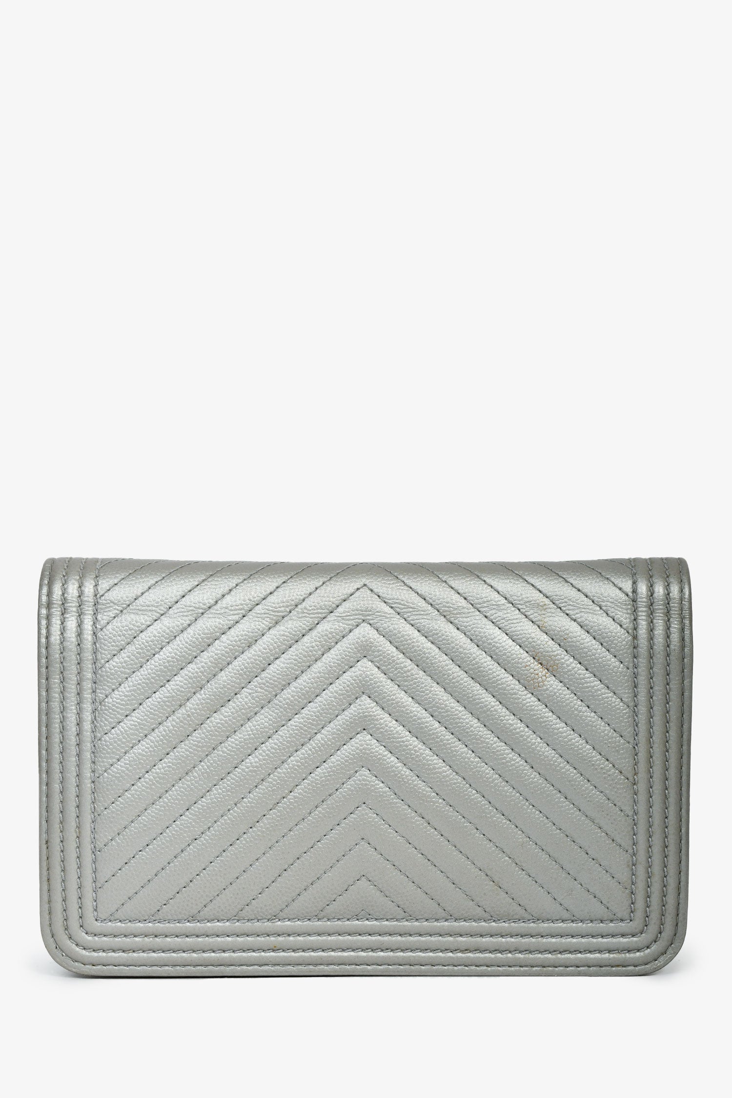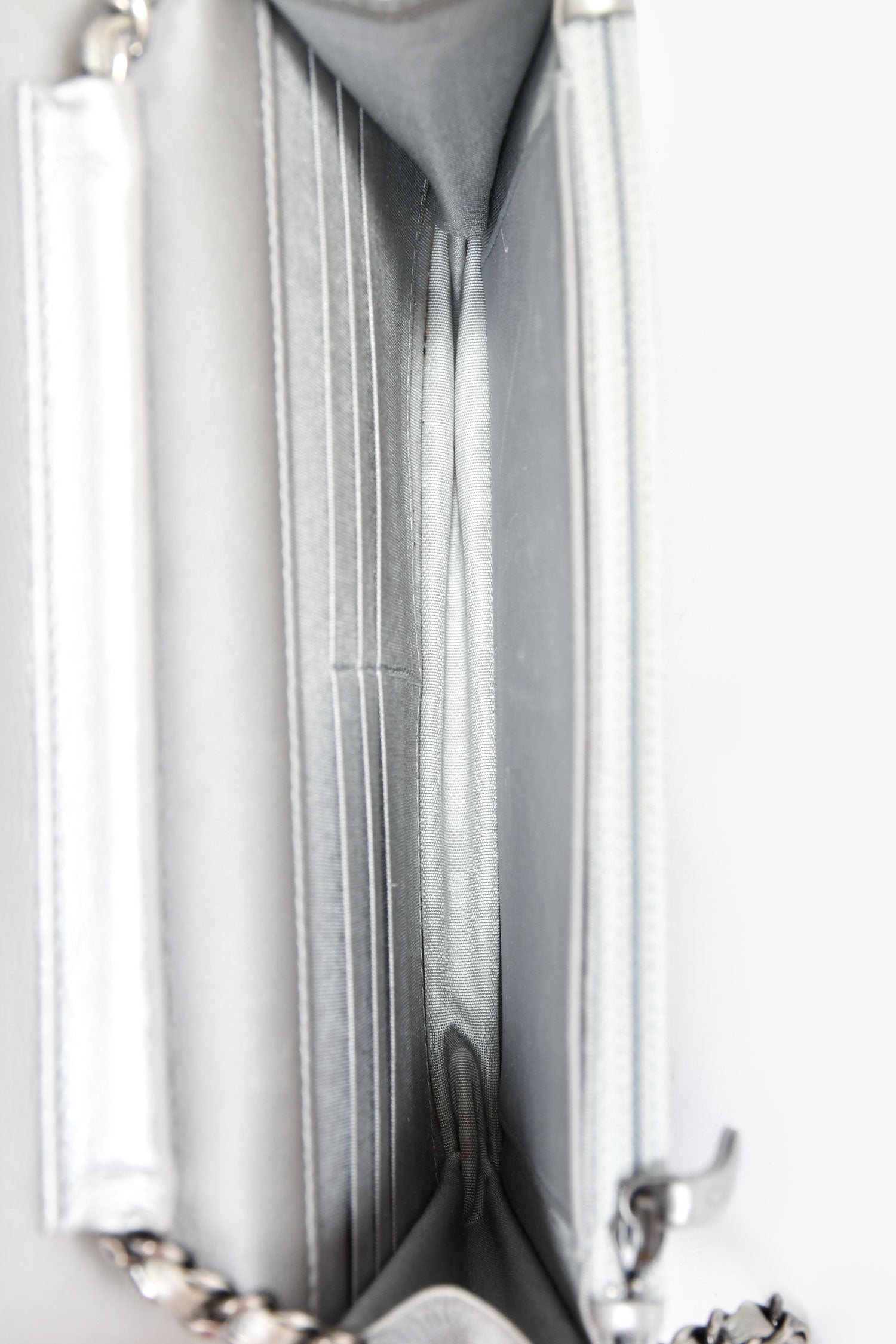 Pre-Loved Chanel™ 2016 Silver Metallic Caviar Leather Chevron Wallet on Chain. Front fold-over flap with snap button. 3 exterior pockets: 1 zip pocket under flap, 1 front zip and 1 slip pocket. Interior compartment with 6 card slots and 1 wall slip pocket. Purposely distressed silver-tone hardware. Textile-lined interior. Tonal stitching.