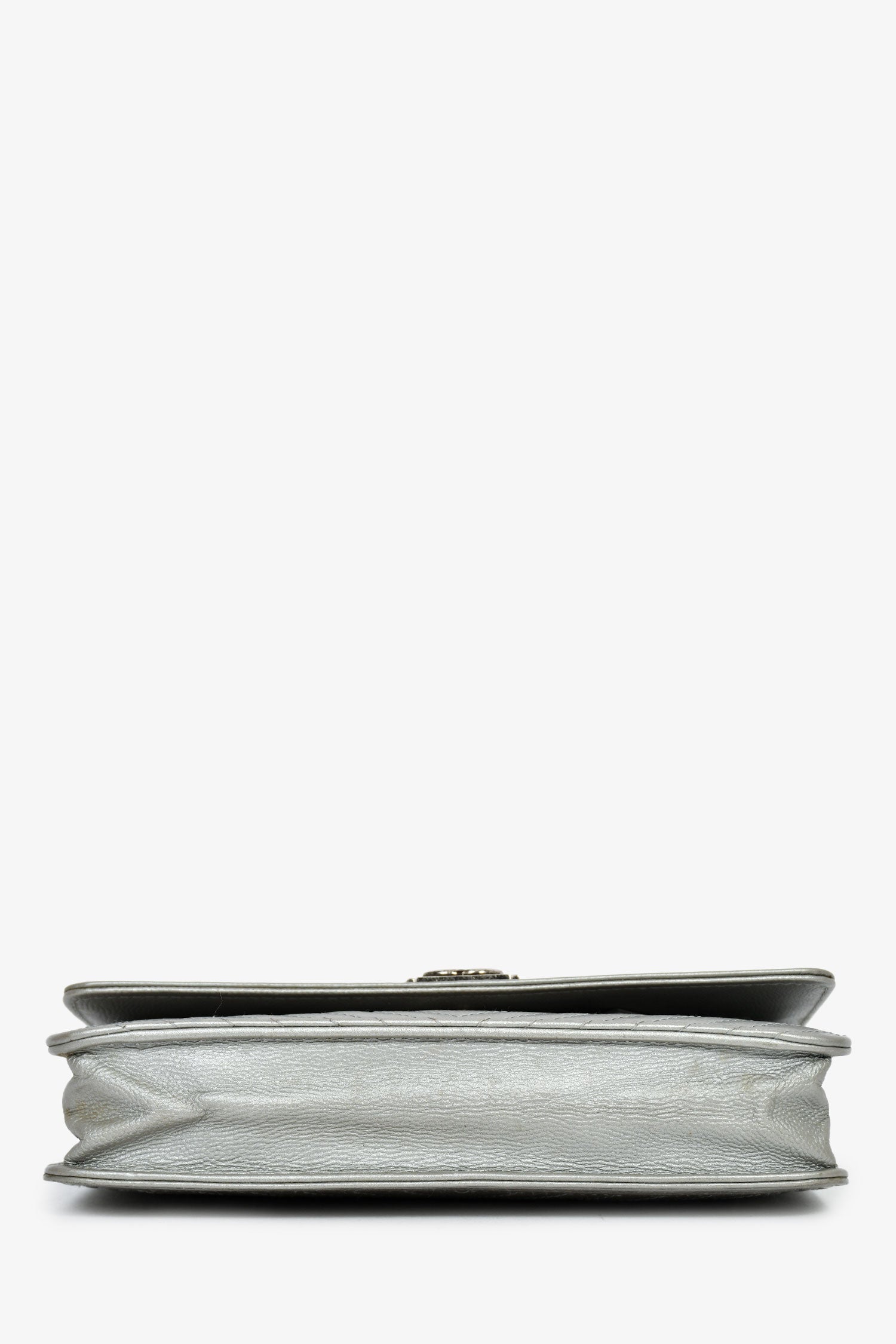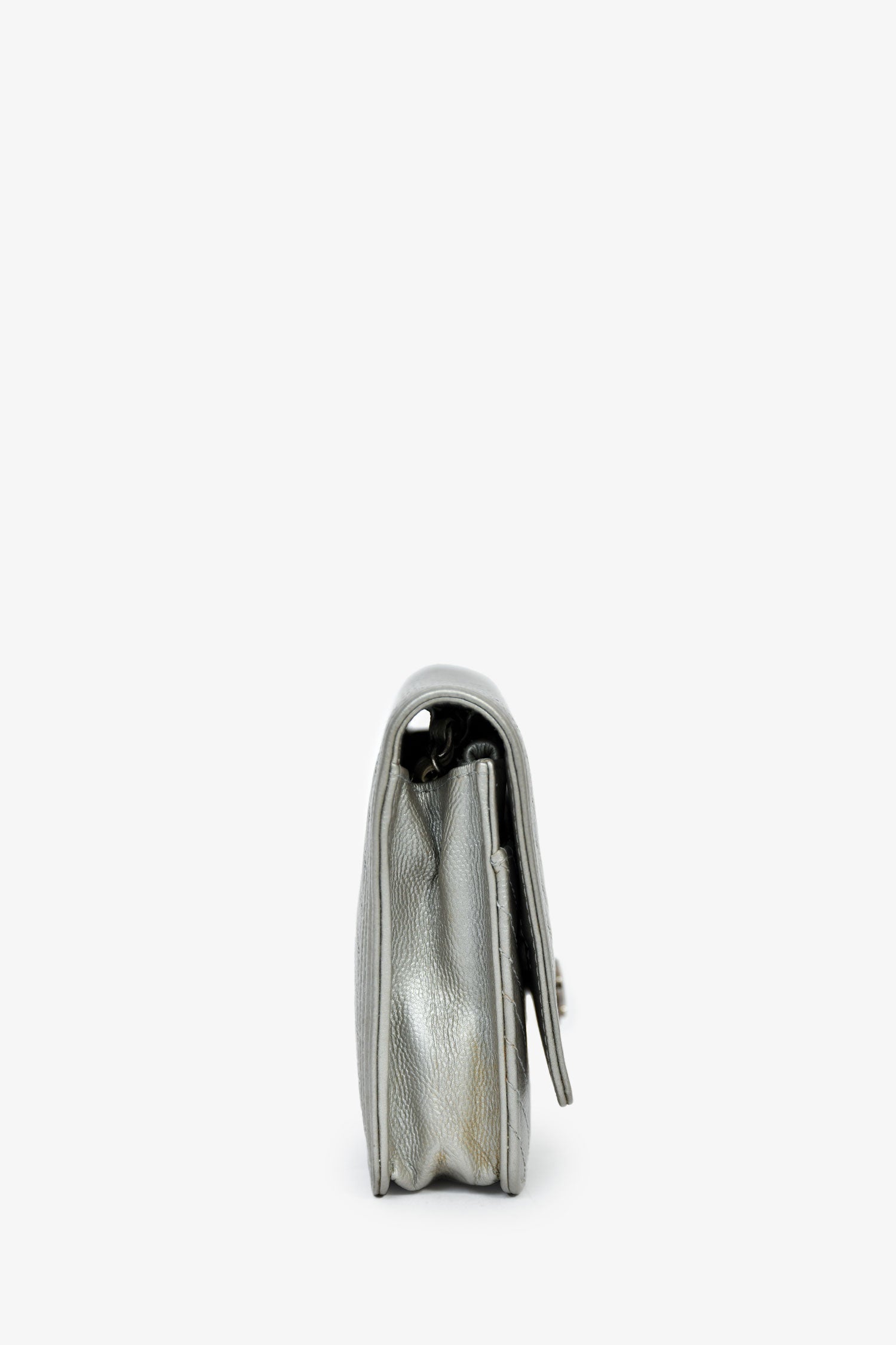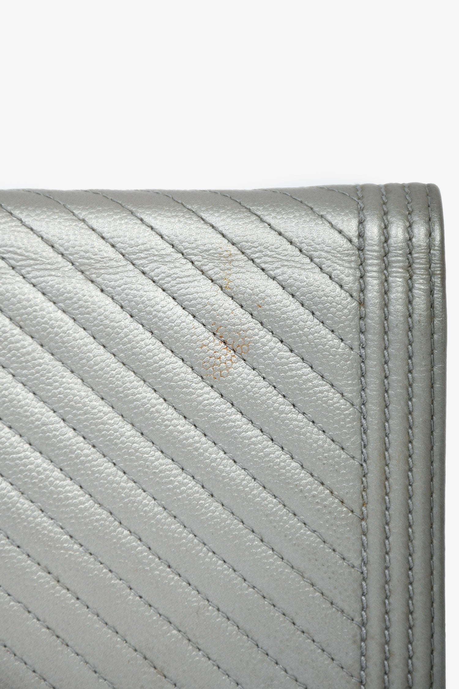 Pre-Loved Chanel™ 2016 Silver Metallic Caviar Leather Chevron Wallet on Chain. Front fold-over flap with snap button. 3 exterior pockets: 1 zip pocket under flap, 1 front zip and 1 slip pocket. Interior compartment with 6 card slots and 1 wall slip pocket. Purposely distressed silver-tone hardware. Textile-lined interior. Tonal stitching.