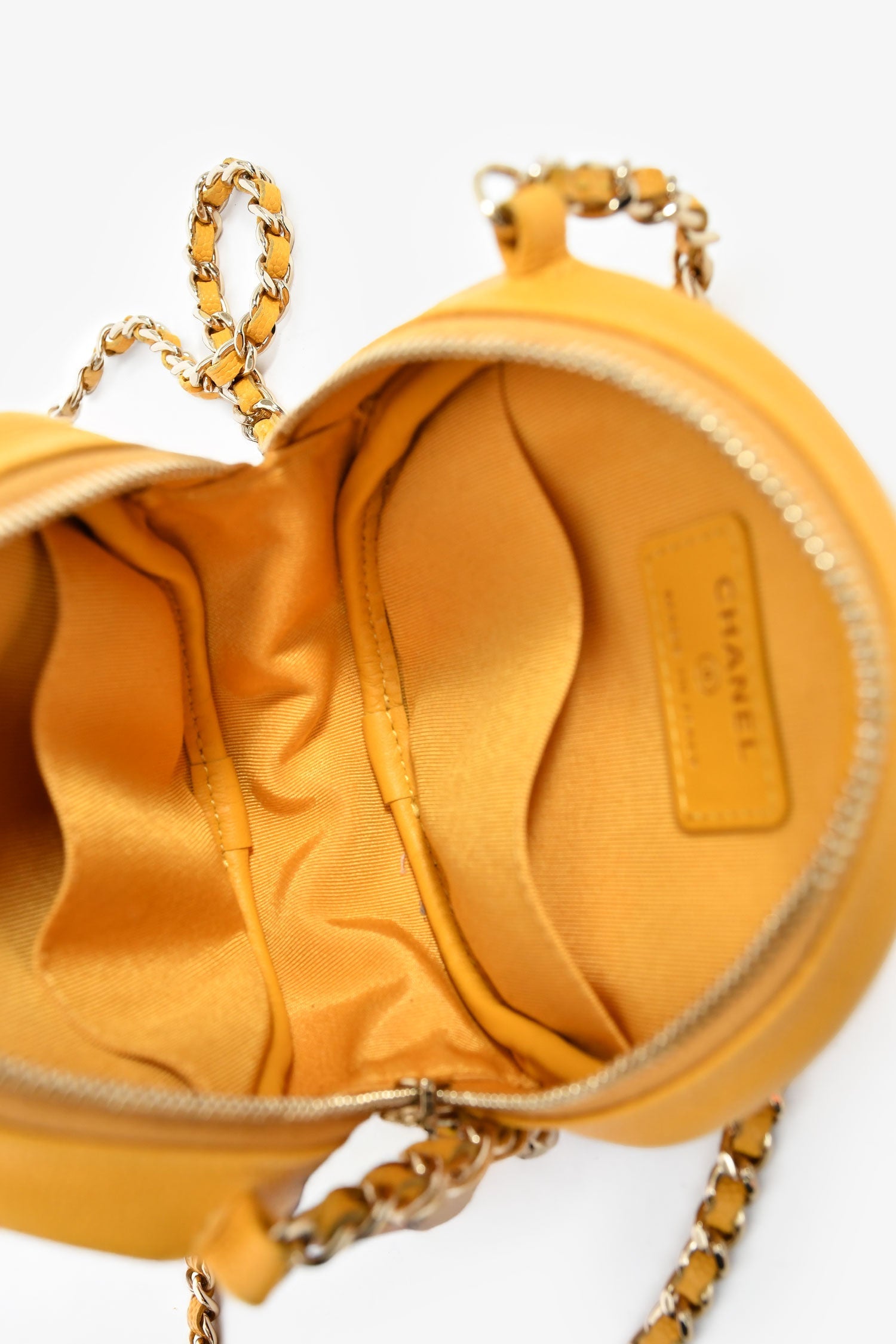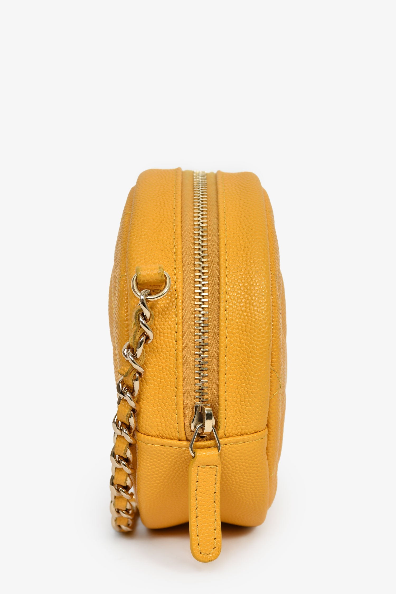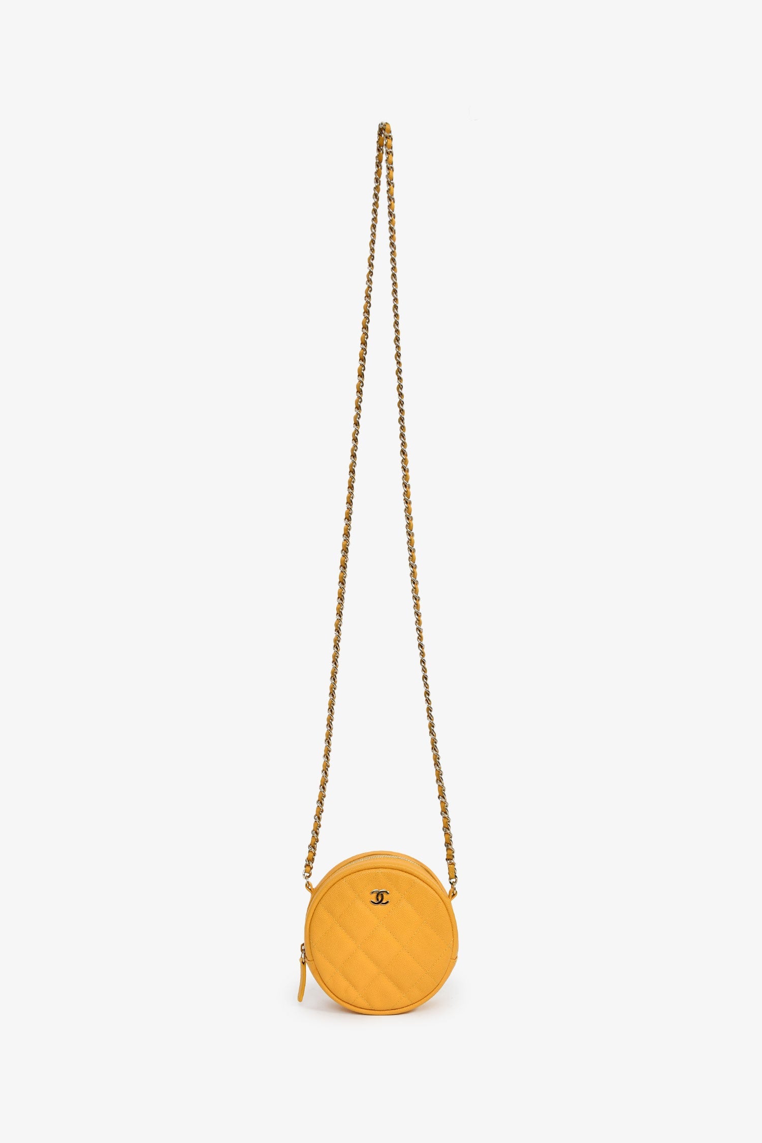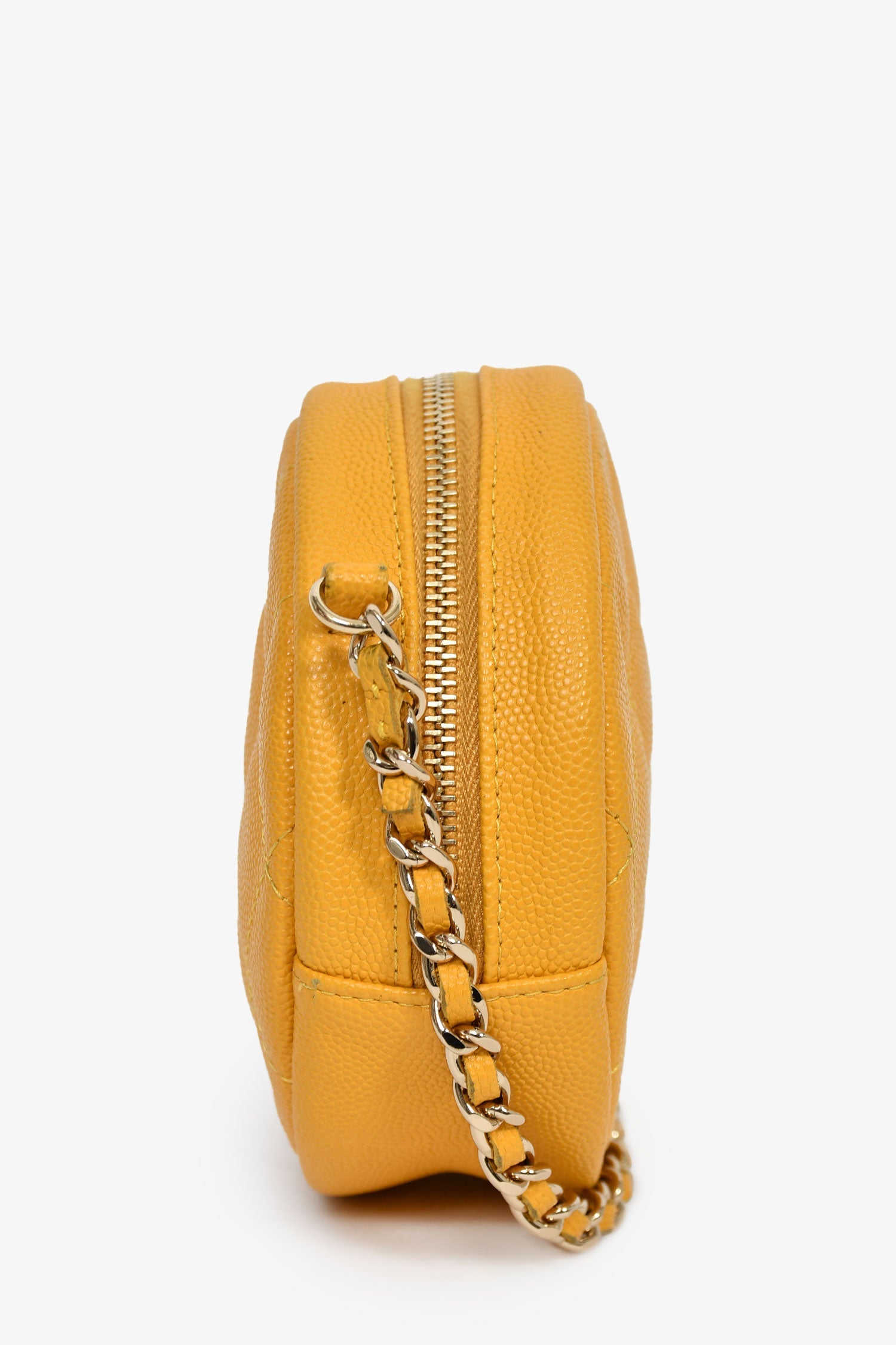 Pre-Loved Chanel™ 2018-19 Yellow Caviar Leather Round Chain Bag. Top zip closure. Chain-link crossbody strap. Lined interior with 2 wall pockets. Gold-tone hardware. Tonal stitching.