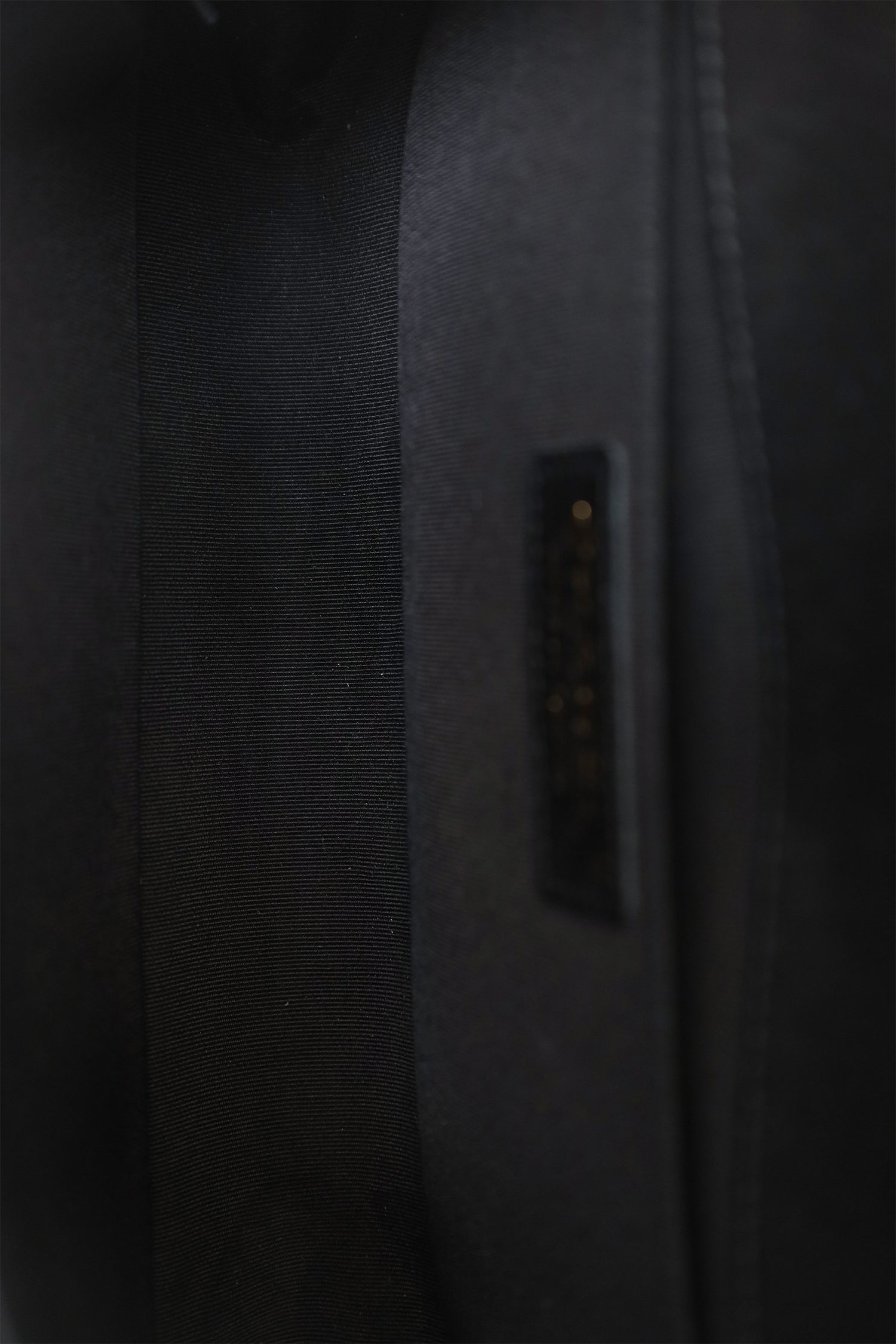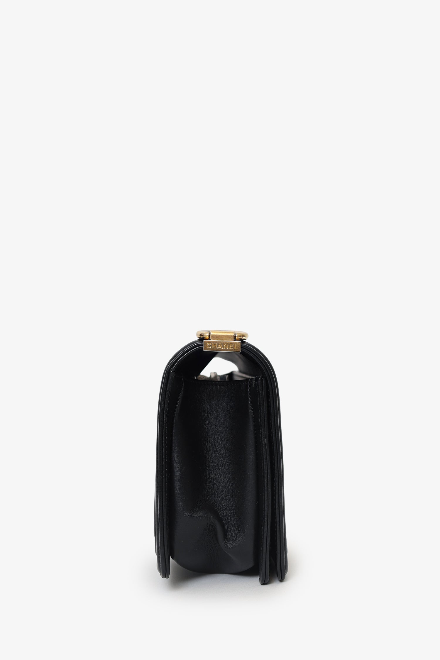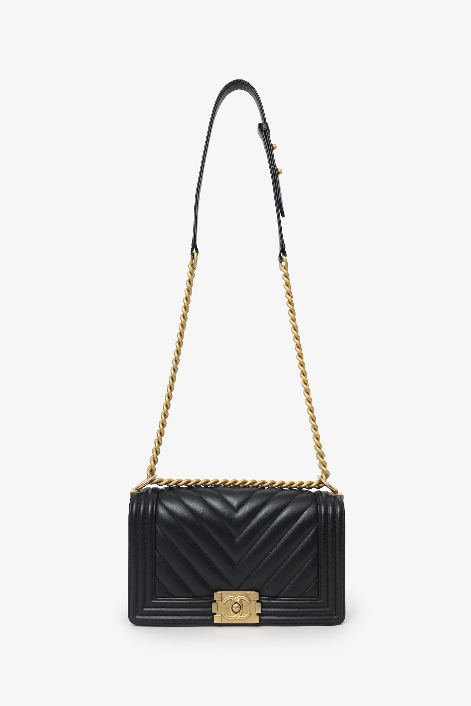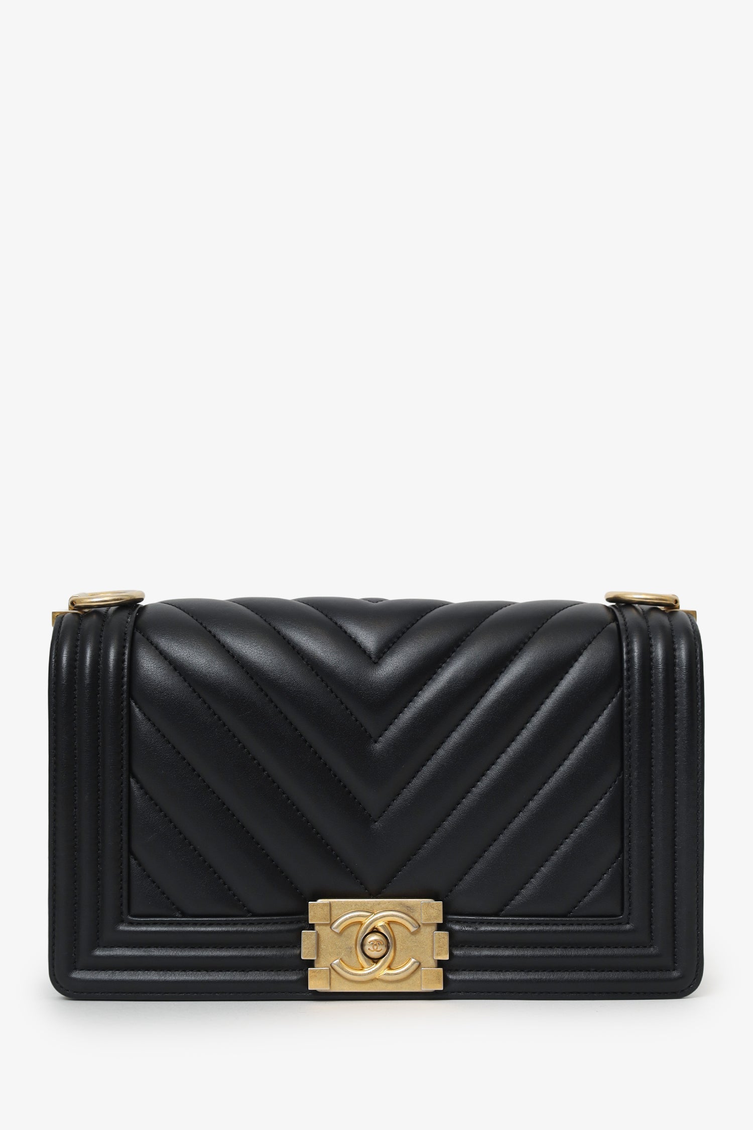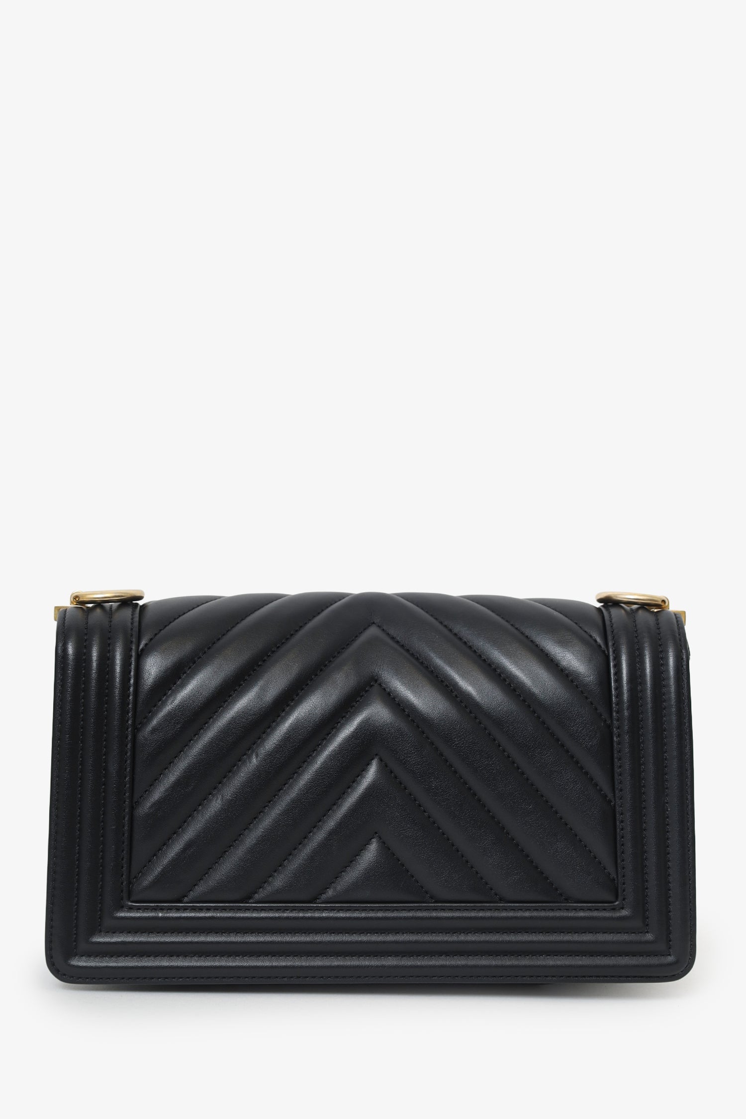 Pre-Loved Chanel™ 2018 Black Leather Chevron Medium Boy Bag. Front fold-over flap with push pin closure. Twin chain link shoulder straps that can be pulled in and extended to one long strap with push pin closure detail. Lined interior. Open interior compartment with single wall slip pocket. Gold-tone hardware. Tonal stitching.