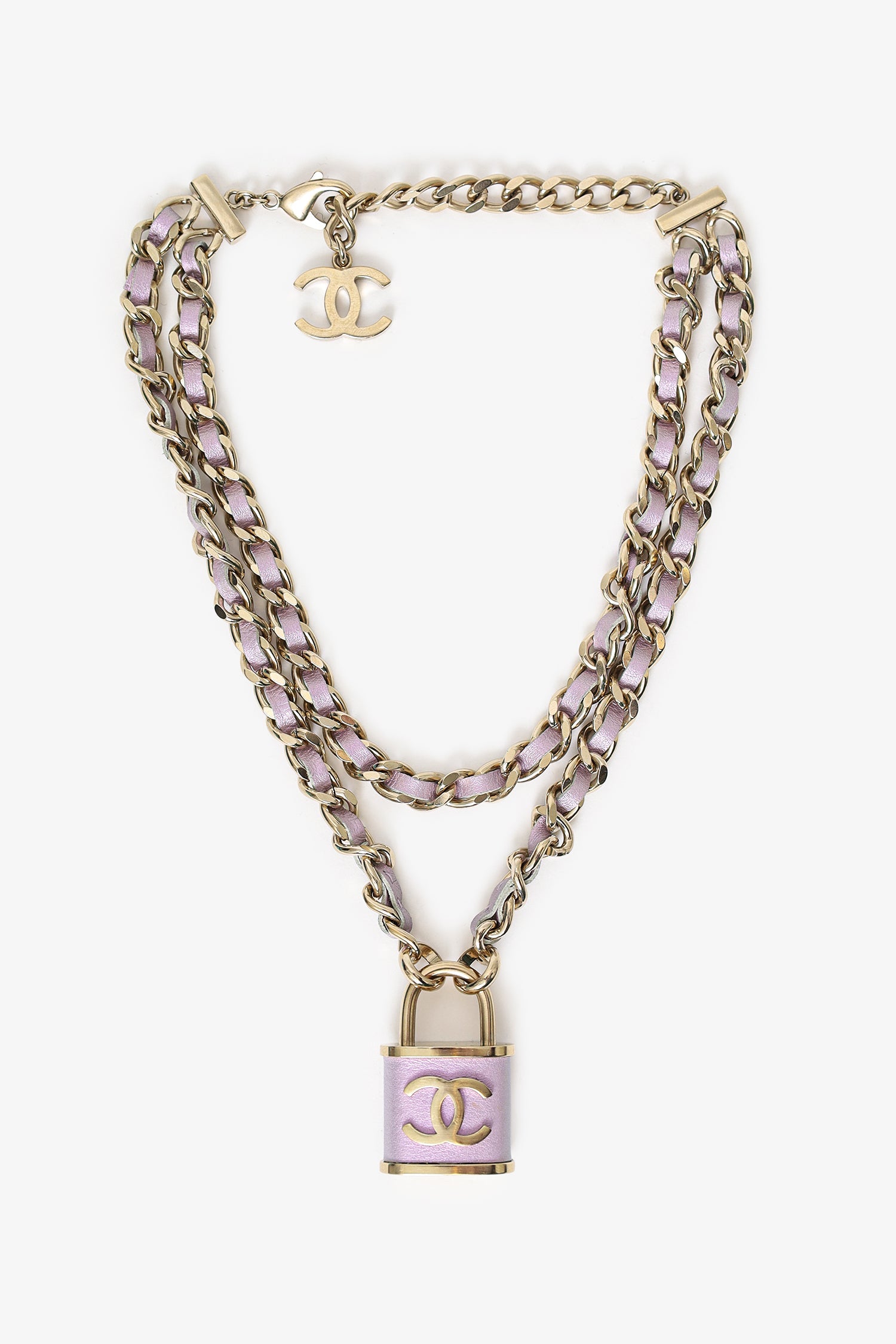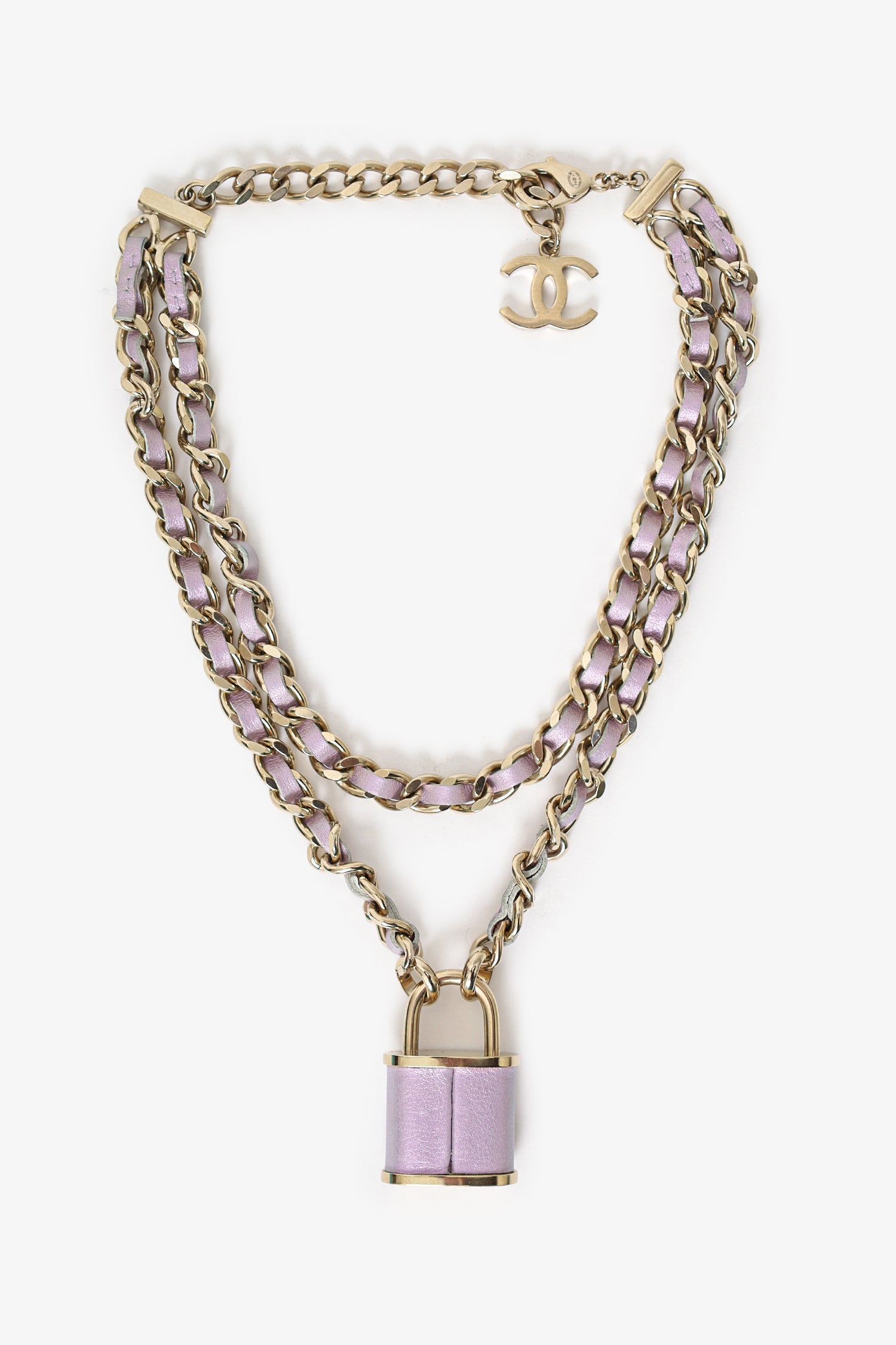 Pre-Loved Chanel™ 2018 Gold Toned Chain/Metallic Purple Leather CC Lock Pendant Choker Necklace. Covered purple metallic leather lock. Woven metallic leather. Lobster clasp closure.