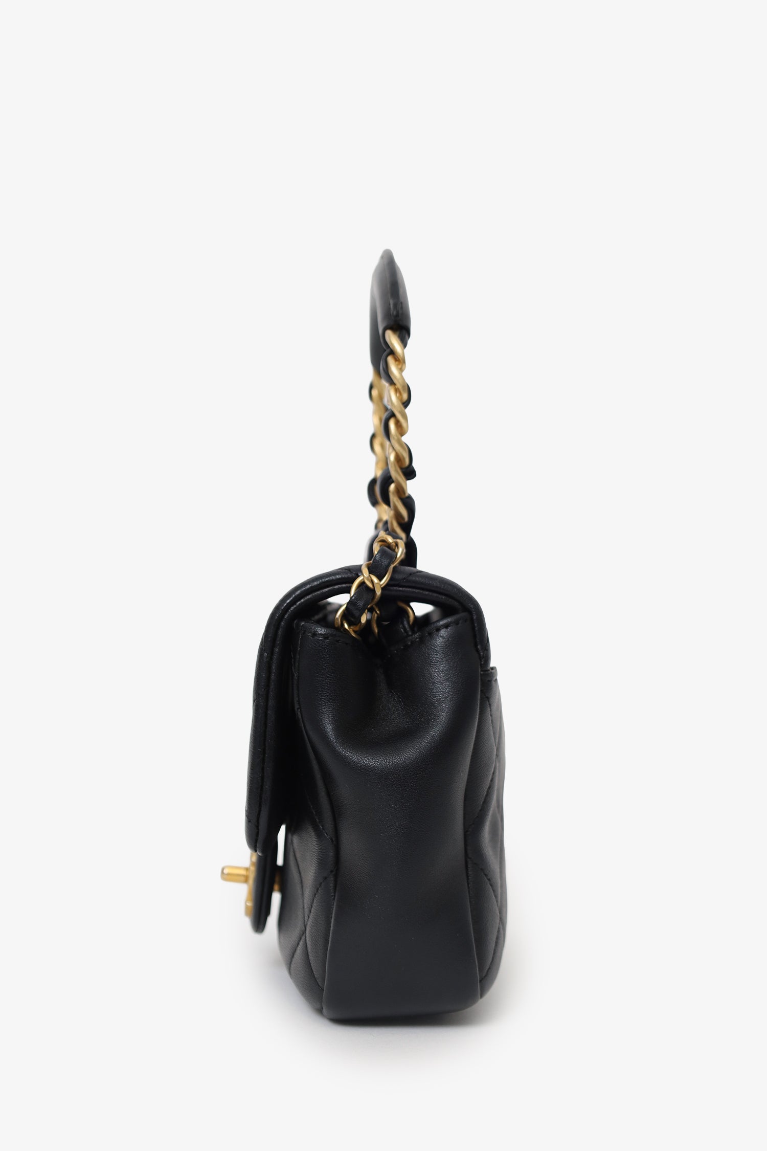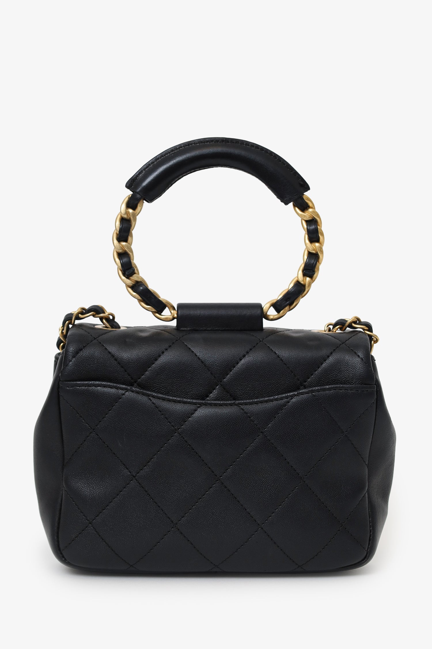 Pre-Loved Chanel™ 2019 Black Lambskin Quilted Mini In The Loop Circular Handle Bag. Front fold-over-flap with turn-lock closure. Top handle and chain link crossbody strap. Lined interior with single slip pocket. Gold-tone hardware. Tonal stitching.