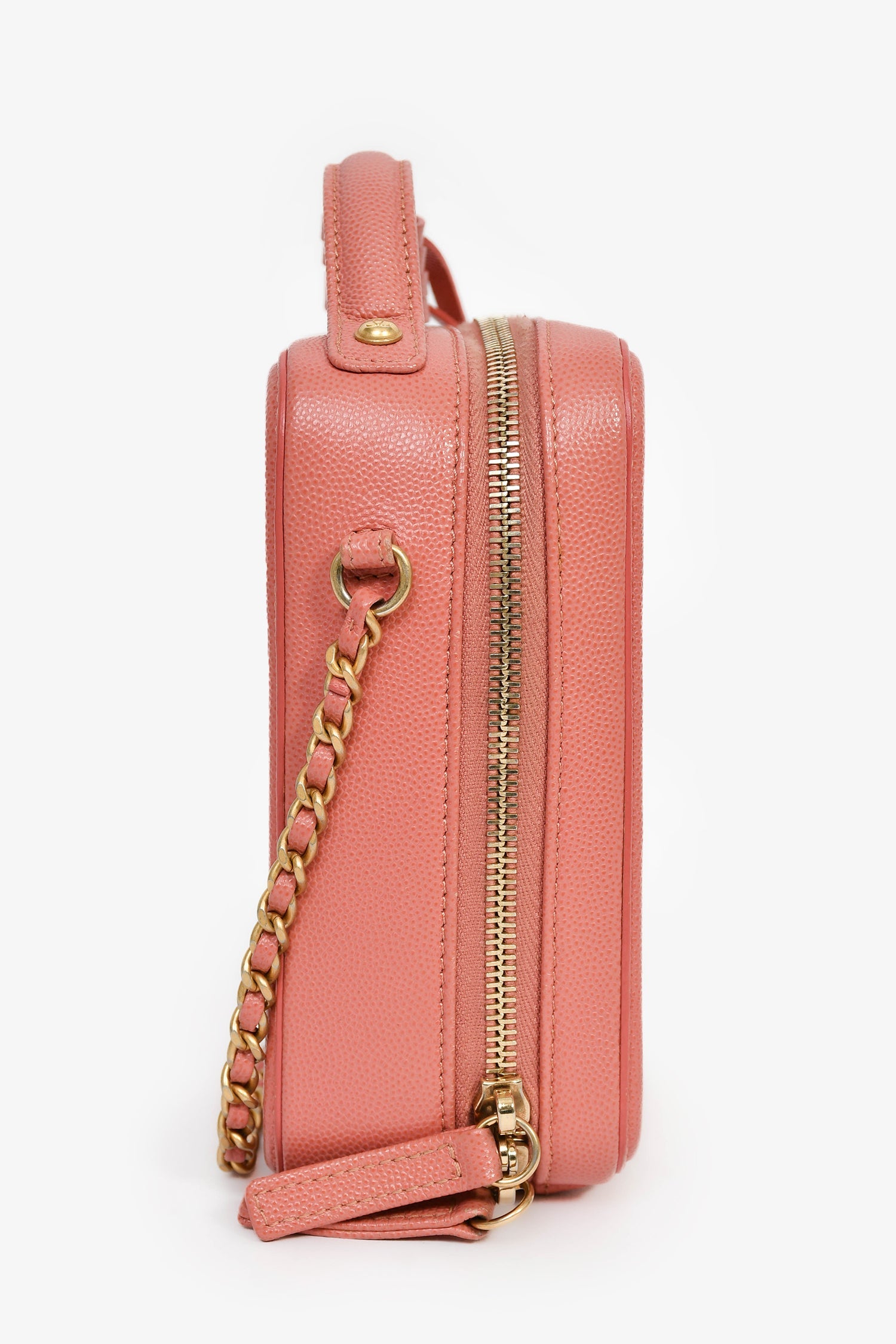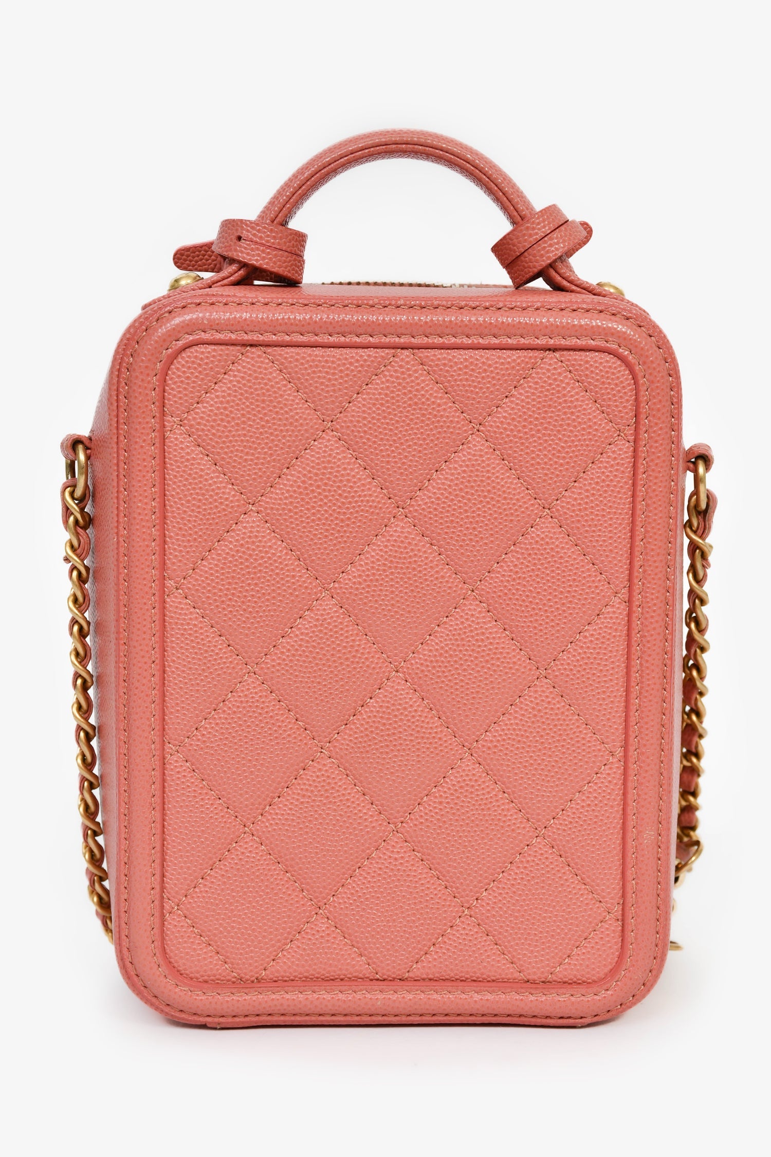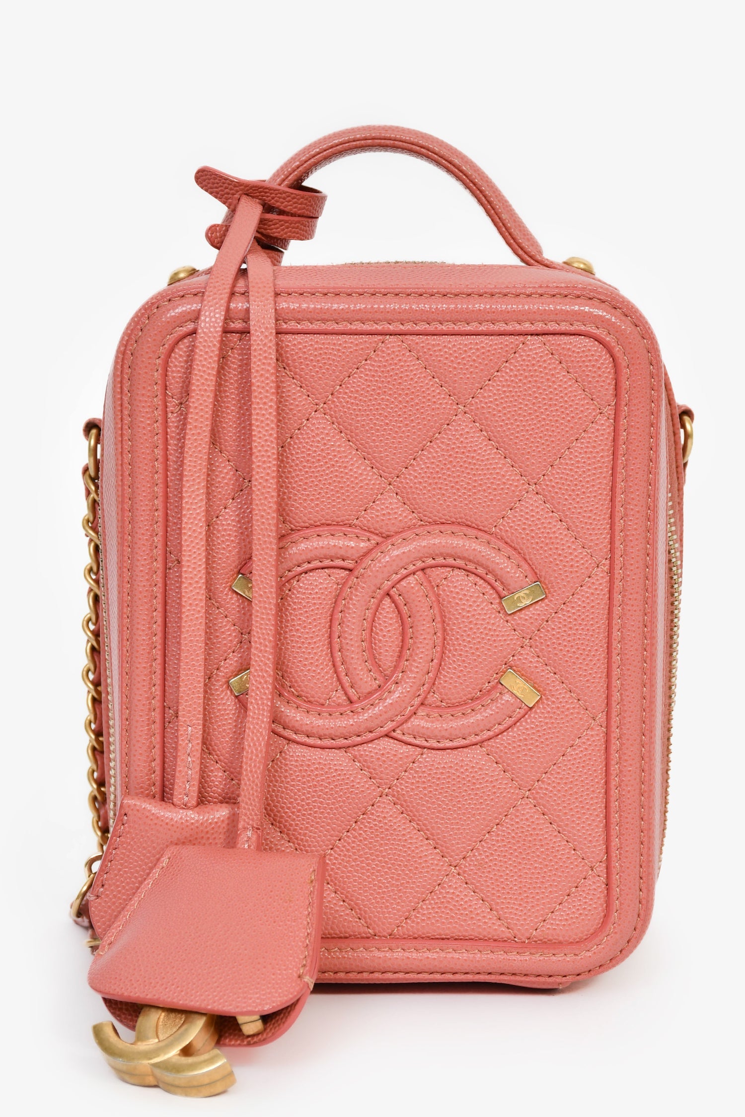 Pre-Loved Chanel™ 2019 Pink Caviar Leather Vertical Filigree Vanity Case. Zipped closure. Chain-link crossbody strap and flat top handle. Leather lined interior with 1 slip pocket. Comes with 2 clochettes, 1 key, and 1 lock. Gold-tone hardware. Tonal stitching.