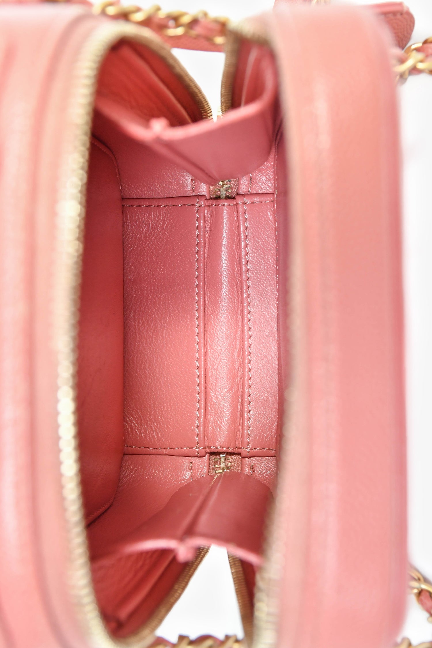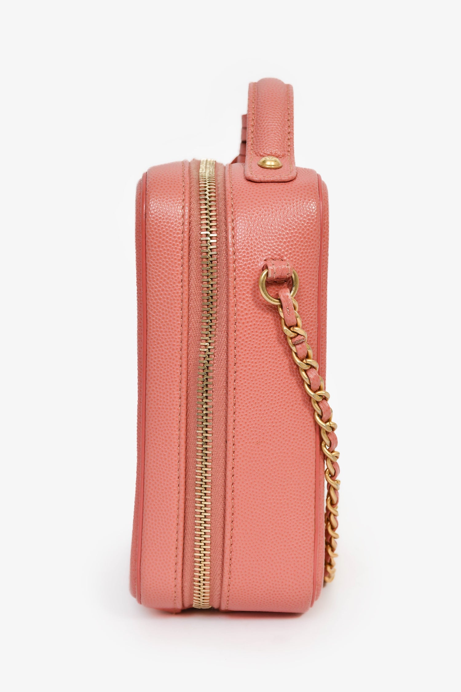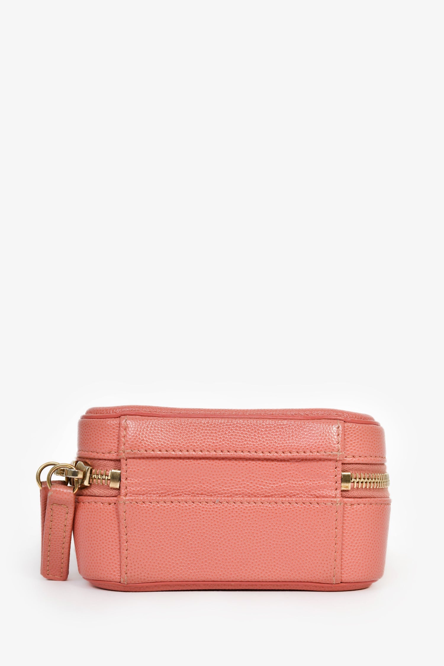 Pre-Loved Chanel™ 2019 Pink Caviar Leather Vertical Filigree Vanity Case. Zipped closure. Chain-link crossbody strap and flat top handle. Leather lined interior with 1 slip pocket. Comes with 2 clochettes, 1 key, and 1 lock. Gold-tone hardware. Tonal stitching.