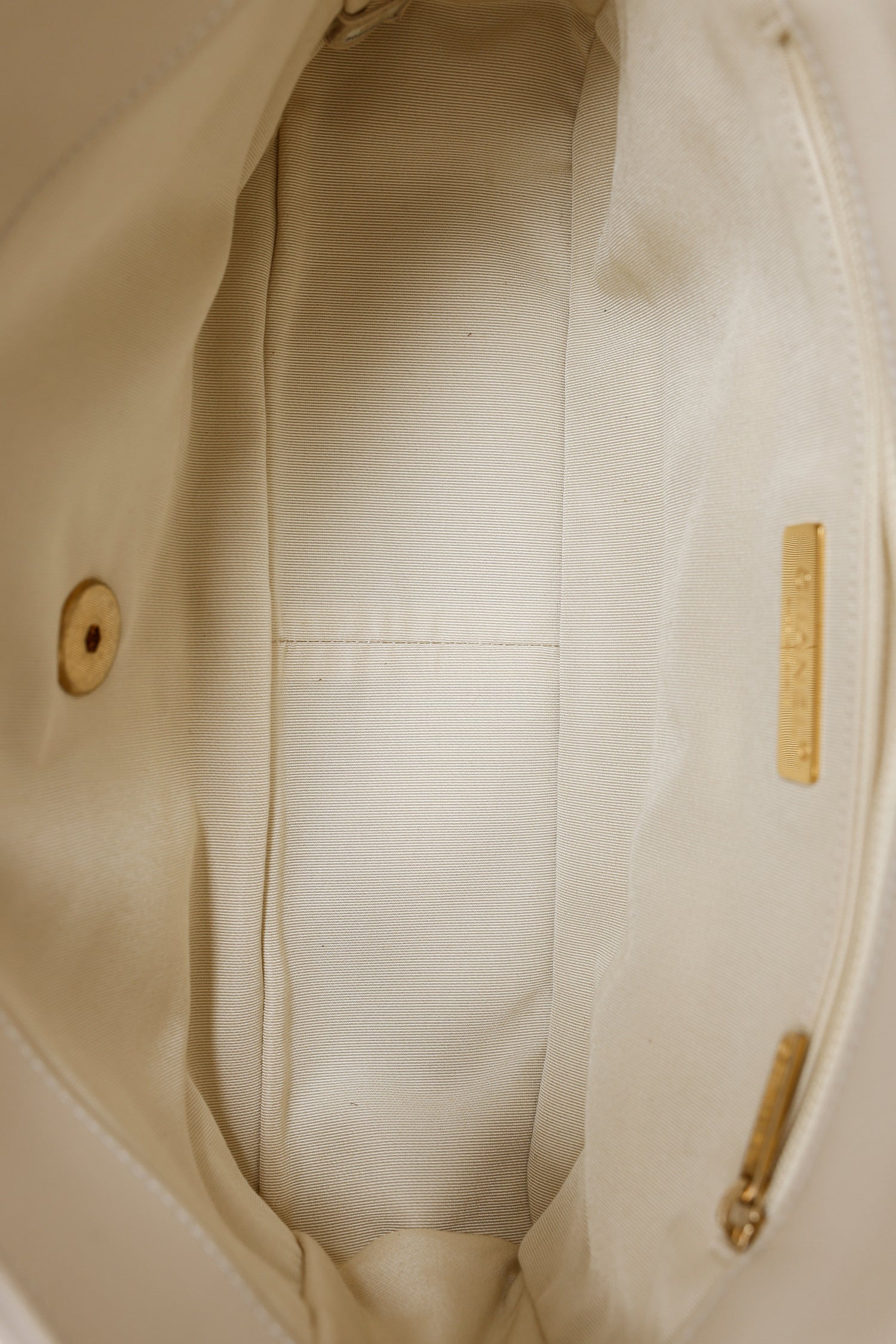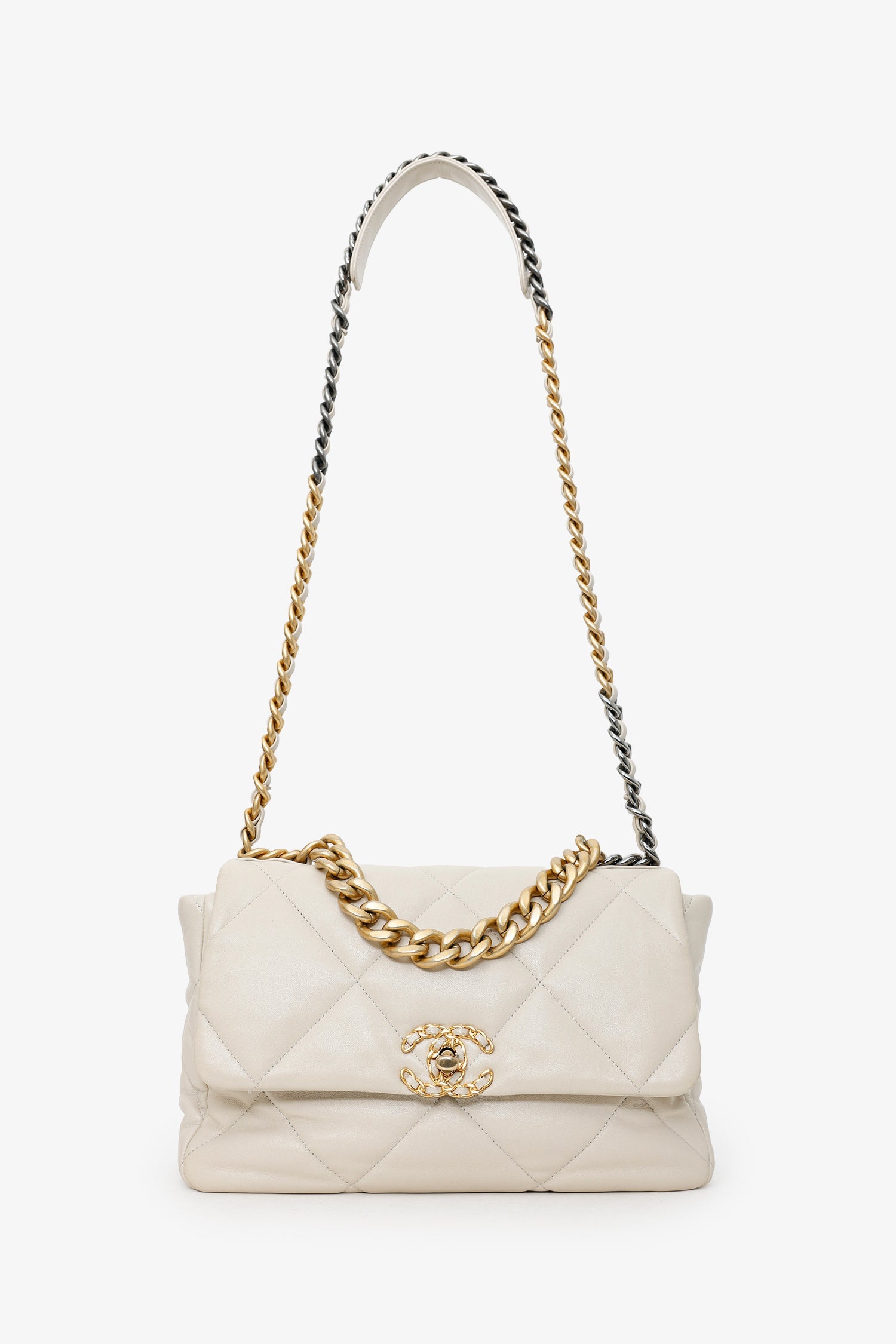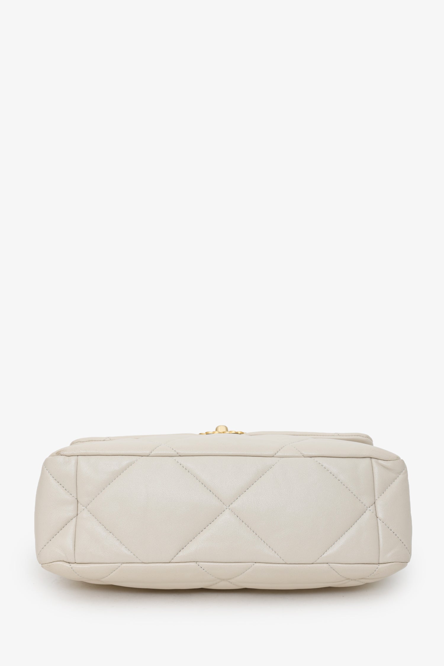 Pre-Loved Chanel™ 2020 Beige Lambskin Medium 19 Flap Bag. Front fold-over flap with turn-lock closure. Chain link shoulder strap. Single exterior rear slip pocket. Lined interior with single rear zip pocket. Gold and gunmetal-tone hardware. Tonal stitching.