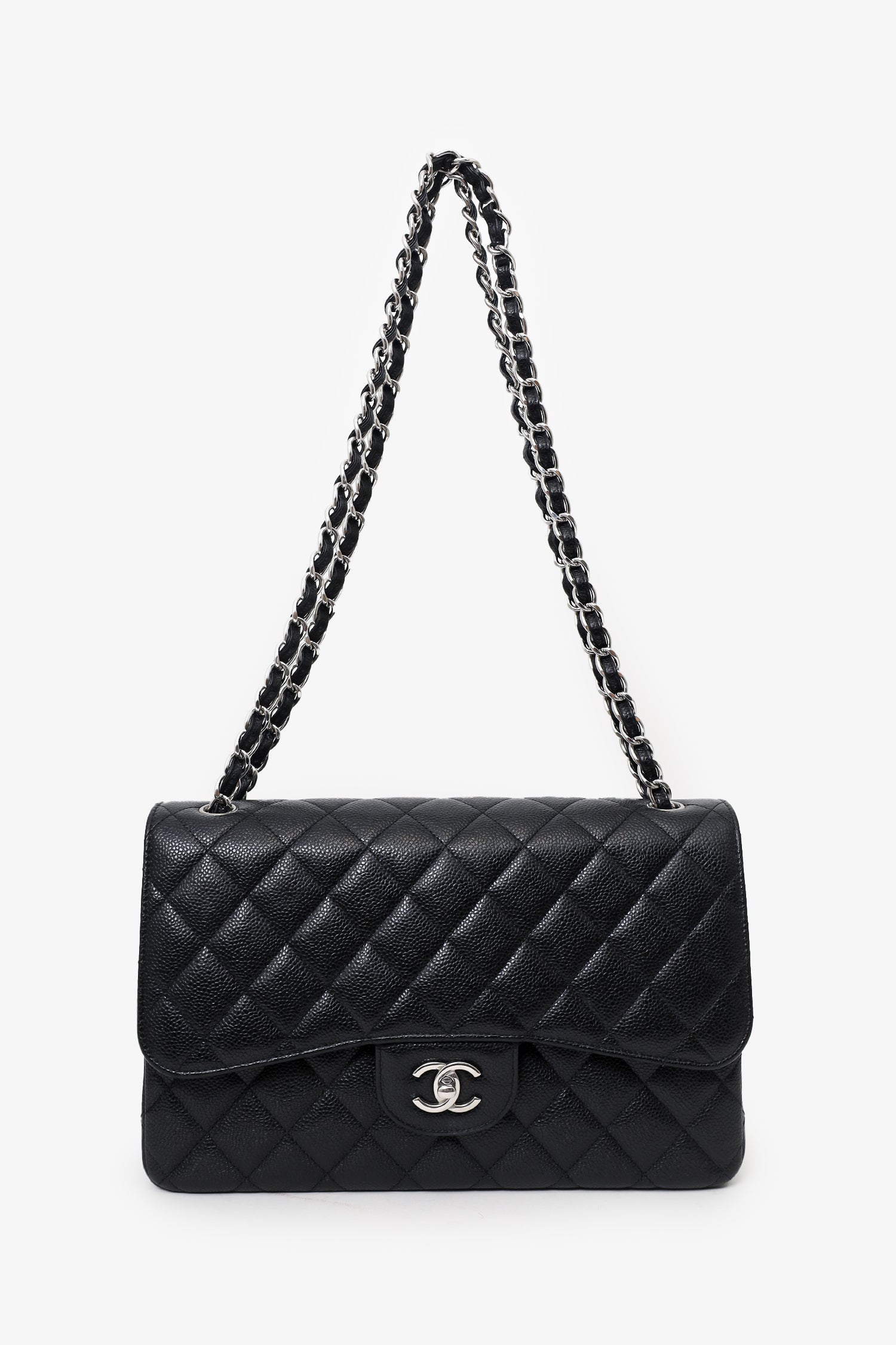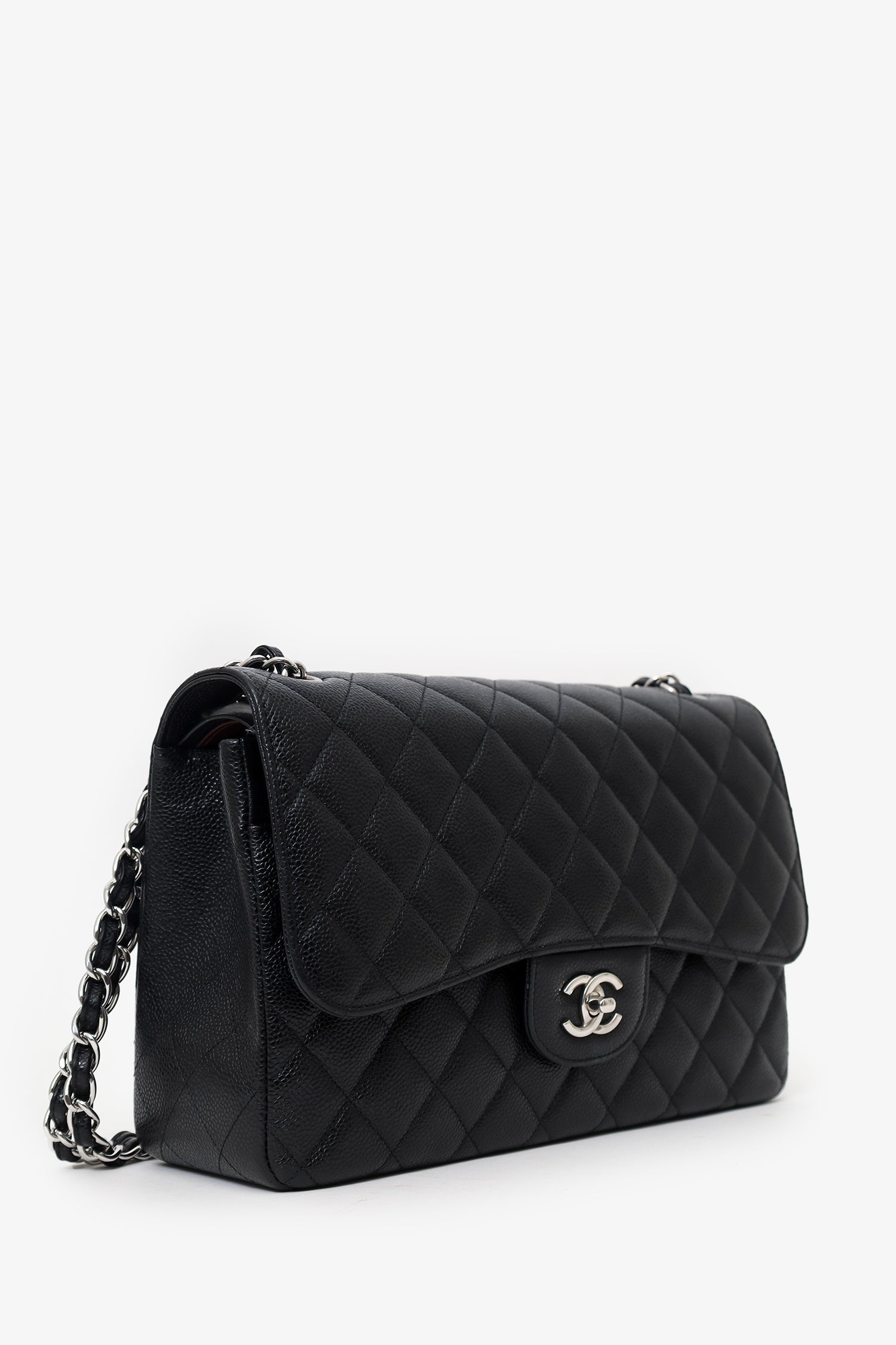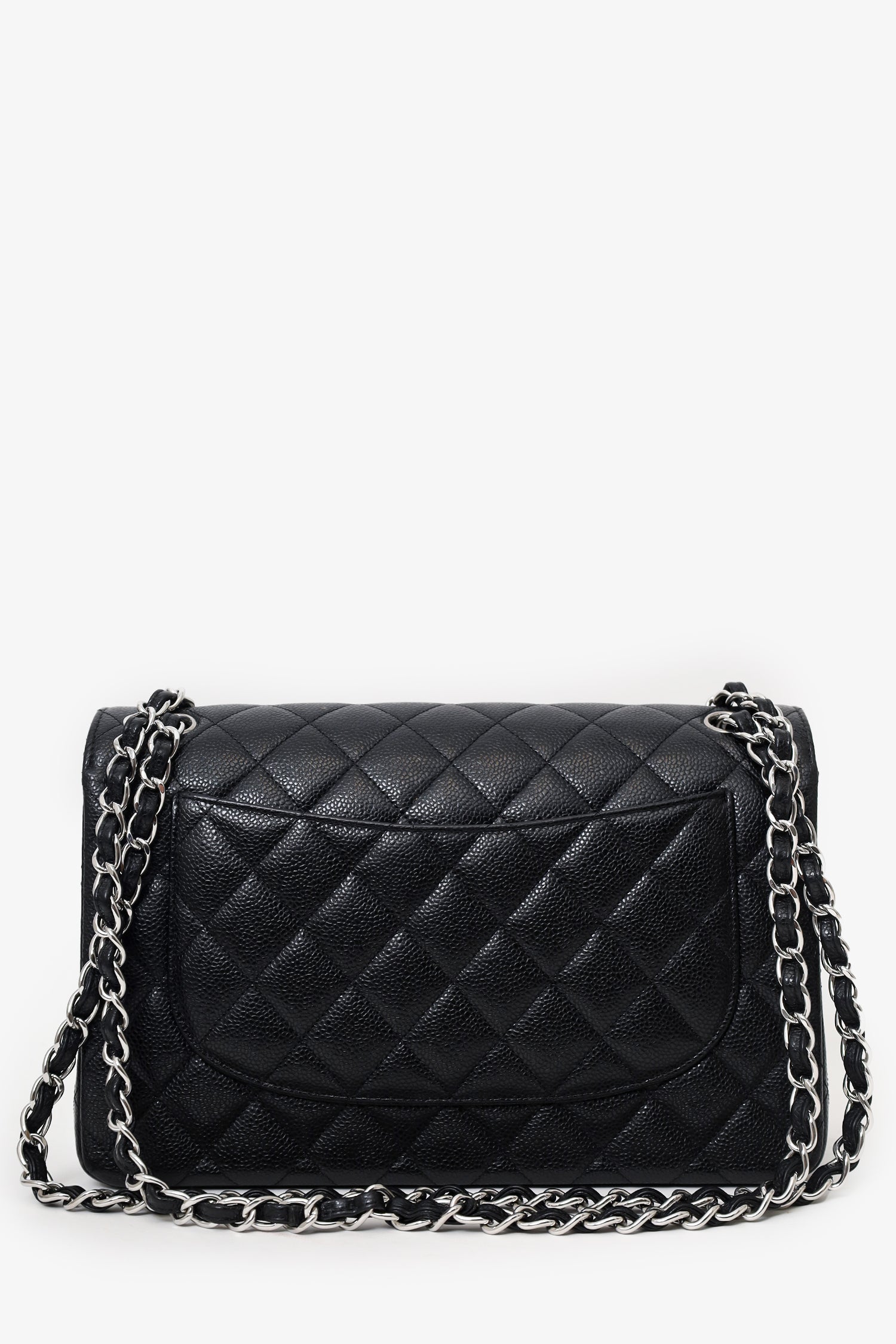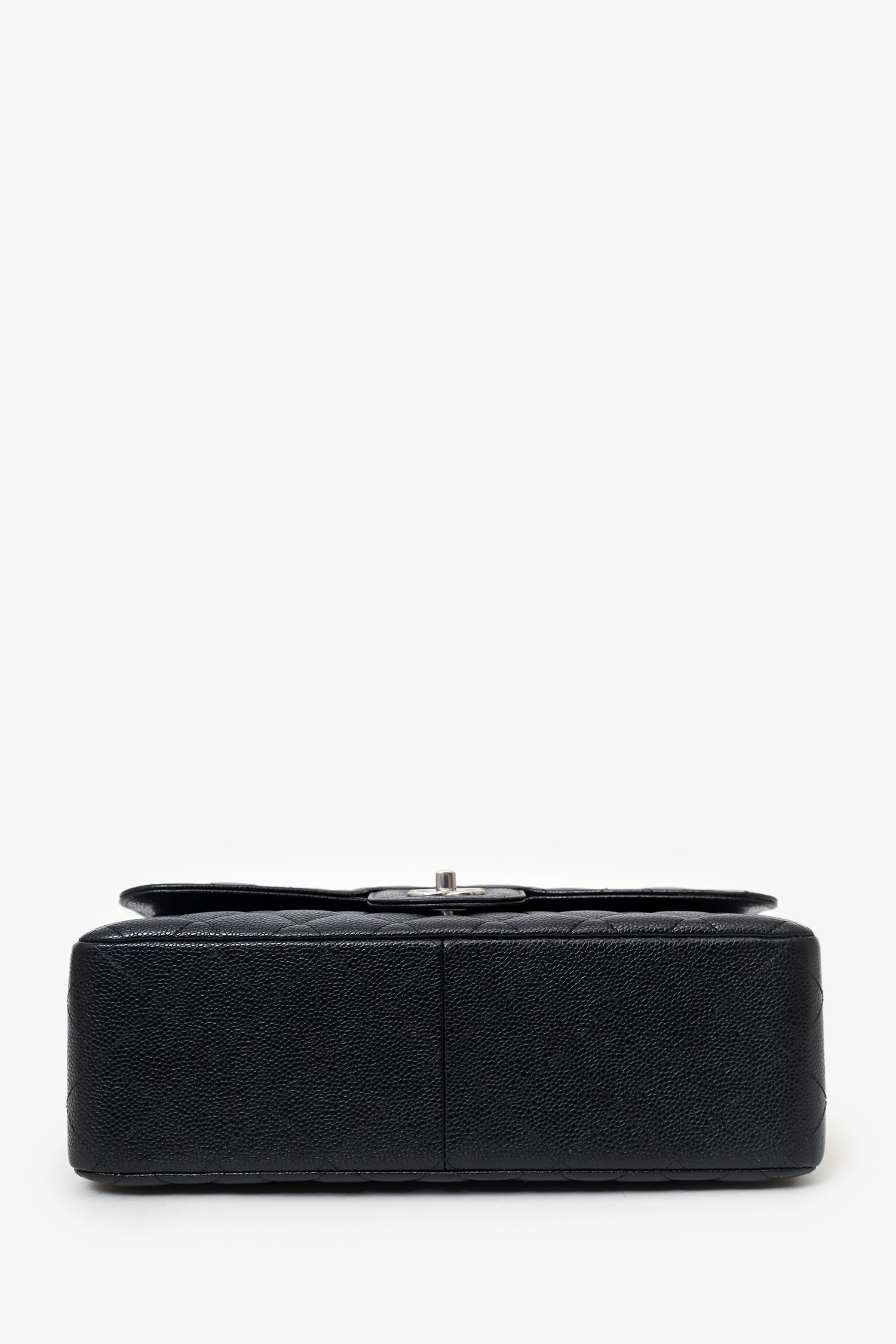Pre-Loved Chanel™ 2021+ Black Caviar Leather Jumbo Double Flap. Front fold-over flaps; Outer flap with turn-lock closure, inner flap with snap button closure. Twin chainlink shoulder straps that can be pulled in and extended to one long strap. Back exterior slip pocket. Leather-lined interior. 2 interior compartments; front compartment with 1 large open pocket. 2 interior slip pockets with single lipstick compartment. Back compartment has 1 zip pocket on underside of top fold-over flap. Silver-tone hardware. Tonal stitching.