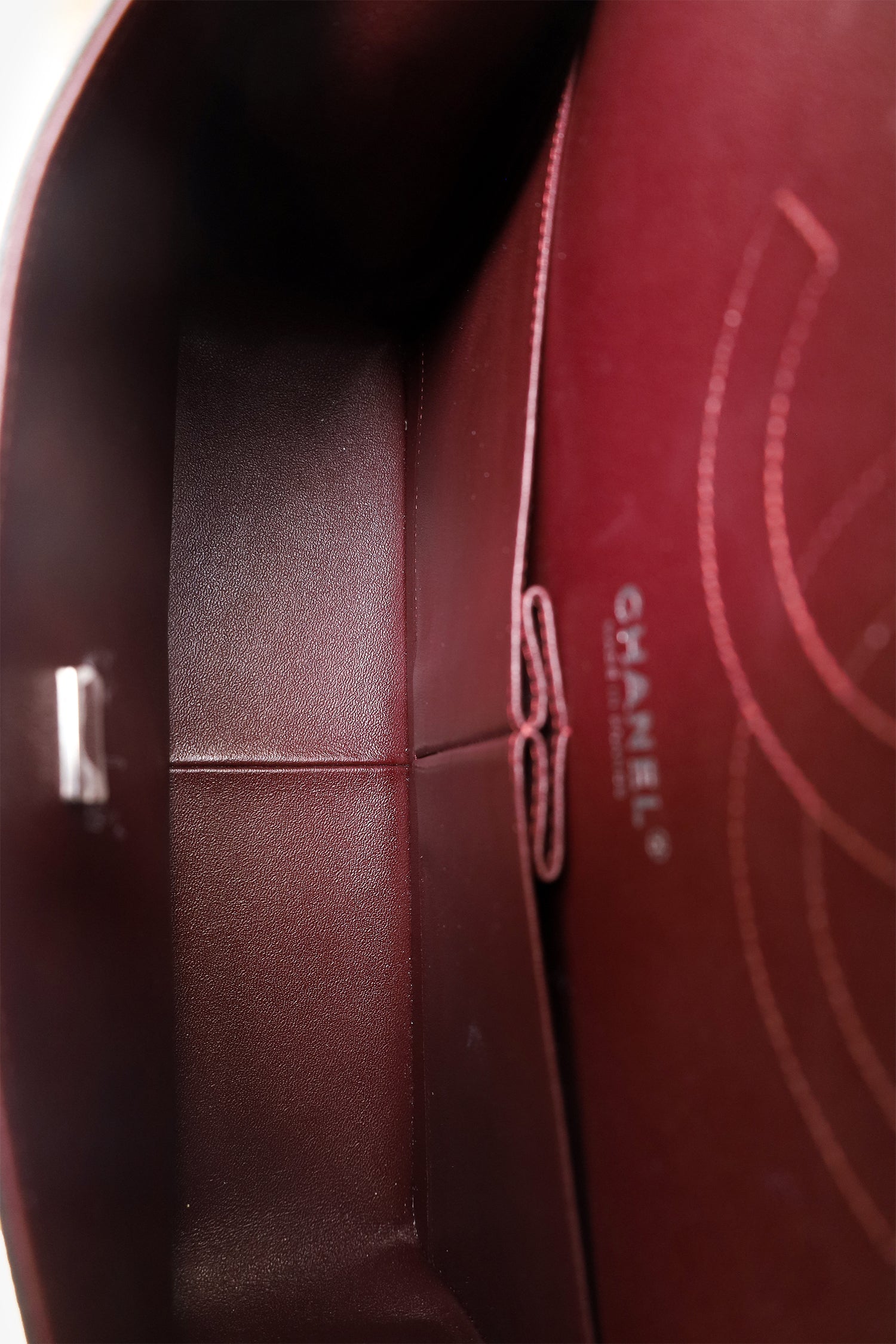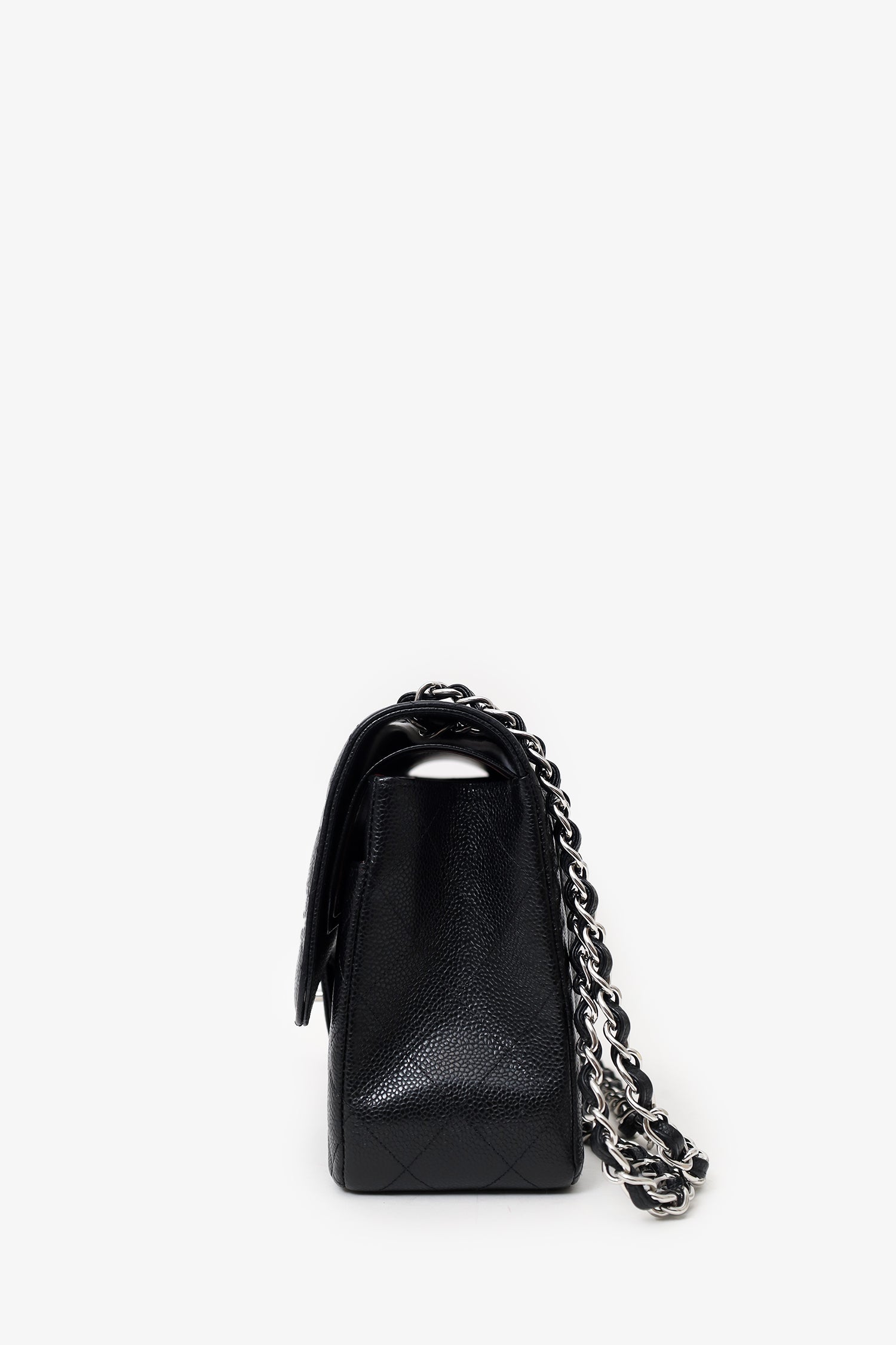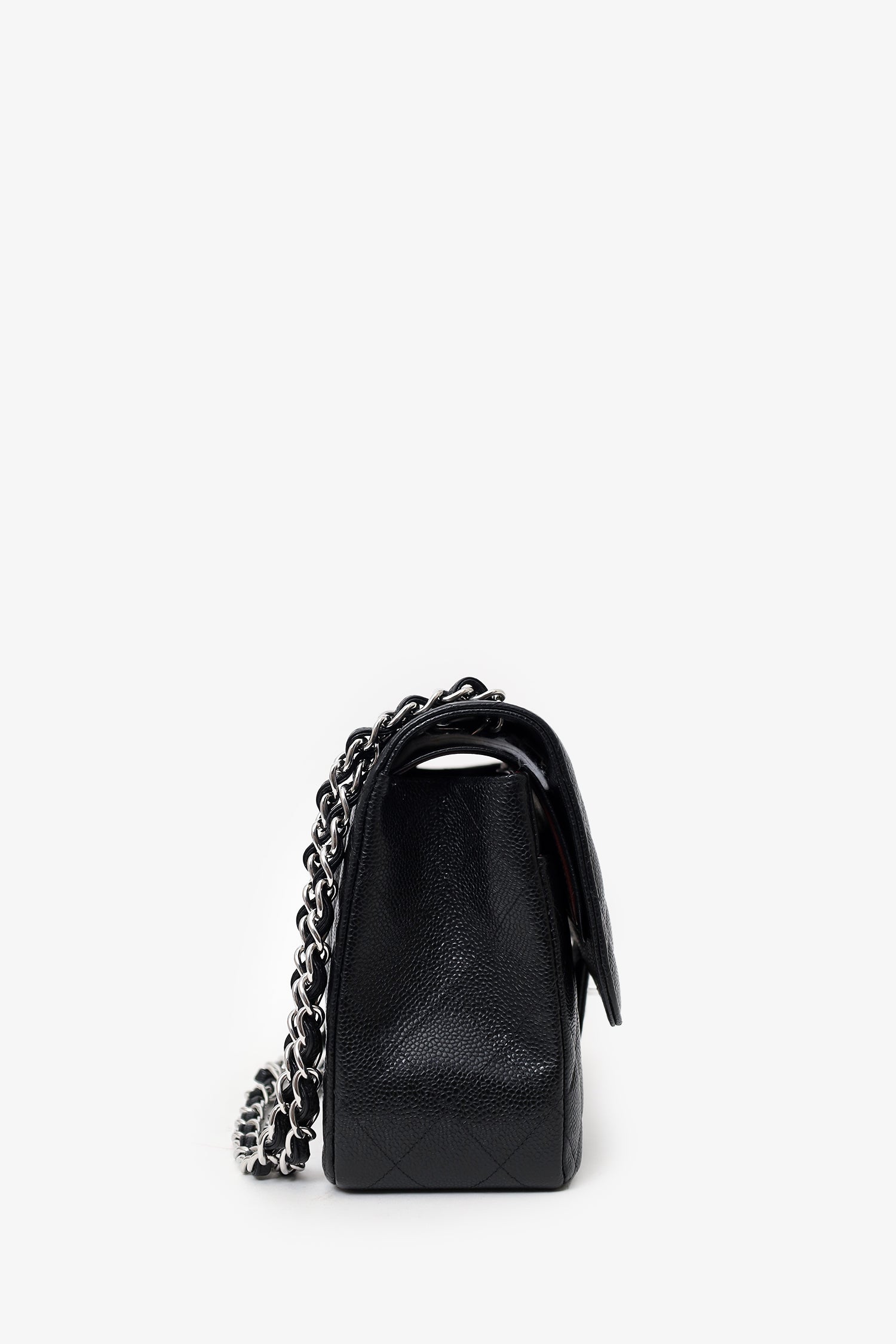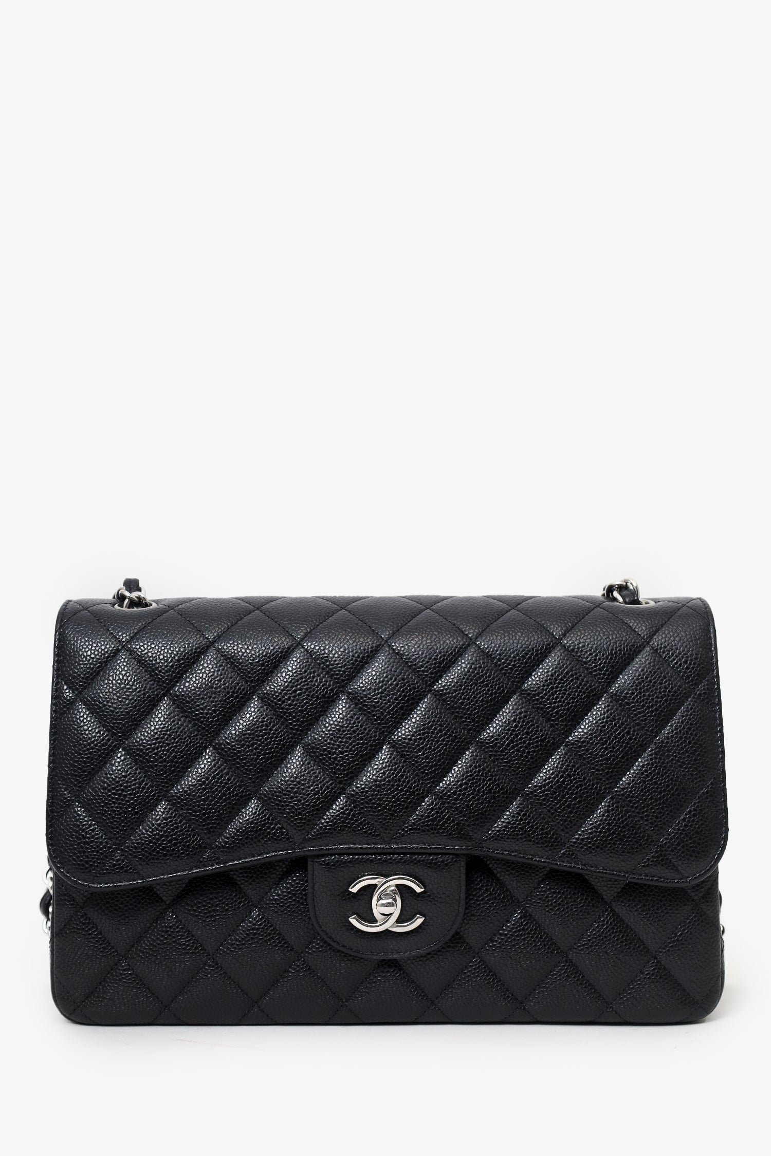 Pre-Loved Chanel™ 2021+ Black Caviar Leather Jumbo Double Flap. Front fold-over flaps; Outer flap with turn-lock closure, inner flap with snap button closure. Twin chainlink shoulder straps that can be pulled in and extended to one long strap. Back exterior slip pocket. Leather-lined interior. 2 interior compartments; front compartment with 1 large open pocket. 2 interior slip pockets with single lipstick compartment. Back compartment has 1 zip pocket on underside of top fold-over flap. Silver-tone hardware. Tonal stitching.