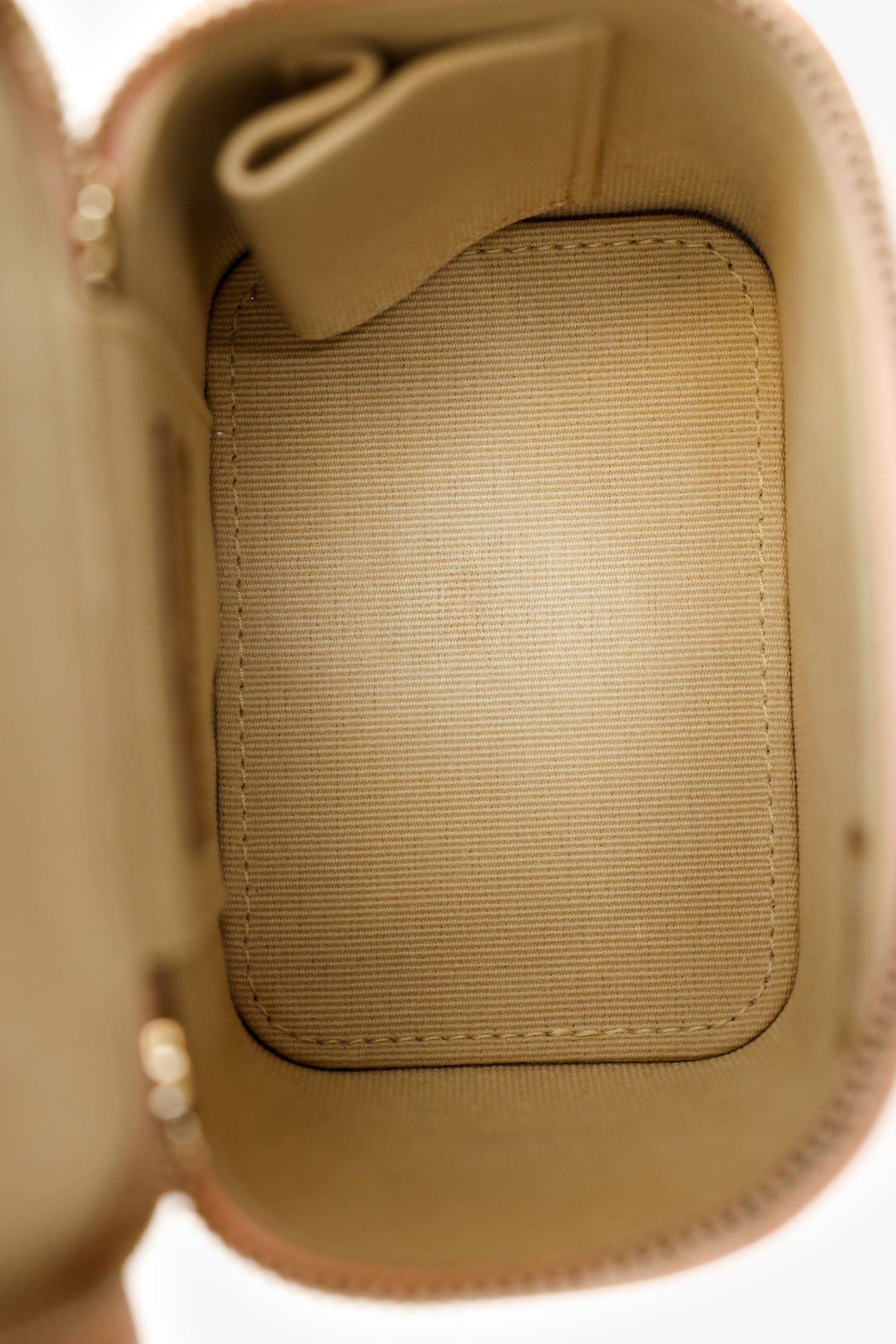 Pre-Loved Chanel™ 2021 Pink Quilted Lambskin Pearl Crush Mini Vanity Case. Top zip closure. Adjustable chainlink and leather crossbody strap with crush closure. Lined interior. Single interior lipstick compartment. Gold-tone hardware. Tonal stitching.