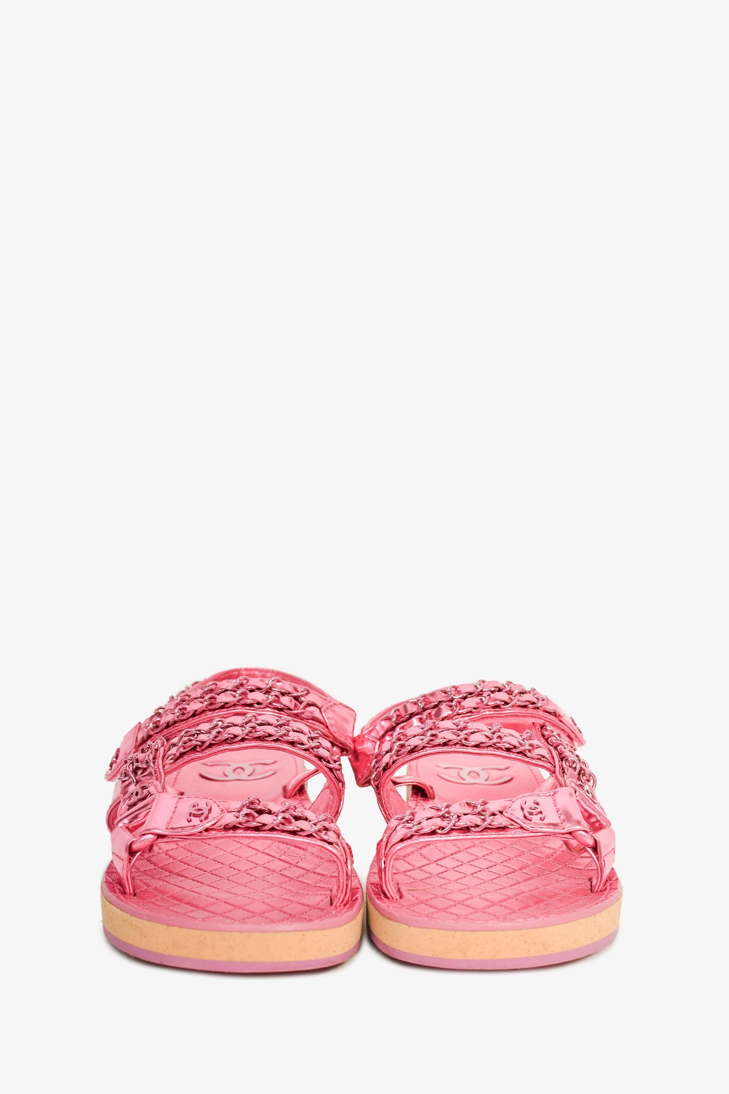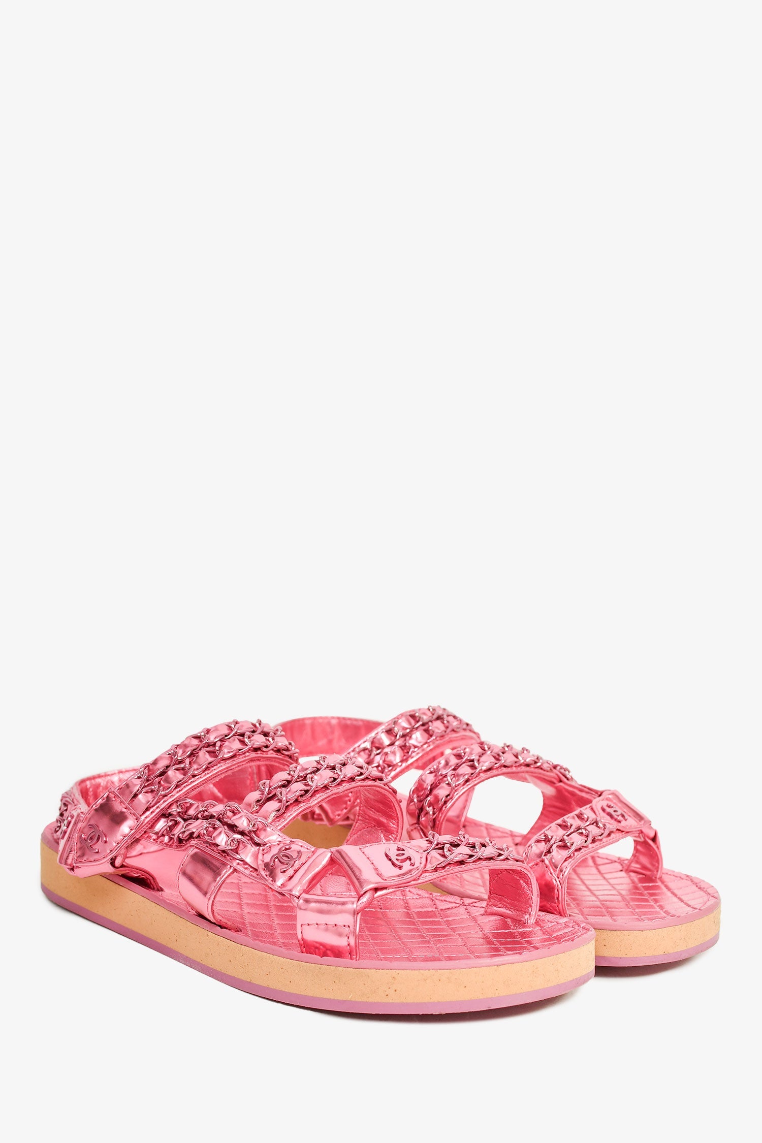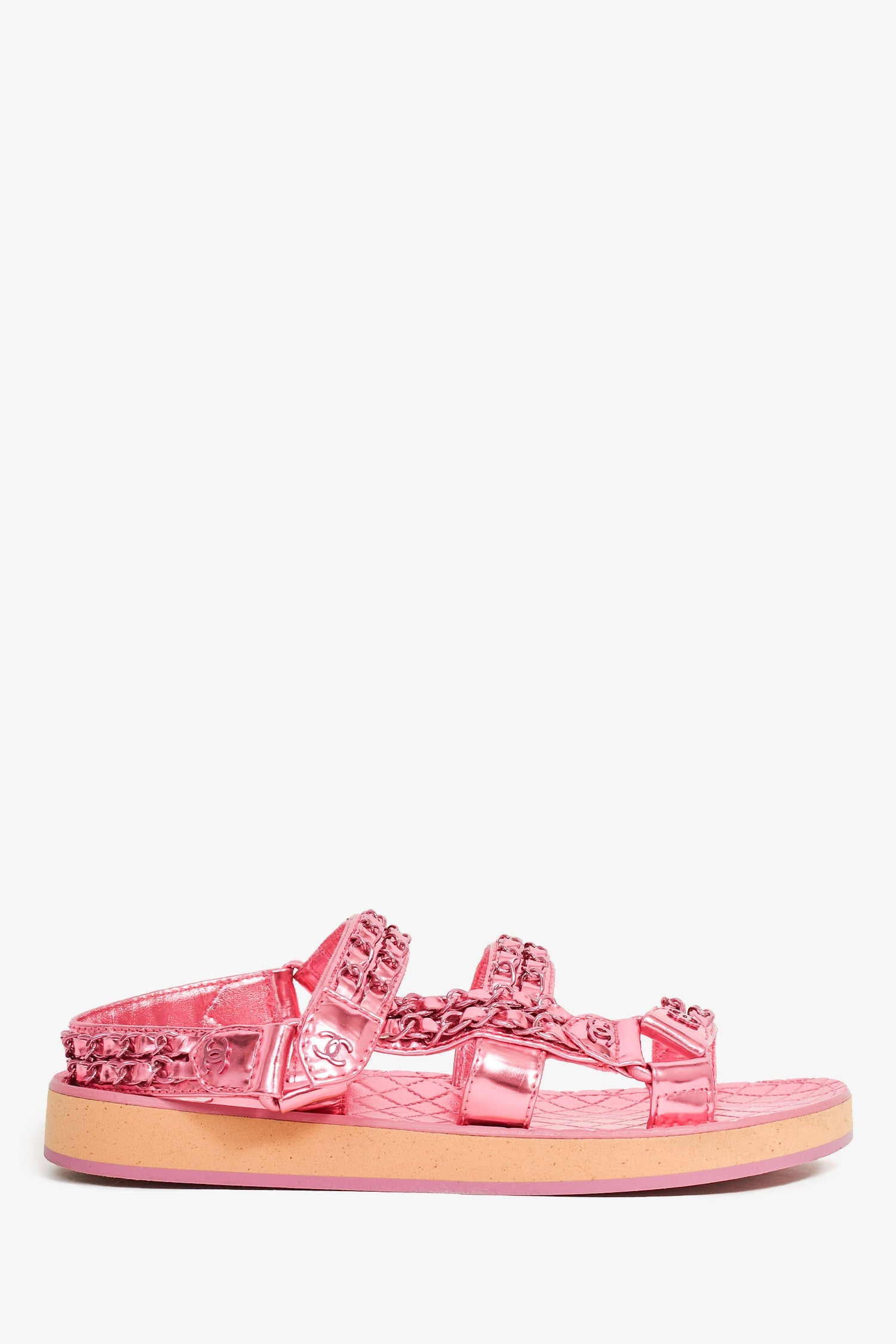 Pre-Loved Chanel™ 2022 Metallic Pink Leather Chain CC Sandals. Pink plated hardware. Metallic insoles. Rounded toe. Stacked soles. Ankle velcro strap. Tonal stitching.