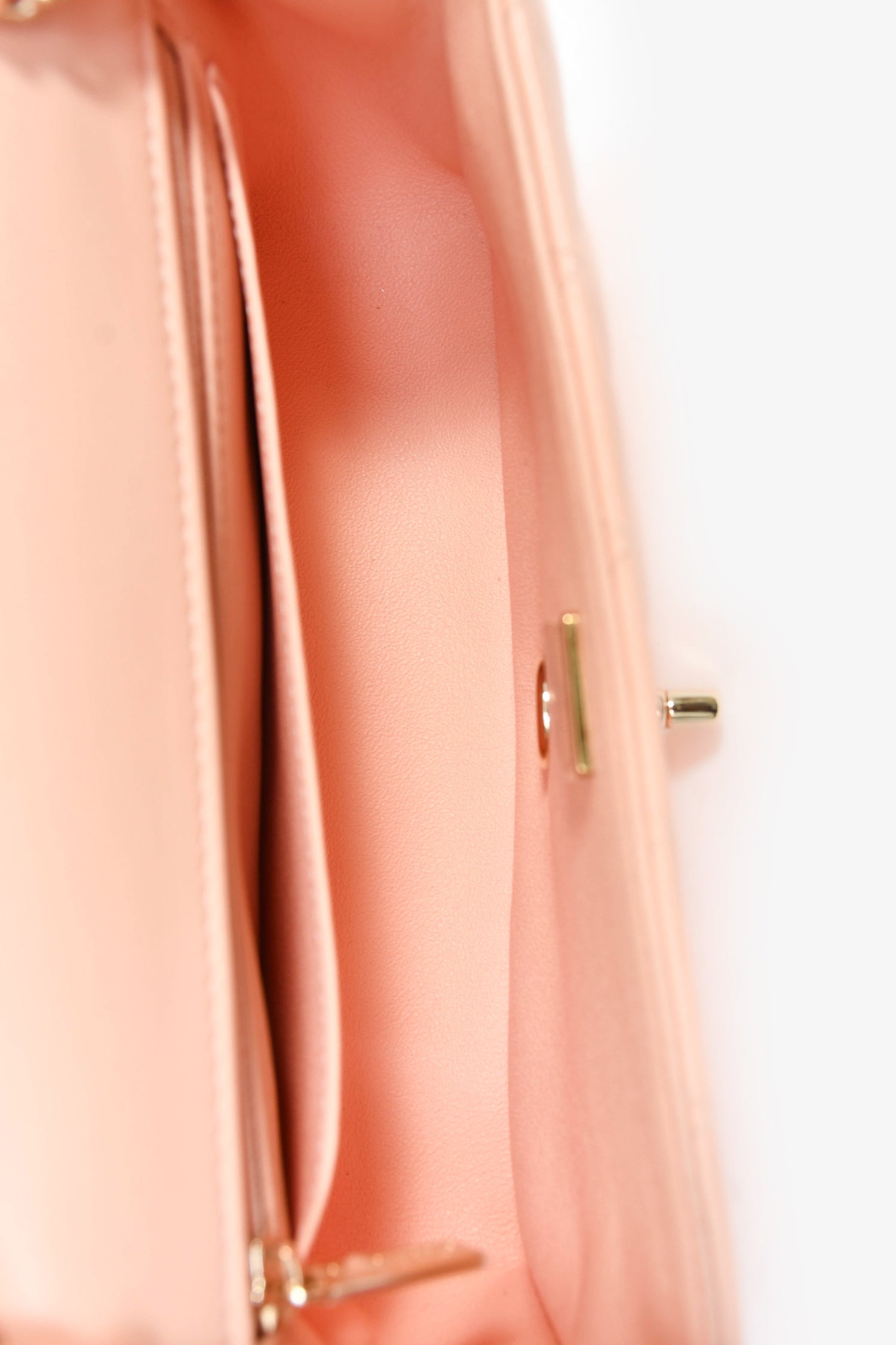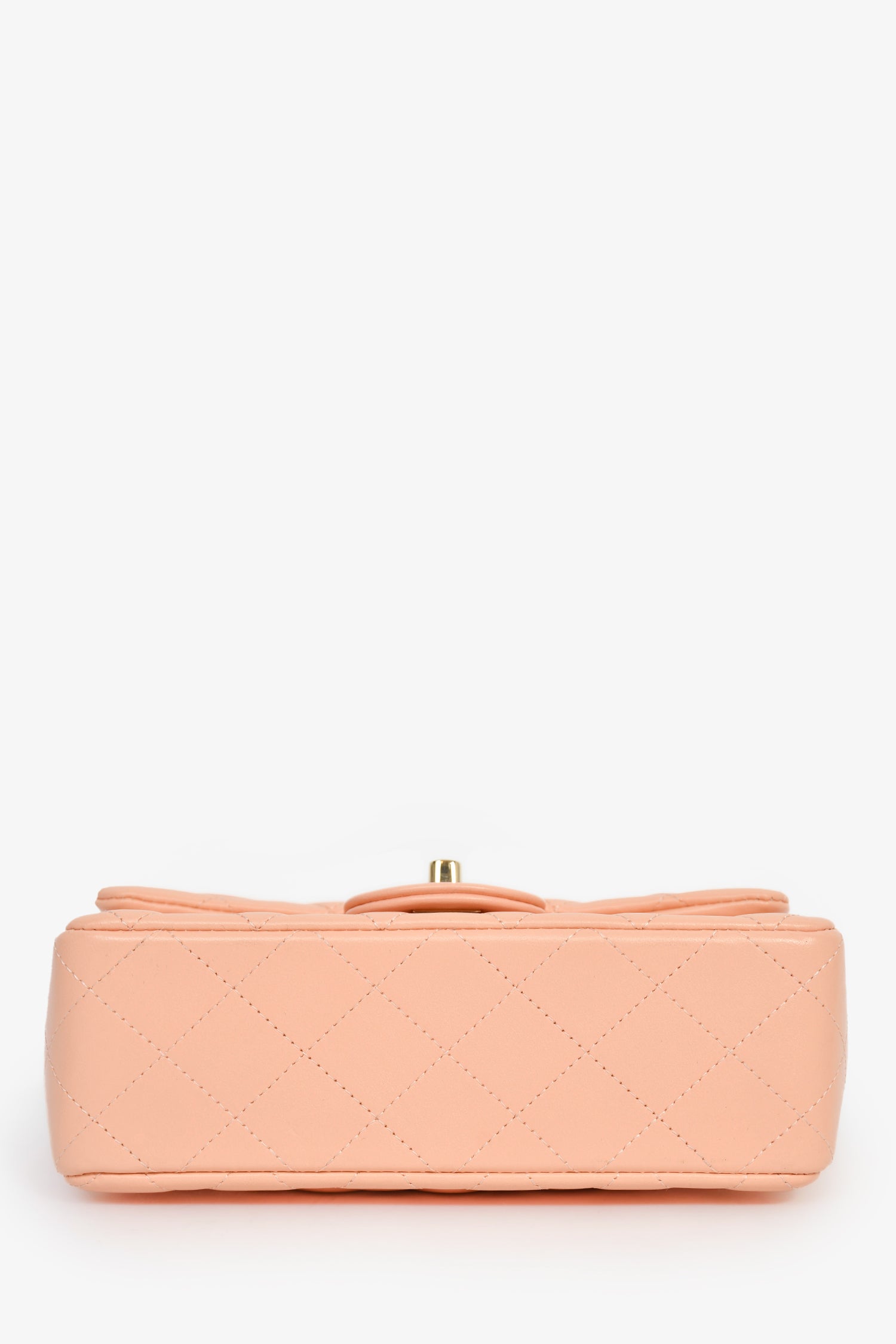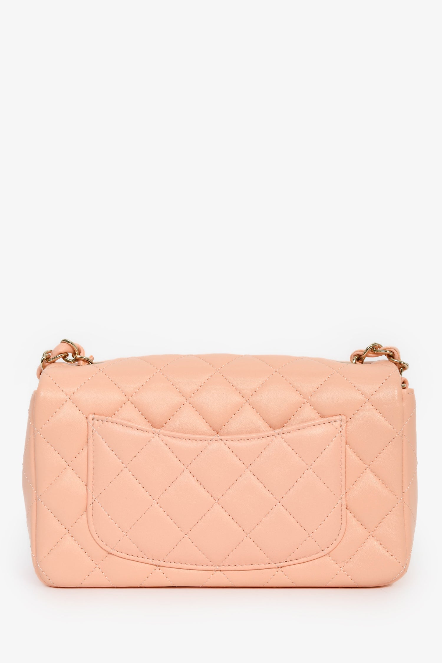 Pre-Loved Chanel™ 2022+ Peach-Pink Lambskin Mini Rectangle Classic Flap Bag. Fold-over flap with a turn-lock closure. Chain-link shoulder strap. 1 exterior slip pocket. 1 slip and 1 zip interior compartment. Gold-tone hardware. Tonal stitching.