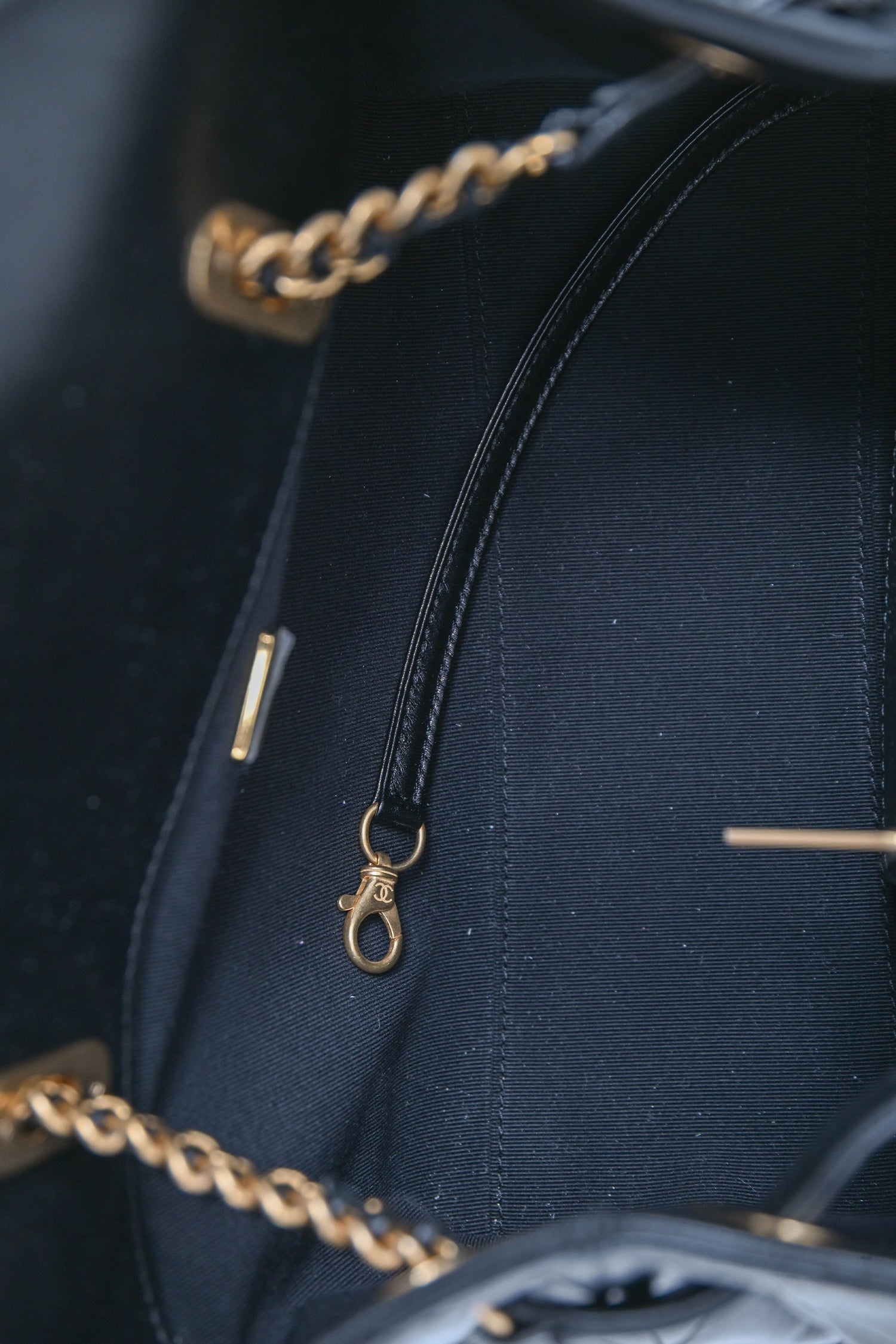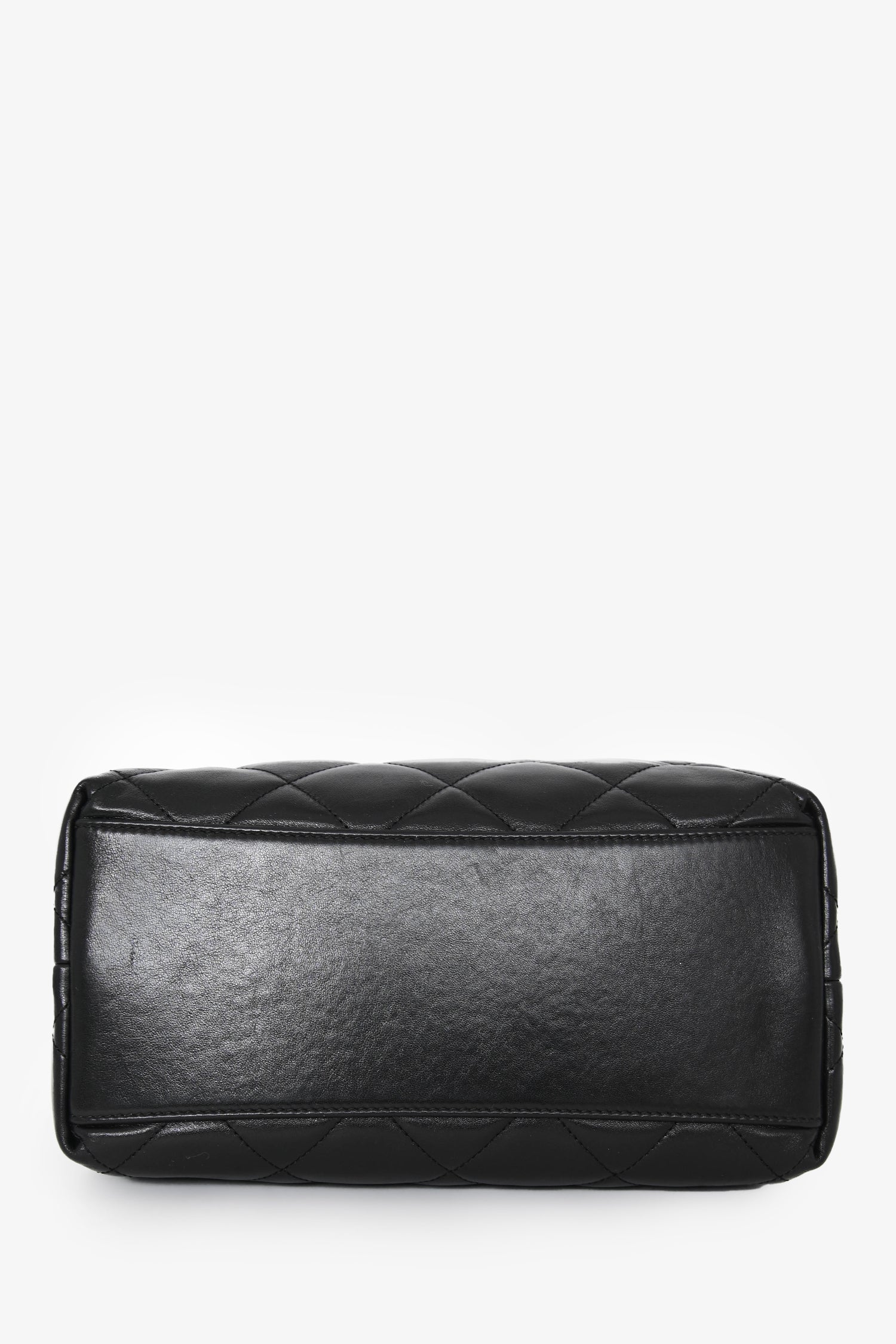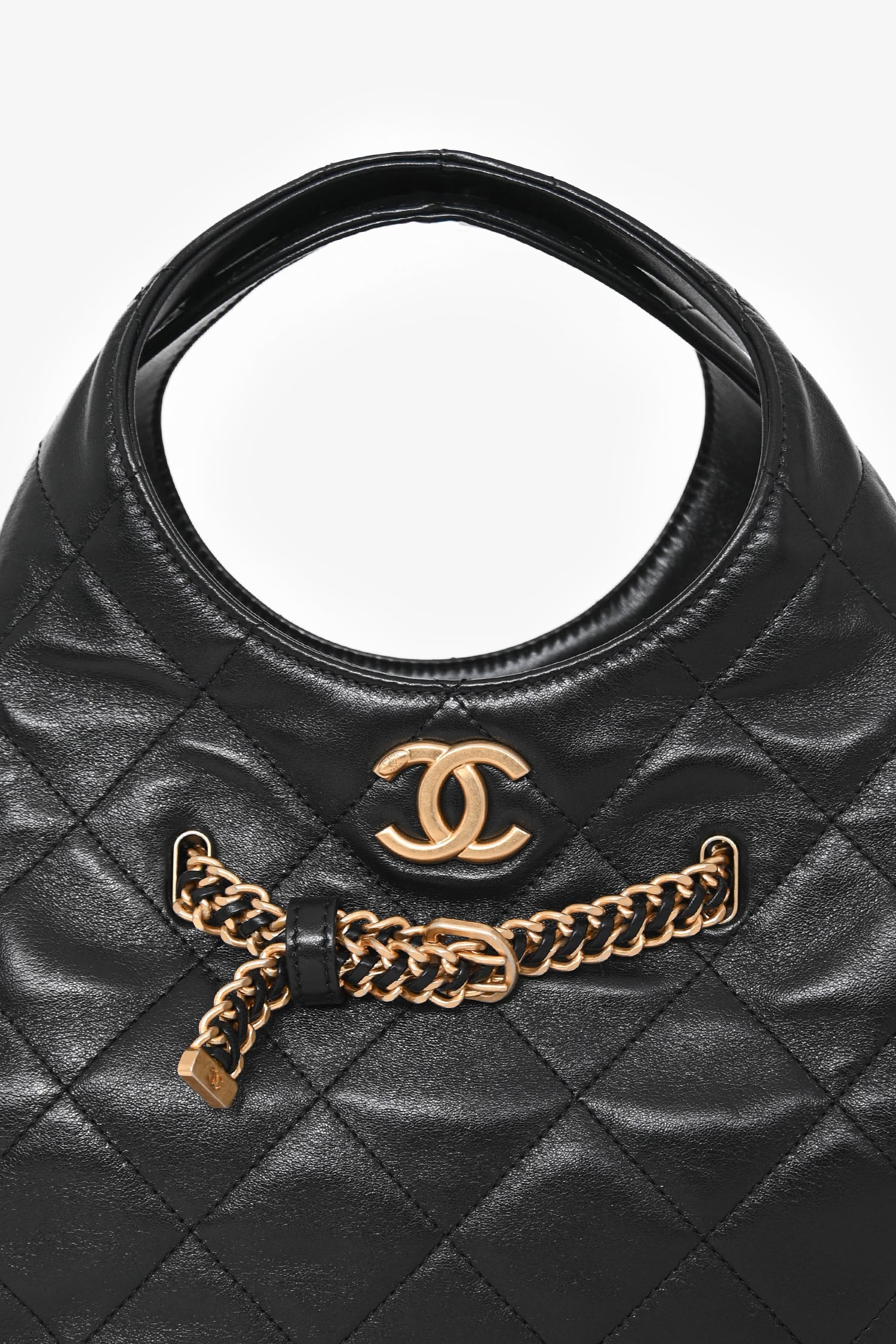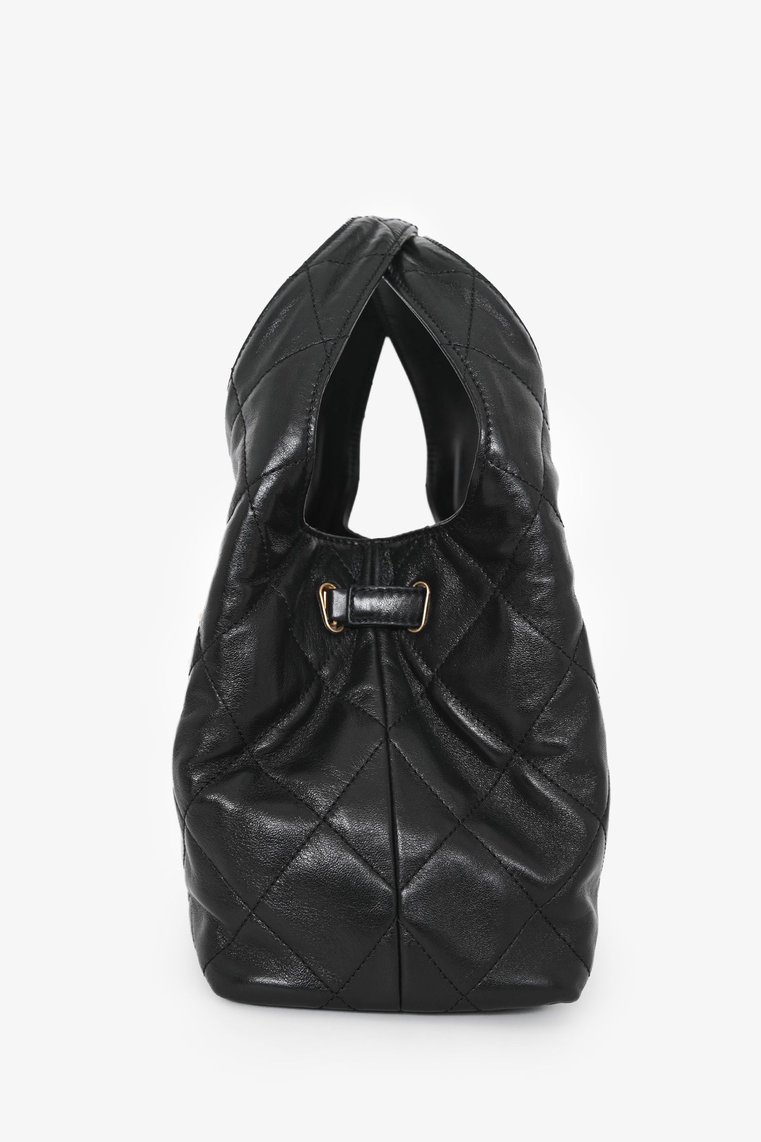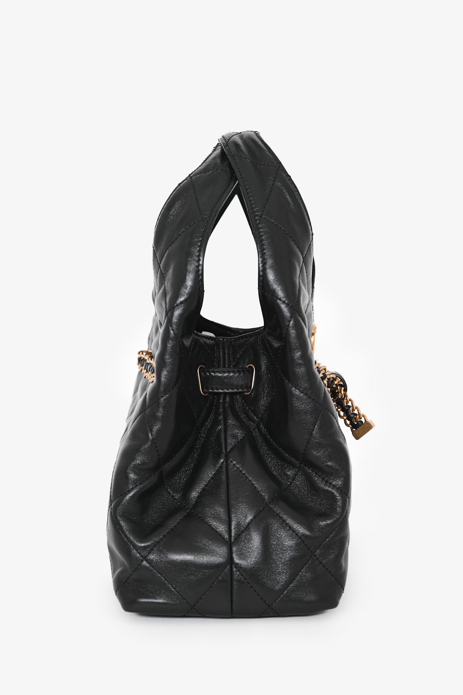 Pre-Loved Chanel™ 2025 Black Lambskin Small 25 Quilted Chain Buckle Bag. Dual top handles. Front drawstring chain strap closure. Lined interior. 2 interior wall pockets; 1 slip, 1 with zip closure. Gold-tone hardware. Tonal stitching.