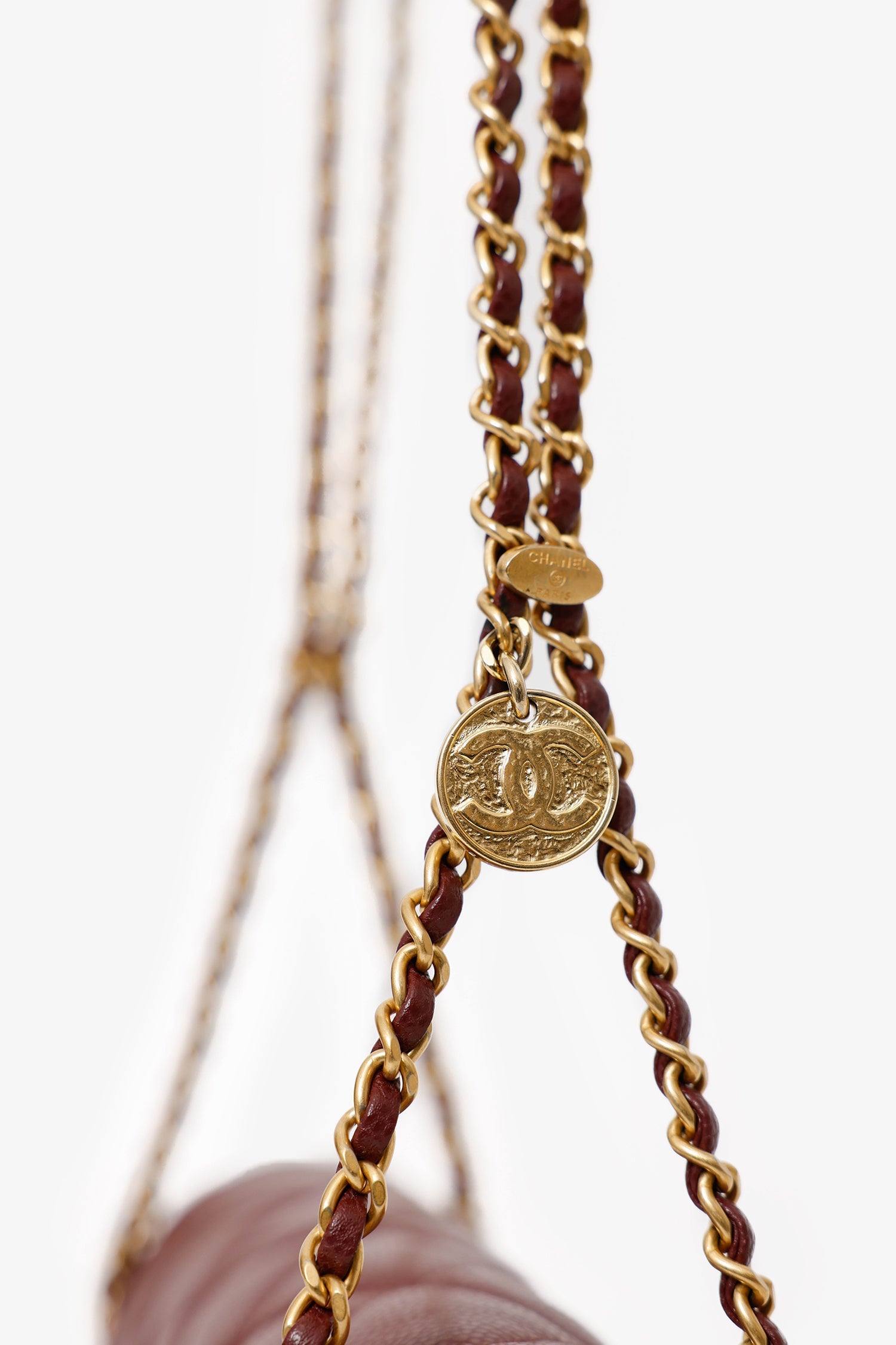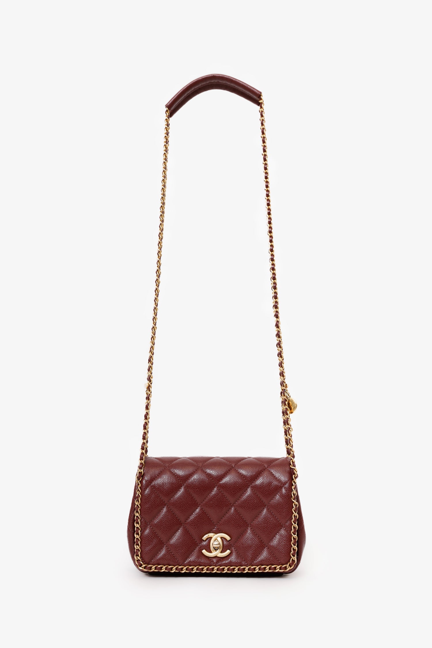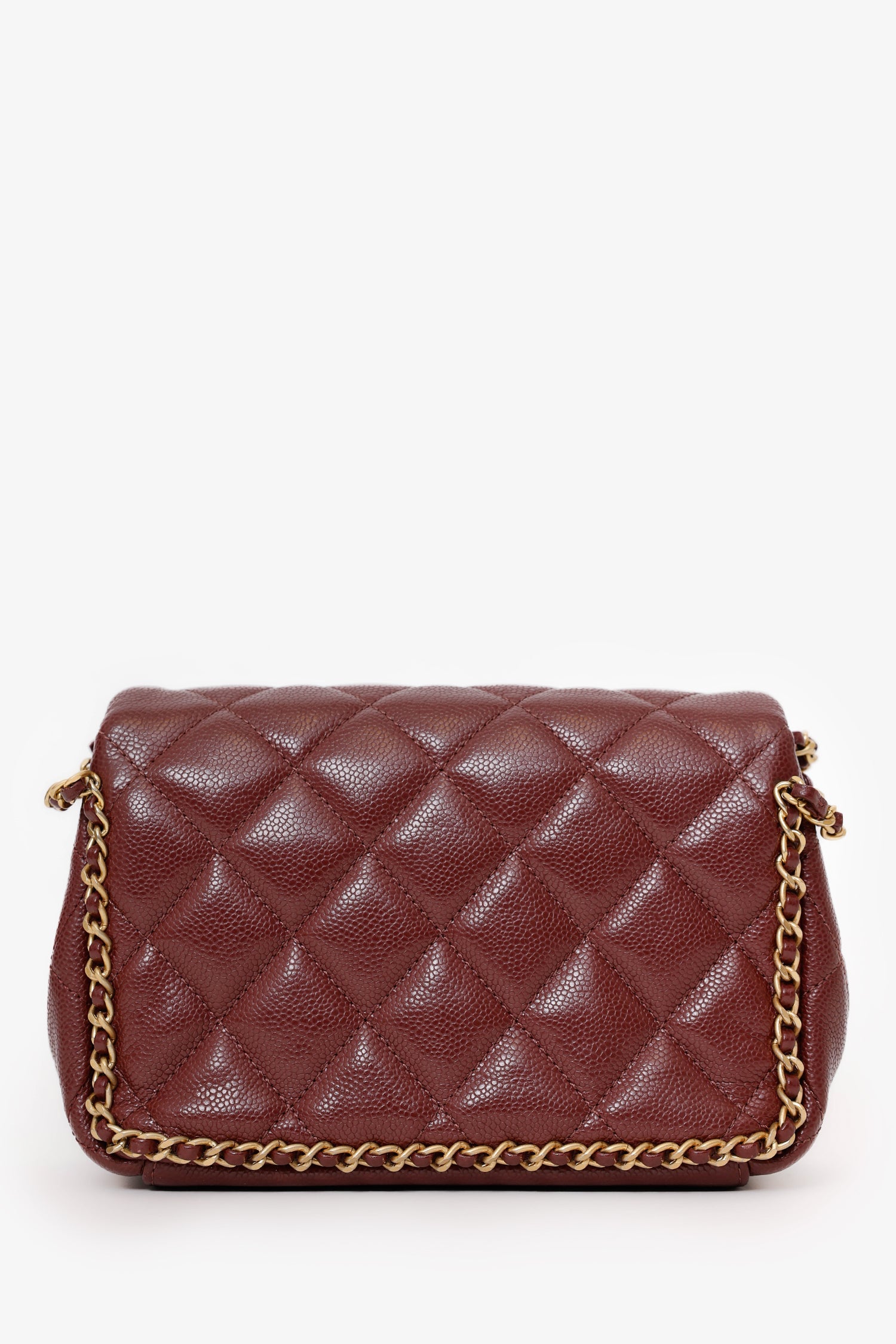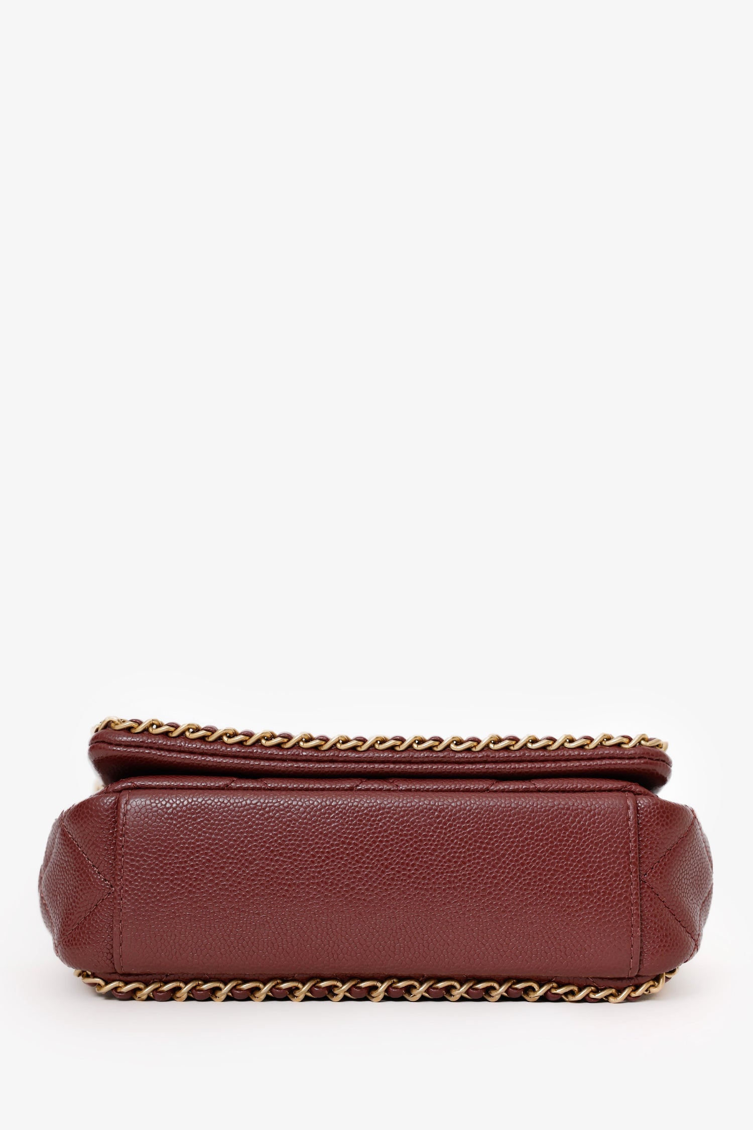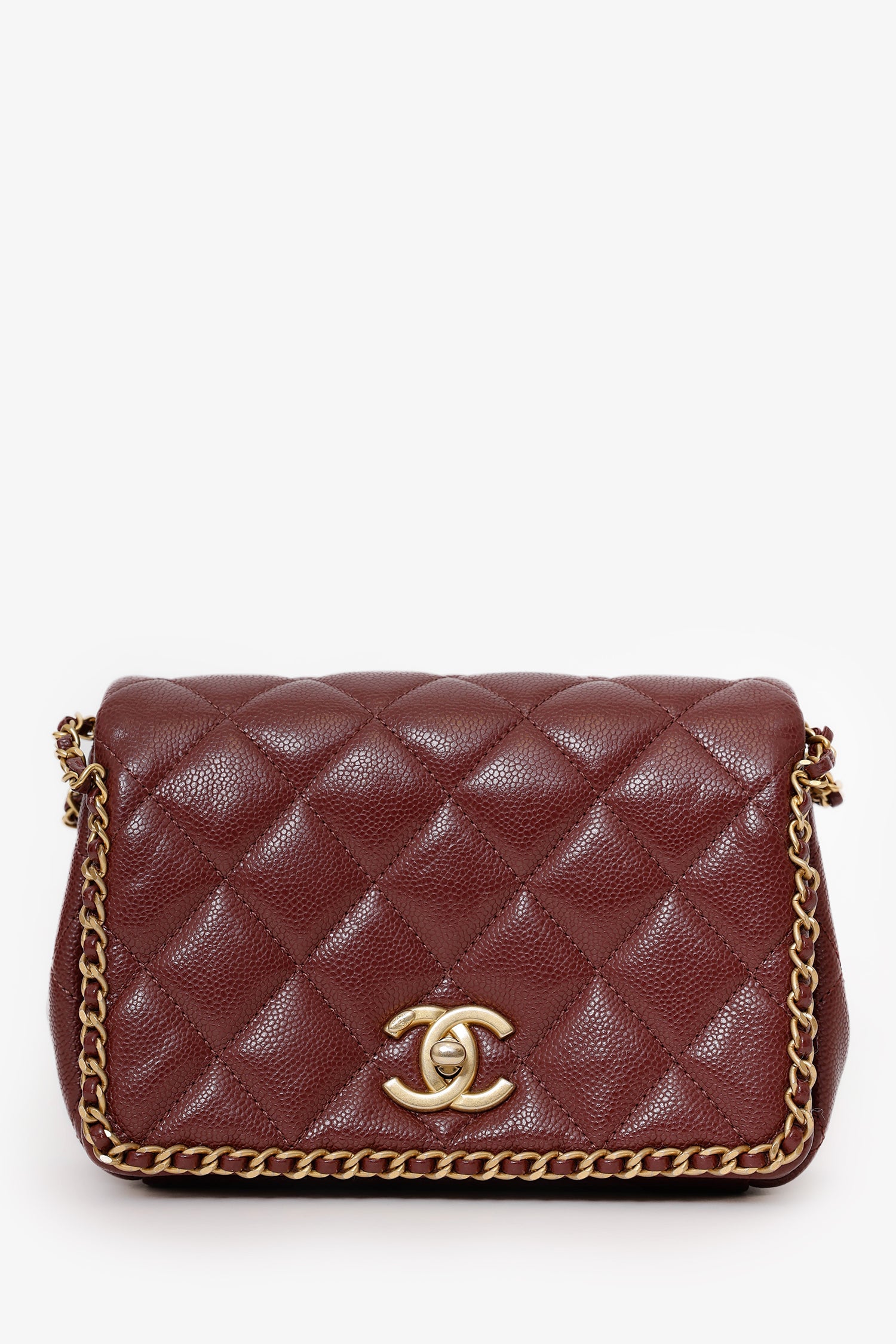 Pre-Loved Chanel™ 22B Burgundy Caviar Never Ending Chain Flap Bag. Front fold-over flap with turn-lock closure. Twin chainlink shoulder straps. Leather-lined interior. 2 interior pockets; 1 slip and 1 zip. Gold-tone hardware. Tonal stitching.