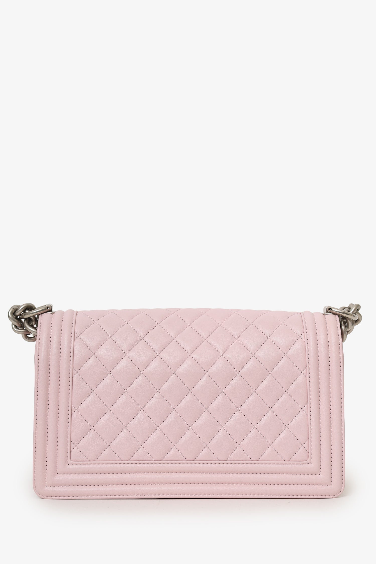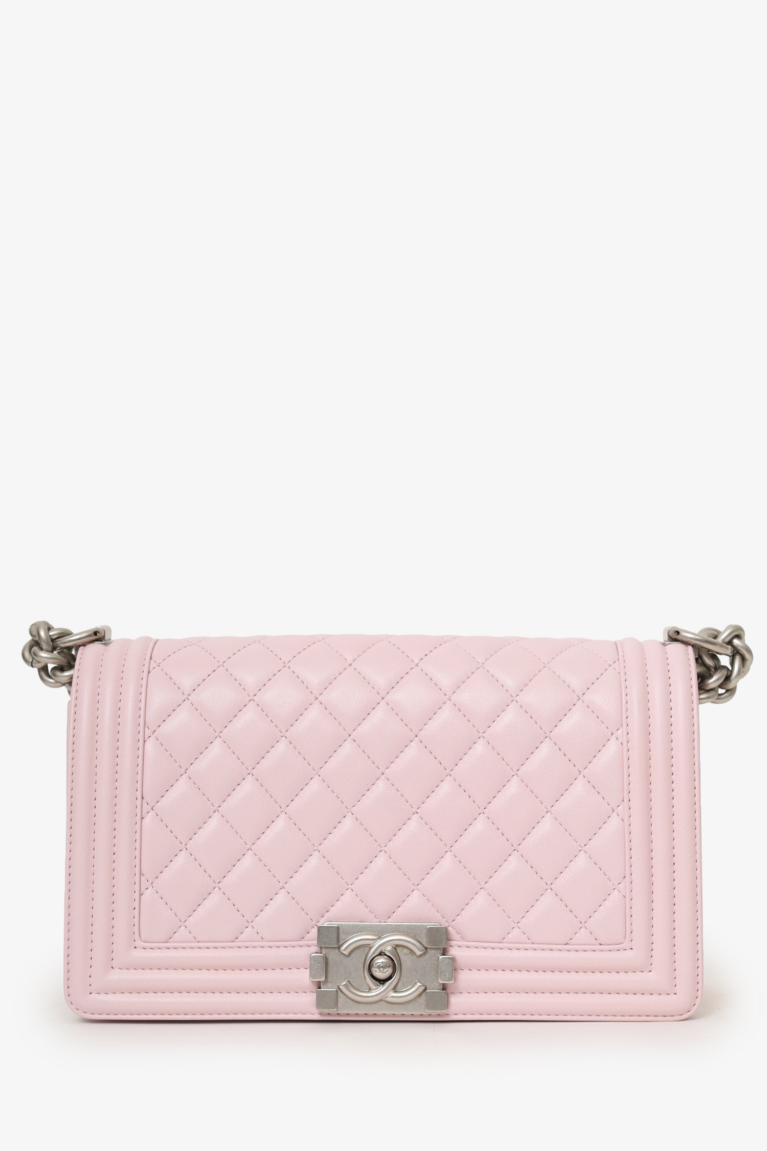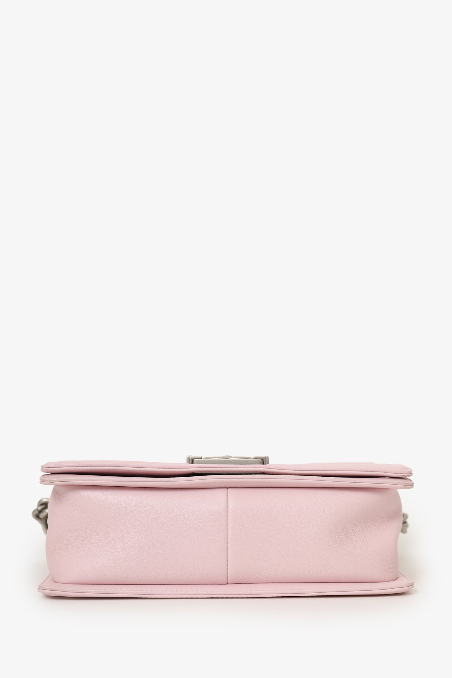 Pre-Loved Chanel™ Baby Pink Leather Medium Boy Bag. Front fold-over-flap with push-lock closure. Chain link shoulder strap. Lined interior with single rear slip pocket. Silver-tone hardware. Tonal stitching.