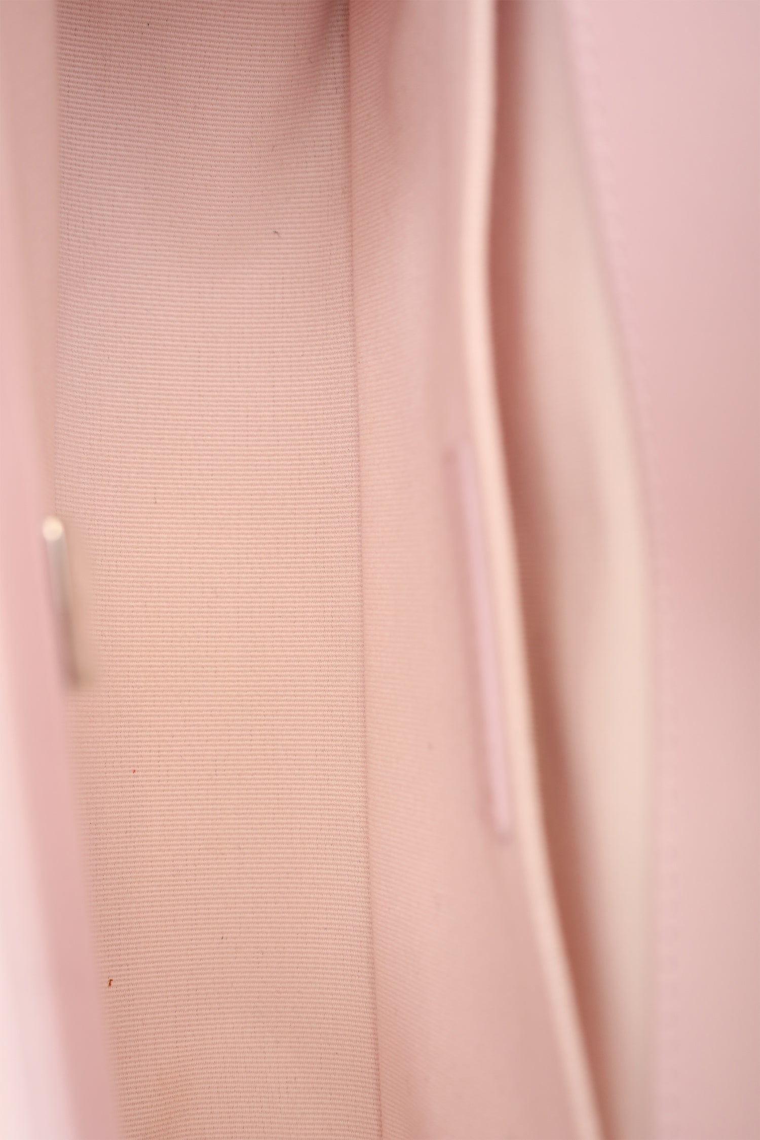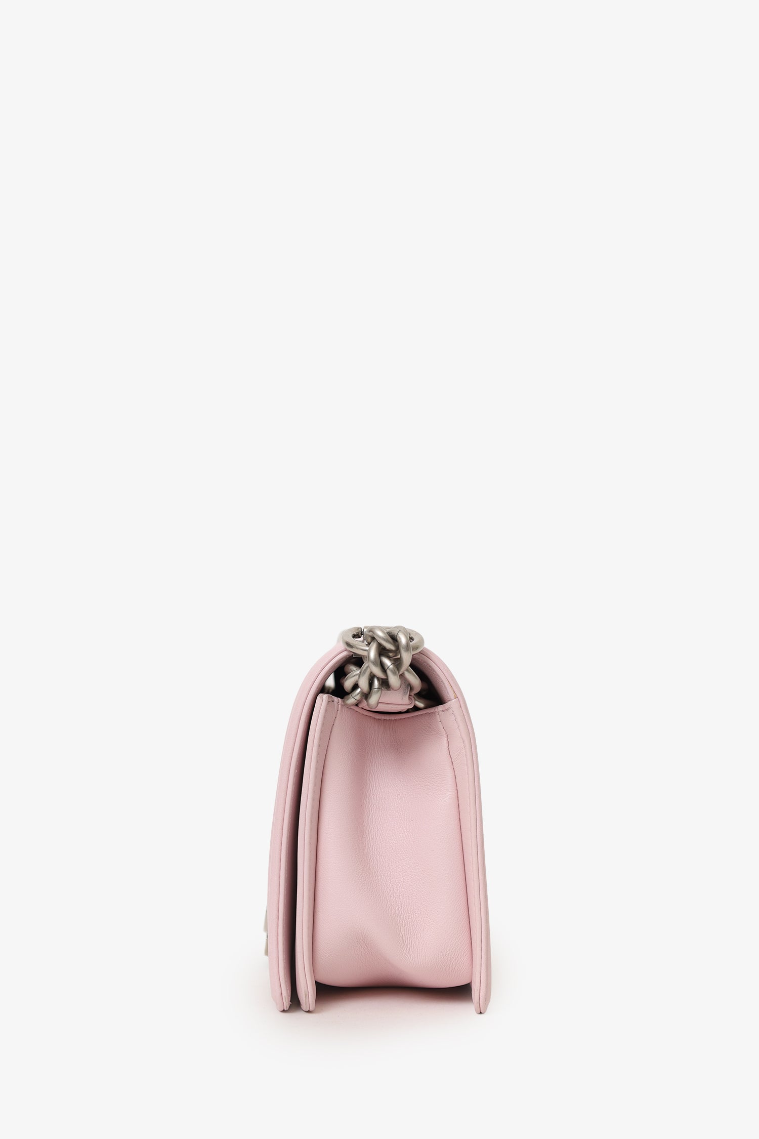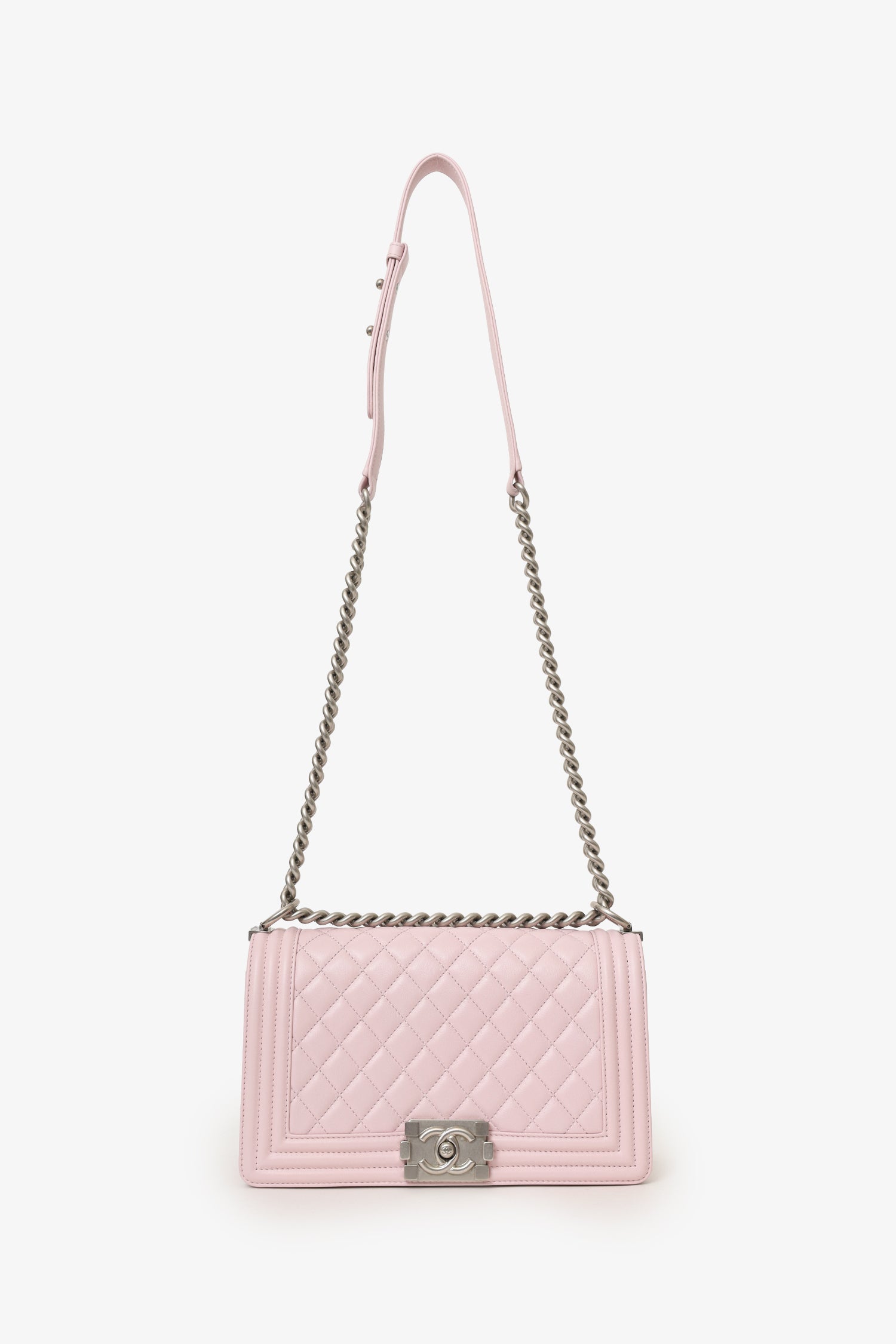 Pre-Loved Chanel™ Baby Pink Leather Medium Boy Bag. Front fold-over-flap with push-lock closure. Chain link shoulder strap. Lined interior with single rear slip pocket. Silver-tone hardware. Tonal stitching.