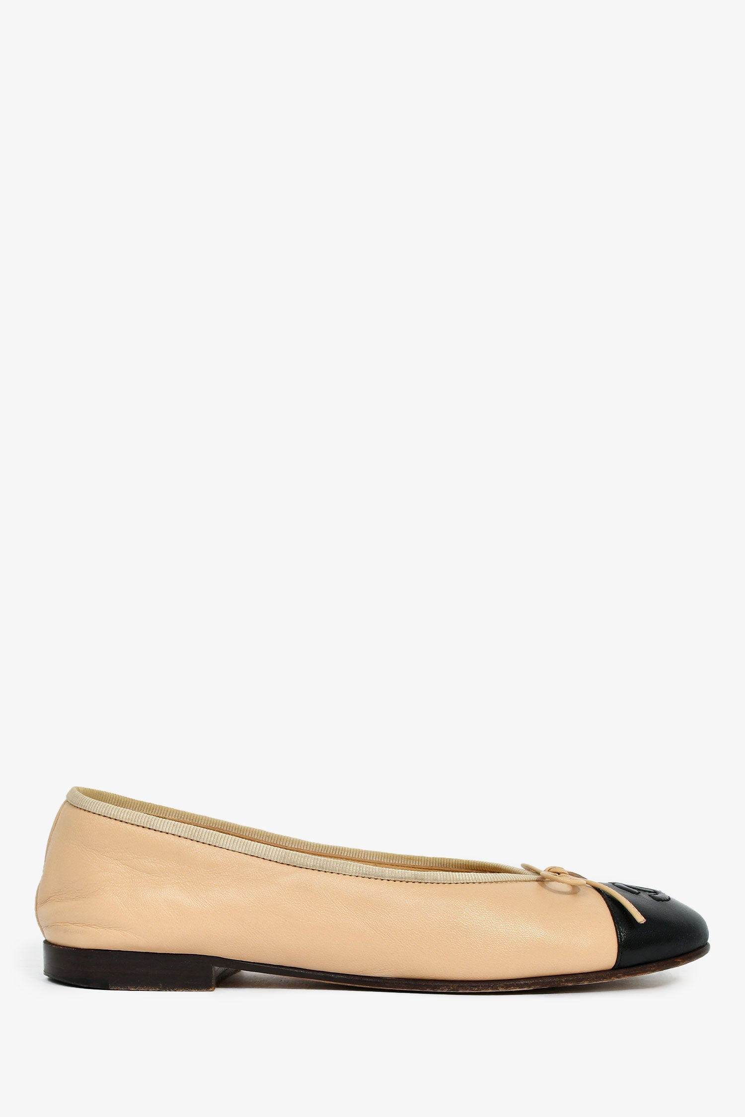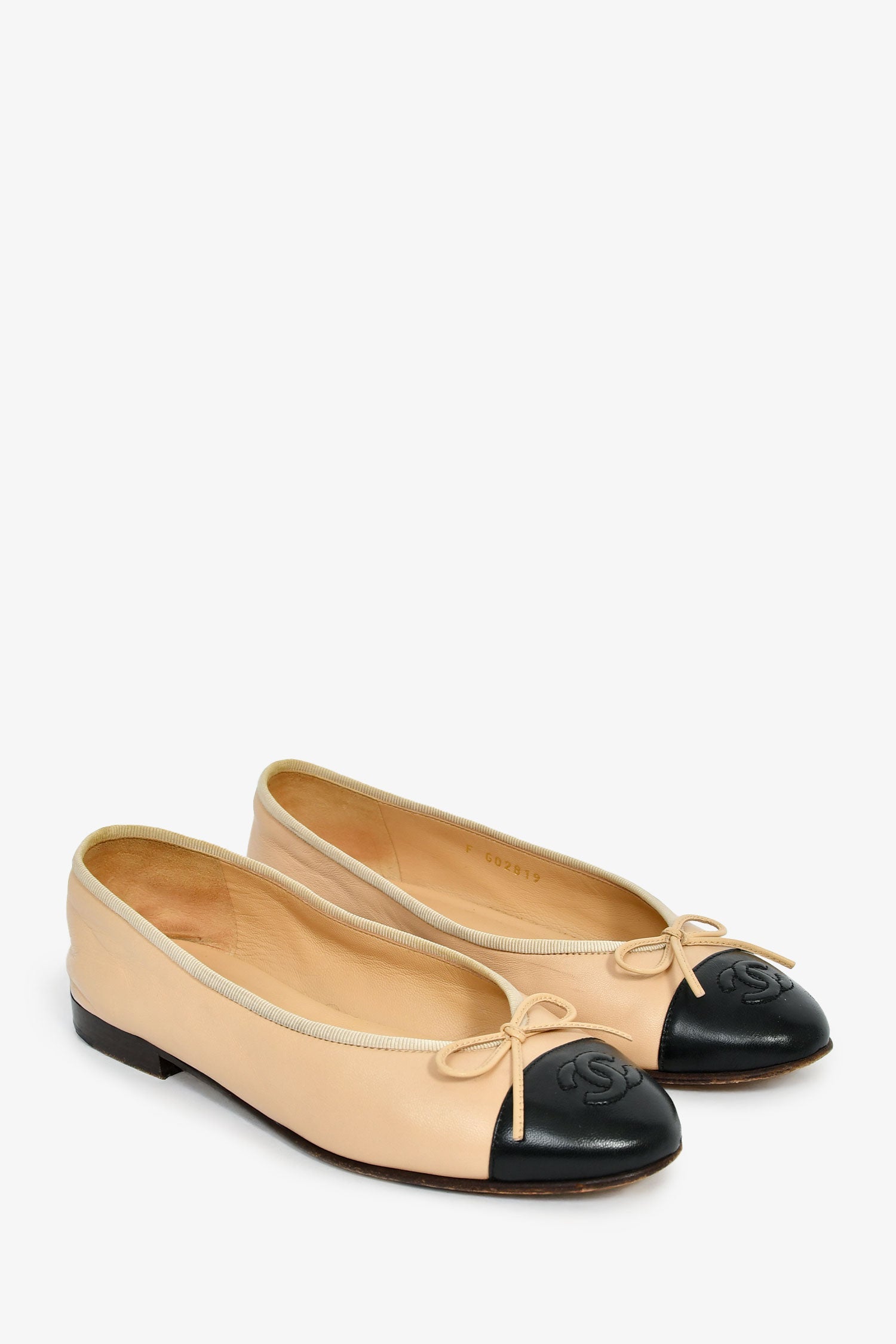 Pre-Loved Chanel™ Beige/Black Leather CC Ballet Flats Size 35