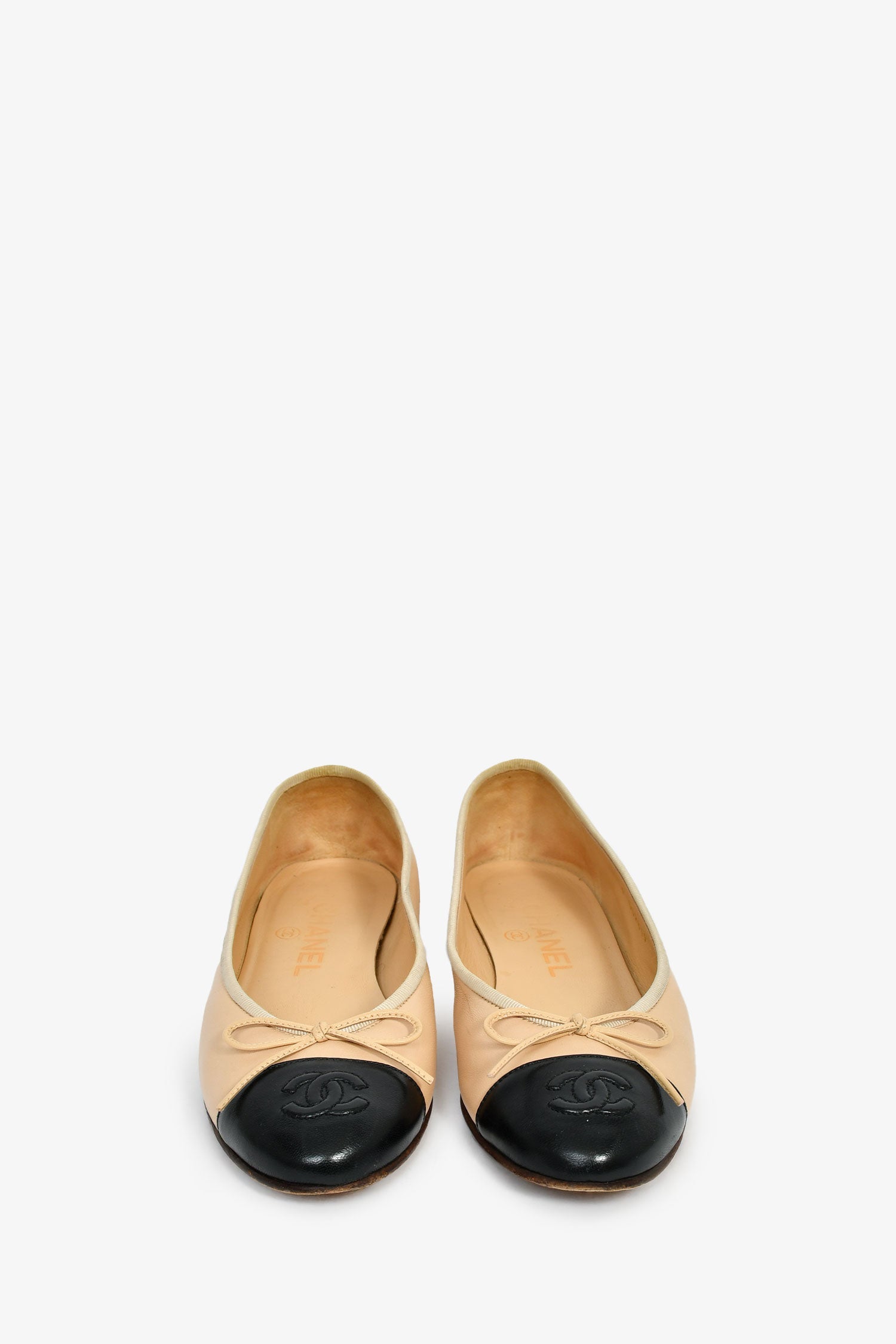 Pre-Loved Chanel™ Beige/Black Leather CC Ballet Flats. Slip-on. Almond toe. Tonal stitching.