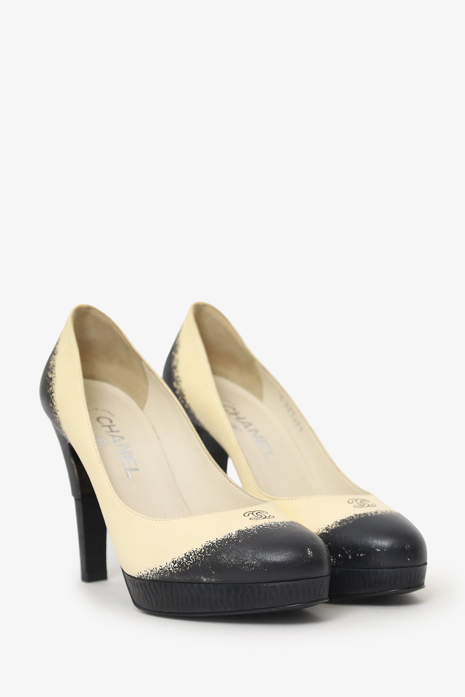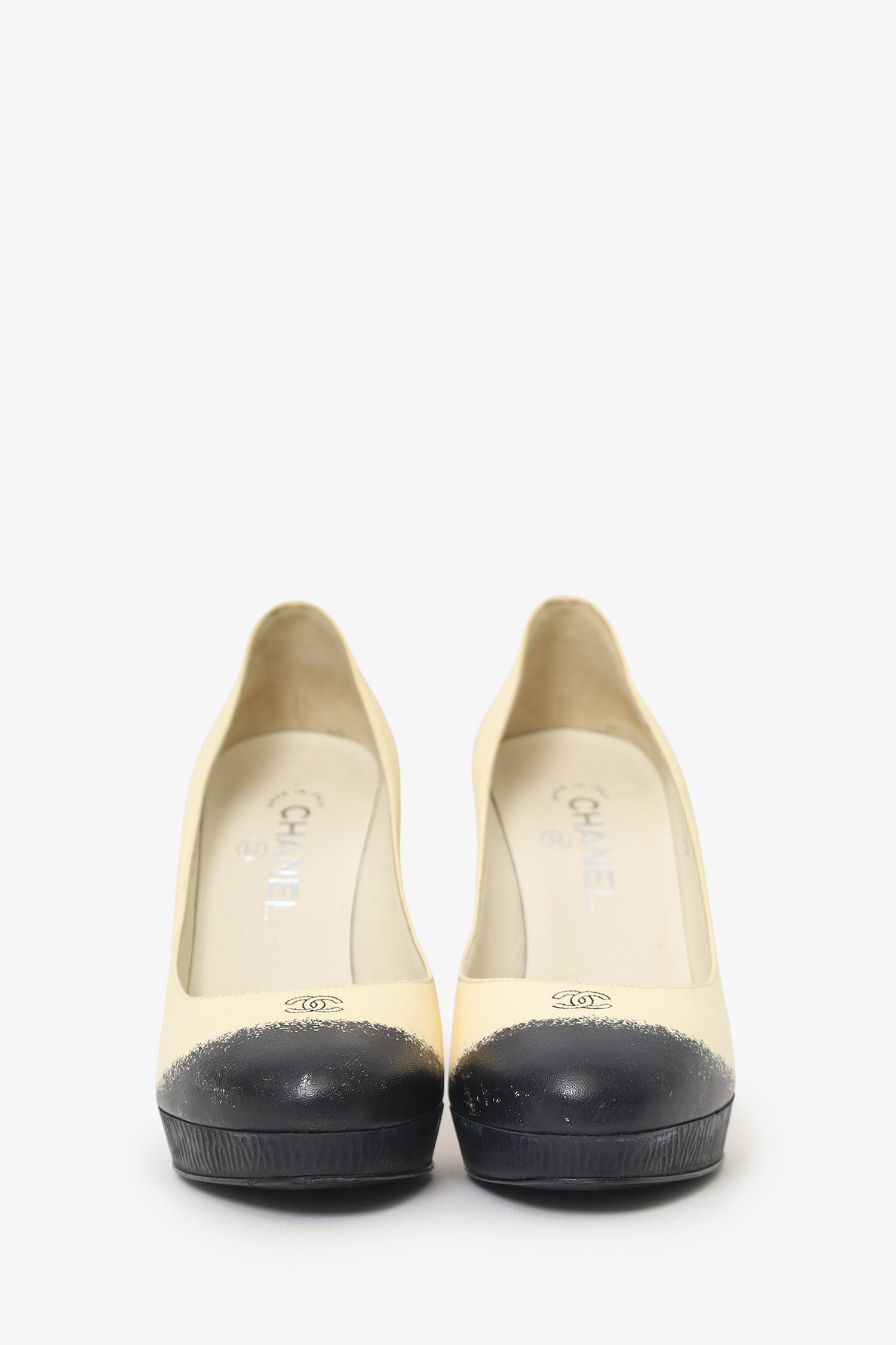 Pre-Loved Chanel™ Beige/Black Leather CC Platform Pumps Size 38.5