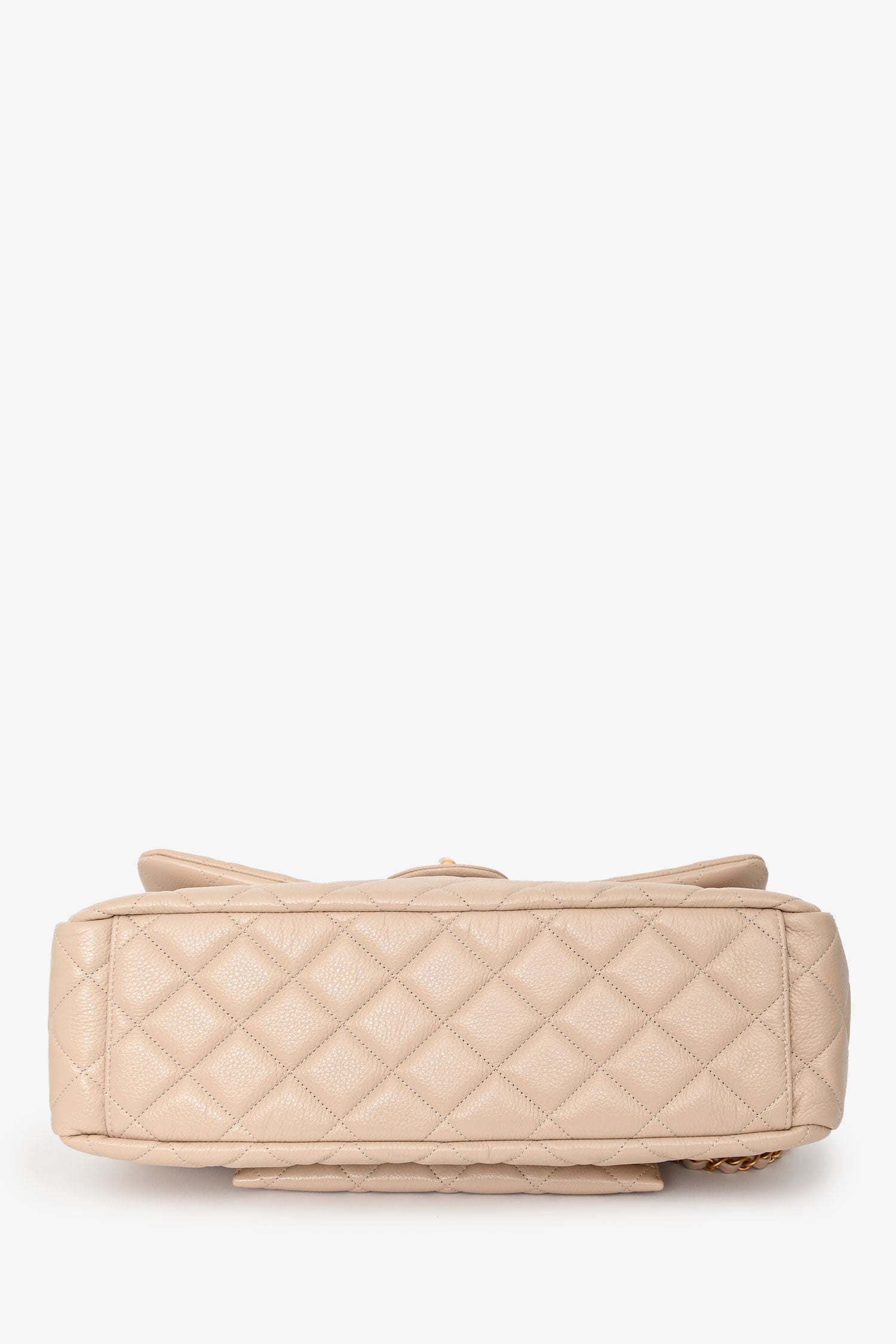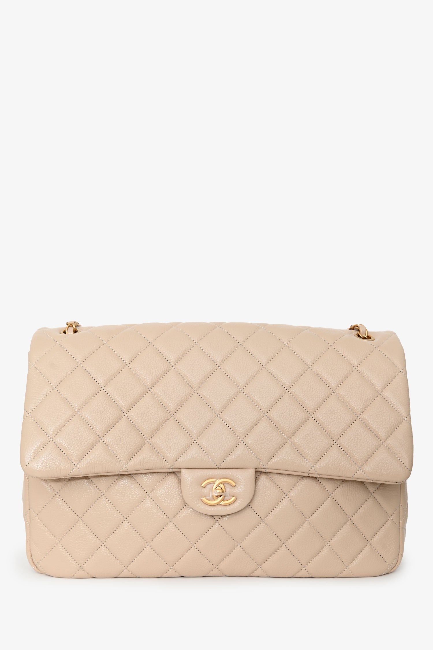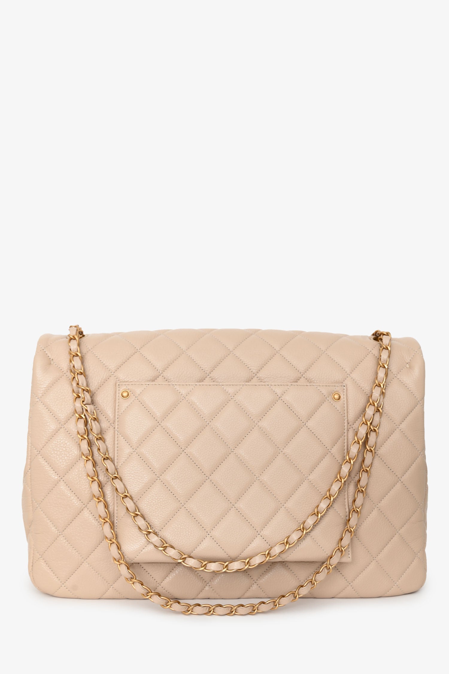 Pre-Loved Chanel™ Beige Calfskin Leather Airline XXL Single Flap Bag. Front fold-over flap with turn-lock closure. Twin chain link shoulder straps that can be pulled in and extended to one long strap. Single interior compartment. 2 pockets on the inside: one wall slip pocket, one wall pocket with zip closure. Textile-lined. Single exterior slip pocket in the rear. Gold-tone hardware. Tonal stitching.