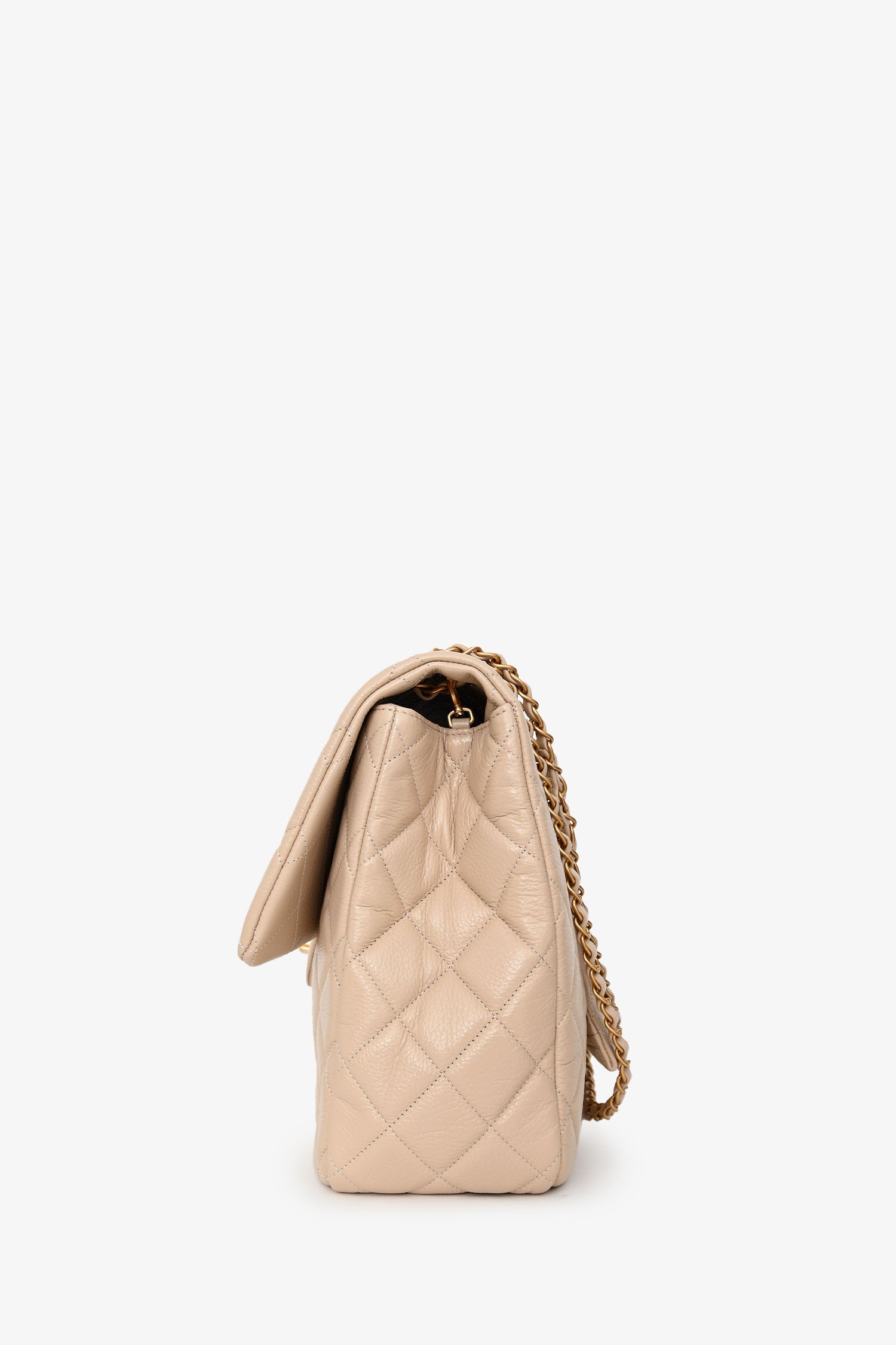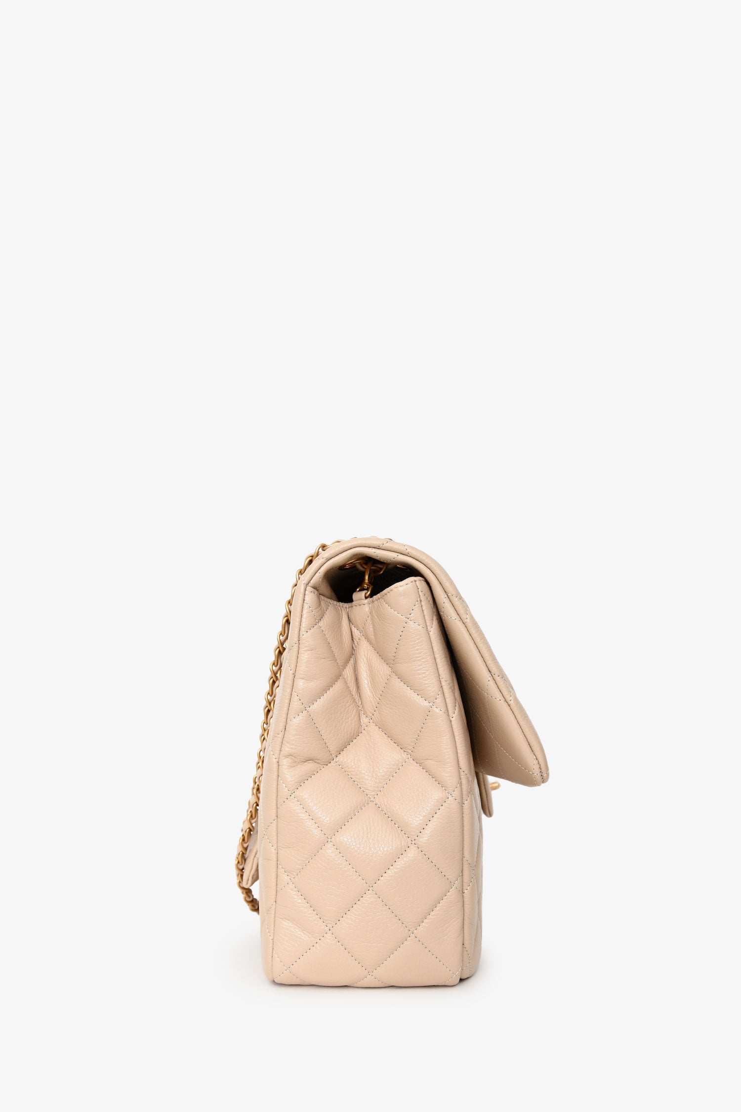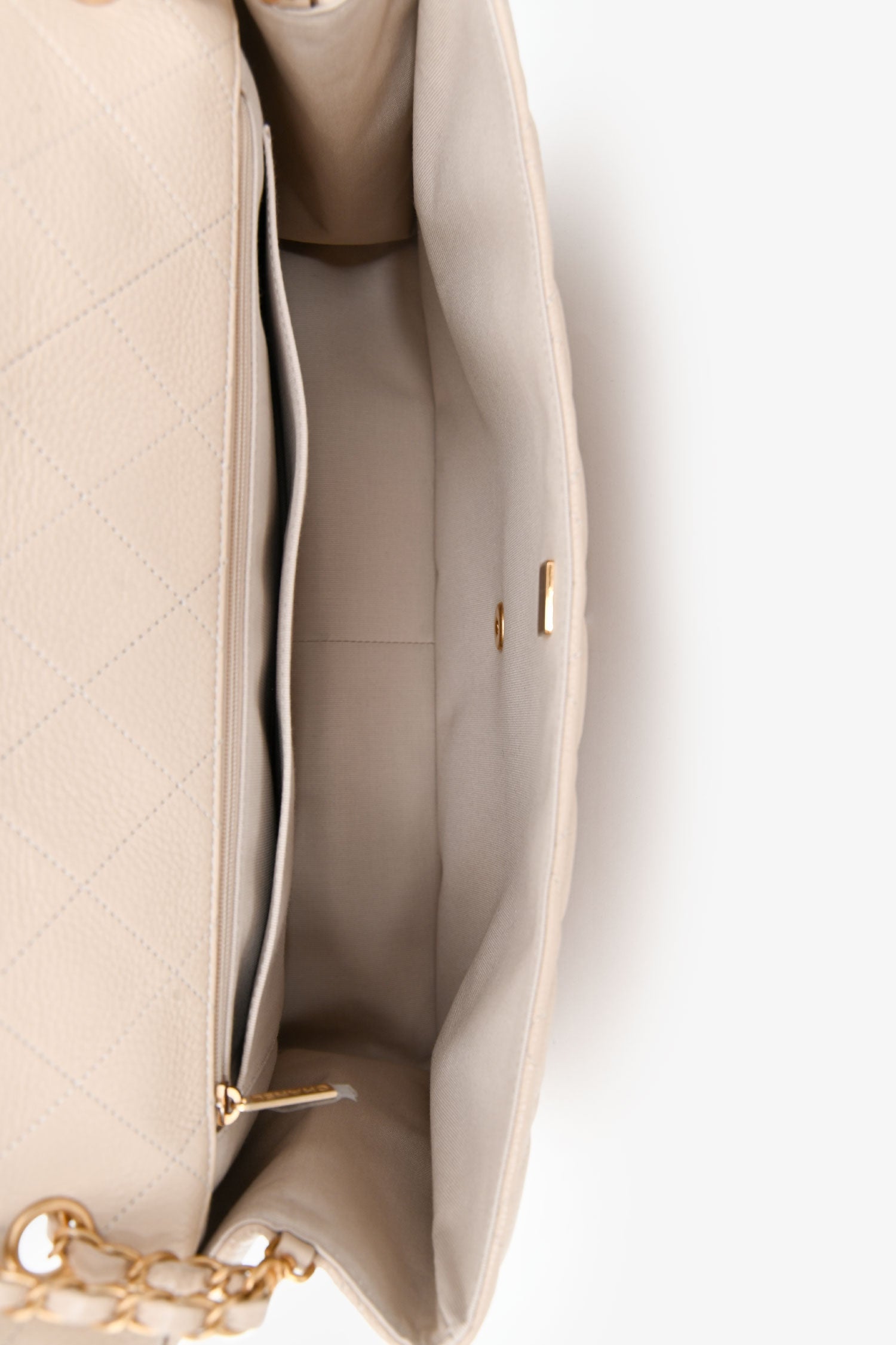 Pre-Loved Chanel™ Beige Calfskin Leather Airline XXL Single Flap Bag. Front fold-over flap with turn-lock closure. Twin chain link shoulder straps that can be pulled in and extended to one long strap. Single interior compartment. 2 pockets on the inside: one wall slip pocket, one wall pocket with zip closure. Textile-lined. Single exterior slip pocket in the rear. Gold-tone hardware. Tonal stitching.
