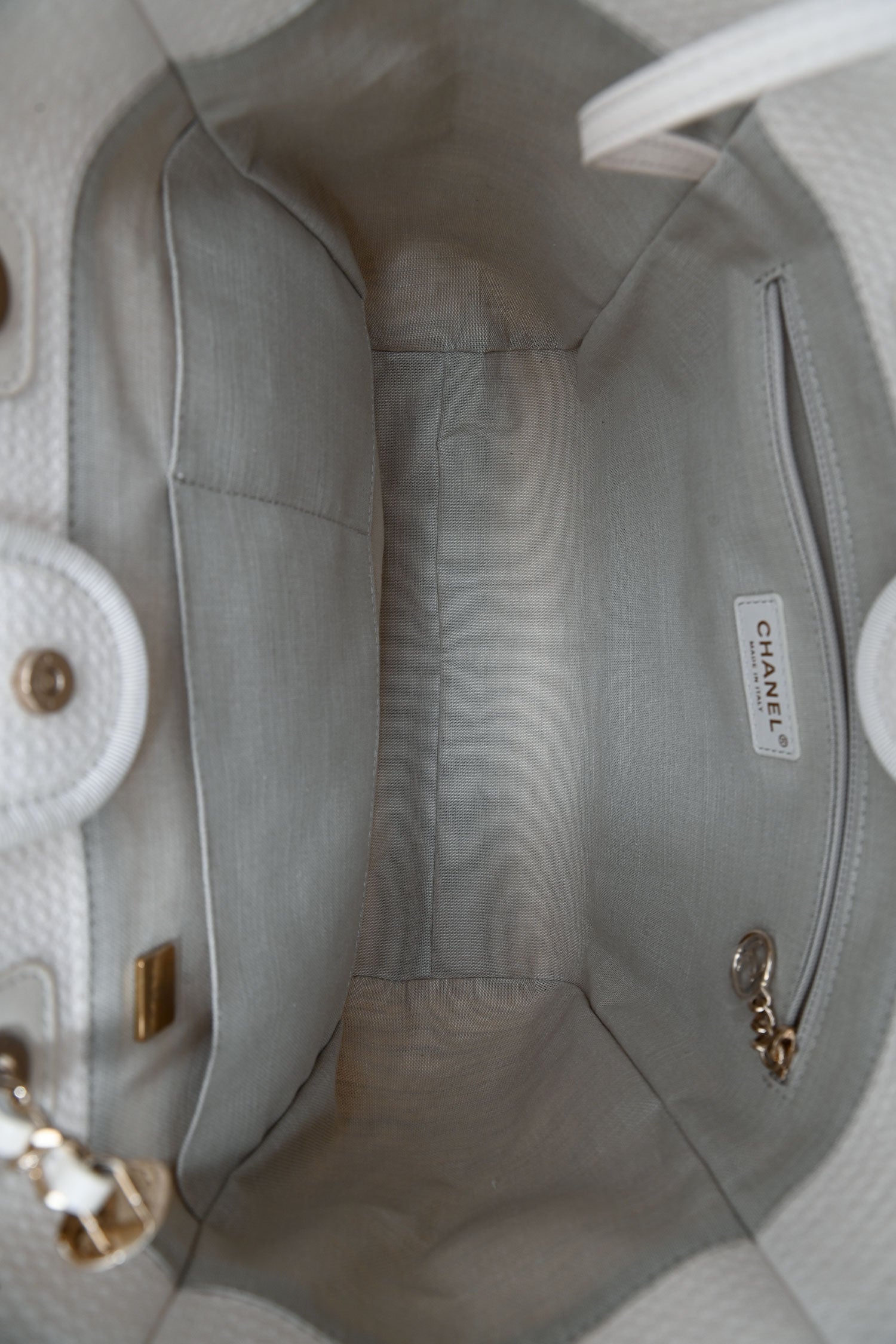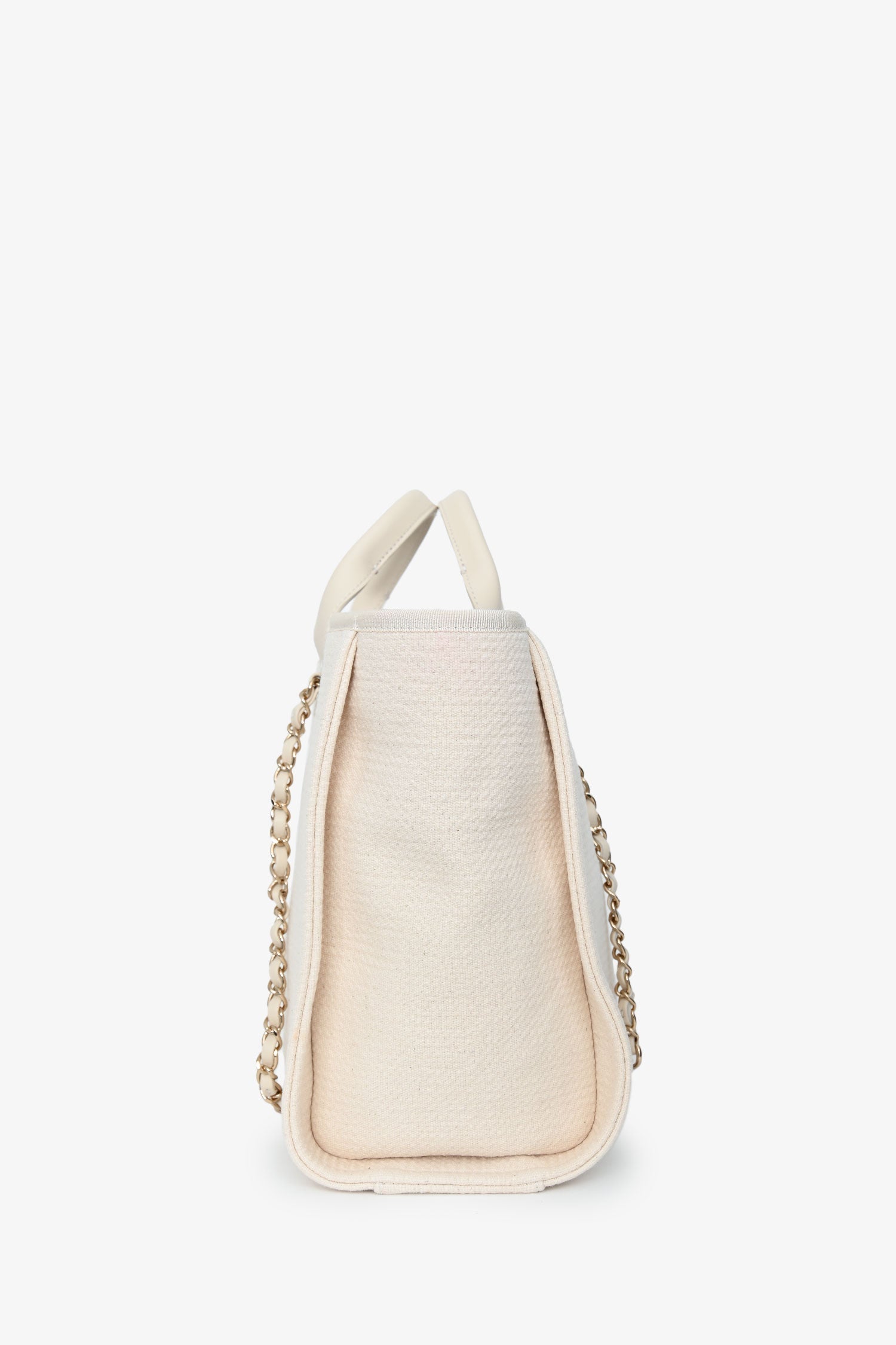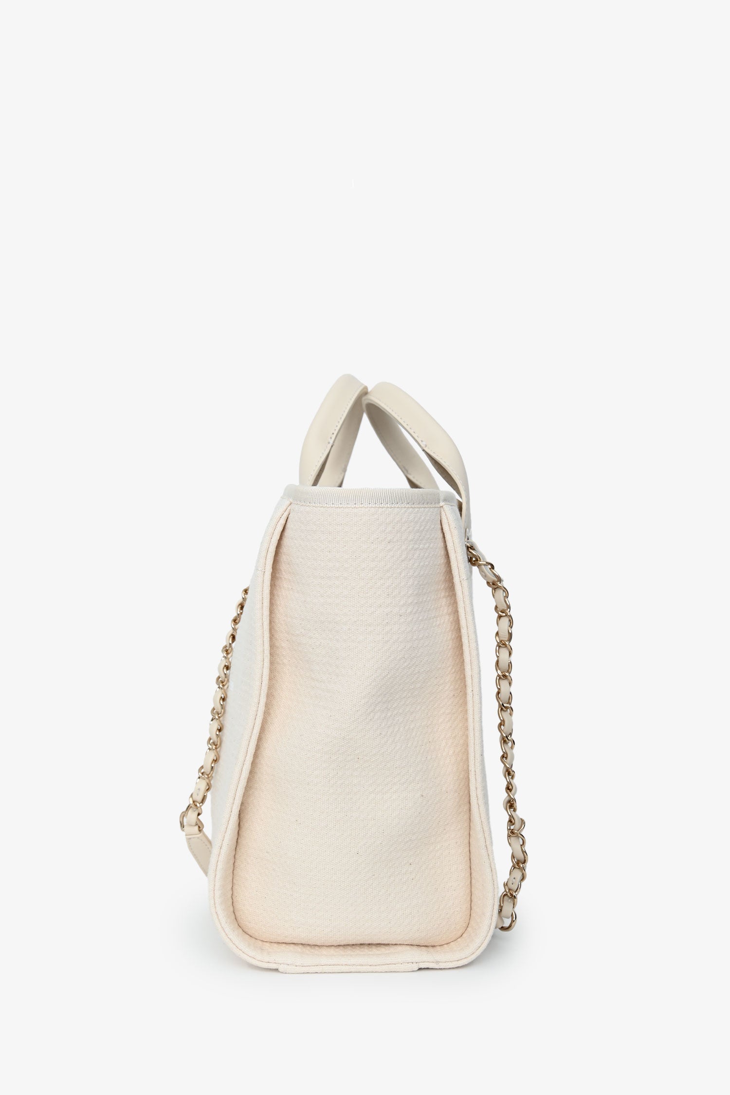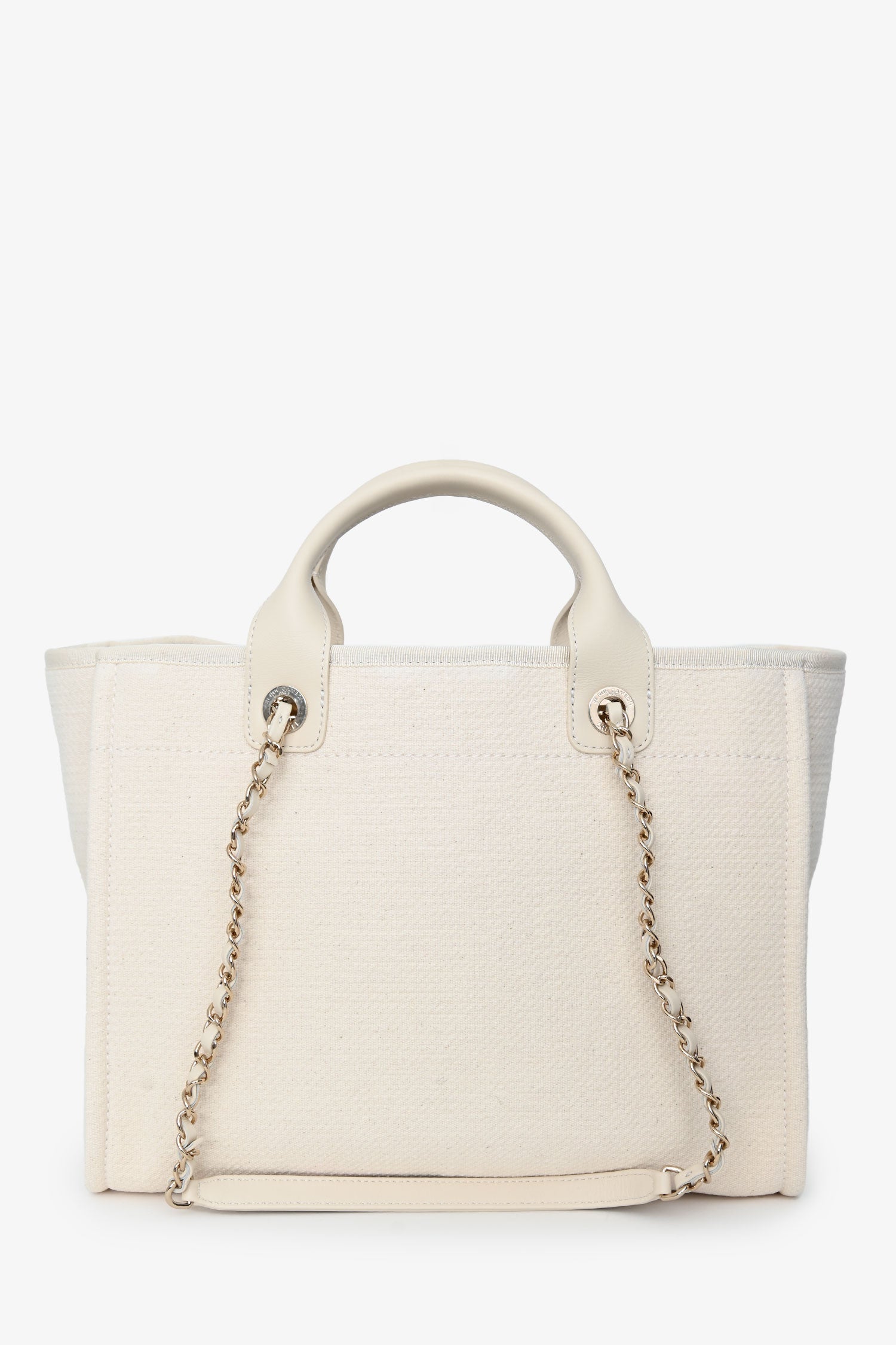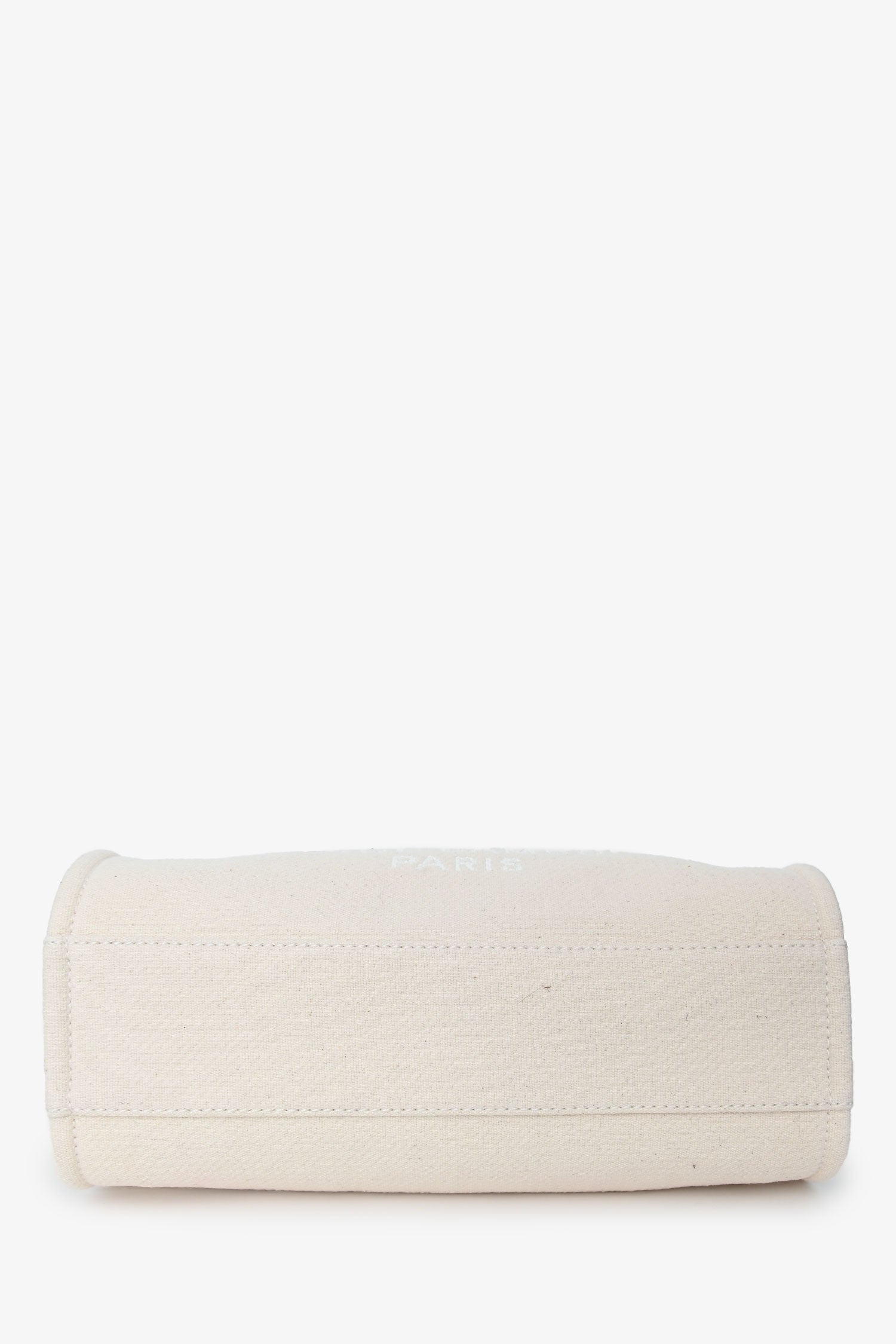 Pre-Loved Chanel™ Beige Canvas Small Deauville Shopping Tote with Pouch. Top snap button closure. Twin top handle and shoulder straps. Single interior compartment. 3 interior wall slip pockets, one with zip closure. Detachable pouch with zip closure. Textile-lined. Gold-tone hardware. Tonal stitching.