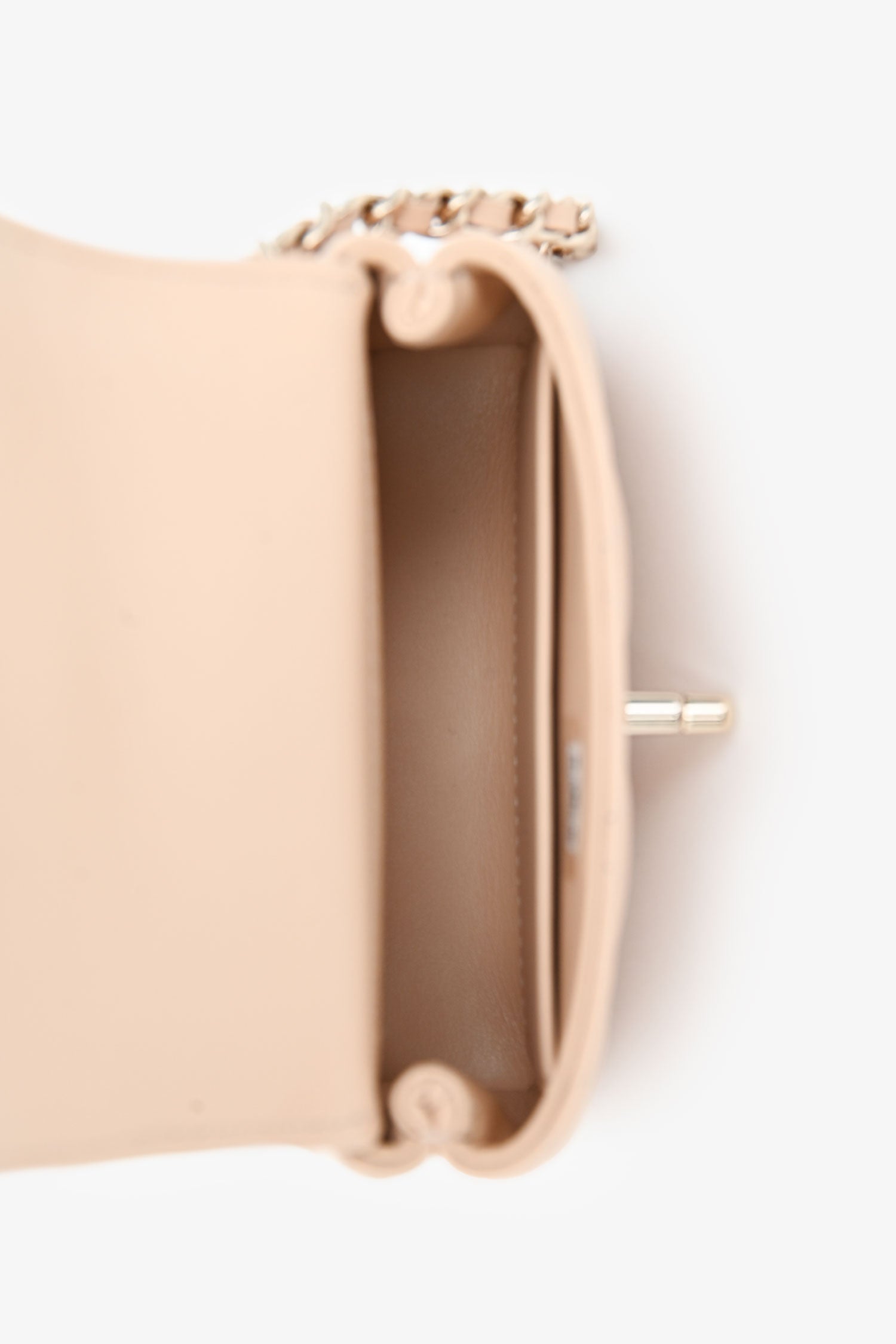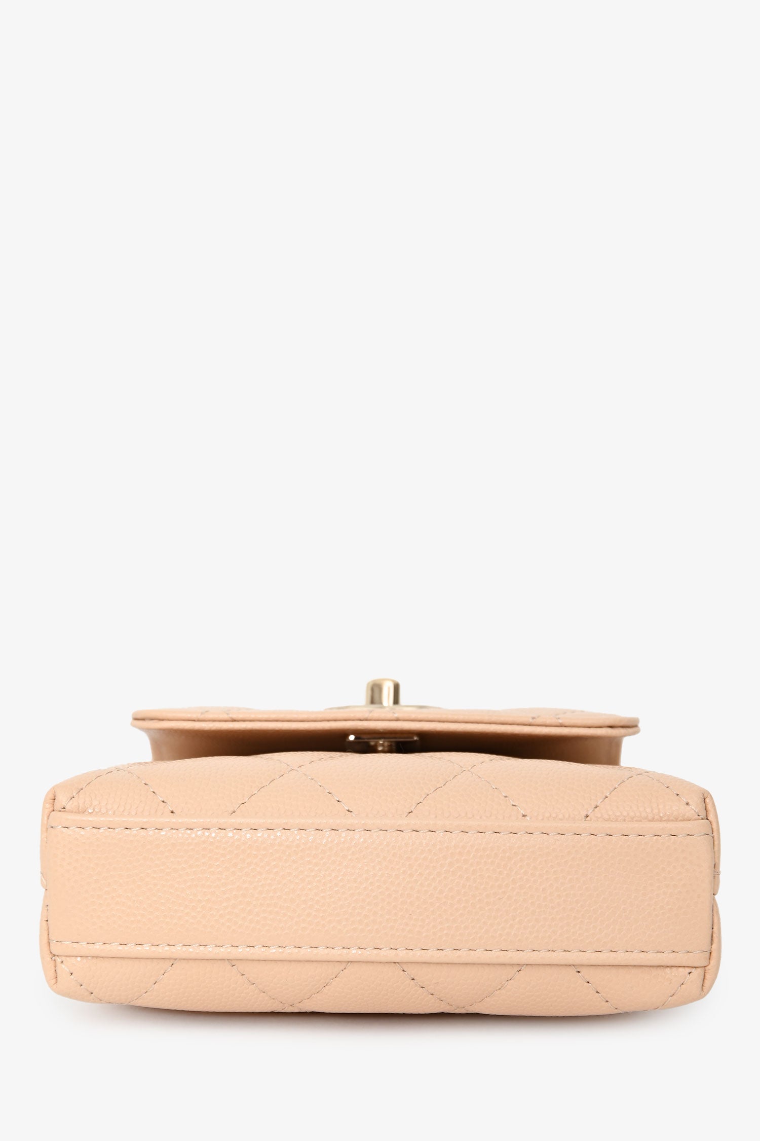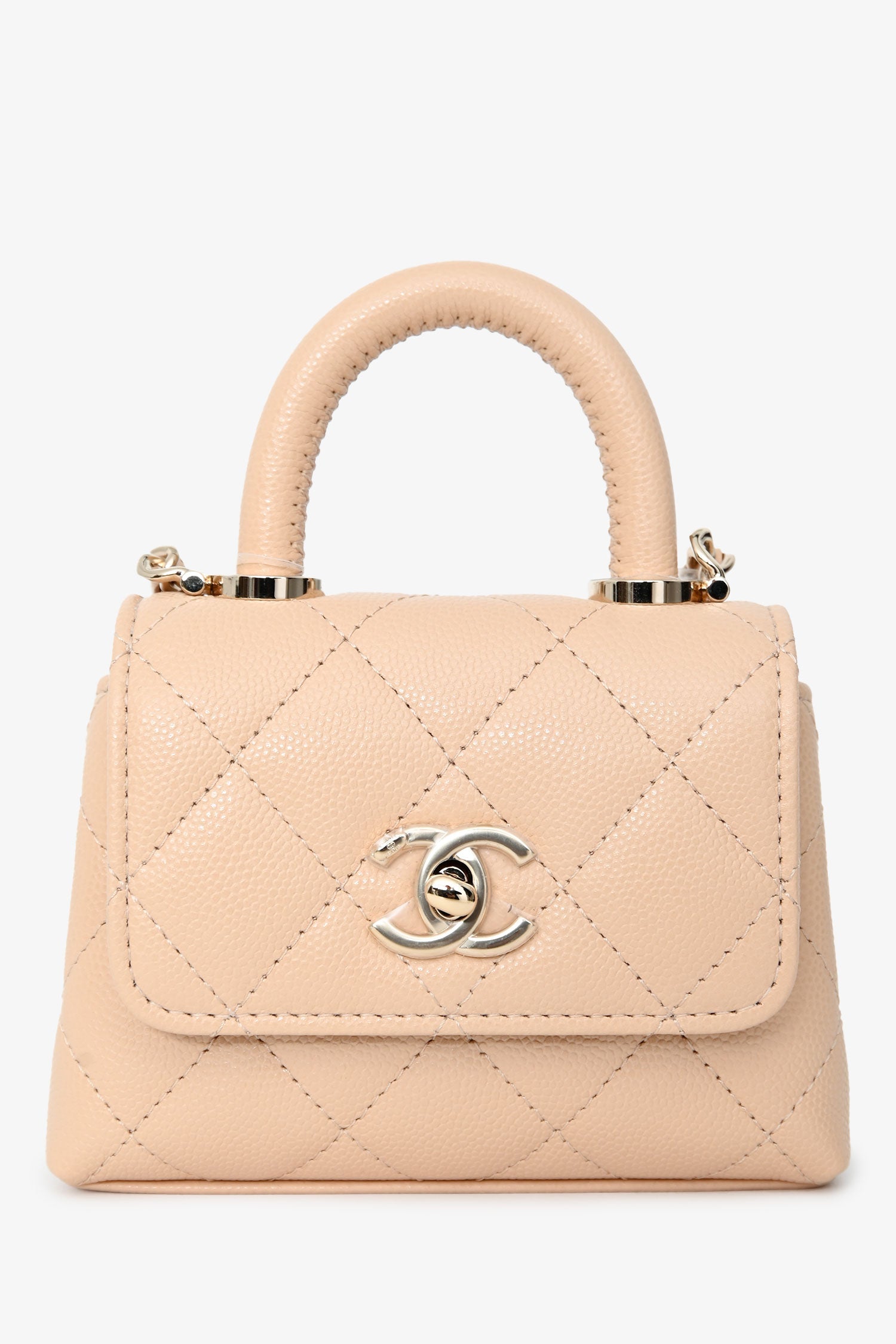 Pre-Loved Chanel™ Beige Caviar Leather Micro Coco Top Handle Bag with Chain. Front fold-over flap with turn-lock closure. Top handle. Features a crossbody chain-link strap. Single interior compartment. 2 wall slip pockets. Leather-lined. Gold-tone hardware. Tonal stitching.