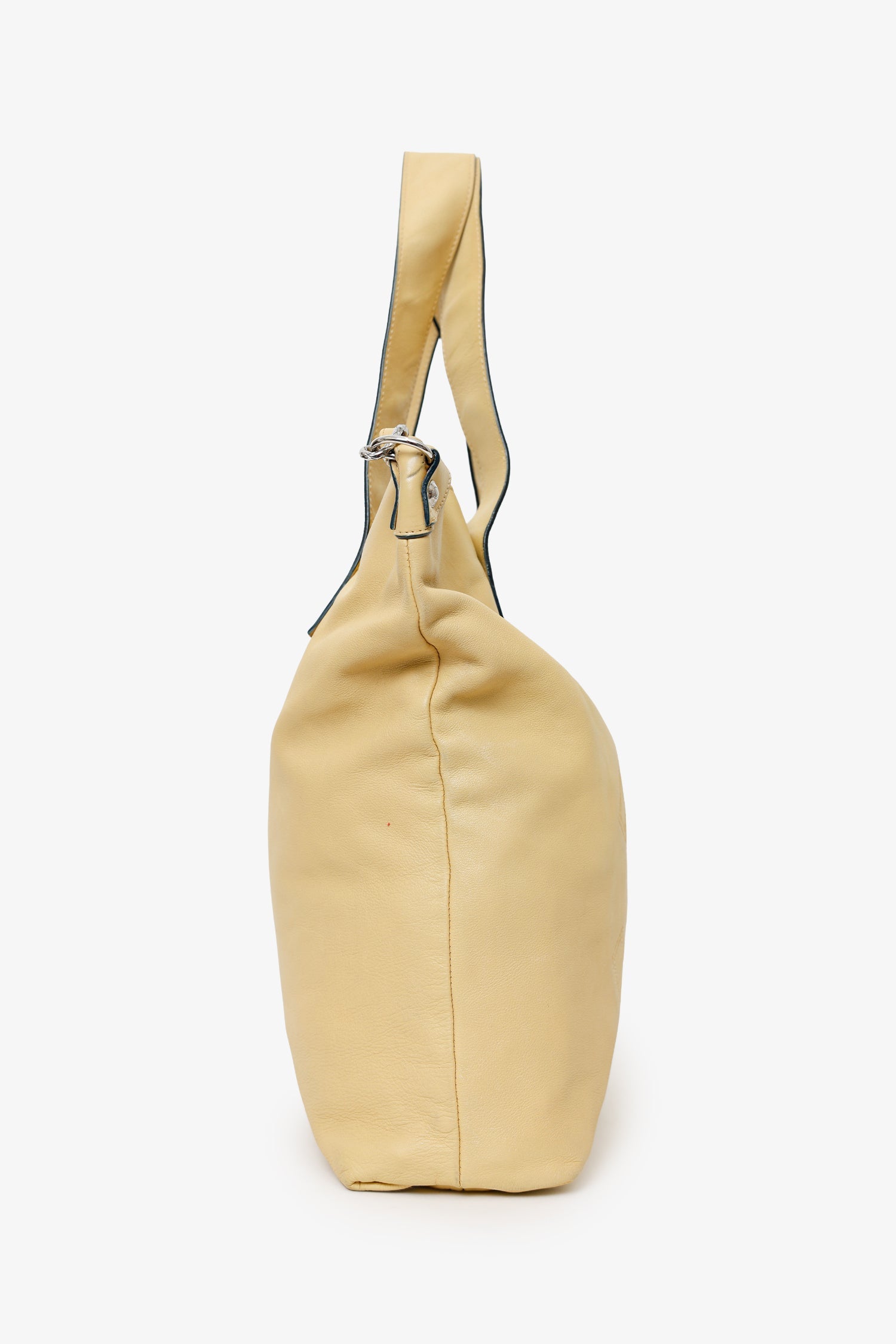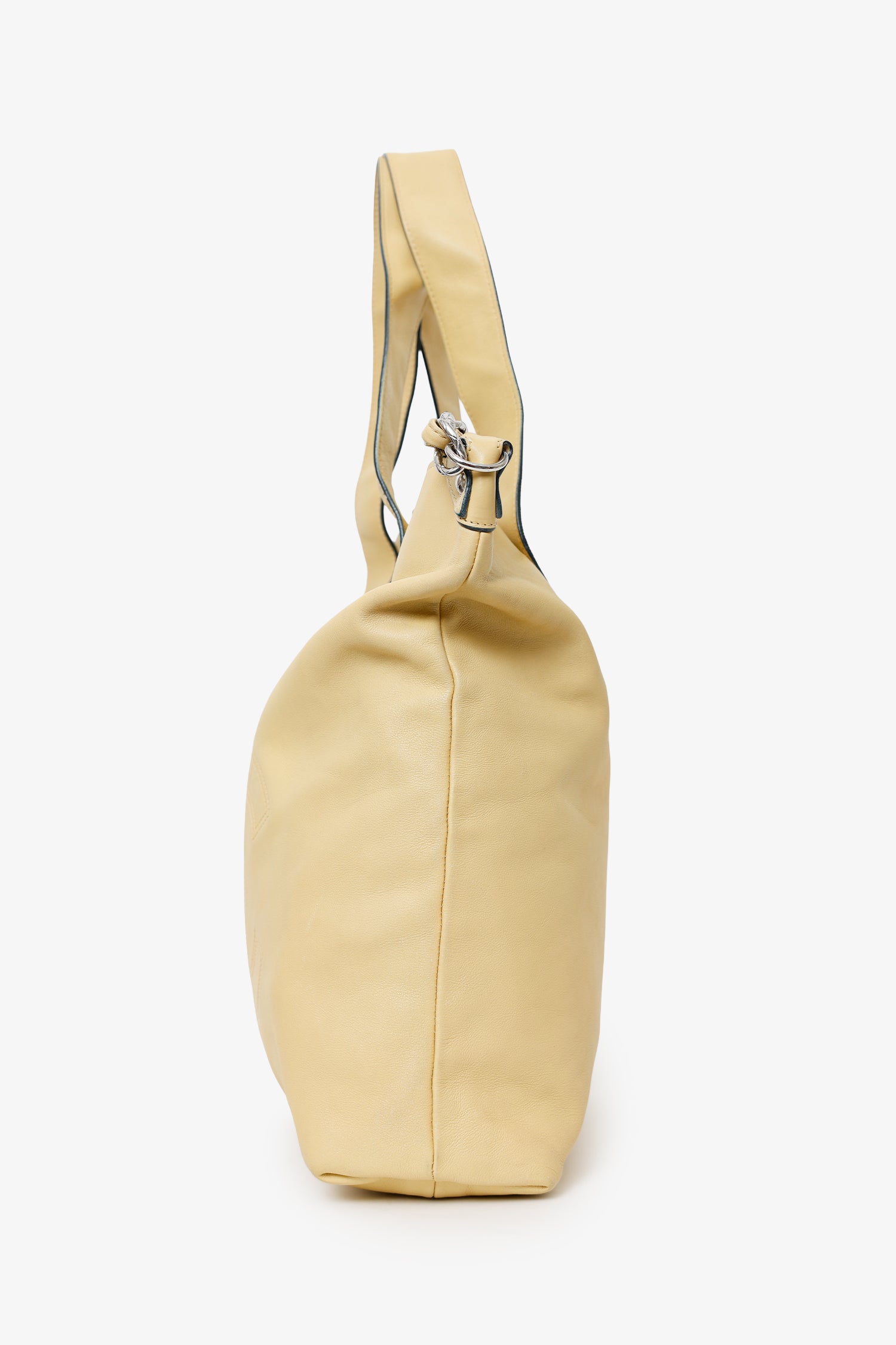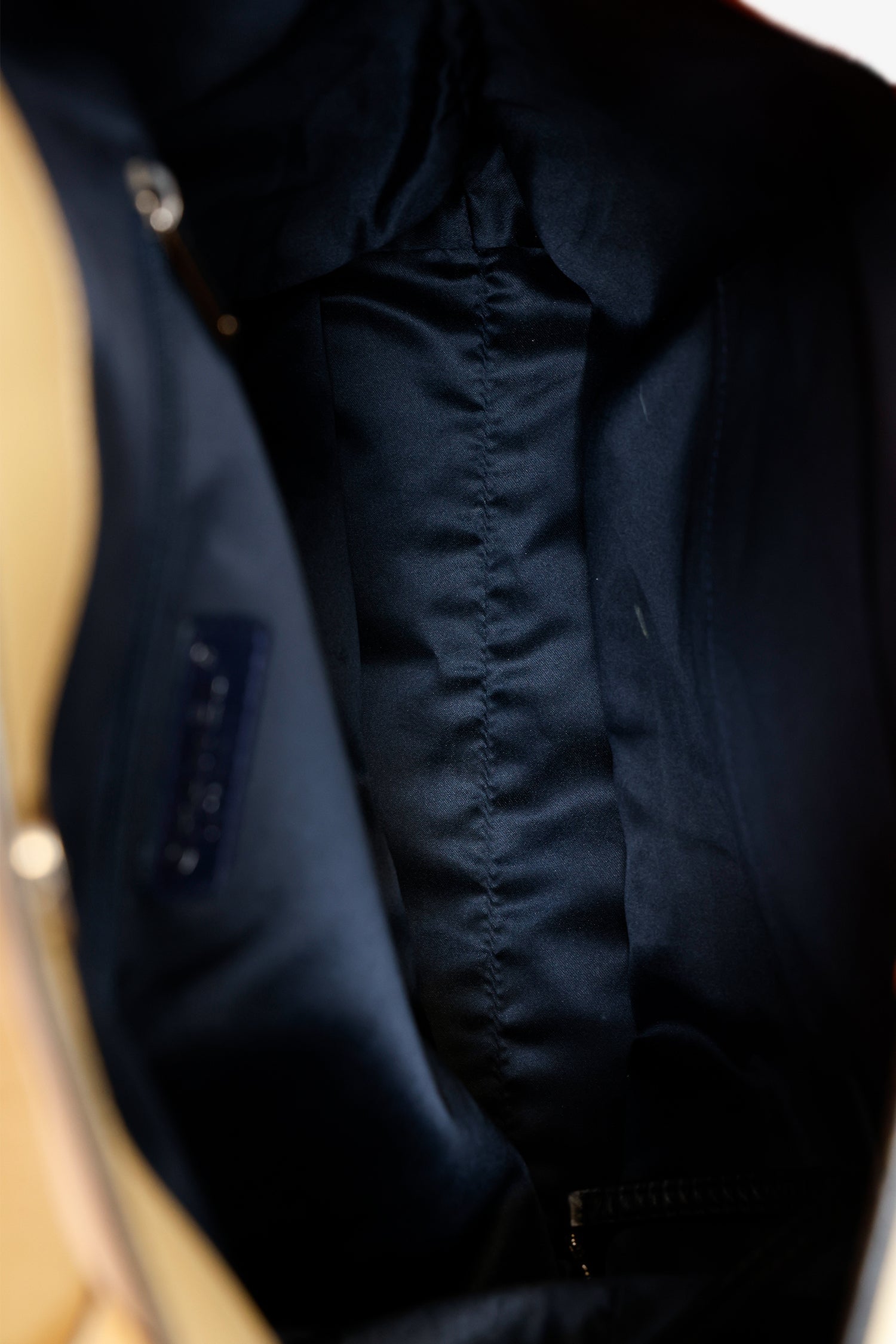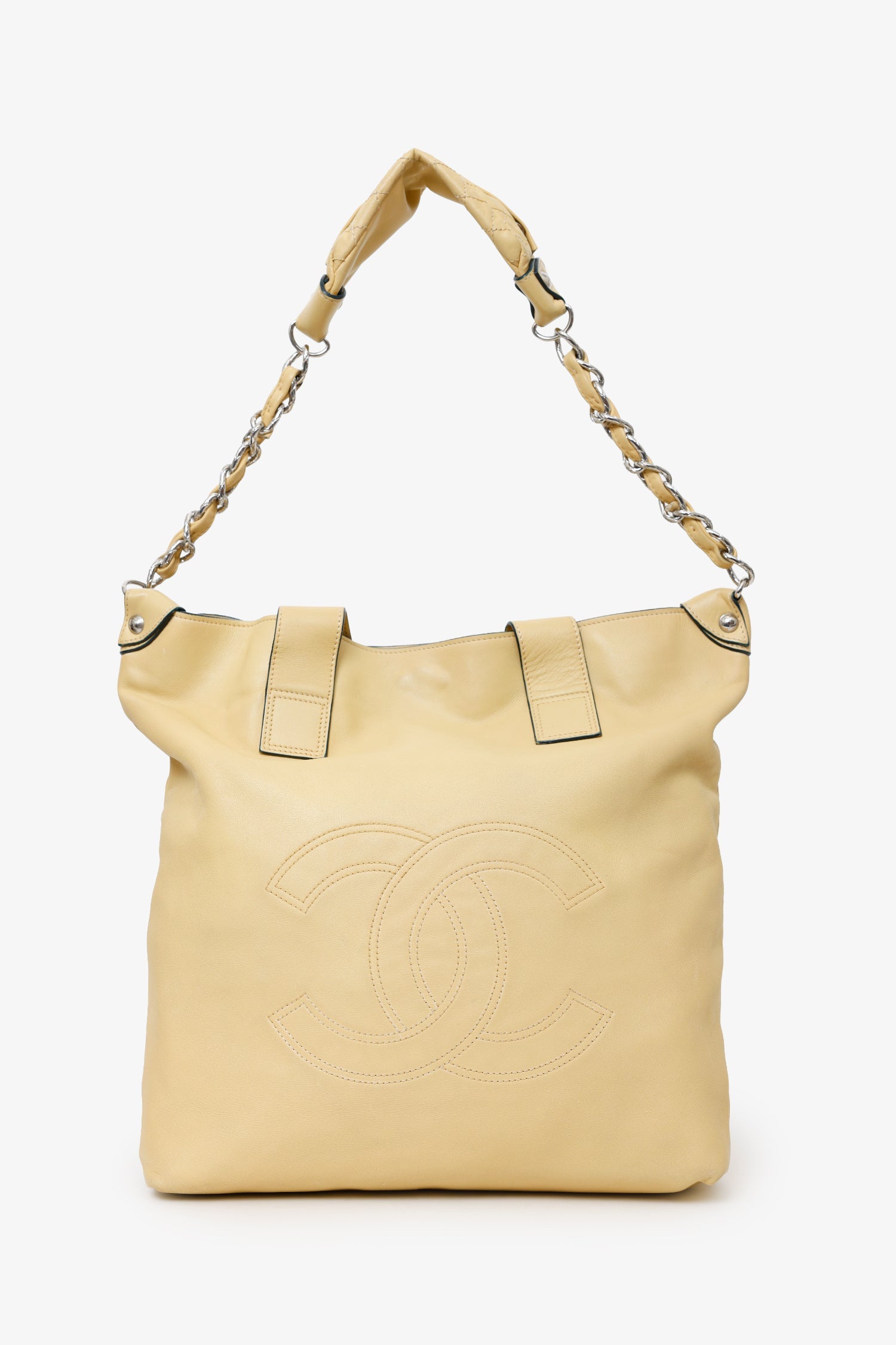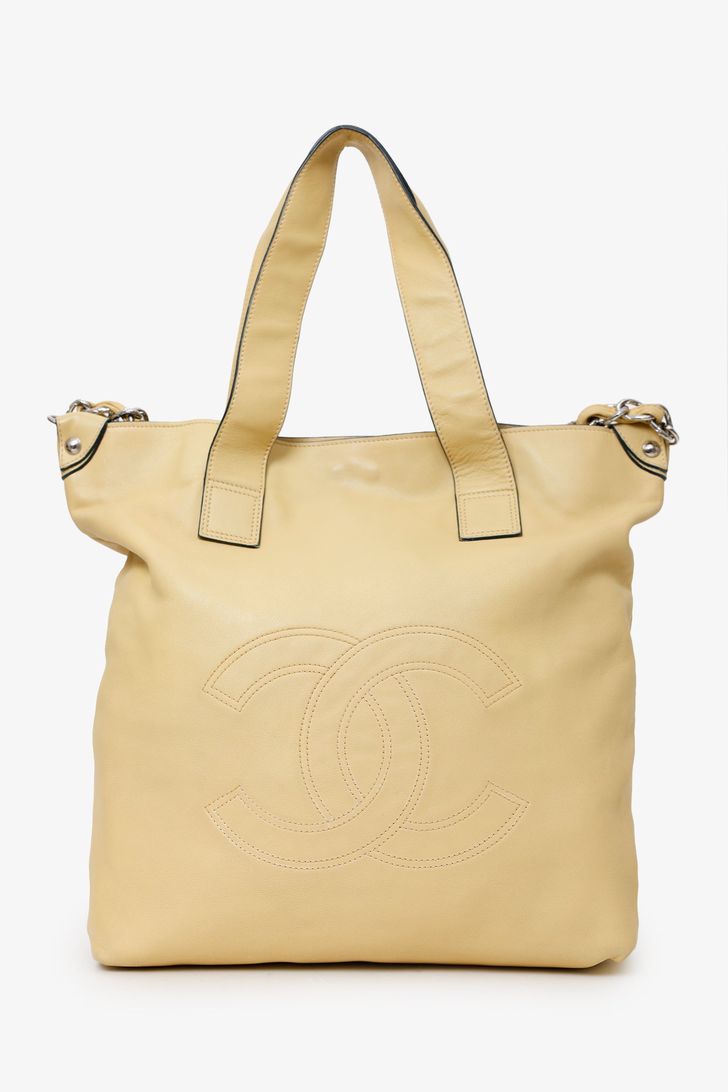 Pre-Loved Chanel™ Beige Lambskin Large Edgy Tote Bag. Interior snap-button-up closure. Twin top handles. Shoulder strap with protector and zip-up pocket. Lined interior with 2 pockets; 1 zip, and 1 slip. Silver-tone hardware. Tonal stitching.