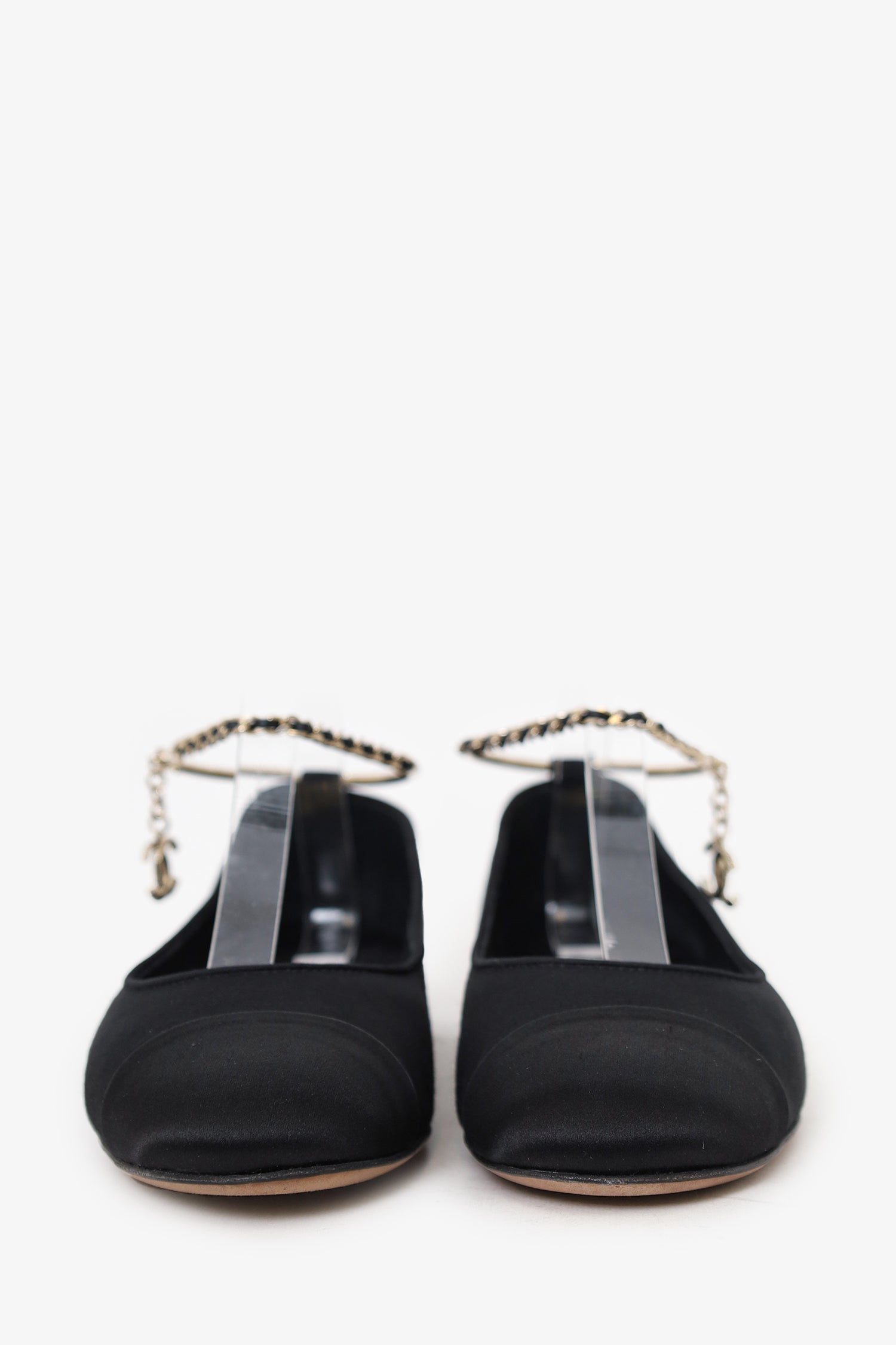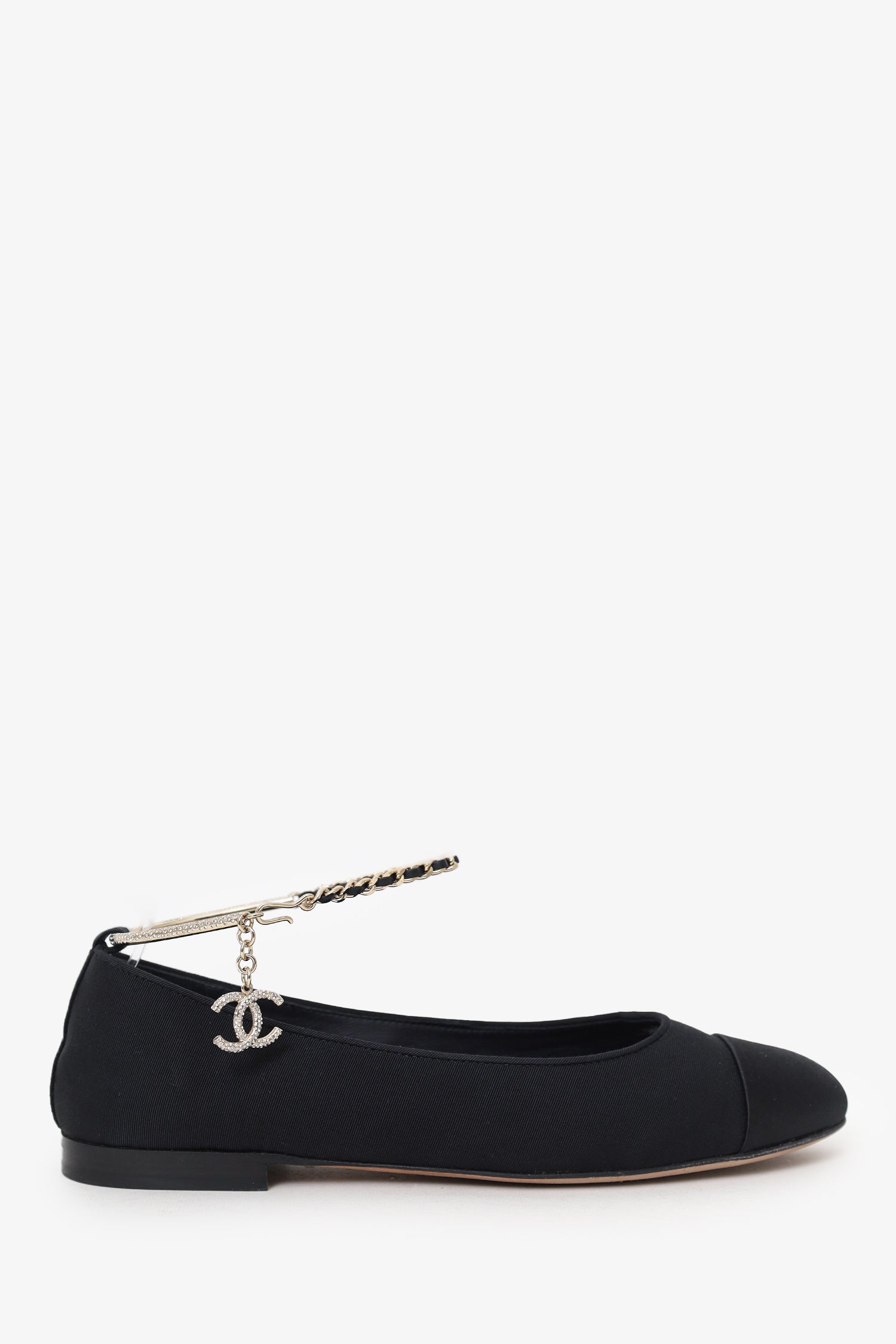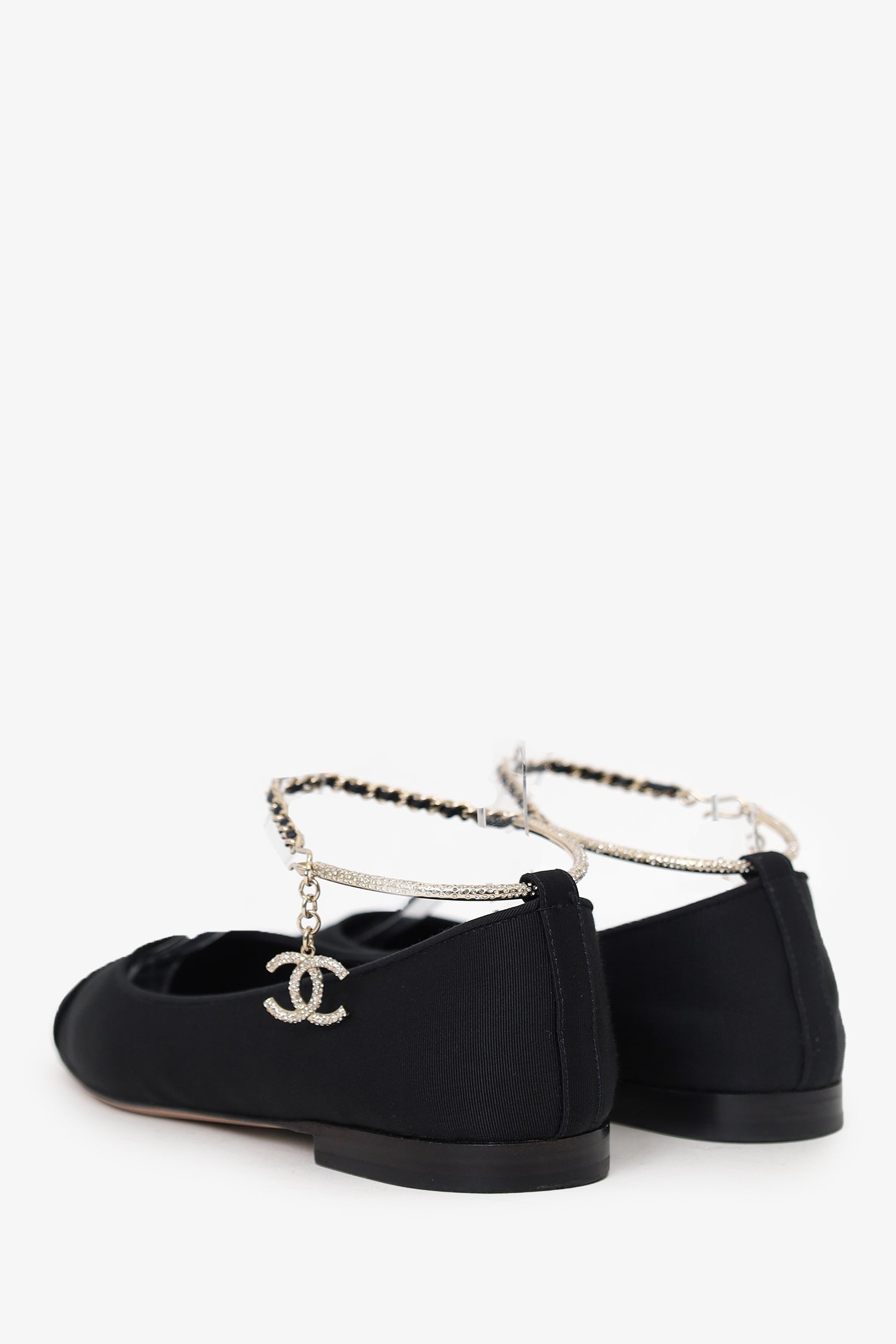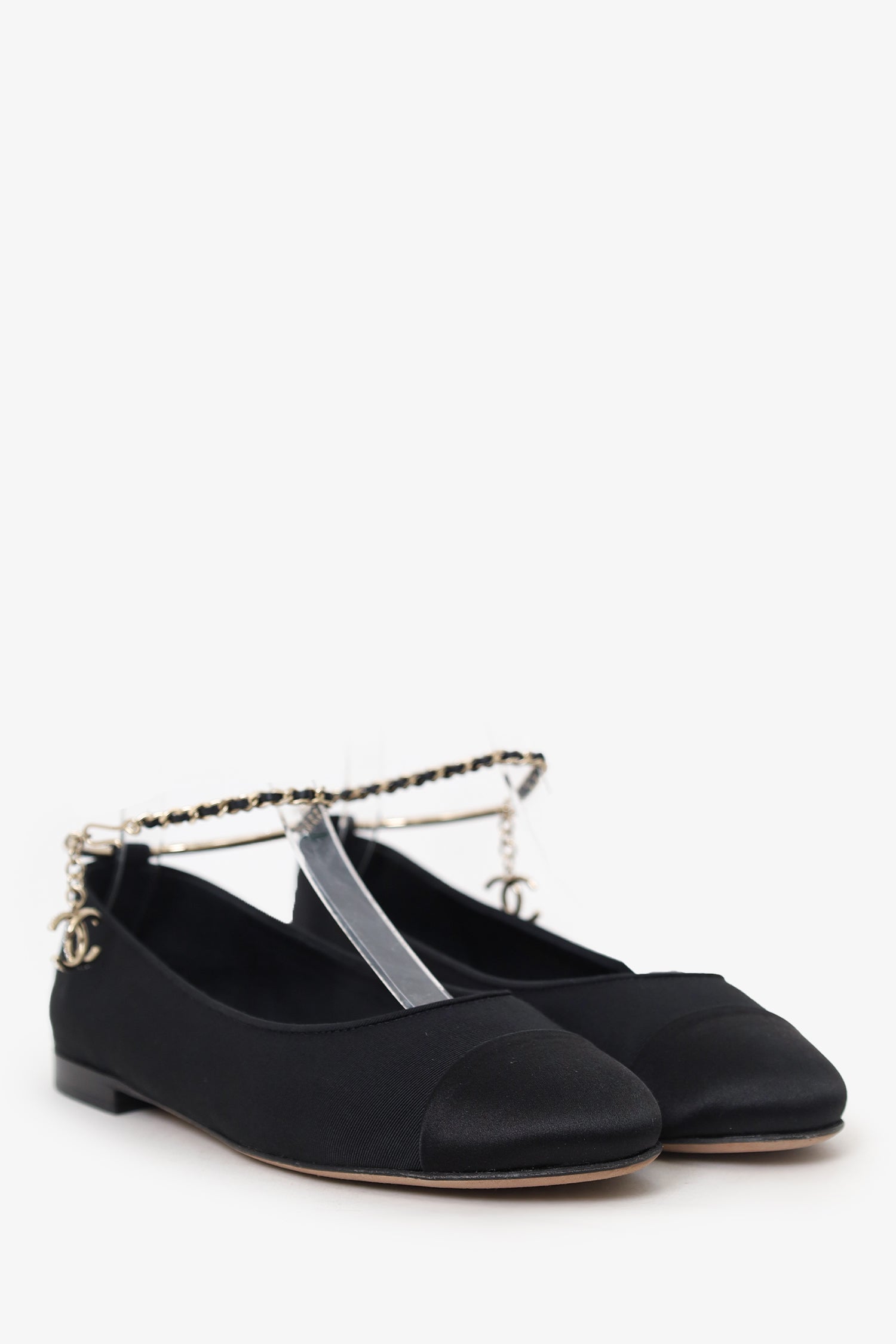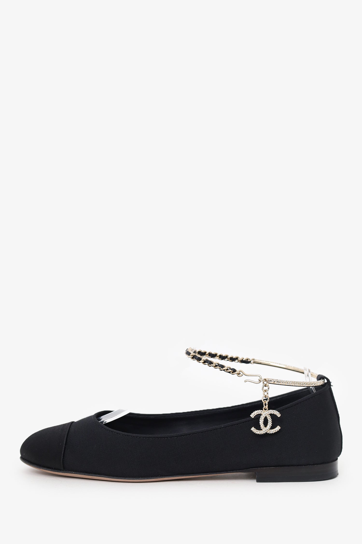 Pre-Loved Chanel™ Black Cap Toe Ankle 'CC' Chain Strap Ballet Flats Size 37