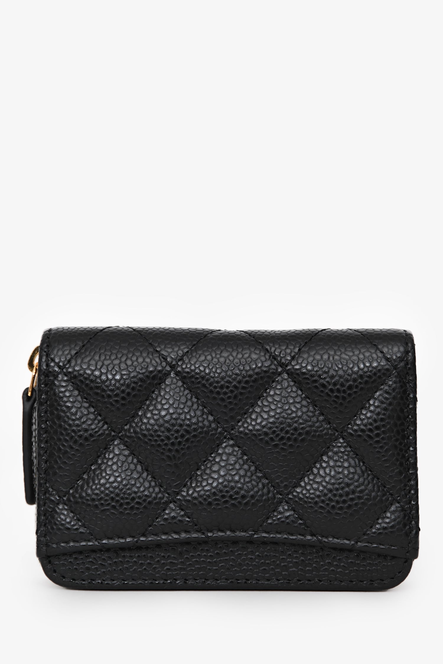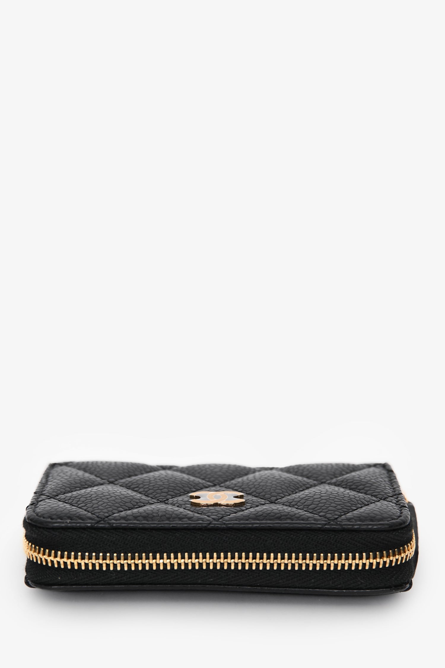 Pre-Loved Chanel™ Black Caviar Leather CC Zip Wallet. Top zip closure. Single exterior wall slip pocket. 3 interior compartments. Fabric-lined interior. Gold-tone hardware. Tonal stitching.