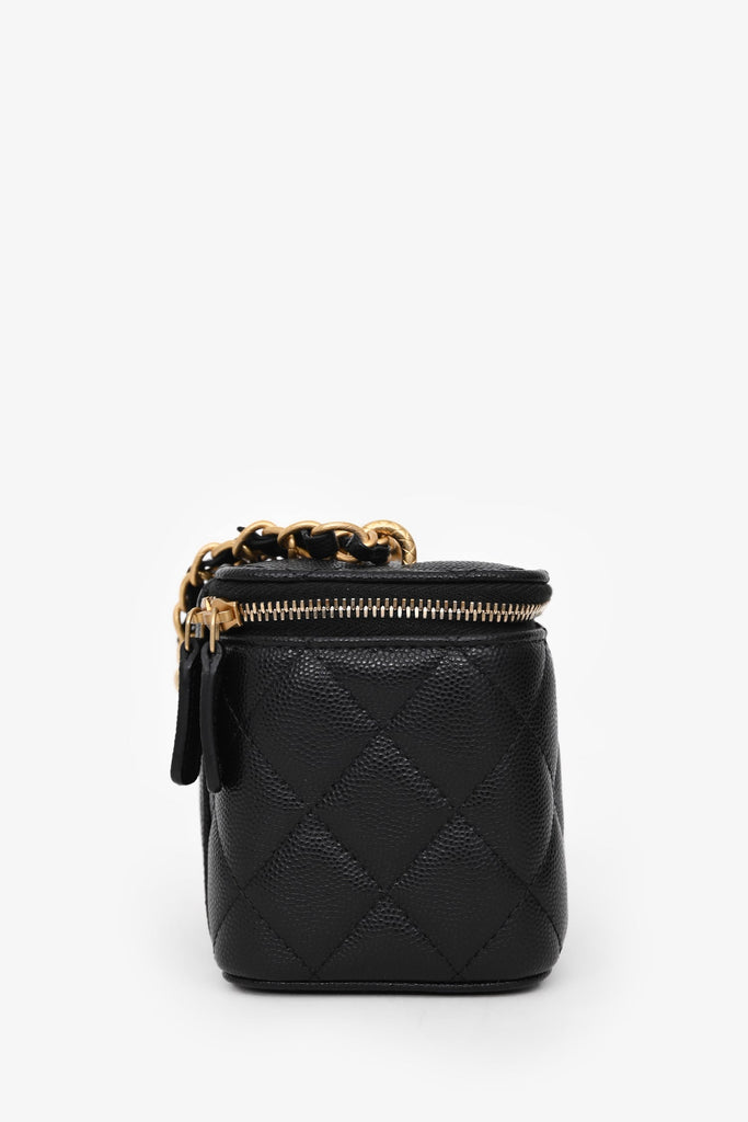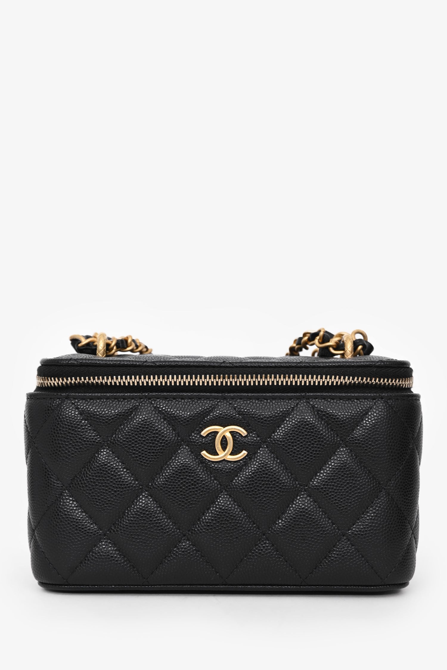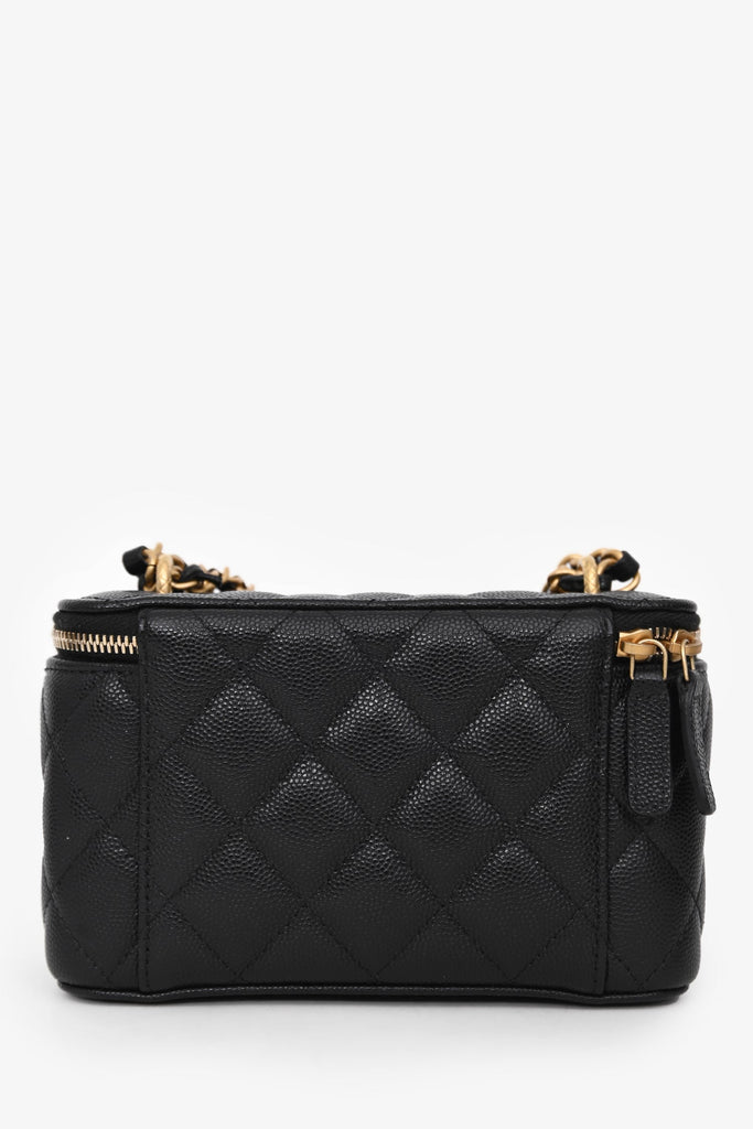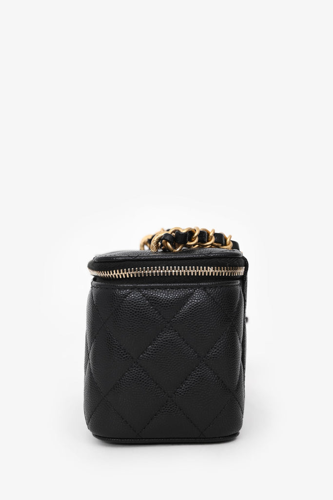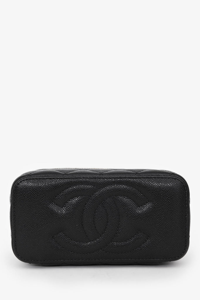 Pre-Loved Chanel™ Black Caviar Leather Vanity Crossbody. Top fold-over flap with a zip closure. Chain-link and leather crossbody strap with an attached pouch. Leather lined interior. Single pen pocket and 3 interior card slots. Gold-tone hardware. Tonal stitching. Inclusions: mirror.
