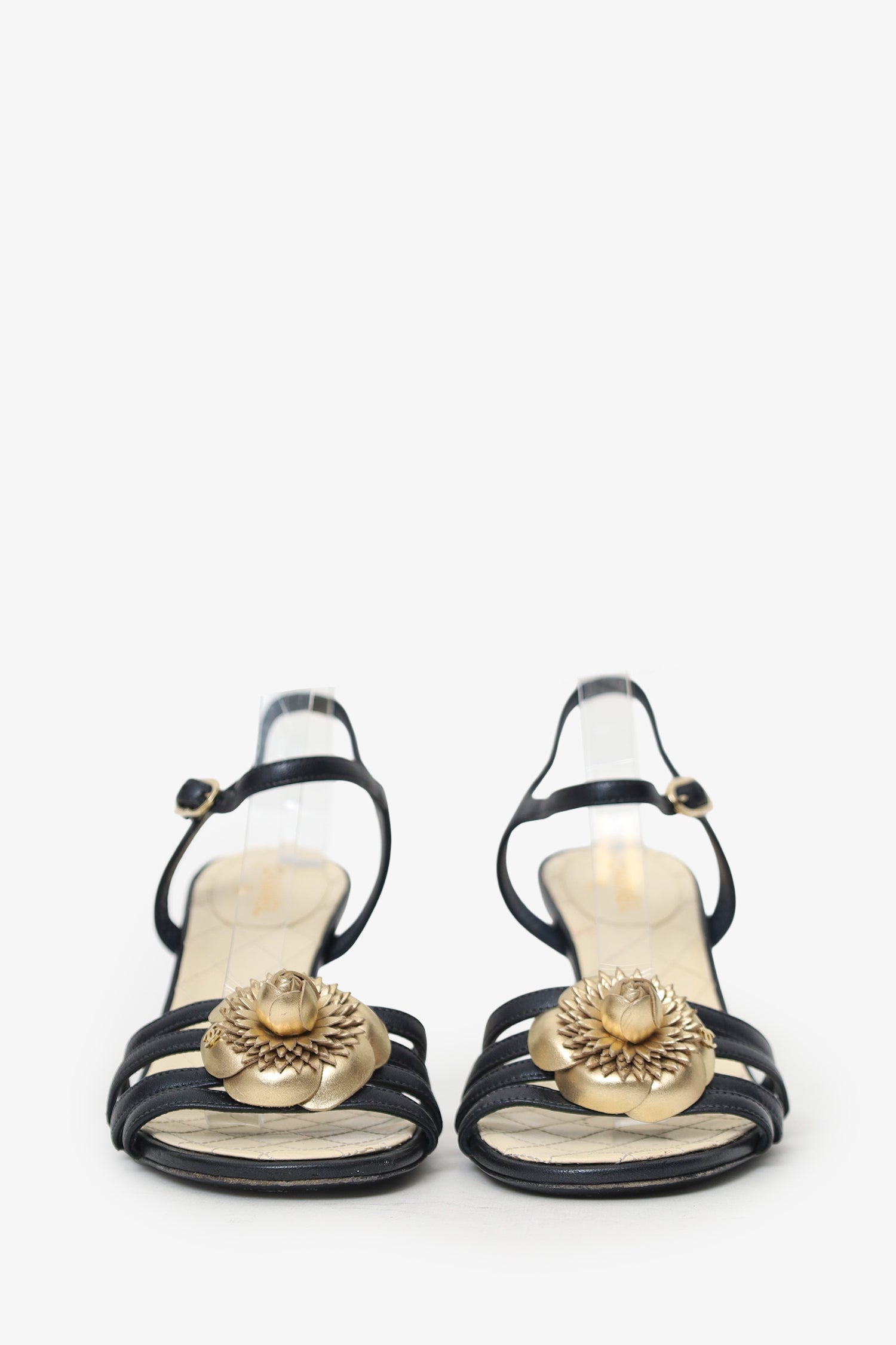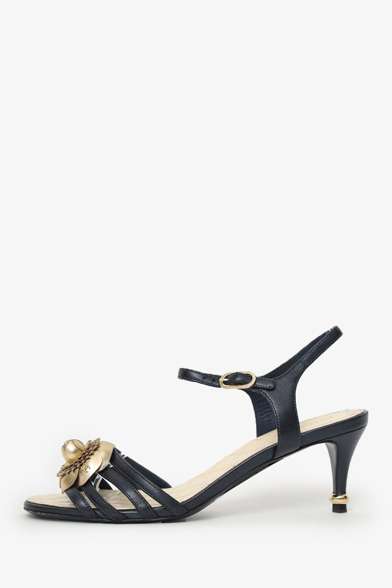Pre-Loved Chanel™ Black Leather Camellia Applique Ankle Strap Sandals. Slip-on. Open-pointed toe. Ankle strap with adjustable buckle closure. Gold-tone hardware. Tonal stitching.