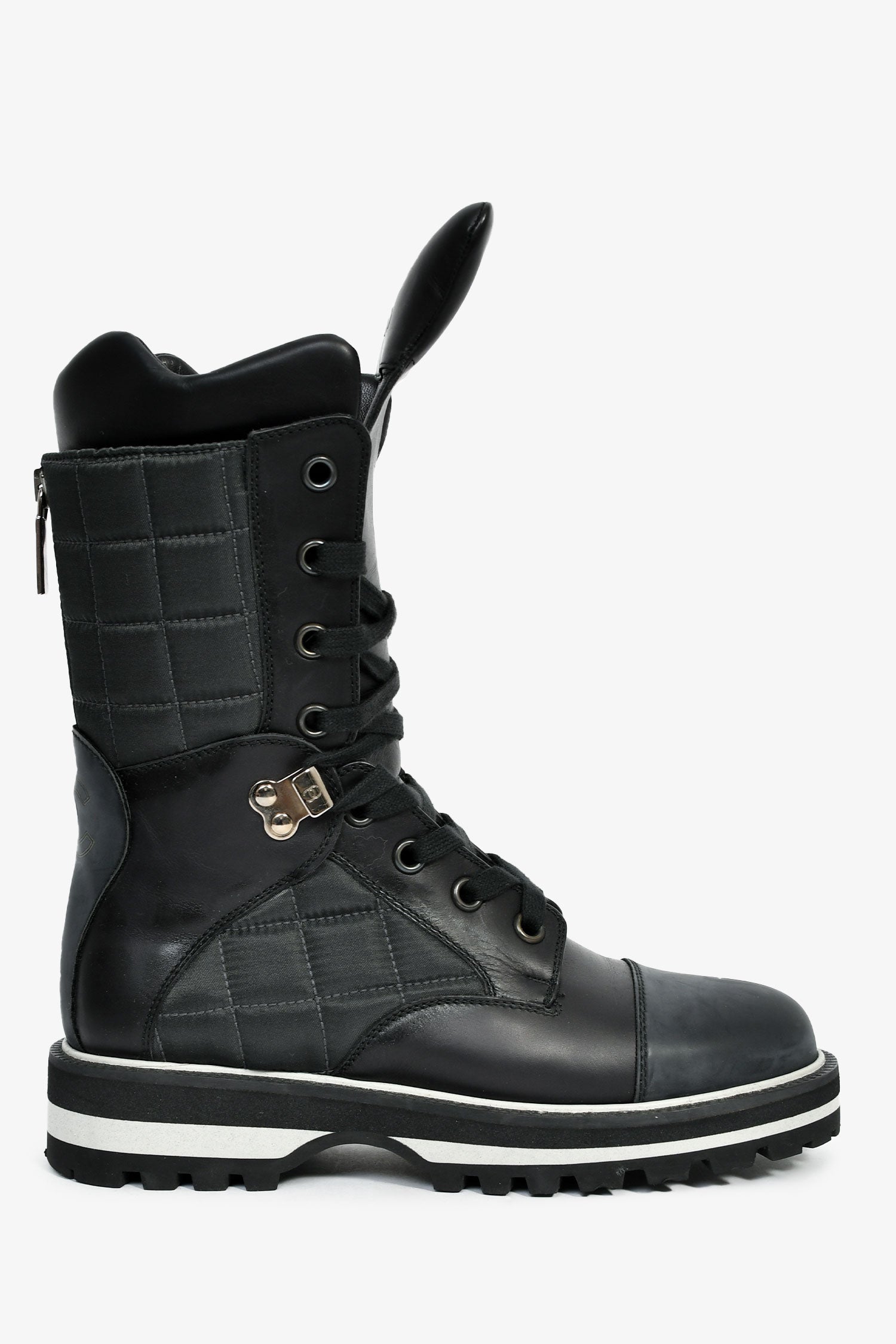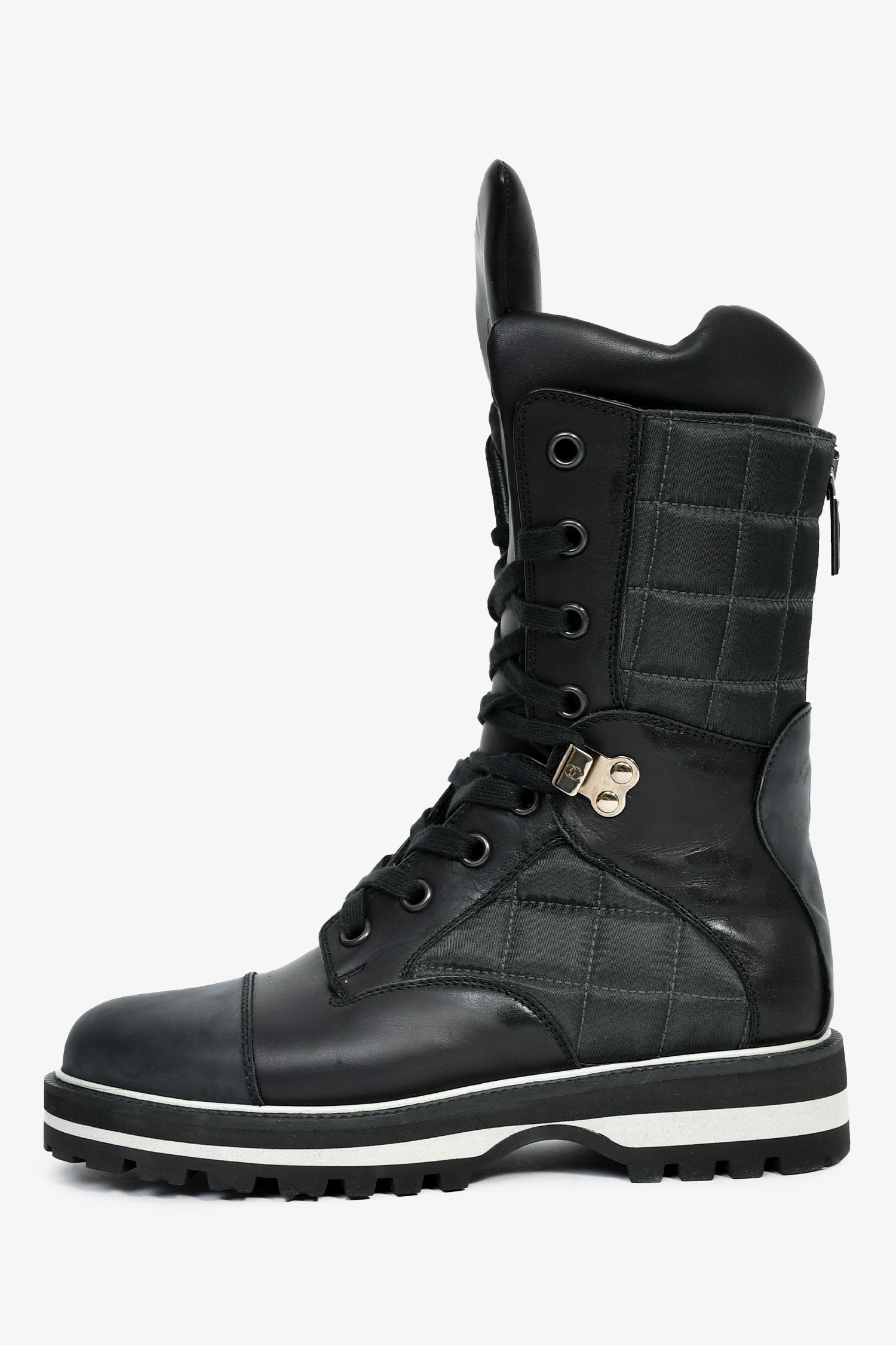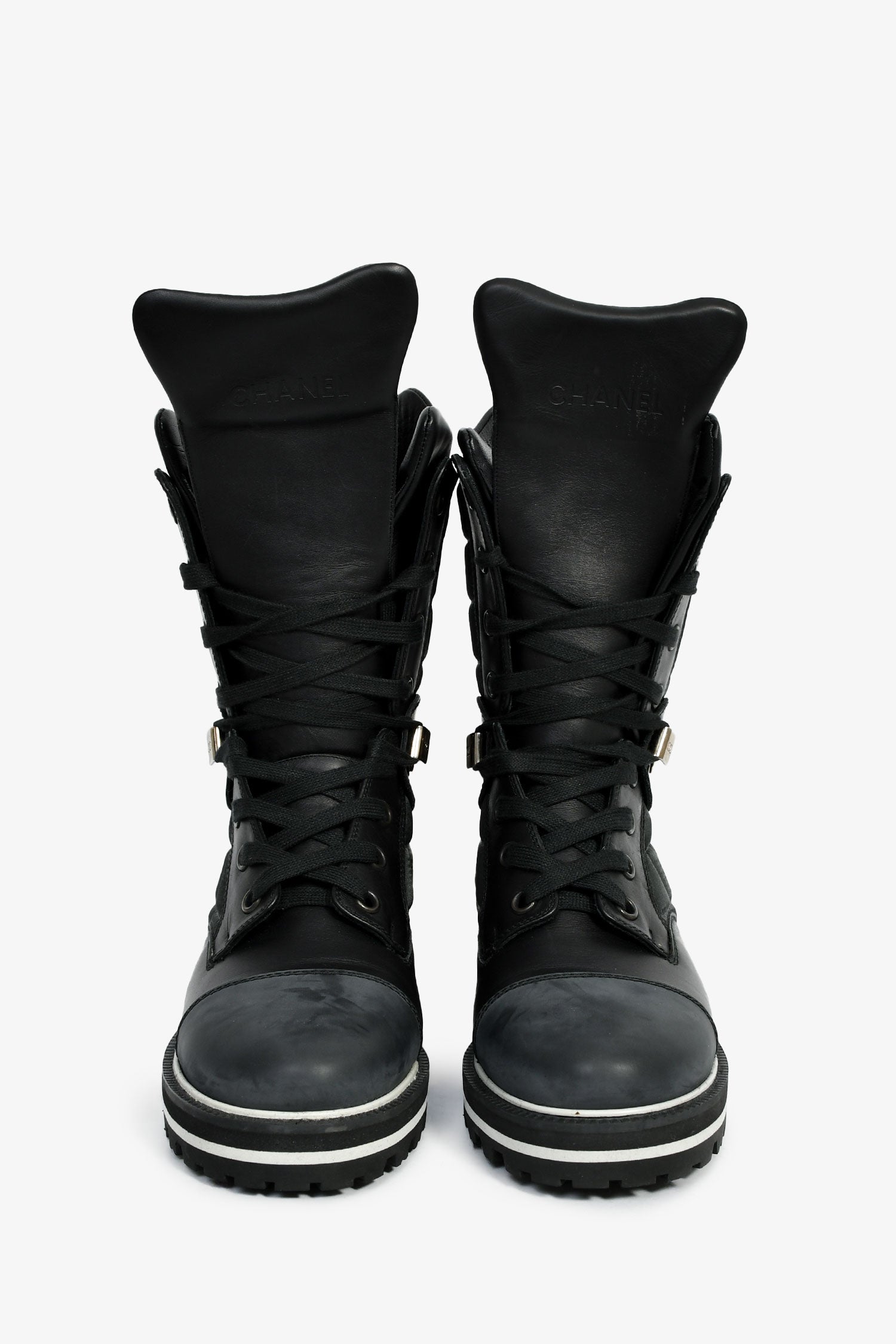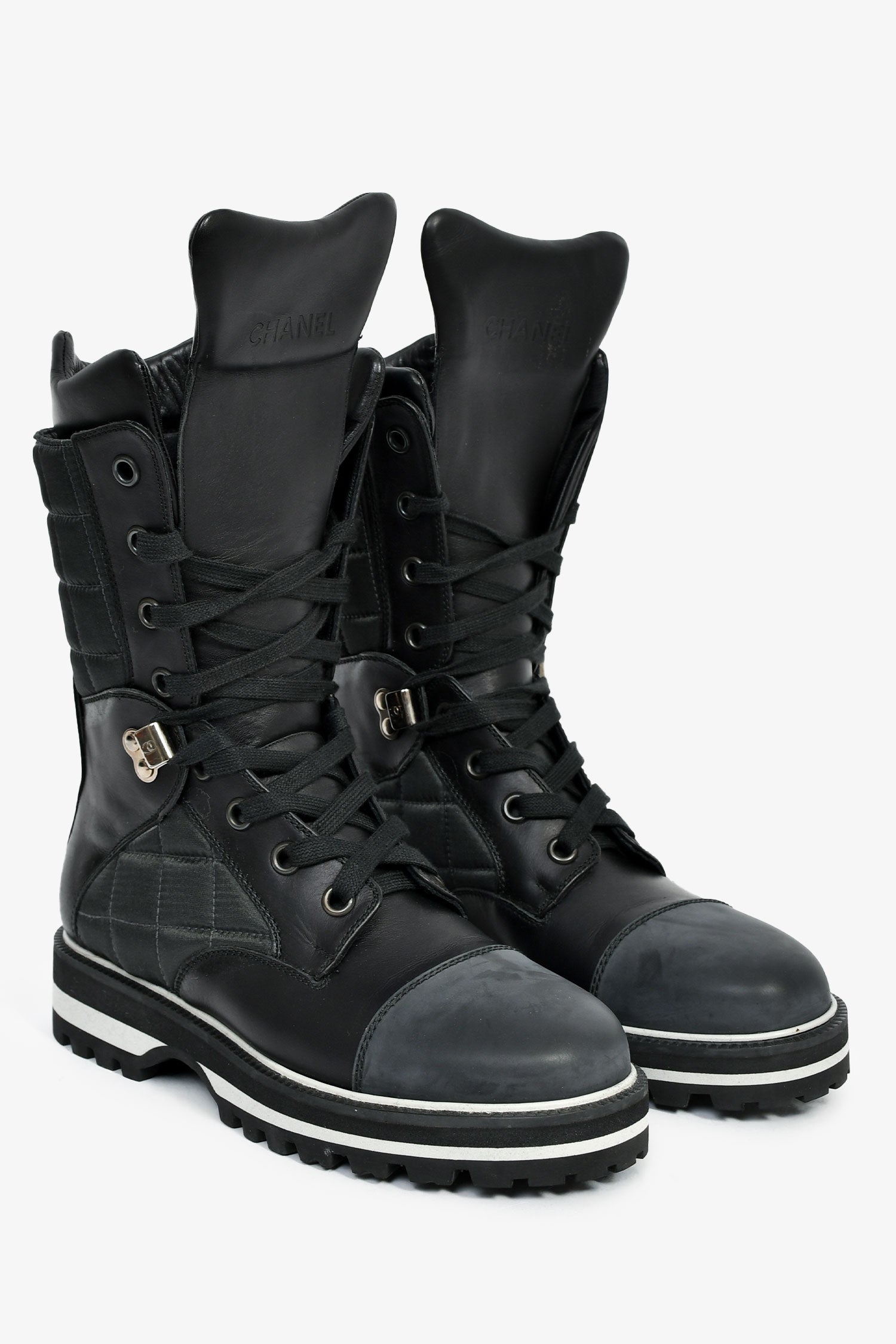 Pre-Loved Chanel™ Black Leather CC Logo Combat Boots. Pull-on. Round toe. Lace-up closure. Silver-tone hardware. Tonal stitching.