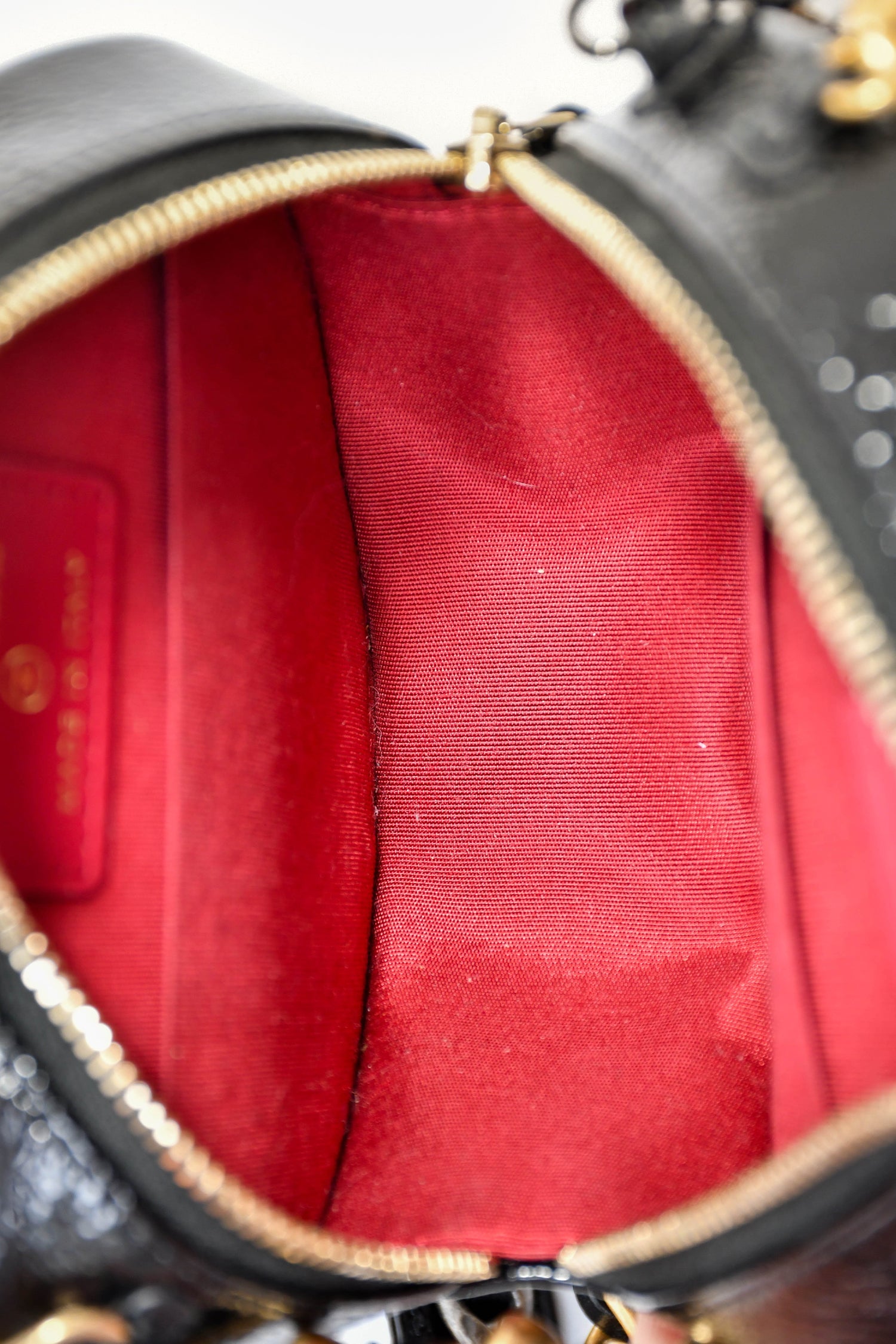 Pre-Loved Chanel™ Black Leather Quilted 19 Round Crossbody Bag. Top zip closure. Lined interior. 2 interior wall slip pockets. Gold and silver-tone hardware. Tonal stitching.