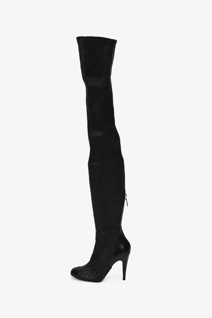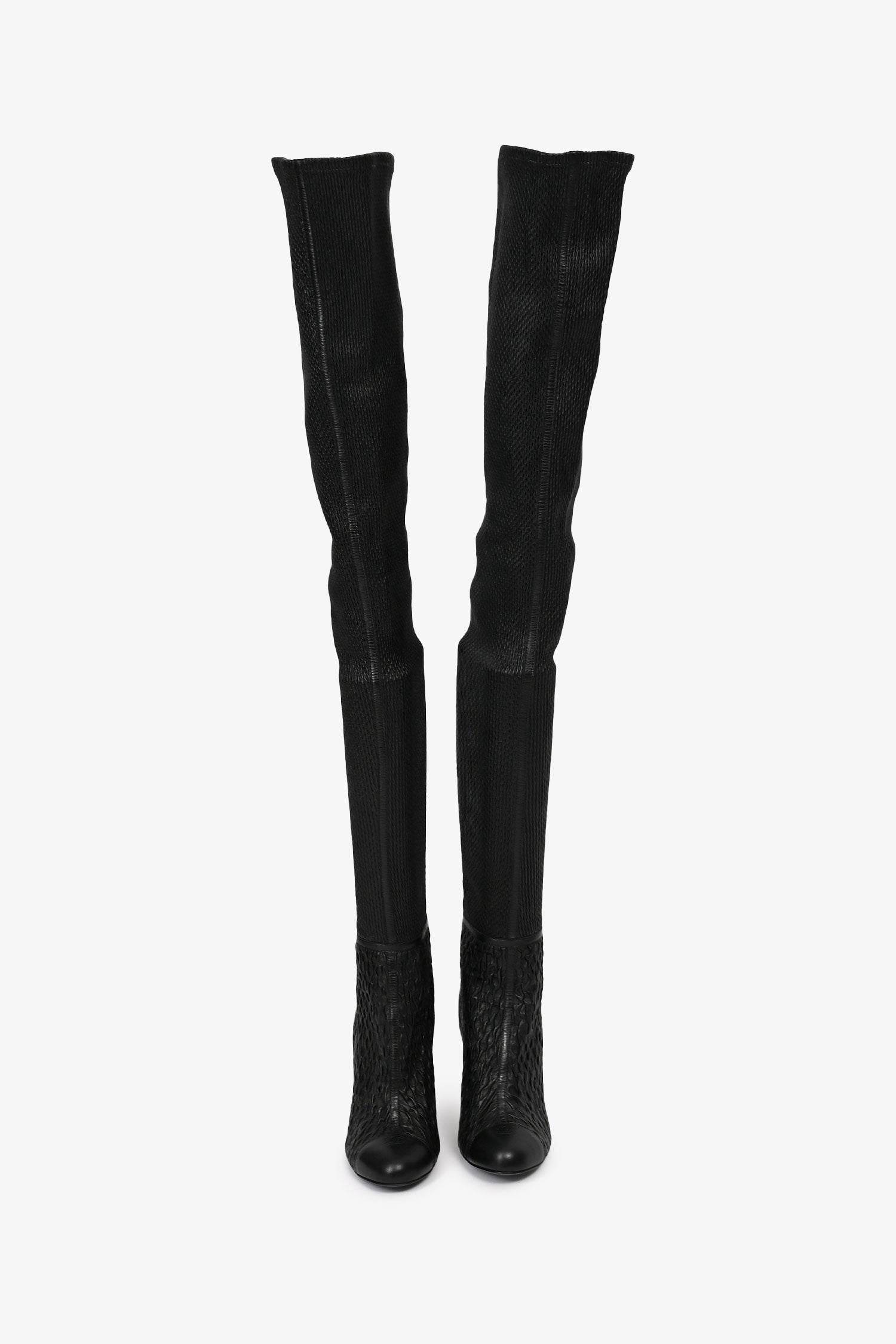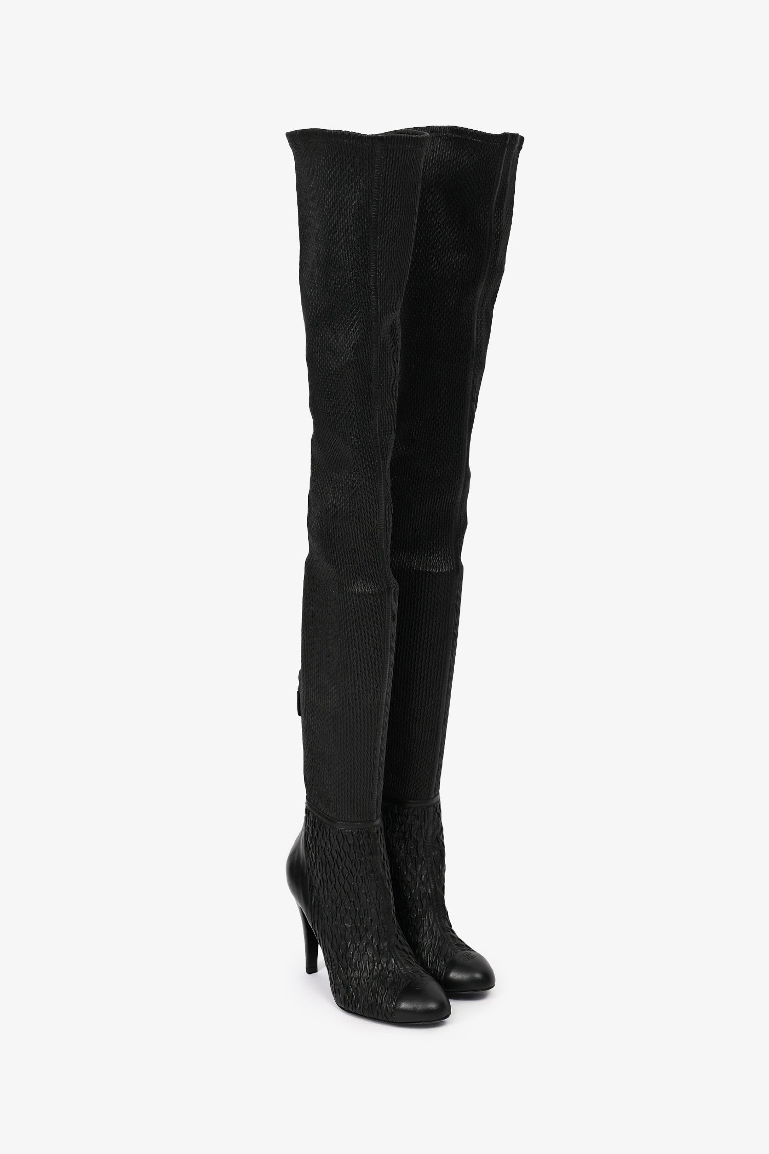 Pre-Loved Chanel™ Black Leather Texture Thigh High Boots Size 38.5