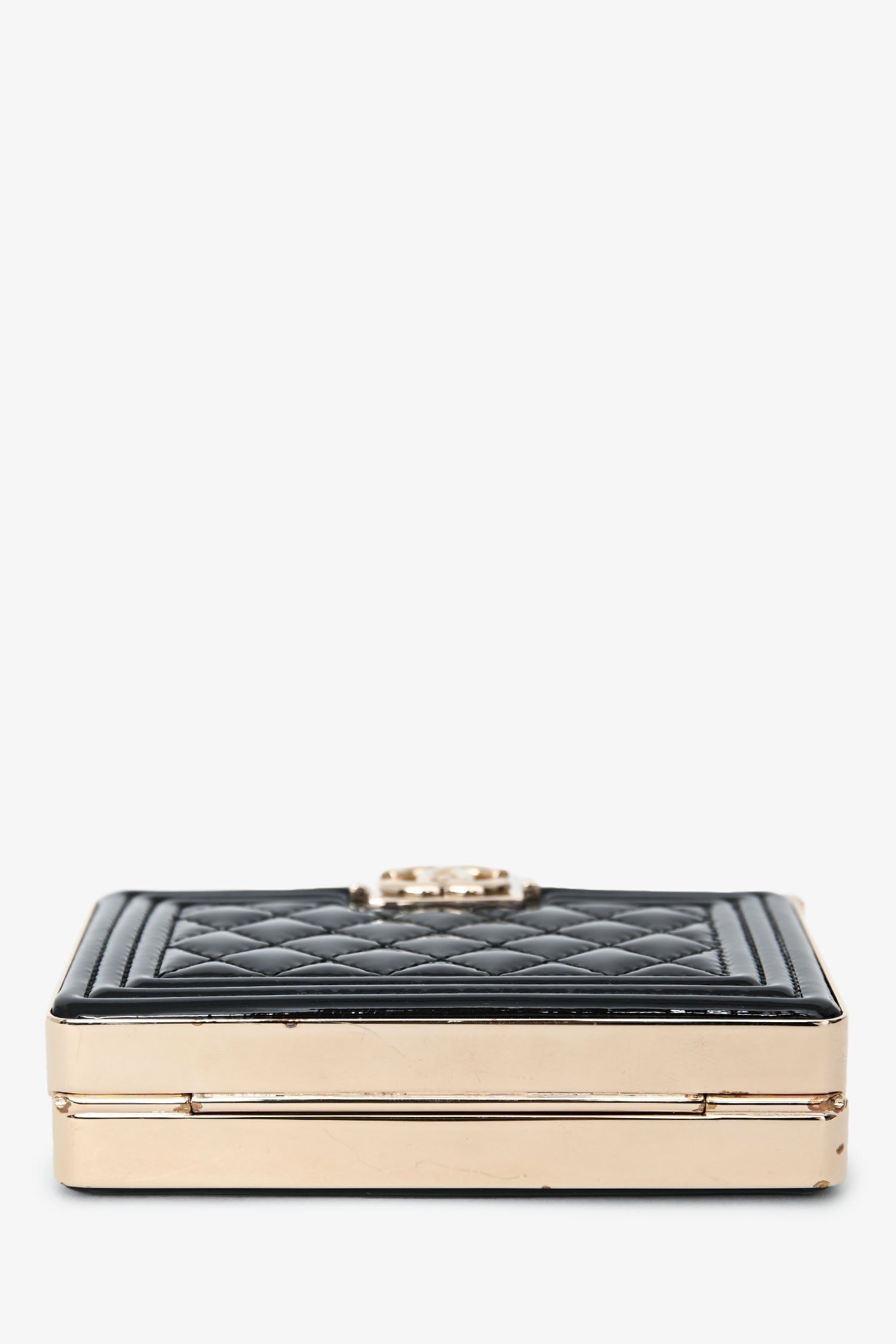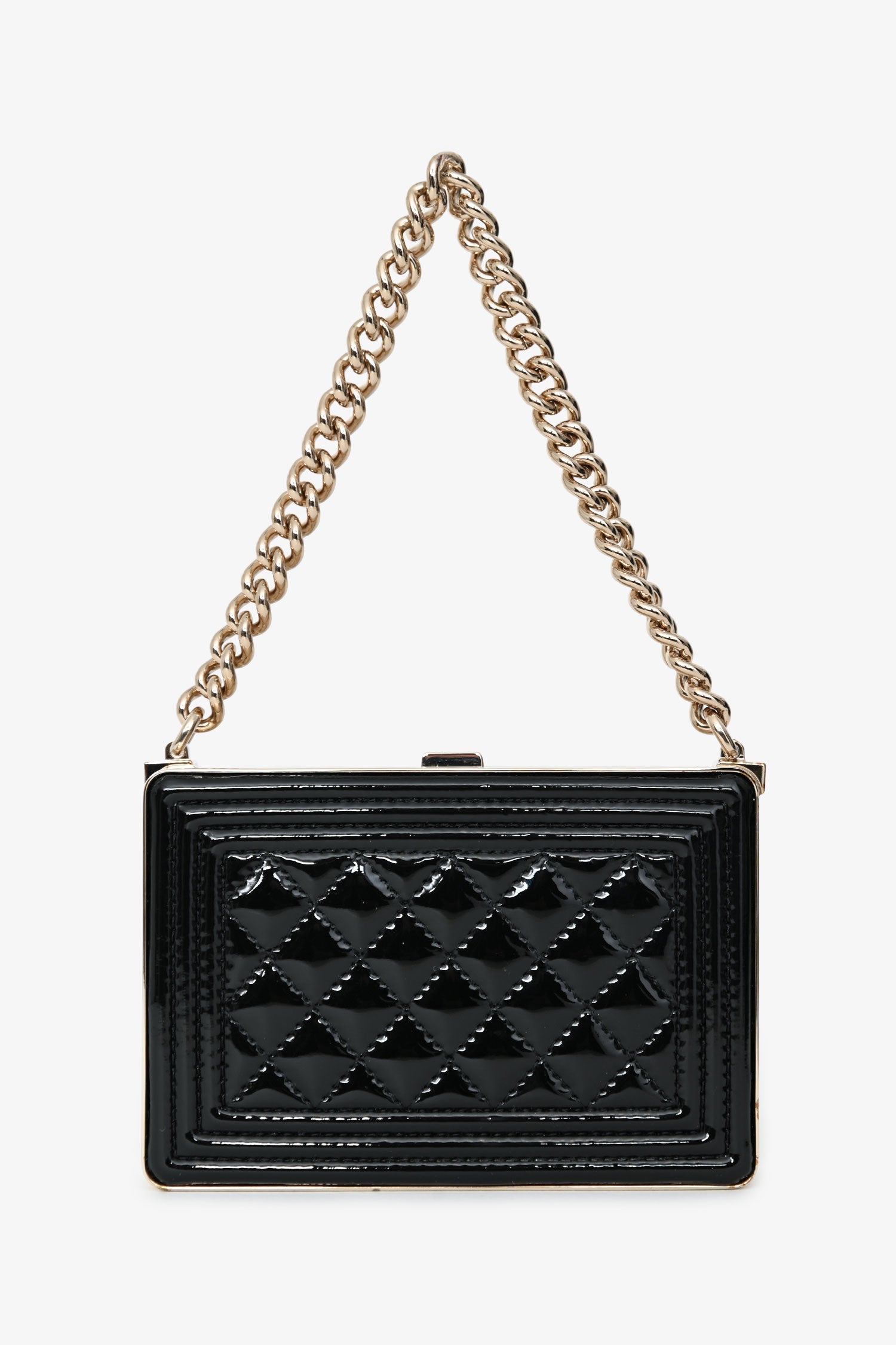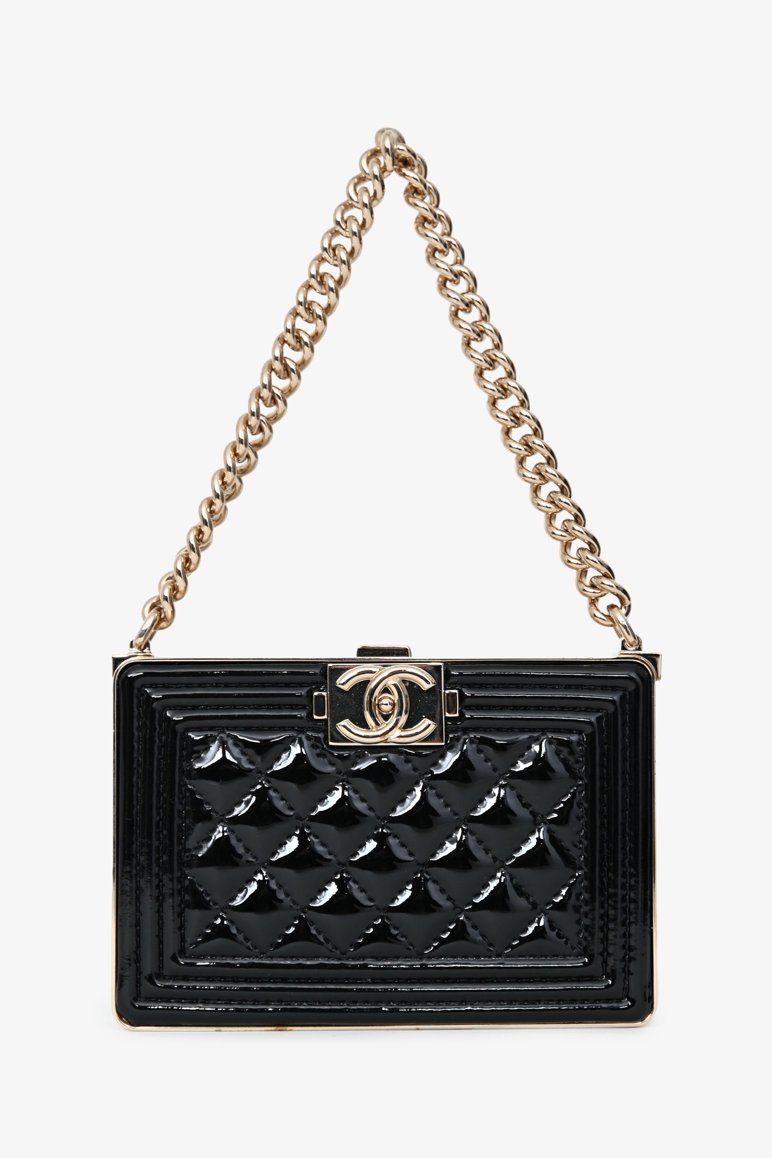 Pre-Loved Chanel™ Black Patent Calfskin 'Minaudiere' Chain Box Boy Bag. Top push-pin closure. Chain-link top handle. Single interior compartment with one card slot and built-in mirror. Leather-lined. Gold-tone hardware. Tonal stitching.