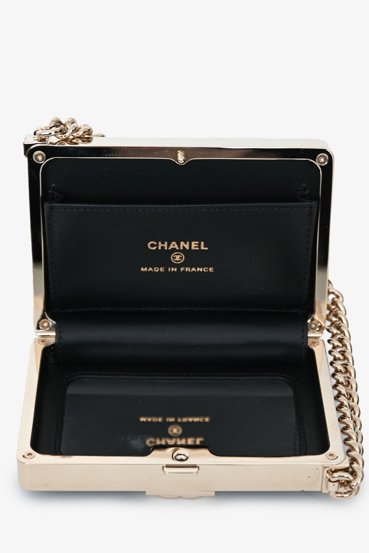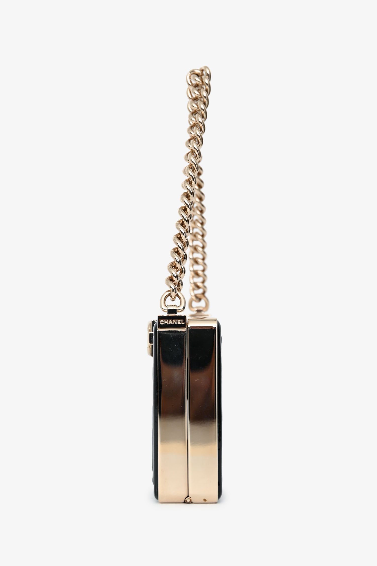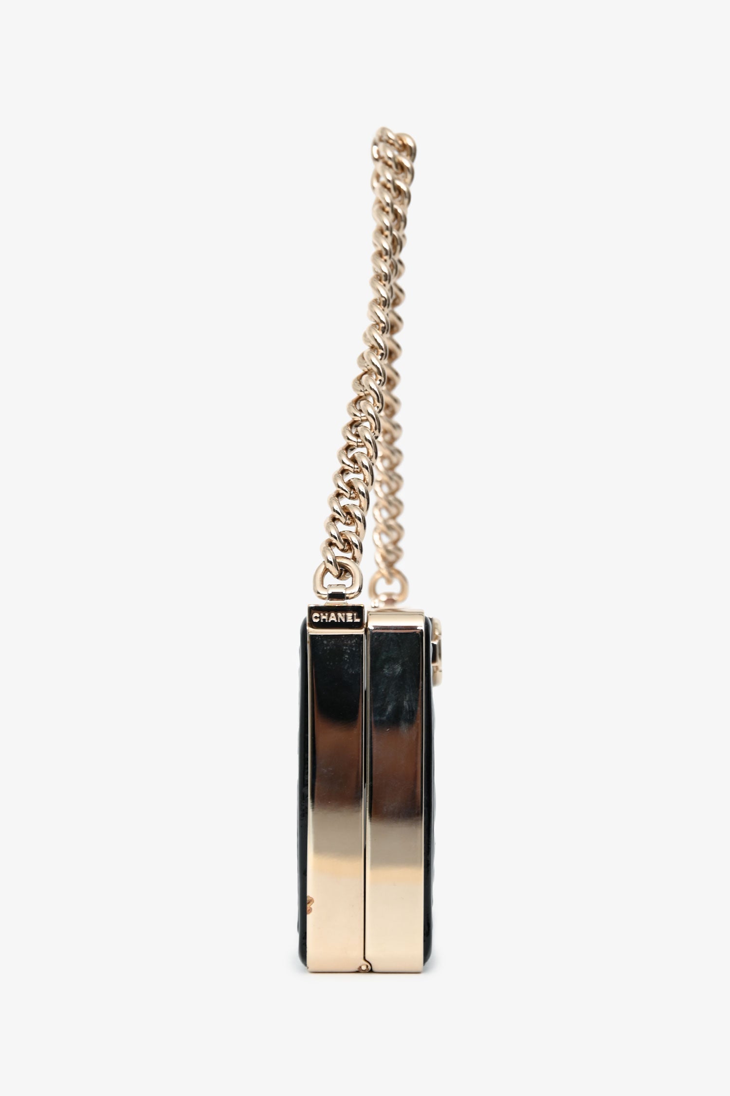 Pre-Loved Chanel™ Black Patent Calfskin 'Minaudiere' Chain Box Boy Bag. Top push-pin closure. Chain-link top handle. Single interior compartment with one card slot and built-in mirror. Leather-lined. Gold-tone hardware. Tonal stitching.