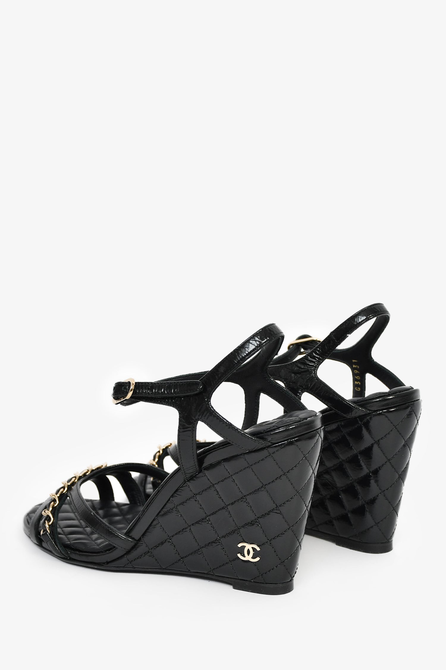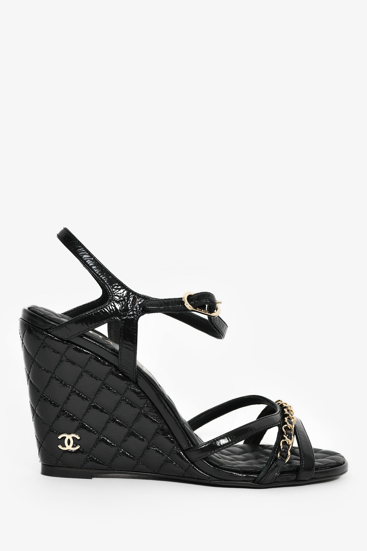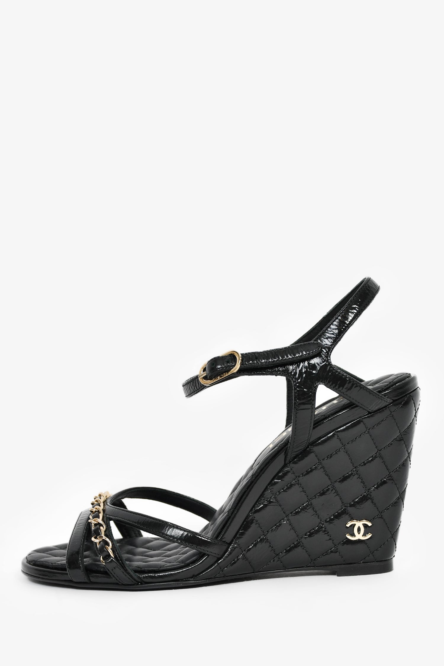 Pre-Loved Chanel™ Black Patent Quilted Chain Detail Wedge Heels. Ankle strap with buckle closure. Gold-tone hardware. Tonal stitching.