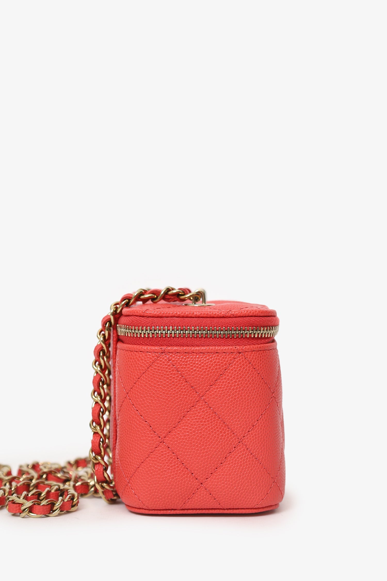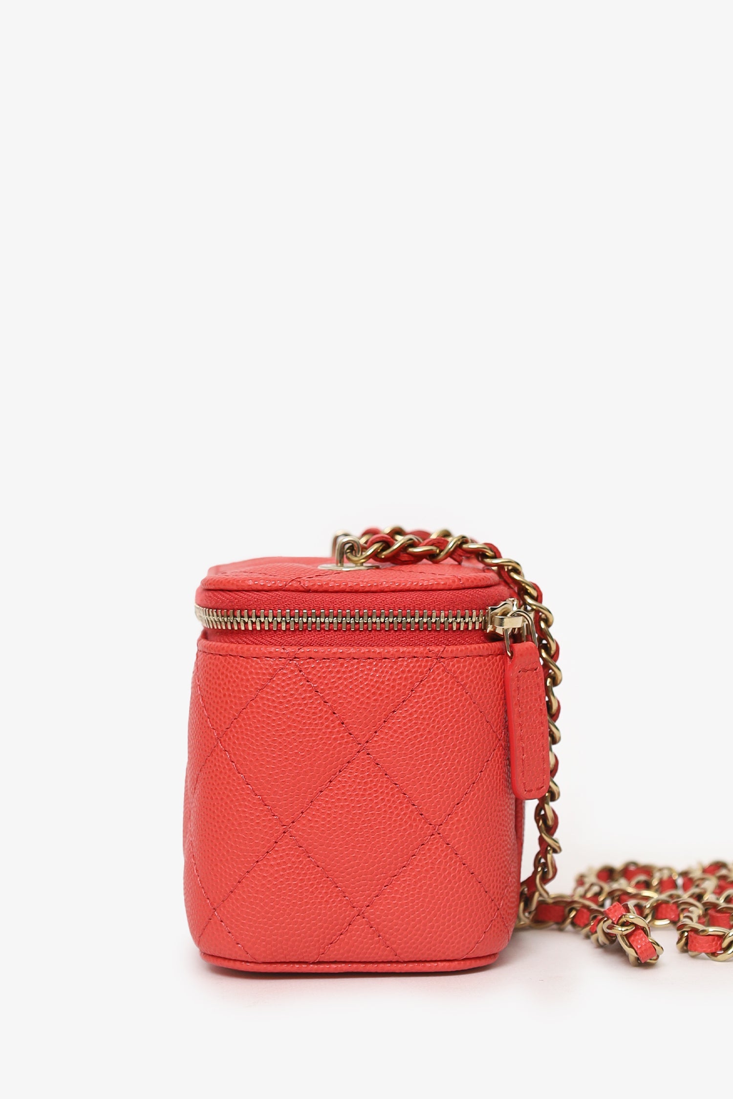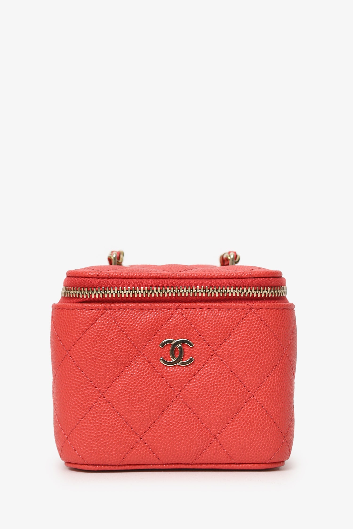 Pre-Loved Chanel™ Coral Classic Caviar Leather Vanity Bag With Chain. 2-way front zip-up closure. Chain link crossbody strap. Leather-lined interior with single lipstick pocket. Interior mirror. Gold-tone hardware. Tonal stitching.