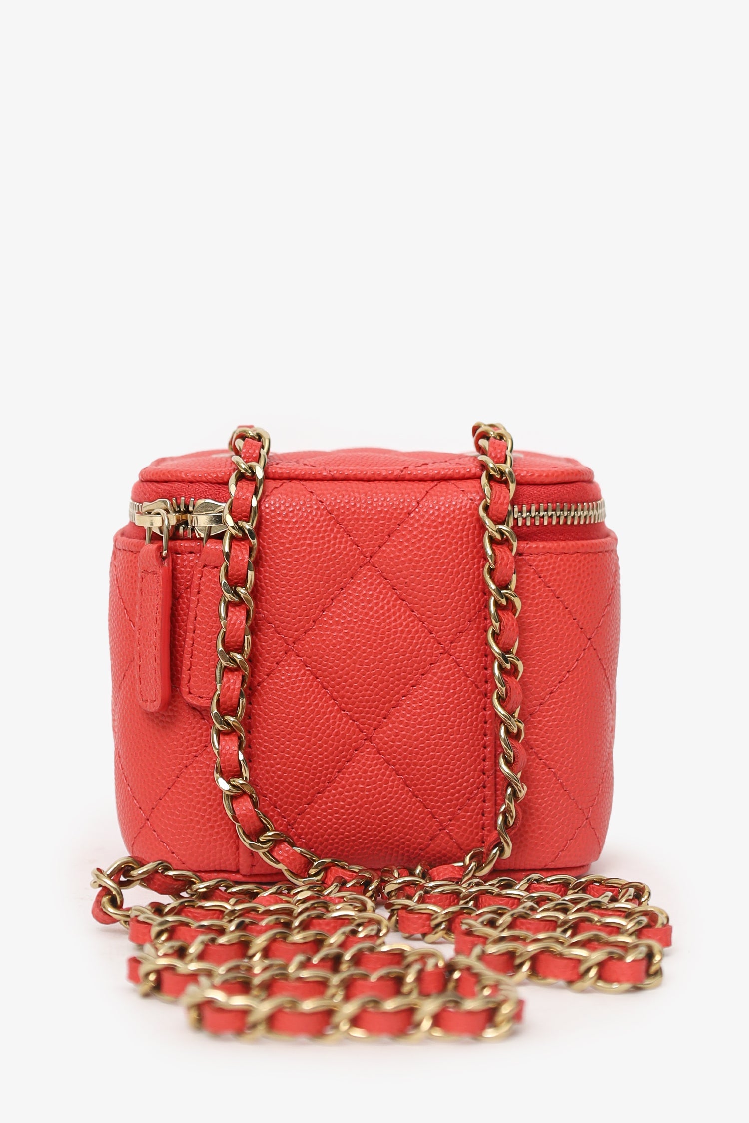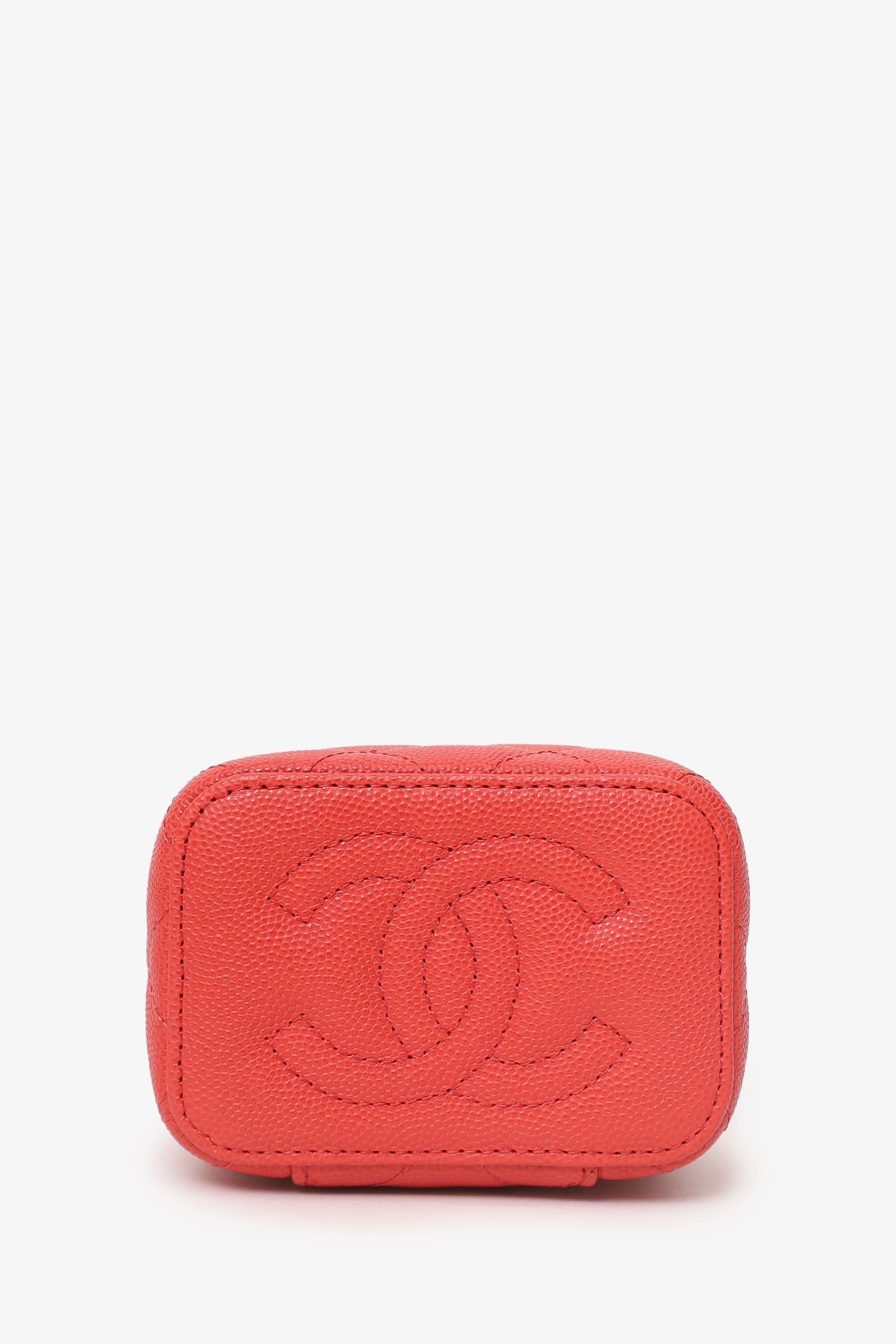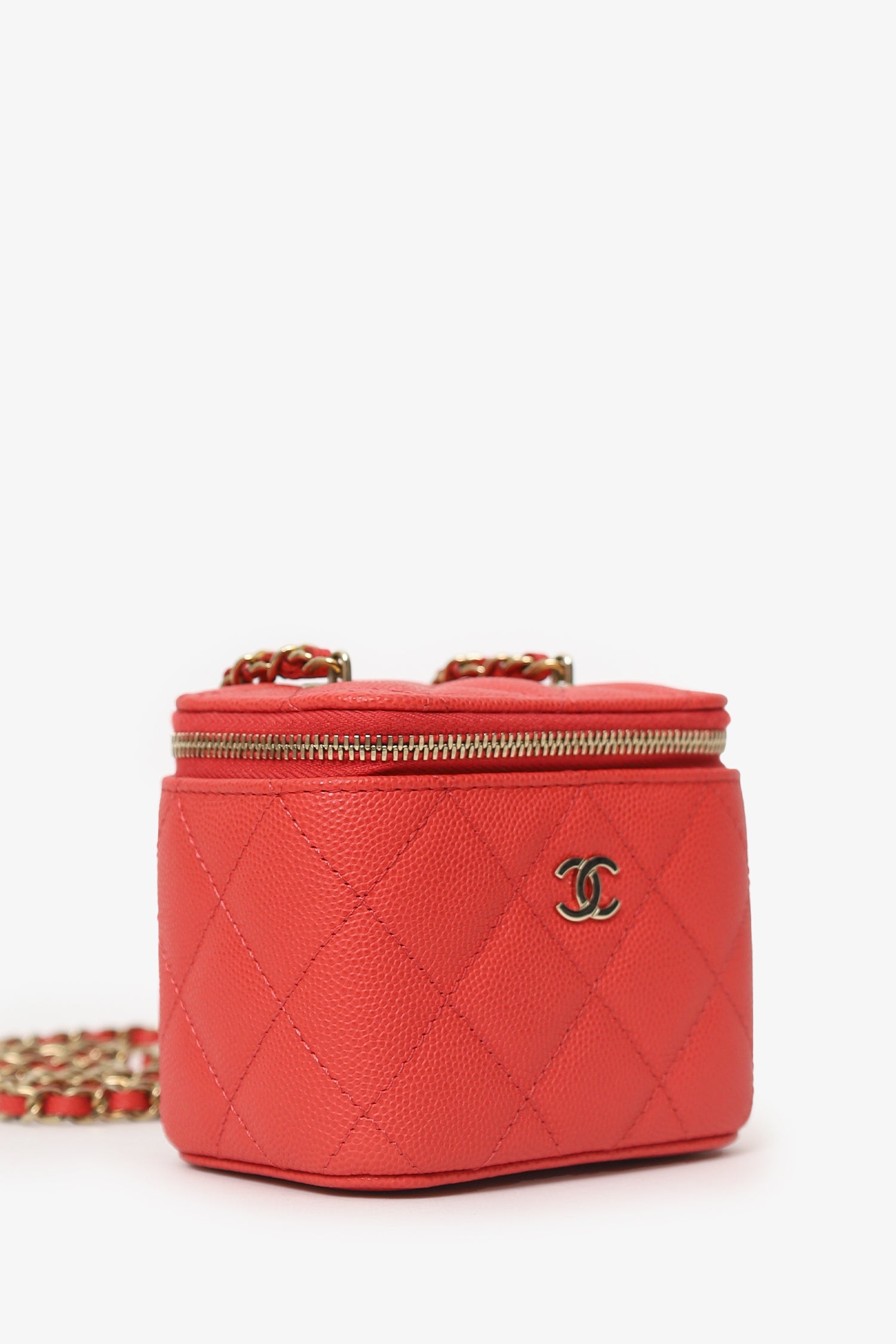 Pre-Loved Chanel™ Coral Classic Caviar Leather Vanity Bag With Chain. 2-way front zip-up closure. Chain link crossbody strap. Leather-lined interior with single lipstick pocket. Interior mirror. Gold-tone hardware. Tonal stitching.