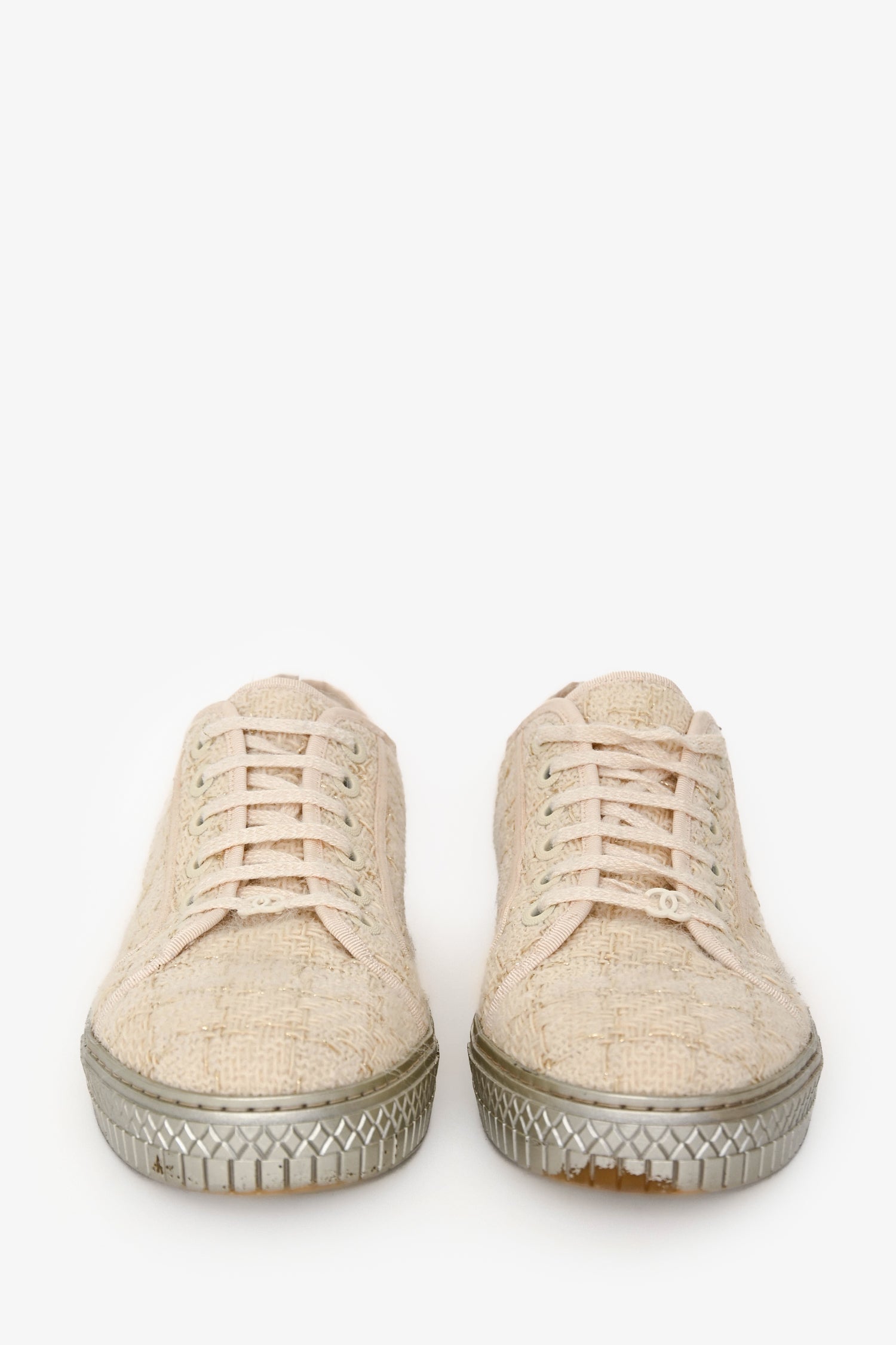 Pre-Loved Chanel™ Cream/Silver Tweed Lace Up Sneaker. Slip-on. Round toe. Lace-front closure. Leather lined interior. Rubber soles. Tonal stitching.